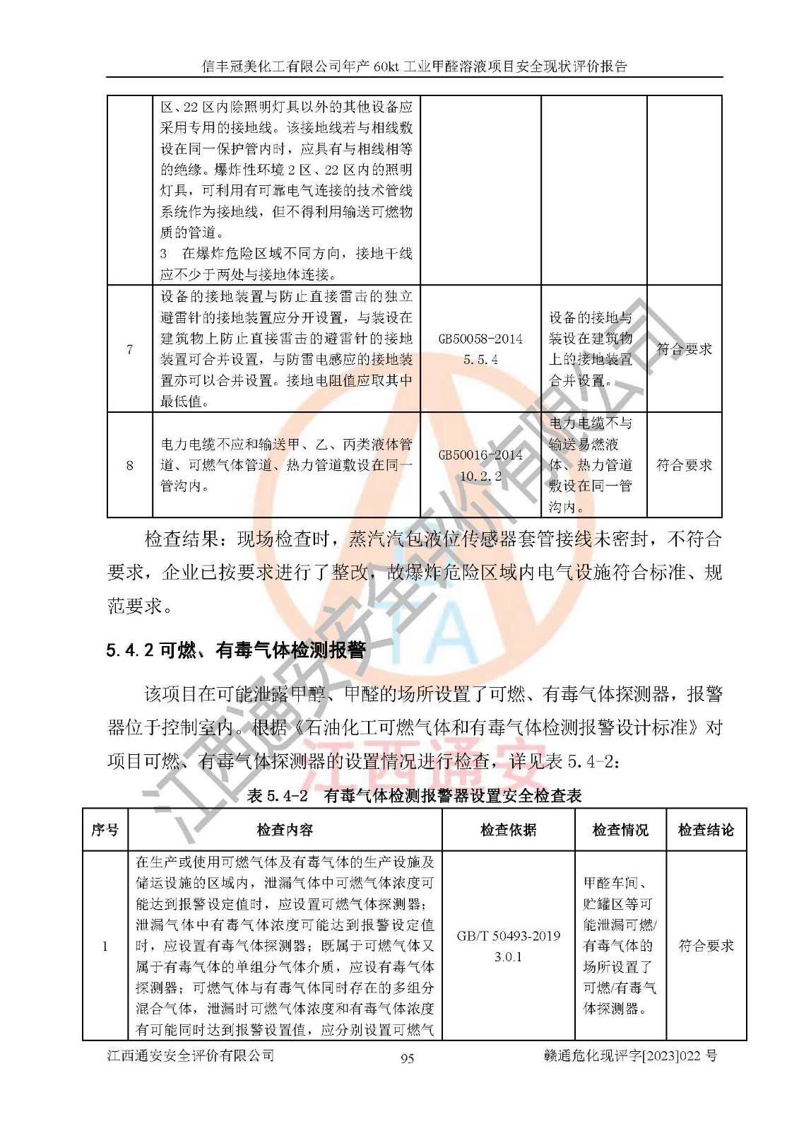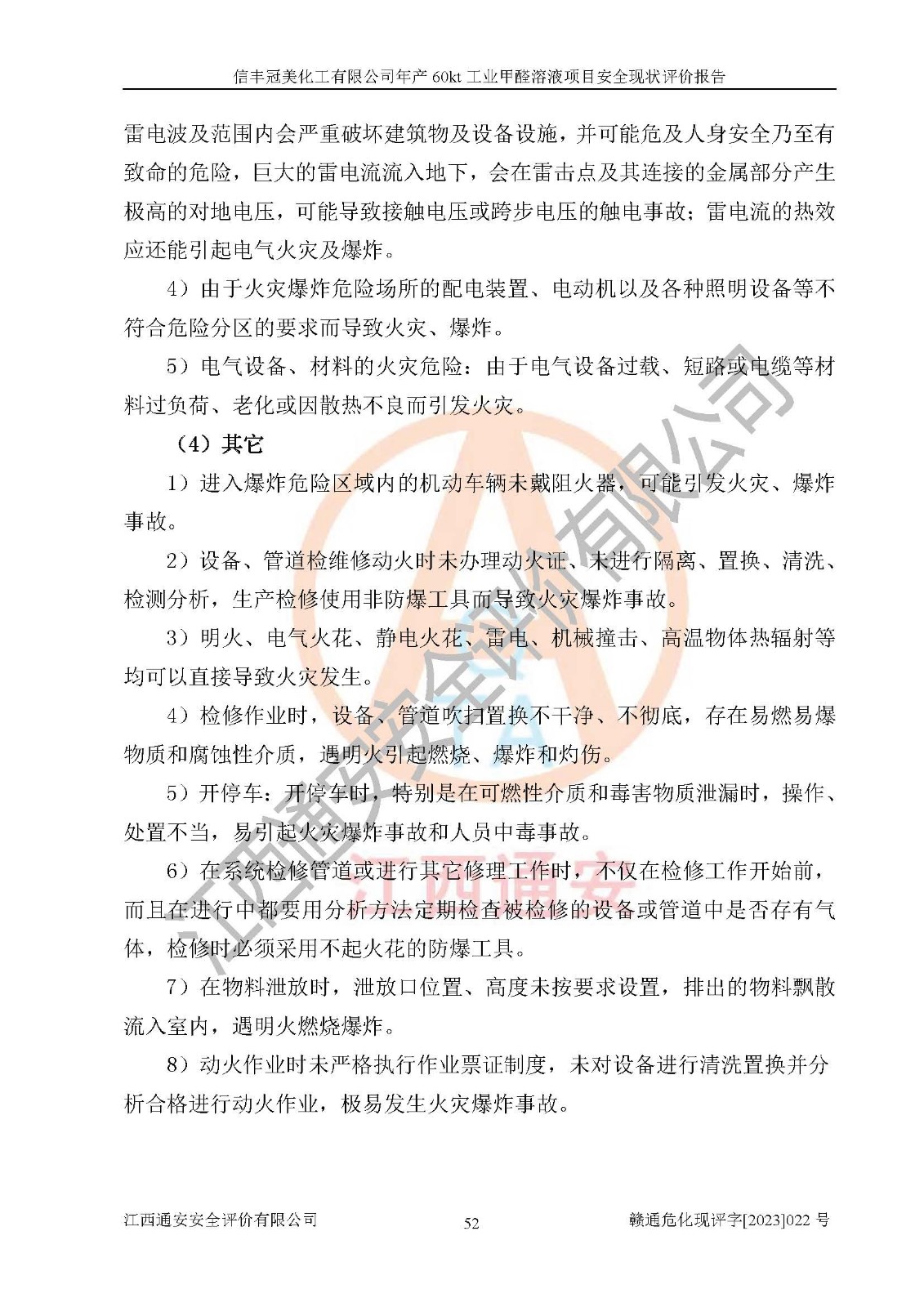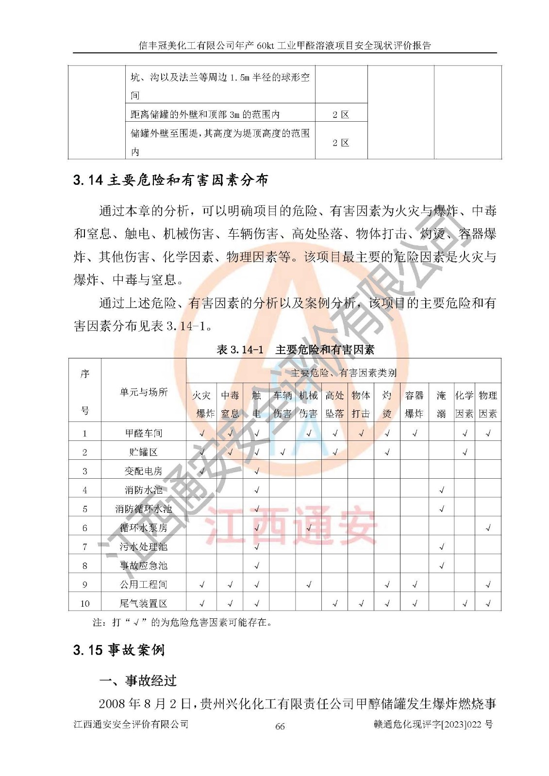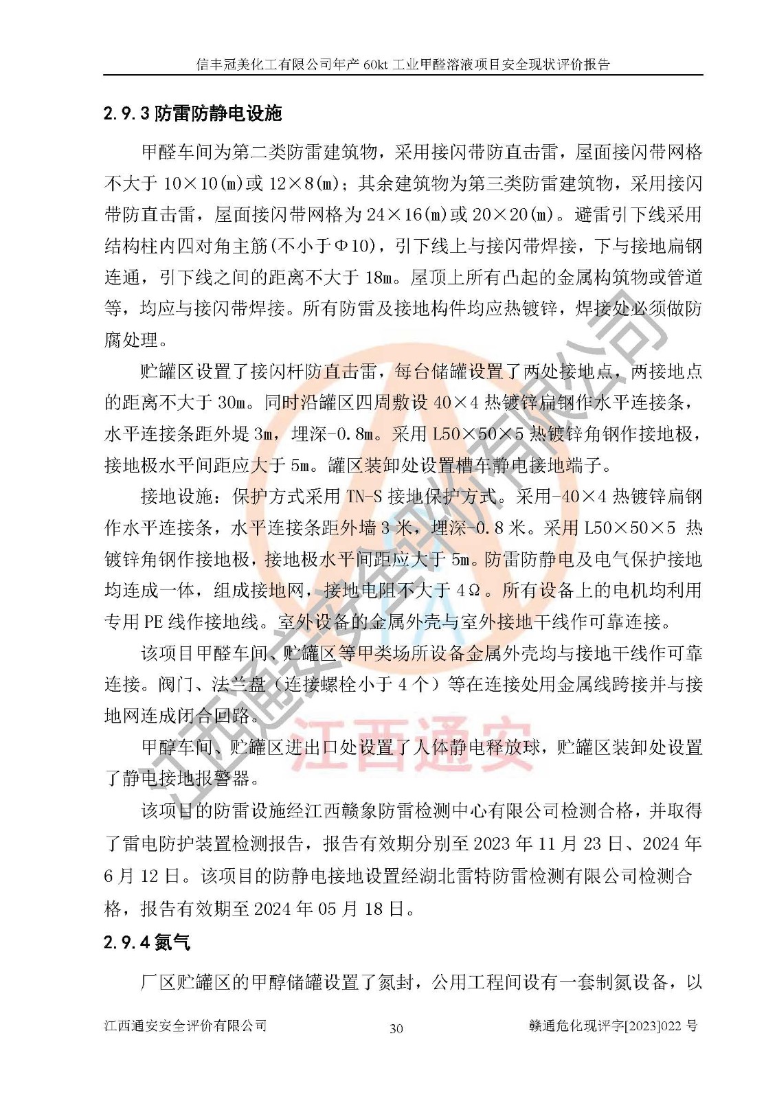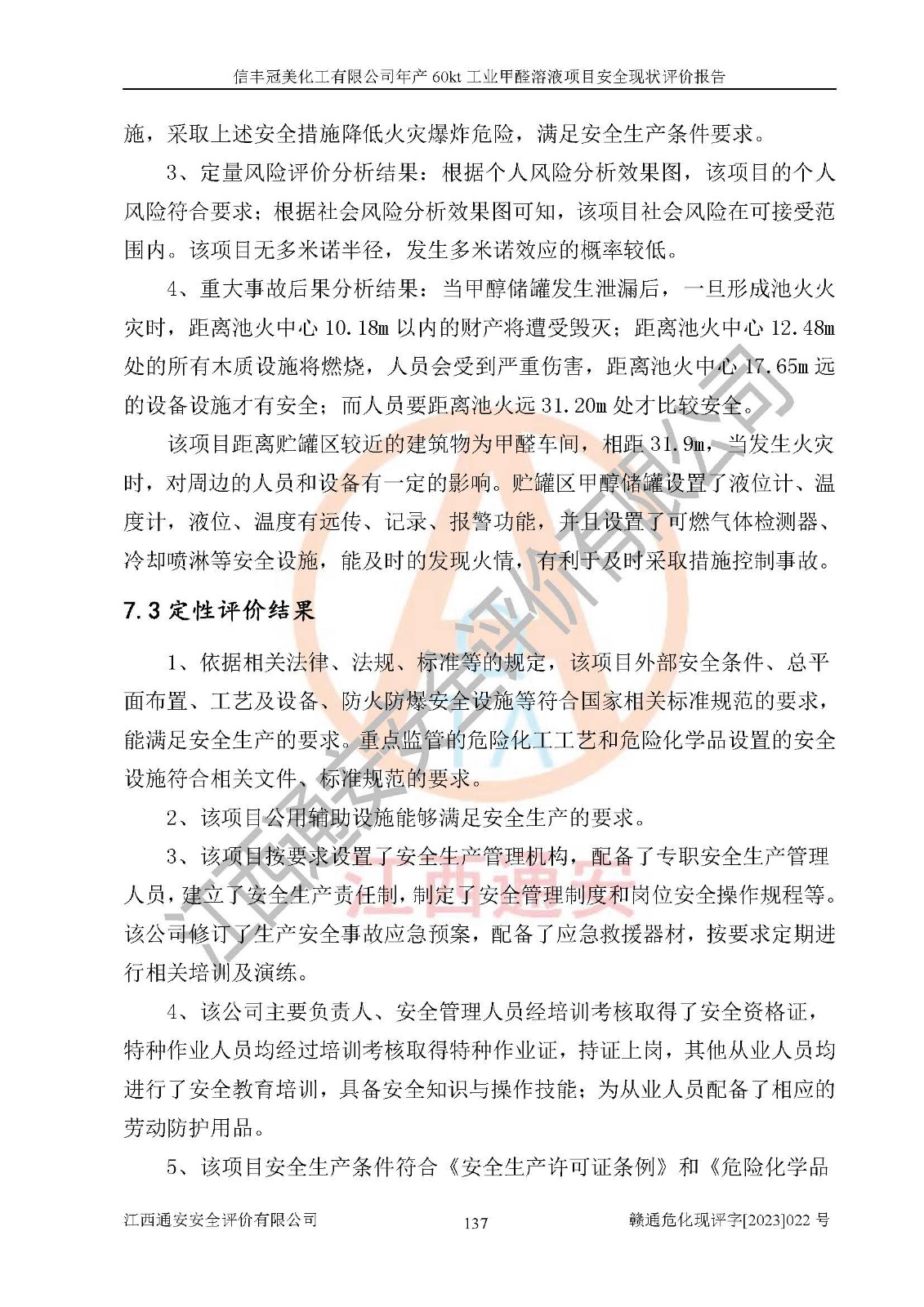 信豐冠美化工有限公司位于江西省贛州市信豐縣工業(yè)園偉邦路,法定**人為汪學斌,成立于2007年04月09日,注冊資本壹仟萬元整,營業(yè)執(zhí)照經營范圍為工業(yè)甲醛、尿醛樹脂膠生產、銷售(憑許可證經營)等。 信豐冠美化工有限公司2020年07月23日取得了《安全生產許可證》,許可證編號:(贛)WH安許證字[2008]0500號,許可范圍為工業(yè)甲醛溶液(60kt/a),**期2020年08月06日至2023年08月05日。該公司2022年8月30日取得了安全生產標準化證書,證書編號:贛AQBWⅡ[2022]015,**期至2025年8月。該公司現(xiàn)有員工23人,其中專職安全管理人員1人。 根據《江西省危險化學品產業(yè)轉移項目和化工園區(qū)安全風險防控專項整治實施方案》(贛安辦字〔2021〕86 號)要求,為提升生產本質安全,減少重大危險源,信豐冠美化工有限公司對貯罐區(qū)進行了調整,停用1臺甲醇儲罐和1臺甲醇計量罐,2臺甲醇儲罐變更為2臺甲醛儲罐。信豐冠美化工有限公司委托山東富海石化工程有限公司對60kt/a工業(yè)甲醛項目出具了在役化工裝置安全設計診斷及整改設計文本和圖紙(2022年12月),取得了贛州市應急管理局出具的審查意見,并對貯罐區(qū)進行了整改。貯罐區(qū)整改完成后,經辨識,信豐冠美化工有限公司生產、儲存單元不構成危險化學品重大危險源。信豐冠美化工有限公司向信豐縣應急管理局申請了重大危險源核銷,2023年2月2日取得了核銷登記表,核銷編號為HX贛360722[2023]001。 信豐冠美化工有限公司年產60kt工業(yè)甲醛溶液項目生產過程中涉及的原輔材料為甲醇和銀觸媒(催化劑),氮封需要使用氮氣,副反應產物為氫氣,產品為甲醛溶液。根據《危險化學品目錄》,該項目涉及的甲醇、氮氣[壓縮的]、氫氣、甲醛和甲醛溶液屬于危險化學品。經辨識,甲醇和氫氣屬于重點監(jiān)管的危險化學品,甲醛屬于高毒物品,甲醇屬于特別管控的危險化學品,不涉及監(jiān)控化學品、易制毒化學品、易制爆危險化學品和劇毒化學品,生產、儲存單元不構成危險化學品重大危險源,涉及的氧化反應屬于重點監(jiān)管的危險化工工藝。根據《安全生產許可證條例》、《危險化學品安全管理條例》和《危險化學品生產企業(yè)安全生產許可實施辦法》的相關規(guī)定,該項目甲醛溶液屬于危險化學品,需要辦理危險化學品安全生產許可證。根據生產工藝特點及物料的理化特性可知,該項目生產過程中存在火災與爆炸、中毒與窒息、觸電、機械傷害等危險有害因素。 該公司自2020年07月23日取得安全生產許可證以來,生產運行正常,未發(fā)生一般及以上生產安全事故。 |