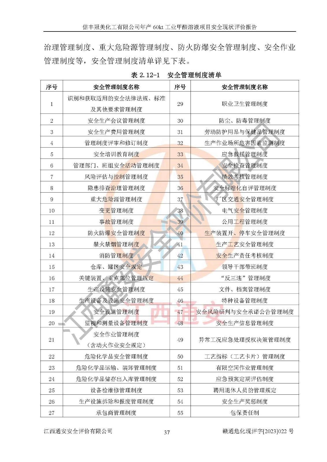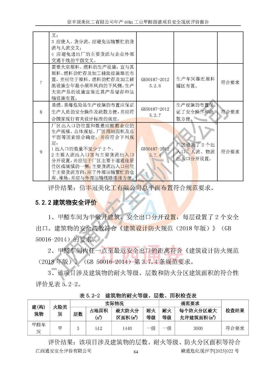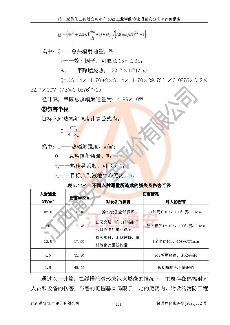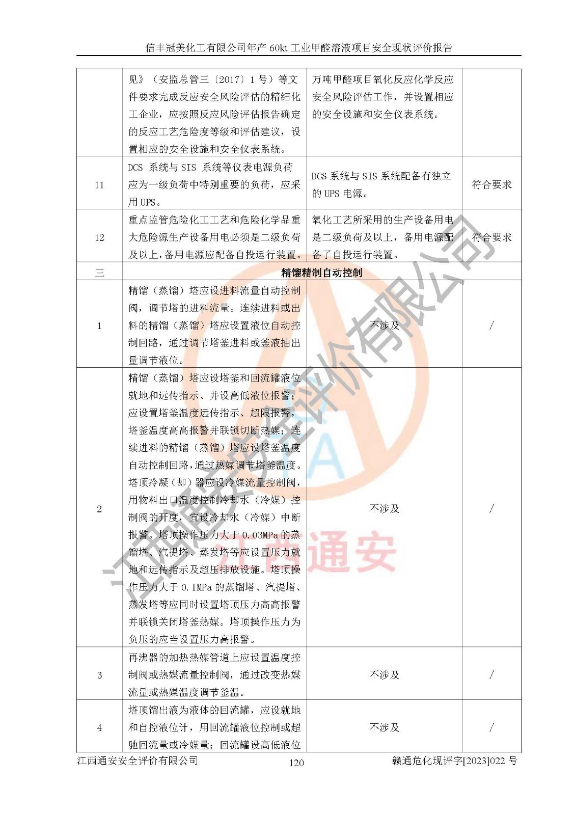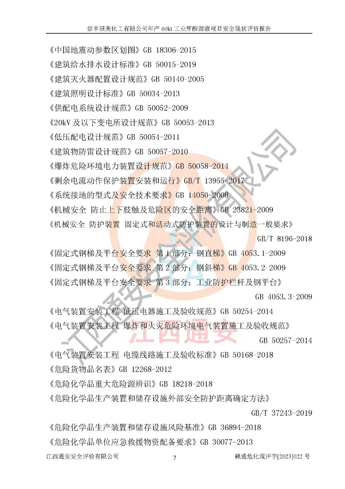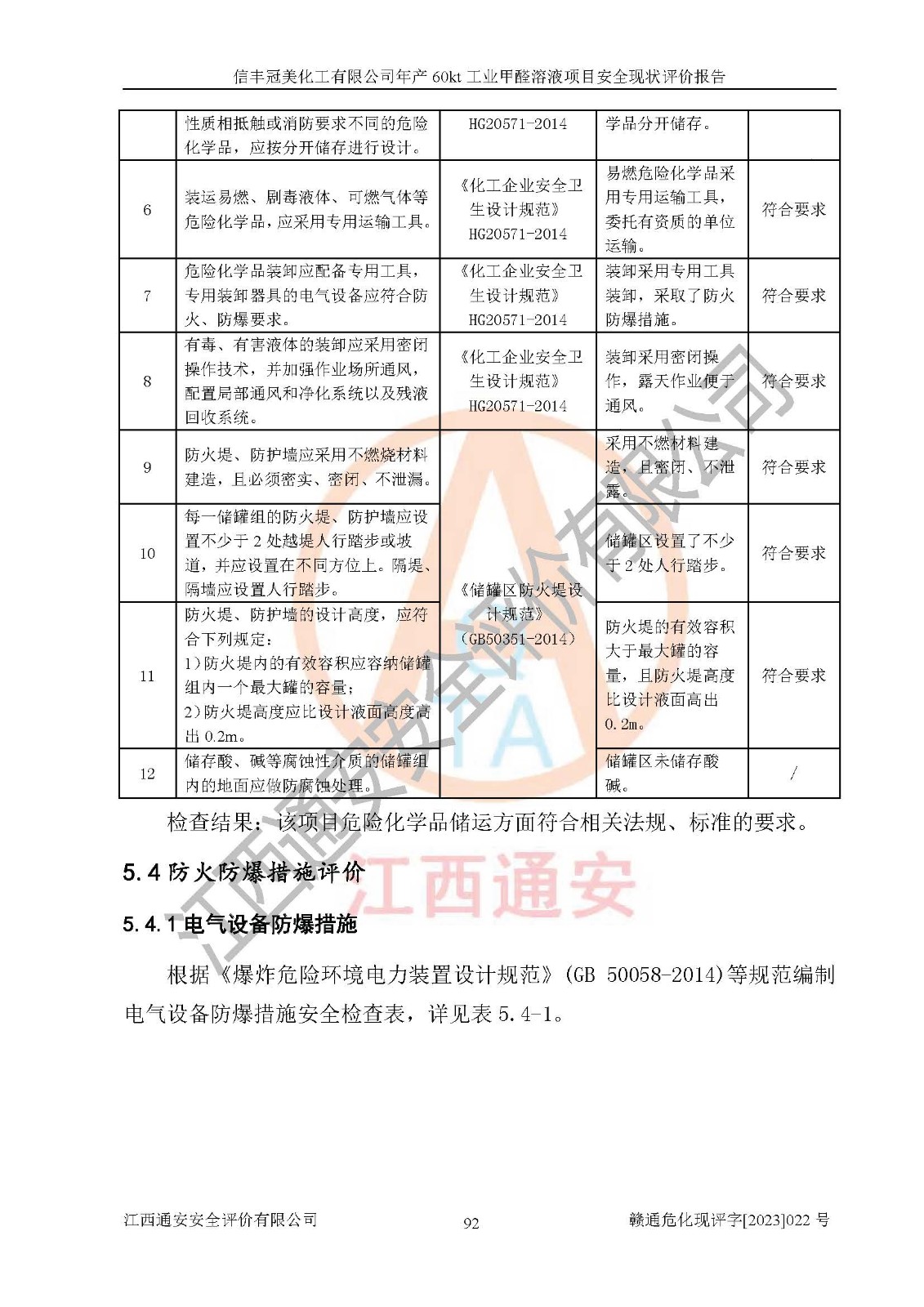 信豐冠美化工有限公司位于江西省贛州市信豐縣工業(yè)園偉邦路,法定**人為汪學斌,成立于2007年04月09日,注冊資本壹仟萬元整,營業(yè)執(zhí)照經營范圍為工業(yè)甲醛、尿醛樹脂膠生產、銷售(憑許可證經營)等。 信豐冠美化工有限公司2020年07月23日取得了《安全生產許可證》,許可證編號:(贛)WH安許證字[2008]0500號,許可范圍為工業(yè)甲醛溶液(60kt/a),**期2020年08月06日至2023年08月05日。該公司2022年8月30日取得了安全生產標準化證書,證書編號:贛AQBWⅡ[2022]015,**期至2025年8月。該公司現(xiàn)有員工23人,其中專職安全管理人員1人。 根據《江西省危險化學品產業(yè)轉移項目和化工園區(qū)安全風險防控專項整治實施方案》(贛安辦字〔2021〕86 號)要求,為提升生產本質安全,減少重大危險源,信豐冠美化工有限公司對貯罐區(qū)進行了調整,停用1臺甲醇儲罐和1臺甲醇計量罐,2臺甲醇儲罐變更為2臺甲醛儲罐。信豐冠美化工有限公司委托山東富海石化工程有限公司對60kt/a工業(yè)甲醛項目出具了在役化工裝置安全設計診斷及整改設計文本和圖紙(2022年12月),取得了贛州市應急管理局出具的審查意見,并對貯罐區(qū)進行了整改。貯罐區(qū)整改完成后,經辨識,信豐冠美化工有限公司生產、儲存單元不構成危險化學品重大危險源。信豐冠美化工有限公司向信豐縣應急管理局申請了重大危險源核銷,2023年2月2日取得了核銷登記表,核銷編號為HX贛360722[2023]001。 信豐冠美化工有限公司年產60kt工業(yè)甲醛溶液項目生產過程中涉及的原輔材料為甲醇和銀觸媒(催化劑),氮封需要使用氮氣,副反應產物為氫氣,產品為甲醛溶液。根據《危險化學品目錄》,該項目涉及的甲醇、氮氣[壓縮的]、氫氣、甲醛和甲醛溶液屬于危險化學品。經辨識,甲醇和氫氣屬于重點監(jiān)管的危險化學品,甲醛屬于高毒物品,甲醇屬于特別管控的危險化學品,不涉及監(jiān)控化學品、易制毒化學品、易制爆危險化學品和劇毒化學品,生產、儲存單元不構成危險化學品重大危險源,涉及的氧化反應屬于重點監(jiān)管的危險化工工藝。根據《安全生產許可證條例》、《危險化學品安全管理條例》和《危險化學品生產企業(yè)安全生產許可實施辦法》的相關規(guī)定,該項目甲醛溶液屬于危險化學品,需要辦理危險化學品安全生產許可證。根據生產工藝特點及物料的理化特性可知,該項目生產過程中存在火災與爆炸、中毒與窒息、觸電、機械傷害等危險有害因素。 該公司自2020年07月23日取得安全生產許可證以來,生產運行正常,未發(fā)生一般及以上生產安全事故。 |