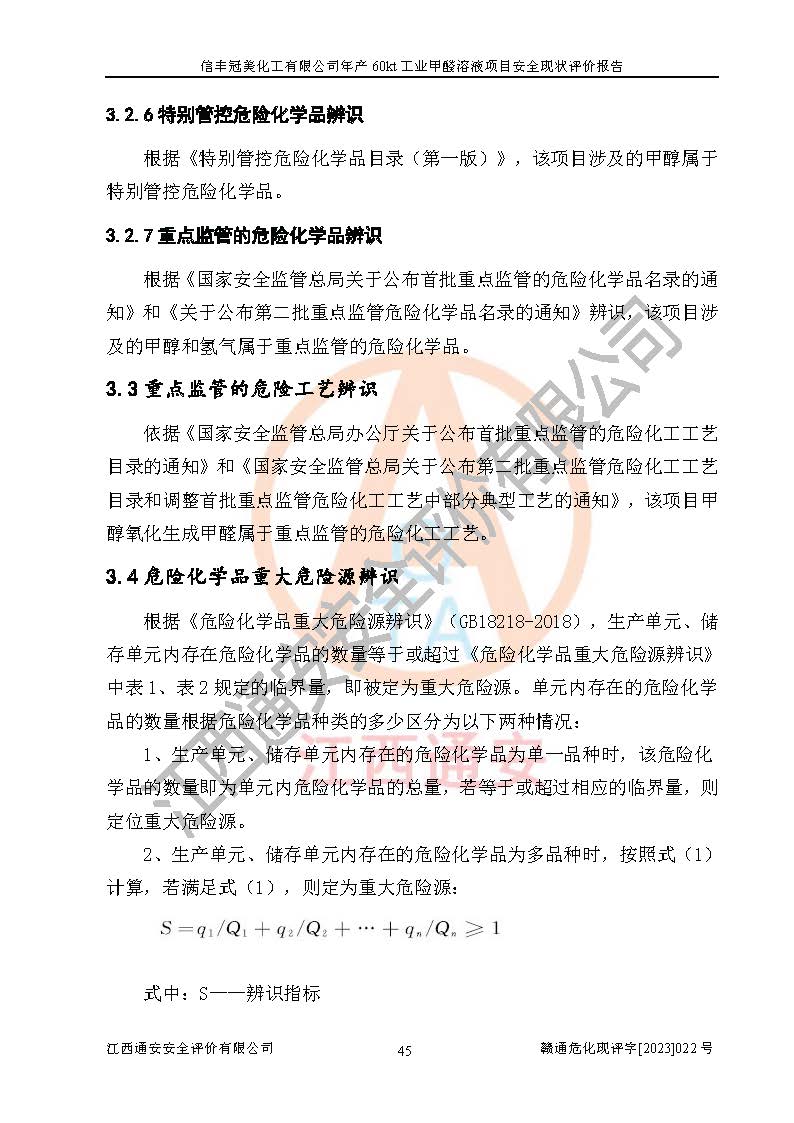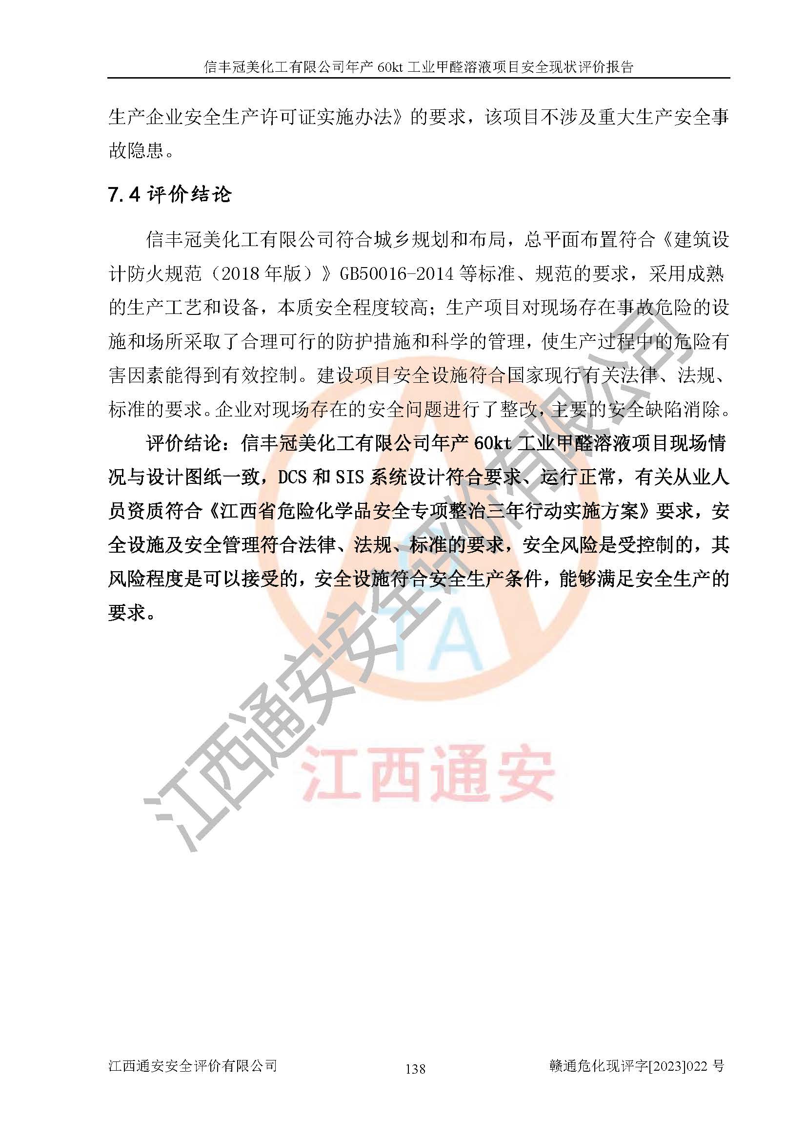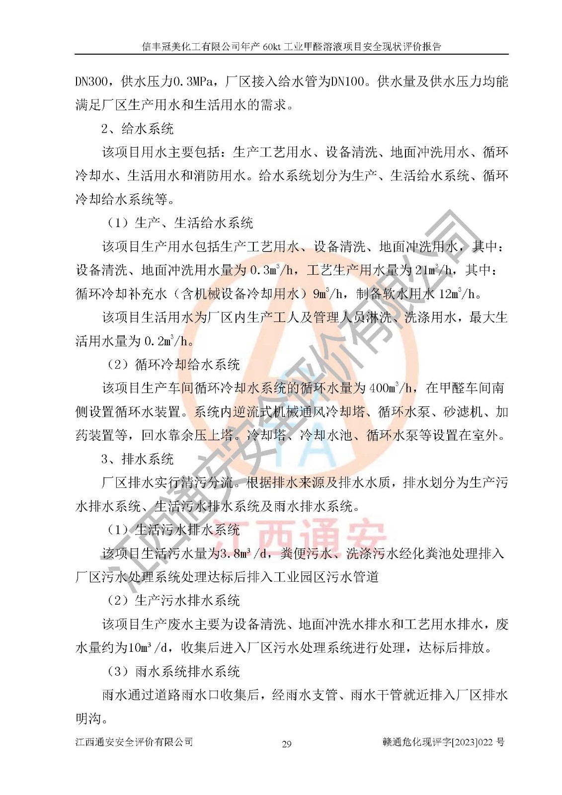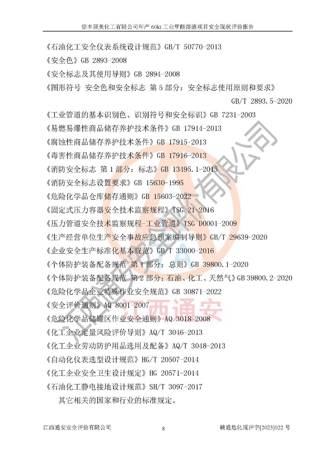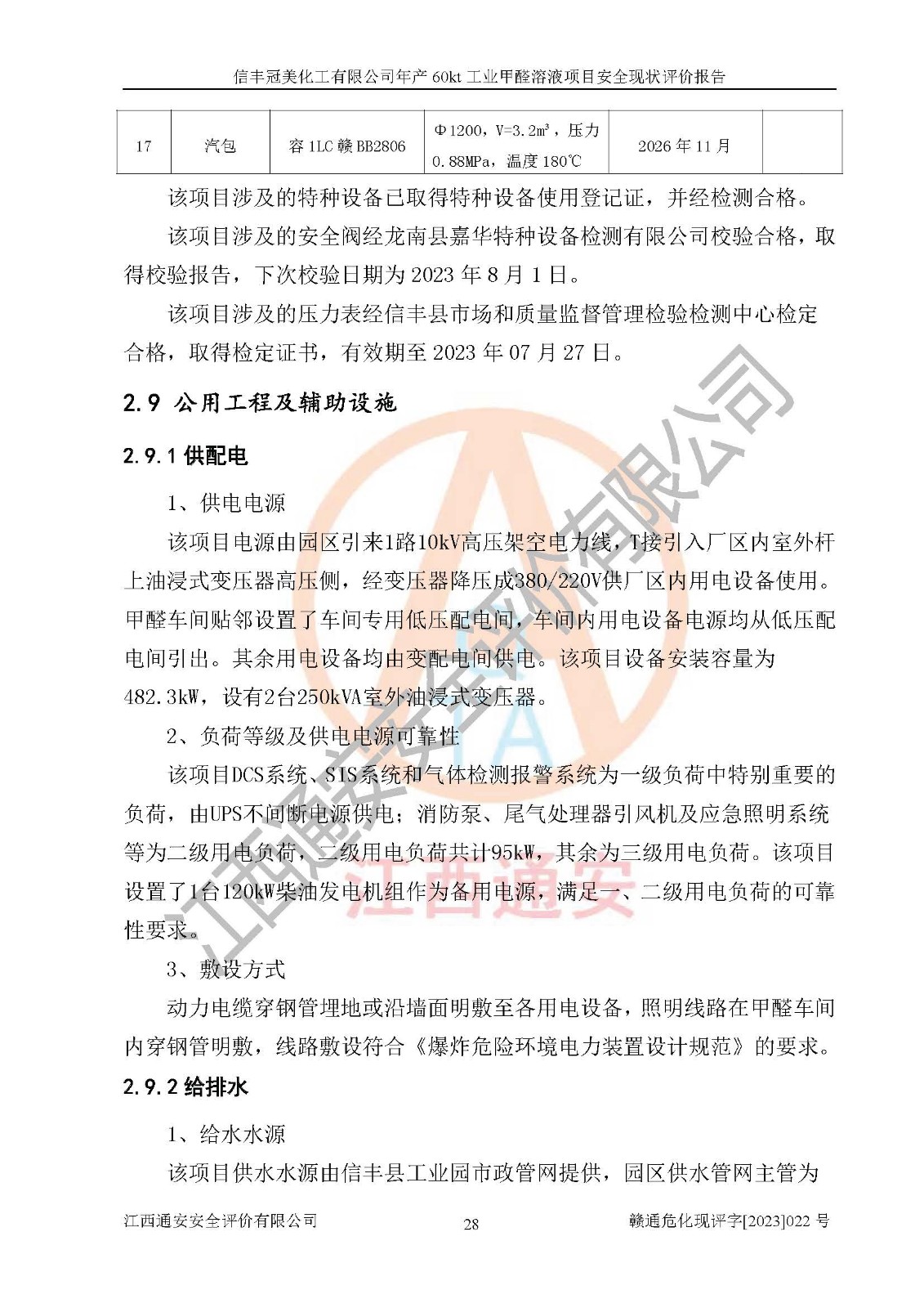 信豐冠美化工有限公司位于江西省贛州市信豐縣工業(yè)園偉邦路,法定**人為汪學斌,成立于2007年04月09日,注冊資本壹仟萬元整,營業(yè)執(zhí)照經營范圍為工業(yè)甲醛、尿醛樹脂膠生產、銷售(憑許可證經營)等。 信豐冠美化工有限公司2020年07月23日取得了《安全生產許可證》,許可證編號:(贛)WH安許證字[2008]0500號,許可范圍為工業(yè)甲醛溶液(60kt/a),**期2020年08月06日至2023年08月05日。該公司2022年8月30日取得了安全生產標準化證書,證書編號:贛AQBWⅡ[2022]015,**期至2025年8月。該公司現(xiàn)有員工23人,其中專職安全管理人員1人。 根據《江西省危險化學品產業(yè)轉移項目和化工園區(qū)安全風險防控專項整治實施方案》(贛安辦字〔2021〕86 號)要求,為提升生產本質安全,減少重大危險源,信豐冠美化工有限公司對貯罐區(qū)進行了調整,停用1臺甲醇儲罐和1臺甲醇計量罐,2臺甲醇儲罐變更為2臺甲醛儲罐。信豐冠美化工有限公司委托山東富海石化工程有限公司對60kt/a工業(yè)甲醛項目出具了在役化工裝置安全設計診斷及整改設計文本和圖紙(2022年12月),取得了贛州市應急管理局出具的審查意見,并對貯罐區(qū)進行了整改。貯罐區(qū)整改完成后,經辨識,信豐冠美化工有限公司生產、儲存單元不構成危險化學品重大危險源。信豐冠美化工有限公司向信豐縣應急管理局申請了重大危險源核銷,2023年2月2日取得了核銷登記表,核銷編號為HX贛360722[2023]001。 信豐冠美化工有限公司年產60kt工業(yè)甲醛溶液項目生產過程中涉及的原輔材料為甲醇和銀觸媒(催化劑),氮封需要使用氮氣,副反應產物為氫氣,產品為甲醛溶液。根據《危險化學品目錄》,該項目涉及的甲醇、氮氣[壓縮的]、氫氣、甲醛和甲醛溶液屬于危險化學品。經辨識,甲醇和氫氣屬于重點監(jiān)管的危險化學品,甲醛屬于高毒物品,甲醇屬于特別管控的危險化學品,不涉及監(jiān)控化學品、易制毒化學品、易制爆危險化學品和劇毒化學品,生產、儲存單元不構成危險化學品重大危險源,涉及的氧化反應屬于重點監(jiān)管的危險化工工藝。根據《安全生產許可證條例》、《危險化學品安全管理條例》和《危險化學品生產企業(yè)安全生產許可實施辦法》的相關規(guī)定,該項目甲醛溶液屬于危險化學品,需要辦理危險化學品安全生產許可證。根據生產工藝特點及物料的理化特性可知,該項目生產過程中存在火災與爆炸、中毒與窒息、觸電、機械傷害等危險有害因素。 該公司自2020年07月23日取得安全生產許可證以來,生產運行正常,未發(fā)生一般及以上生產安全事故。 |