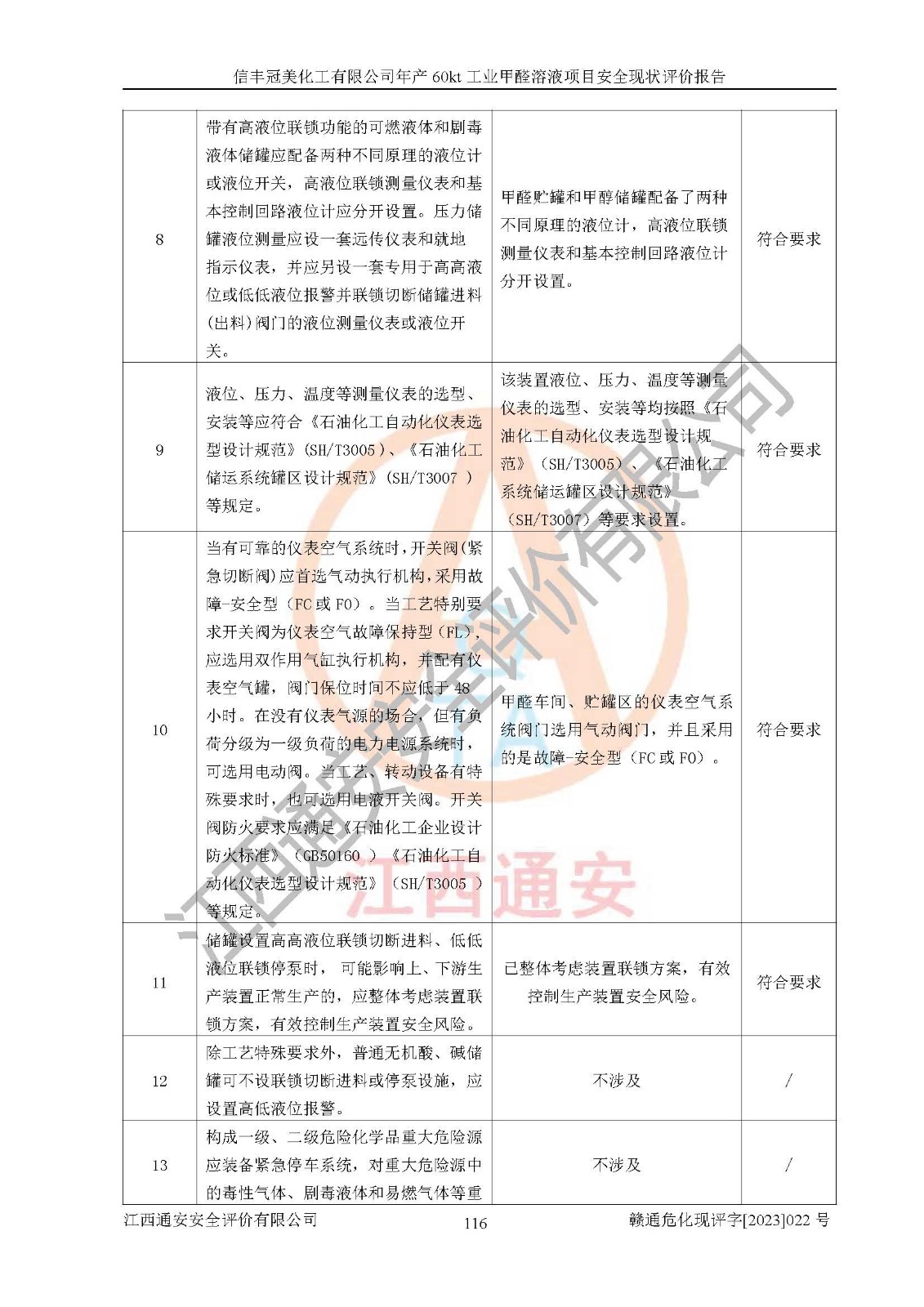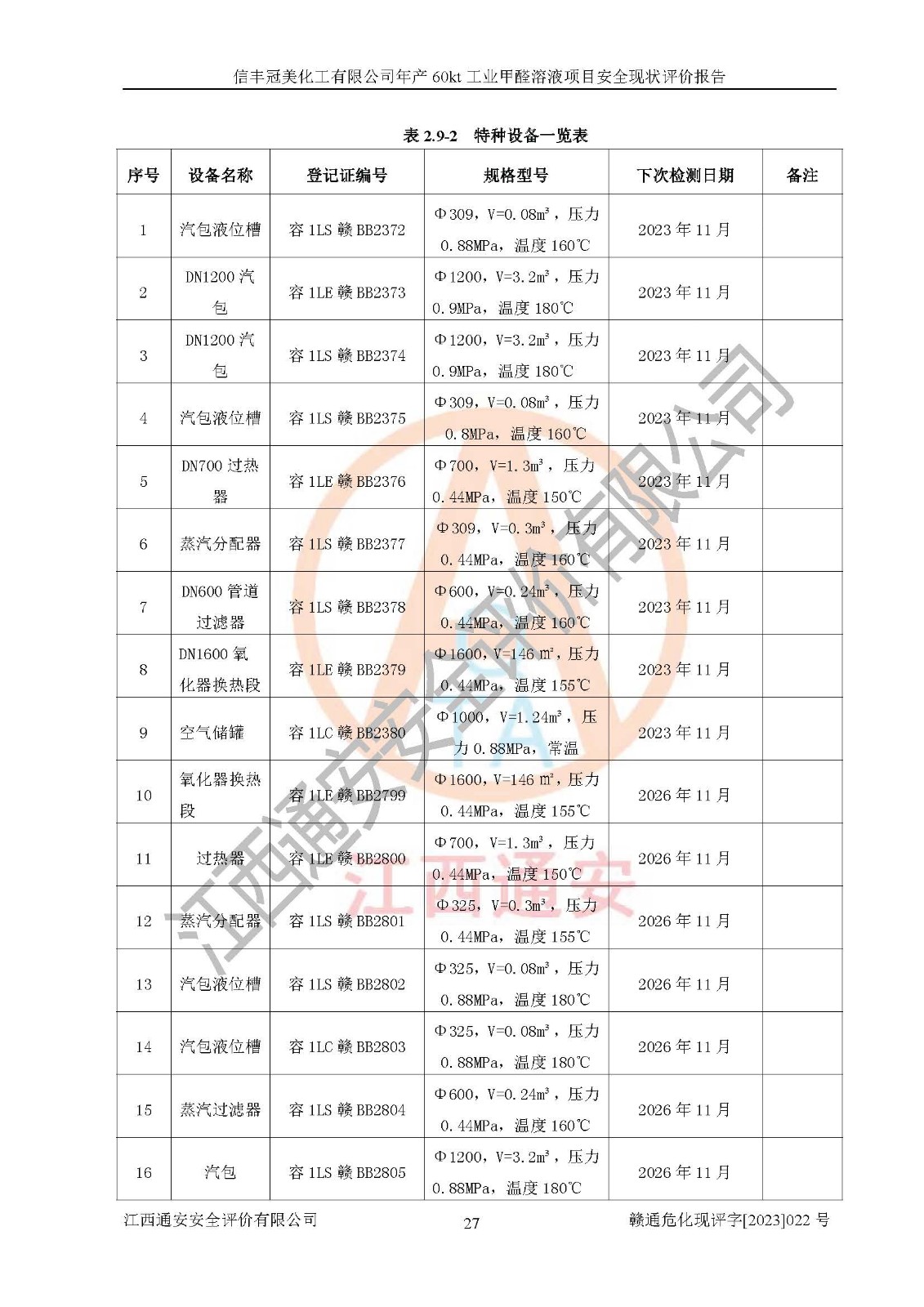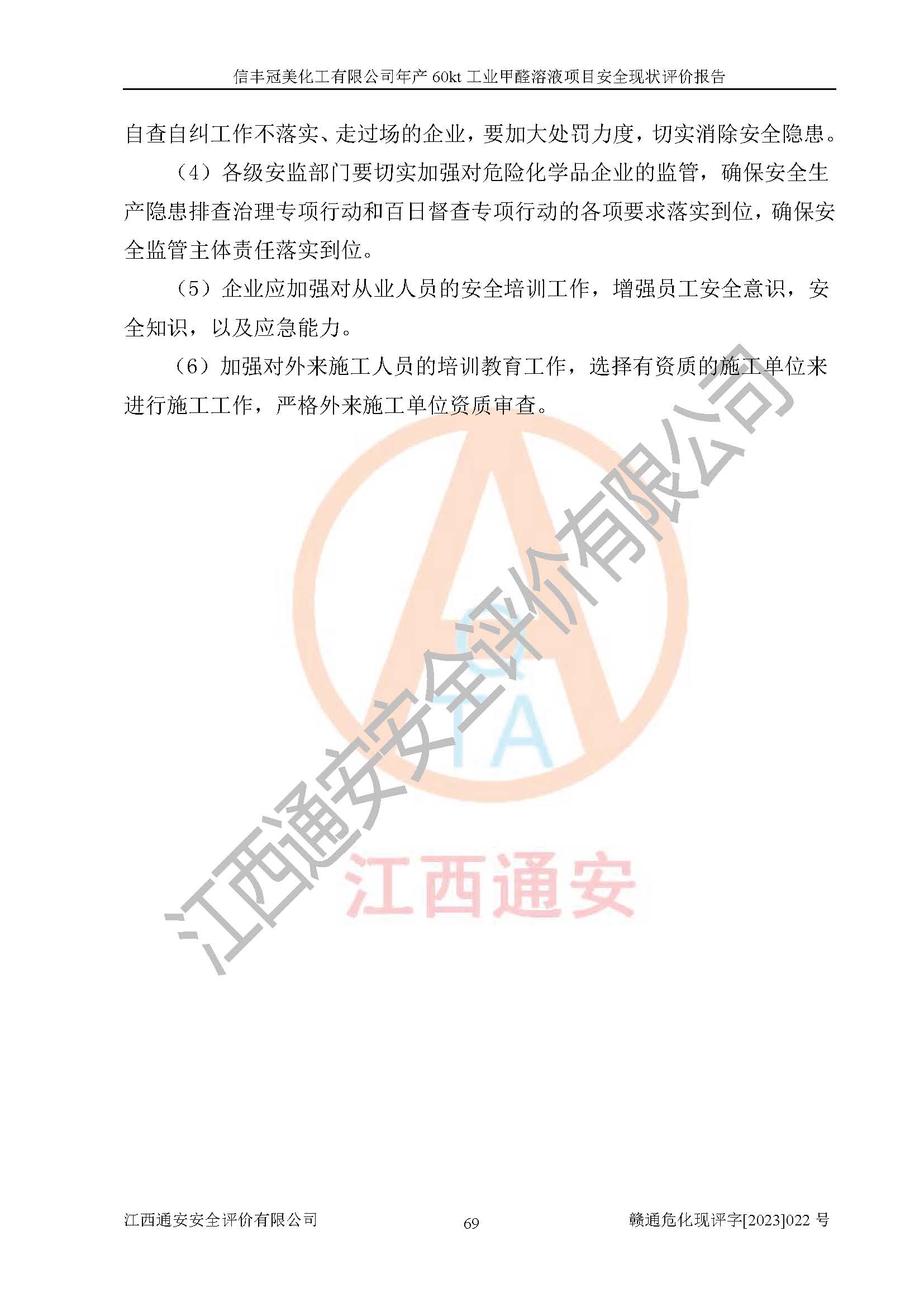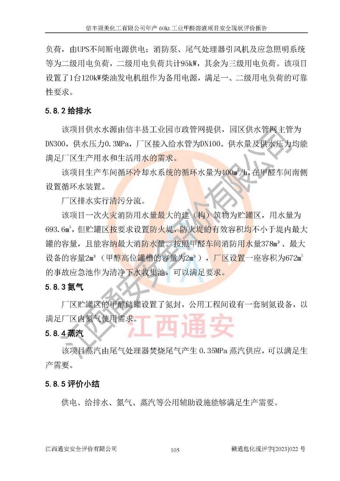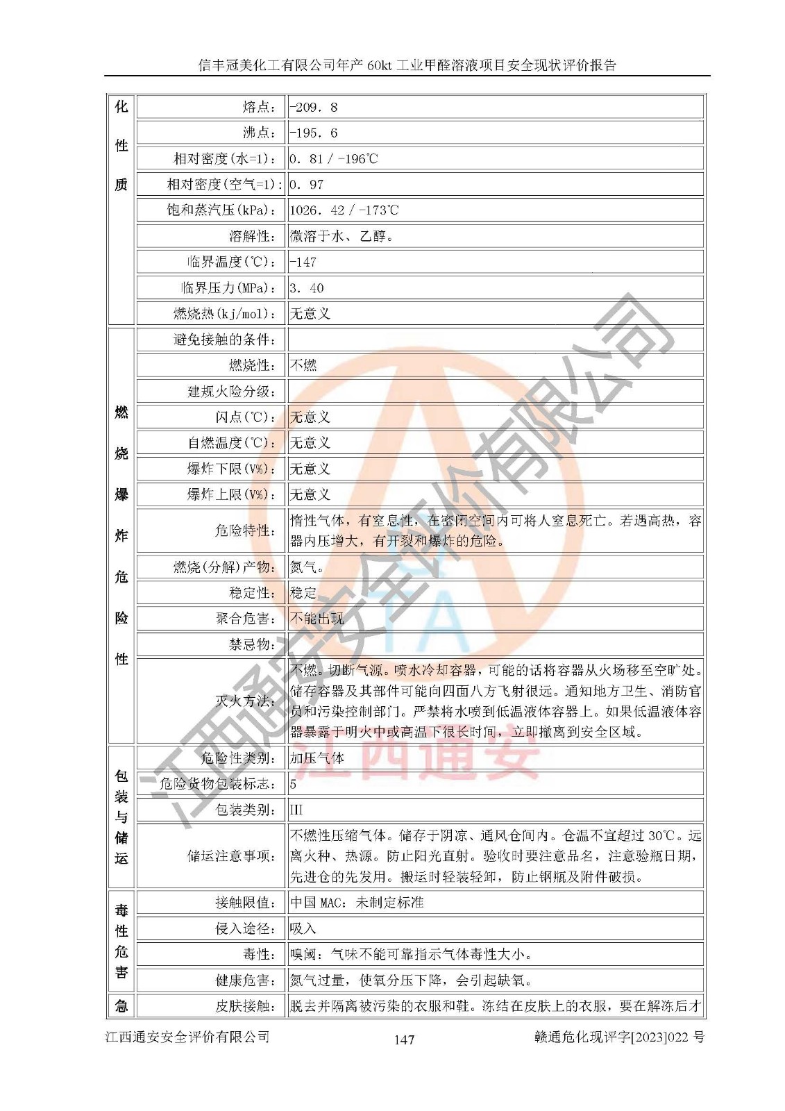 信豐冠美化工有限公司位于江西省贛州市信豐縣工業(yè)園偉邦路,法定**人為汪學斌,成立于2007年04月09日,注冊資本壹仟萬元整,營業(yè)執(zhí)照經營范圍為工業(yè)甲醛、尿醛樹脂膠生產、銷售(憑許可證經營)等。 信豐冠美化工有限公司2020年07月23日取得了《安全生產許可證》,許可證編號:(贛)WH安許證字[2008]0500號,許可范圍為工業(yè)甲醛溶液(60kt/a),**期2020年08月06日至2023年08月05日。該公司2022年8月30日取得了安全生產標準化證書,證書編號:贛AQBWⅡ[2022]015,**期至2025年8月。該公司現(xiàn)有員工23人,其中專職安全管理人員1人。 根據《江西省危險化學品產業(yè)轉移項目和化工園區(qū)安全風險防控專項整治實施方案》(贛安辦字〔2021〕86 號)要求,為提升生產本質安全,減少重大危險源,信豐冠美化工有限公司對貯罐區(qū)進行了調整,停用1臺甲醇儲罐和1臺甲醇計量罐,2臺甲醇儲罐變更為2臺甲醛儲罐。信豐冠美化工有限公司委托山東富海石化工程有限公司對60kt/a工業(yè)甲醛項目出具了在役化工裝置安全設計診斷及整改設計文本和圖紙(2022年12月),取得了贛州市應急管理局出具的審查意見,并對貯罐區(qū)進行了整改。貯罐區(qū)整改完成后,經辨識,信豐冠美化工有限公司生產、儲存單元不構成危險化學品重大危險源。信豐冠美化工有限公司向信豐縣應急管理局申請了重大危險源核銷,2023年2月2日取得了核銷登記表,核銷編號為HX贛360722[2023]001。 信豐冠美化工有限公司年產60kt工業(yè)甲醛溶液項目生產過程中涉及的原輔材料為甲醇和銀觸媒(催化劑),氮封需要使用氮氣,副反應產物為氫氣,產品為甲醛溶液。根據《危險化學品目錄》,該項目涉及的甲醇、氮氣[壓縮的]、氫氣、甲醛和甲醛溶液屬于危險化學品。經辨識,甲醇和氫氣屬于重點監(jiān)管的危險化學品,甲醛屬于高毒物品,甲醇屬于特別管控的危險化學品,不涉及監(jiān)控化學品、易制毒化學品、易制爆危險化學品和劇毒化學品,生產、儲存單元不構成危險化學品重大危險源,涉及的氧化反應屬于重點監(jiān)管的危險化工工藝。根據《安全生產許可證條例》、《危險化學品安全管理條例》和《危險化學品生產企業(yè)安全生產許可實施辦法》的相關規(guī)定,該項目甲醛溶液屬于危險化學品,需要辦理危險化學品安全生產許可證。根據生產工藝特點及物料的理化特性可知,該項目生產過程中存在火災與爆炸、中毒與窒息、觸電、機械傷害等危險有害因素。 該公司自2020年07月23日取得安全生產許可證以來,生產運行正常,未發(fā)生一般及以上生產安全事故。 |