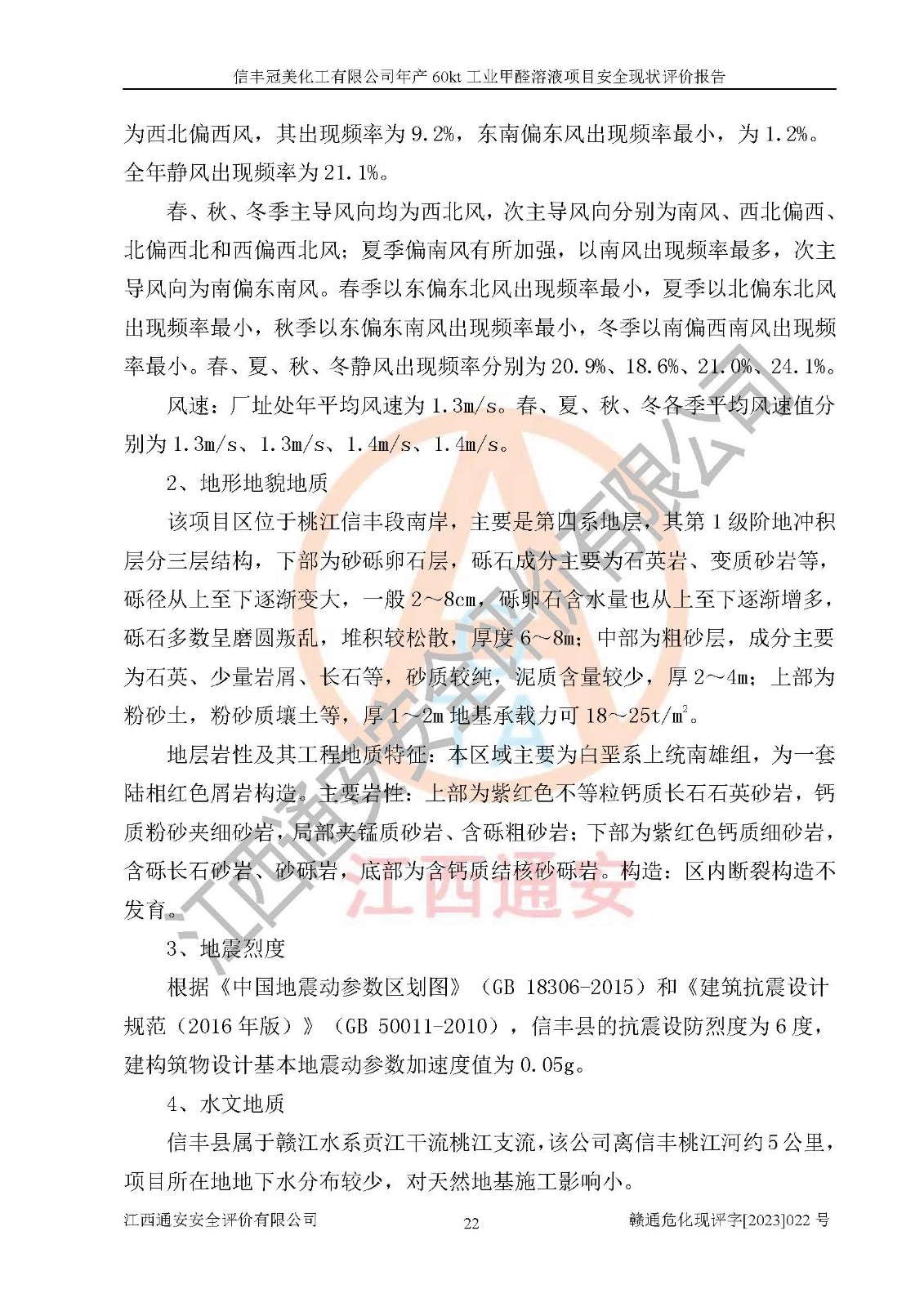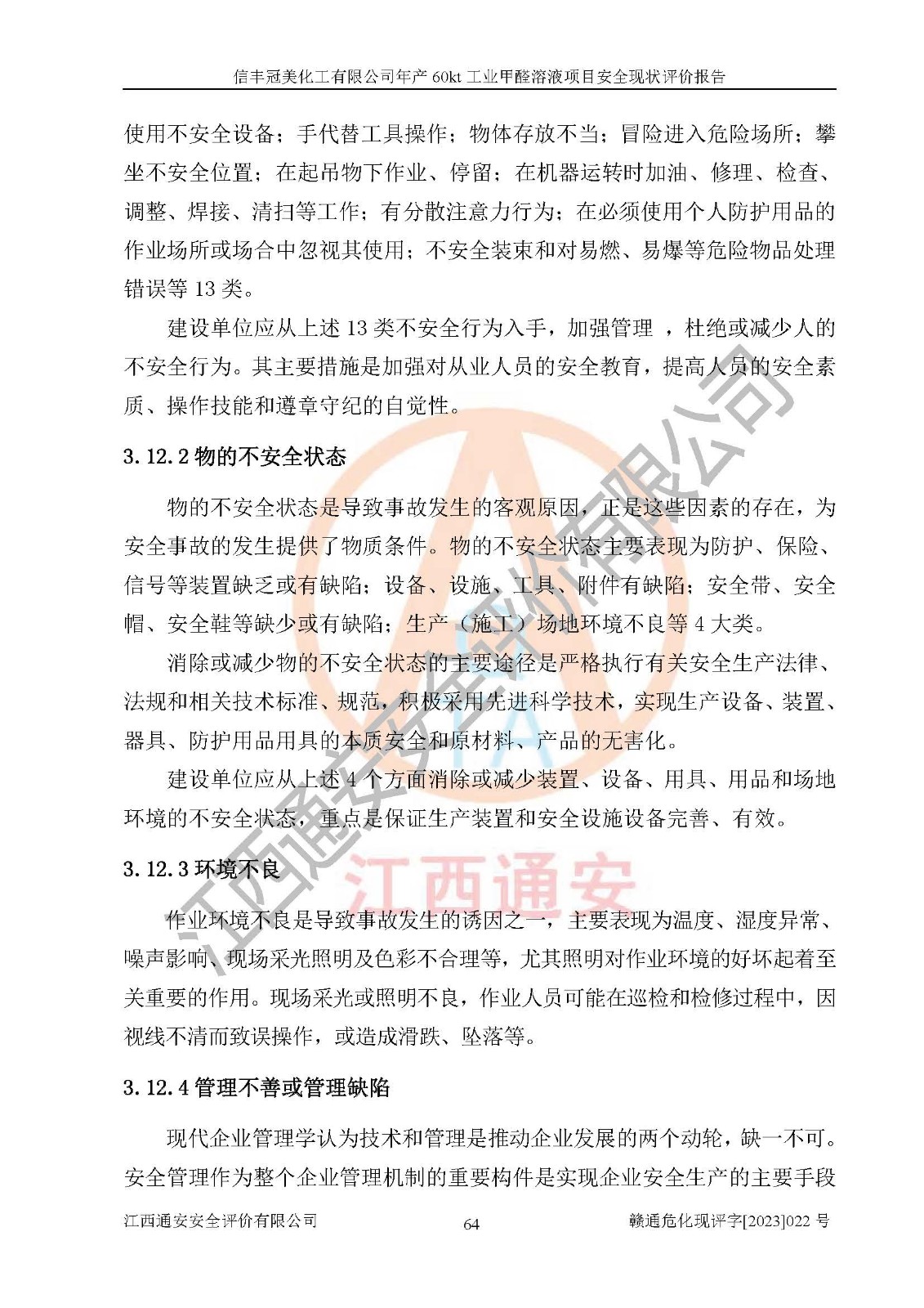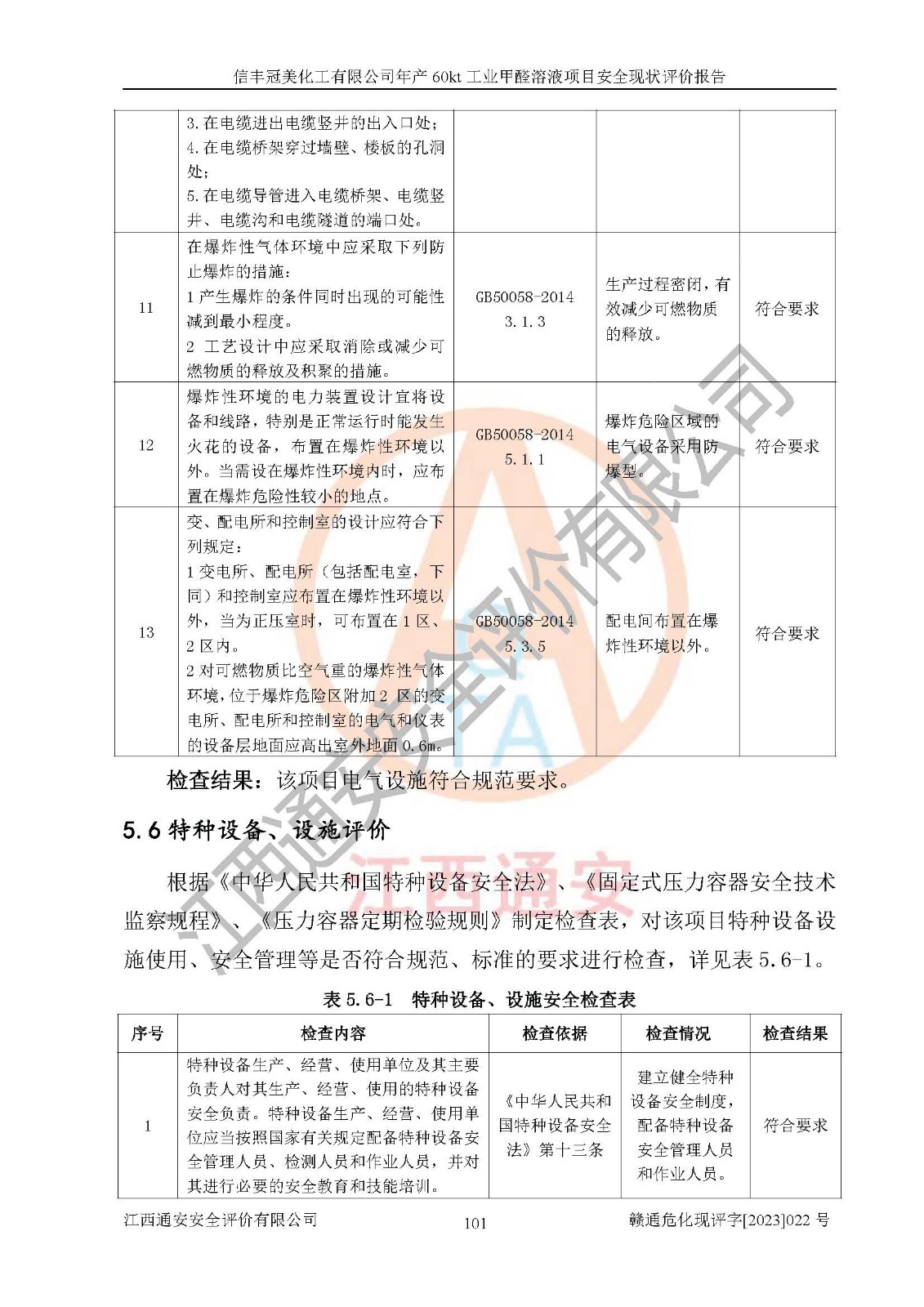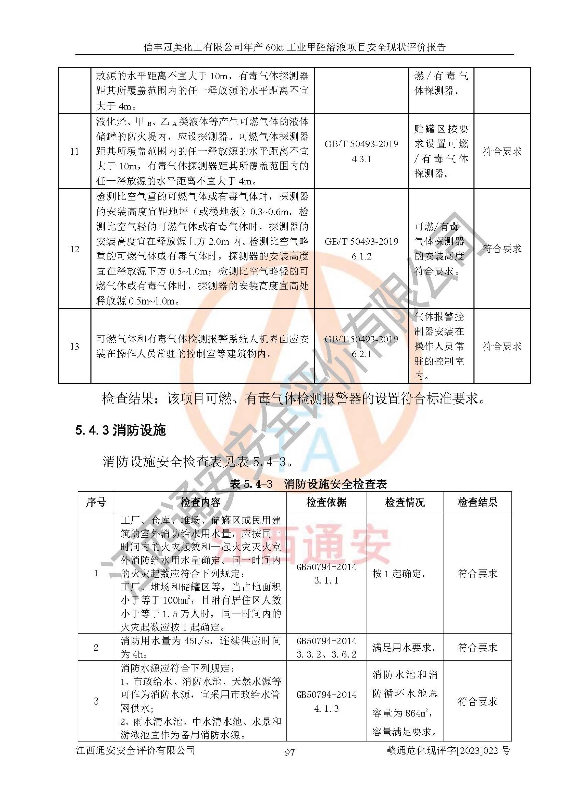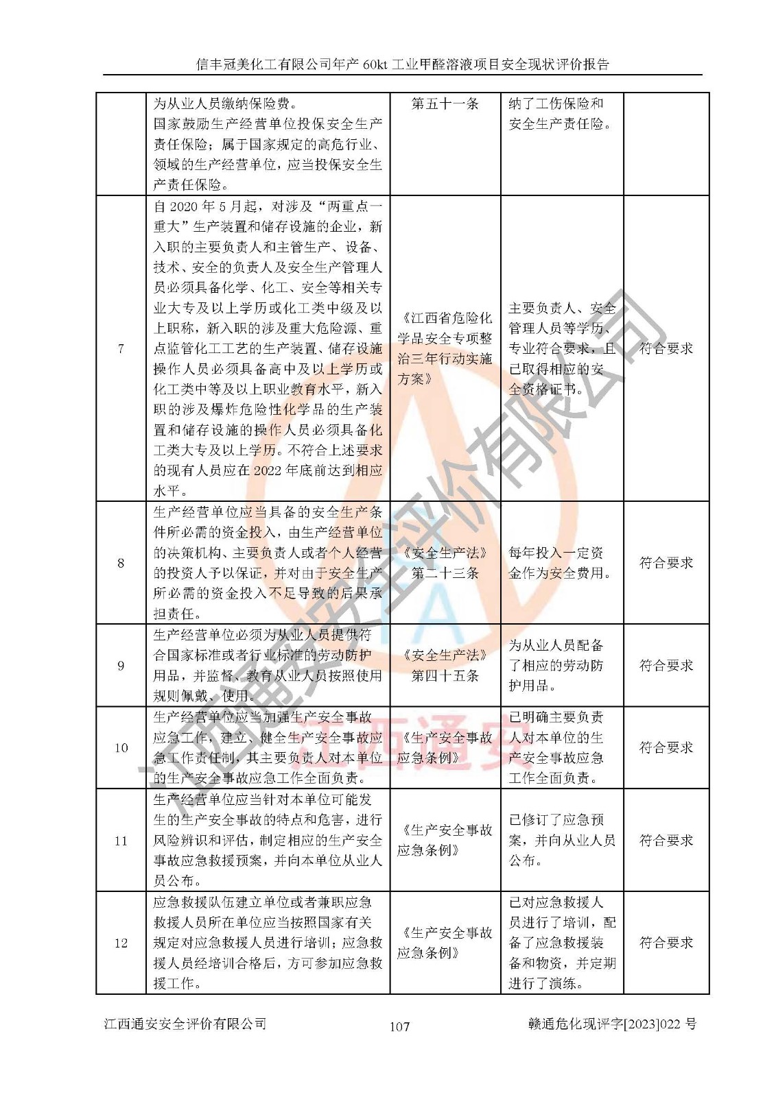 信豐冠美化工有限公司位于江西省贛州市信豐縣工業(yè)園偉邦路,法定**人為汪學斌,成立于2007年04月09日,注冊資本壹仟萬元整,營業(yè)執(zhí)照經營范圍為工業(yè)甲醛、尿醛樹脂膠生產、銷售(憑許可證經營)等。 信豐冠美化工有限公司2020年07月23日取得了《安全生產許可證》,許可證編號:(贛)WH安許證字[2008]0500號,許可范圍為工業(yè)甲醛溶液(60kt/a),**期2020年08月06日至2023年08月05日。該公司2022年8月30日取得了安全生產標準化證書,證書編號:贛AQBWⅡ[2022]015,**期至2025年8月。該公司現(xiàn)有員工23人,其中專職安全管理人員1人。 根據《江西省危險化學品產業(yè)轉移項目和化工園區(qū)安全風險防控專項整治實施方案》(贛安辦字〔2021〕86 號)要求,為提升生產本質安全,減少重大危險源,信豐冠美化工有限公司對貯罐區(qū)進行了調整,停用1臺甲醇儲罐和1臺甲醇計量罐,2臺甲醇儲罐變更為2臺甲醛儲罐。信豐冠美化工有限公司委托山東富海石化工程有限公司對60kt/a工業(yè)甲醛項目出具了在役化工裝置安全設計診斷及整改設計文本和圖紙(2022年12月),取得了贛州市應急管理局出具的審查意見,并對貯罐區(qū)進行了整改。貯罐區(qū)整改完成后,經辨識,信豐冠美化工有限公司生產、儲存單元不構成危險化學品重大危險源。信豐冠美化工有限公司向信豐縣應急管理局申請了重大危險源核銷,2023年2月2日取得了核銷登記表,核銷編號為HX贛360722[2023]001。 信豐冠美化工有限公司年產60kt工業(yè)甲醛溶液項目生產過程中涉及的原輔材料為甲醇和銀觸媒(催化劑),氮封需要使用氮氣,副反應產物為氫氣,產品為甲醛溶液。根據《危險化學品目錄》,該項目涉及的甲醇、氮氣[壓縮的]、氫氣、甲醛和甲醛溶液屬于危險化學品。經辨識,甲醇和氫氣屬于重點監(jiān)管的危險化學品,甲醛屬于高毒物品,甲醇屬于特別管控的危險化學品,不涉及監(jiān)控化學品、易制毒化學品、易制爆危險化學品和劇毒化學品,生產、儲存單元不構成危險化學品重大危險源,涉及的氧化反應屬于重點監(jiān)管的危險化工工藝。根據《安全生產許可證條例》、《危險化學品安全管理條例》和《危險化學品生產企業(yè)安全生產許可實施辦法》的相關規(guī)定,該項目甲醛溶液屬于危險化學品,需要辦理危險化學品安全生產許可證。根據生產工藝特點及物料的理化特性可知,該項目生產過程中存在火災與爆炸、中毒與窒息、觸電、機械傷害等危險有害因素。 該公司自2020年07月23日取得安全生產許可證以來,生產運行正常,未發(fā)生一般及以上生產安全事故。 |
