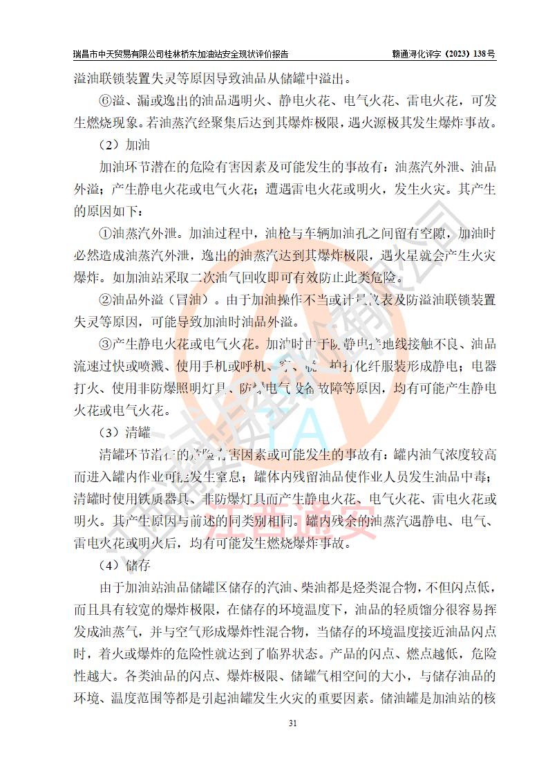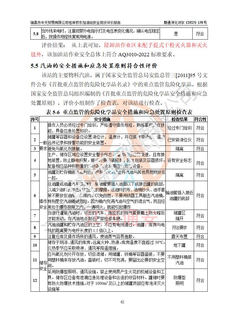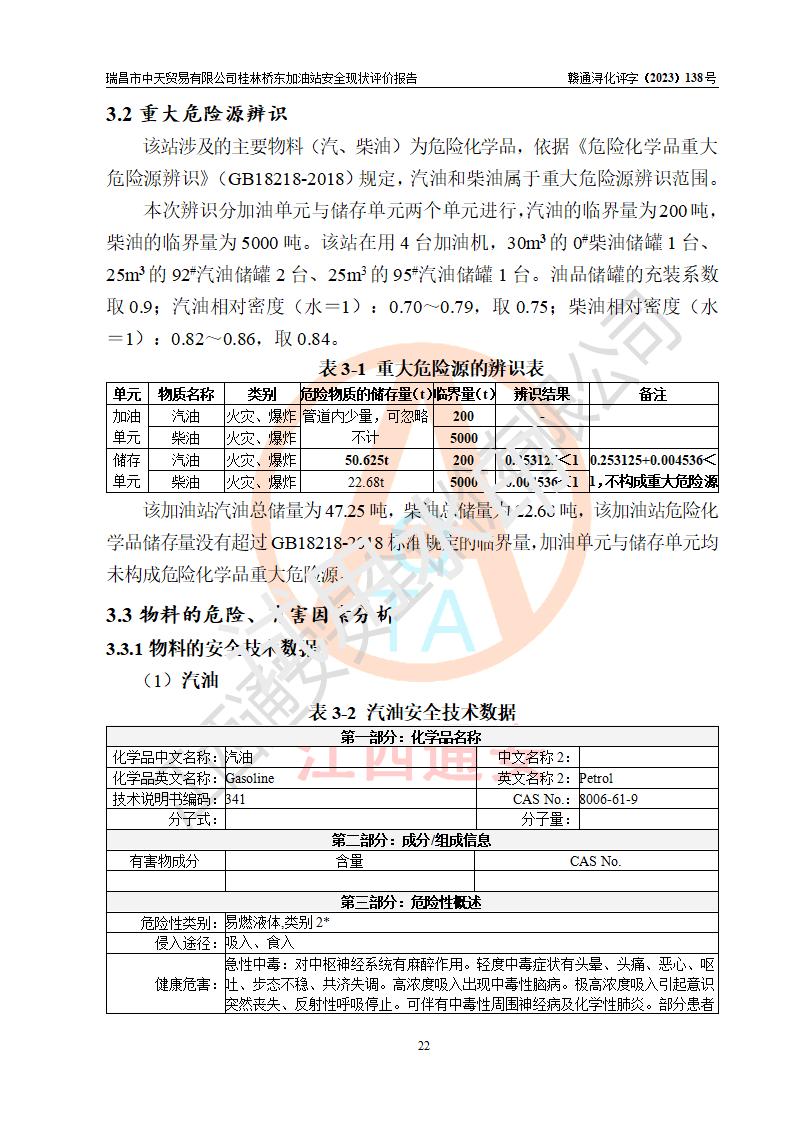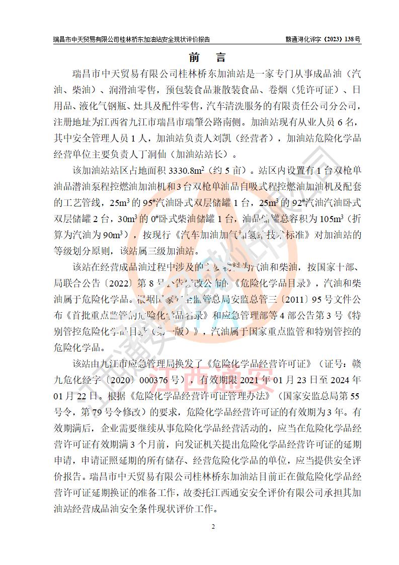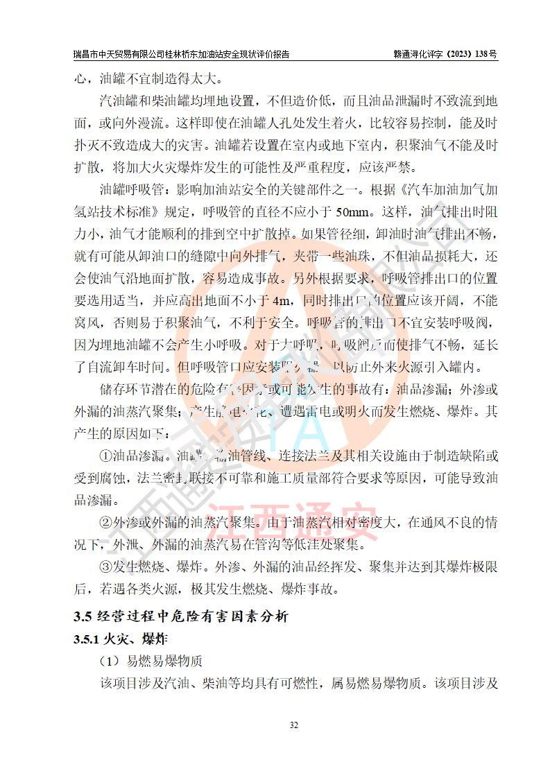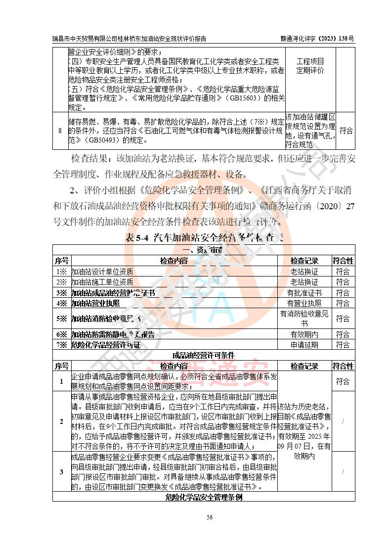 瑞昌市中天貿(mào)易有限公司桂林橋東加油站是一家專門從事成品油(汽油、柴油)、潤滑油零售,預(yù)包裝食品兼散裝食品、卷煙(憑許可證)、日用品、液化氣鋼瓶、灶具及配件零售,汽車清洗服務(wù)的有限責任公司分公司,注冊地址為江西省九江市瑞昌市瑞肇公路南側(cè)。加油站現(xiàn)有從業(yè)人員6名,其中安全管理人員1人,加油站負責人劉凱(經(jīng)營者),加油站危險化學(xué)品經(jīng)營單位主要負責人丁洞仙(加油站站長)。 該加油站站區(qū)占地面積3330.8m2(約5畝)。站區(qū)內(nèi)設(shè)置有1臺雙槍單油品潛油泵程控燃油加油機和3臺雙槍單油品自吸式程控燃油加油機及配套的工藝管線,25m3的95#汽油臥式雙層儲罐1臺,25m3的92#汽油汽油臥式雙層儲罐2臺,30m3的0#臥式柴油儲罐1臺,油品儲罐總?cè)莘e為105m3(折算為汽油為90m3),按現(xiàn)行《汽車加油加氣加氫站技術(shù)標準》對加油站的等級劃分原則,該站屬三級加油站。 該站在經(jīng)營成品油過程中涉及的主要物料為汽油和柴油,按**十部、局聯(lián)合公告〔2022〕第8號公告修改公布的《危險化學(xué)品目錄》,汽油和柴油屬于危險化學(xué)品。根據(jù)**安全監(jiān)管總局安監(jiān)總管三〔2011〕95號文件公布《首批重點監(jiān)管的危險化學(xué)品名錄》和應(yīng)急管理部等4部公告第3號《特別管控危險化學(xué)品目錄(**版)》,汽油屬于**重點監(jiān)管和特別管控的危險化學(xué)品。 該站由九江市應(yīng)急管理局換發(fā)了《危險化學(xué)品經(jīng)營許可證》(證號:贛九危化經(jīng)字〔2020〕000376號),**期限2021年01月23日至2024年01月22日。根據(jù)《危險化學(xué)品經(jīng)營許可證管理辦法》(**安監(jiān)總局第55號令,第79號令修改)的要求,危險化學(xué)品經(jīng)營許可證的**期為3年。**期滿后,企業(yè)需要繼續(xù)從事危險化學(xué)品經(jīng)營活動的,應(yīng)當在危險化學(xué)品經(jīng)營許可證**期滿3個月前,向發(fā)證機關(guān)提出危險化學(xué)品經(jīng)營許可證的延期申請,申請證照延期的所有儲存、經(jīng)營危險化學(xué)品的單位,應(yīng)當提供安全評價報告。瑞昌市中天貿(mào)易有限公司桂林橋東加油站目前正在做危險化學(xué)品經(jīng)營許可證延期換證的準備工作,故委托江西通安安全評價有限公司承擔其加油站經(jīng)營成品油安全條件現(xiàn)狀評價工作。 江西通安安全評價有限公司接受委托后,組織了評價組對該加油站進行了現(xiàn)場踏勘,對加油站零售經(jīng)營成品油的設(shè)施、設(shè)備、裝置實際運行狀況及管理狀況進行了實地調(diào)查、分析,檢查該站是否符合《危險化學(xué)品安全管理條例》、《危險化學(xué)品經(jīng)營許可證管理辦法》中規(guī)定的經(jīng)營單位應(yīng)具備的基本條件。從安全管理角度檢查和評價該站對安全法規(guī)的執(zhí)行情況,從安全技術(shù)角度檢查項目中安全設(shè)施是否符合**有關(guān)安全生產(chǎn)的法律、法規(guī)和標準。評價組運用安全系統(tǒng)工程的方法,進行危險、有害因素的識別及其危險度的評價,查找該系統(tǒng)生產(chǎn)運行中存在的事故隱患并判定其危險程度,提出合理可行的安全對策措施及建議,在此基礎(chǔ)上,根據(jù)加油站加油作業(yè)工藝程序、站區(qū)內(nèi)功能區(qū)域特點,劃分了評價單元;對劃分的評價單元及單元內(nèi)的危險、有害因素選擇了相應(yīng)的安全評價方法逐項進行分析、評價,提出相應(yīng)的預(yù)防和控制對策措施;在此基礎(chǔ)上完成了安全評價報告初稿,經(jīng)評價公司內(nèi)部五級審核程序,及加油站現(xiàn)場存在的安全隱患**落實整改后出具《瑞昌市中天貿(mào)易有限公司桂林橋東加油站安全現(xiàn)狀評價報告》,以作為該企業(yè)申請《危險化學(xué)品經(jīng)營許可證》延期的安全技術(shù)依據(jù)。 |