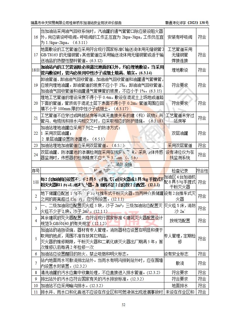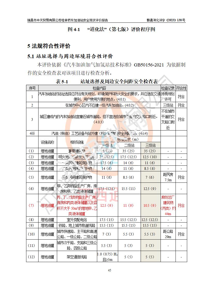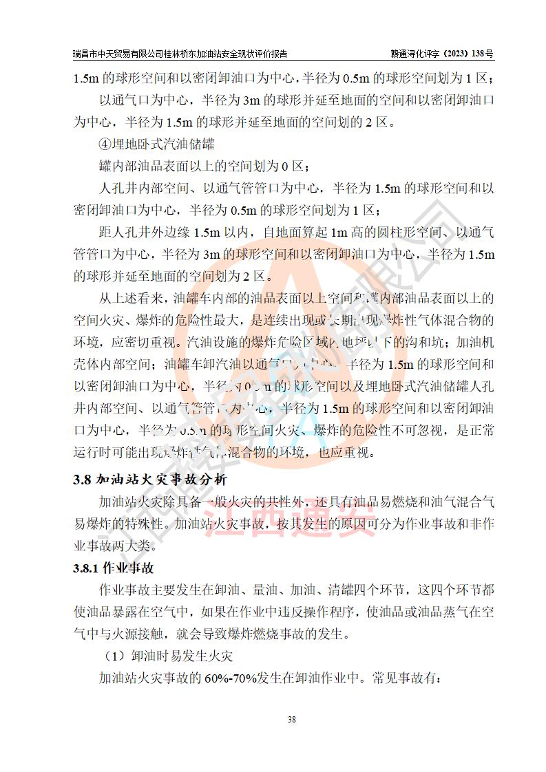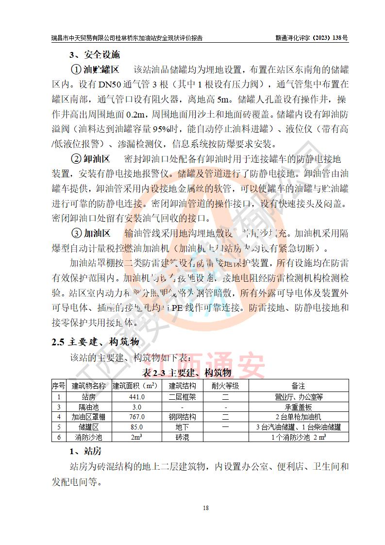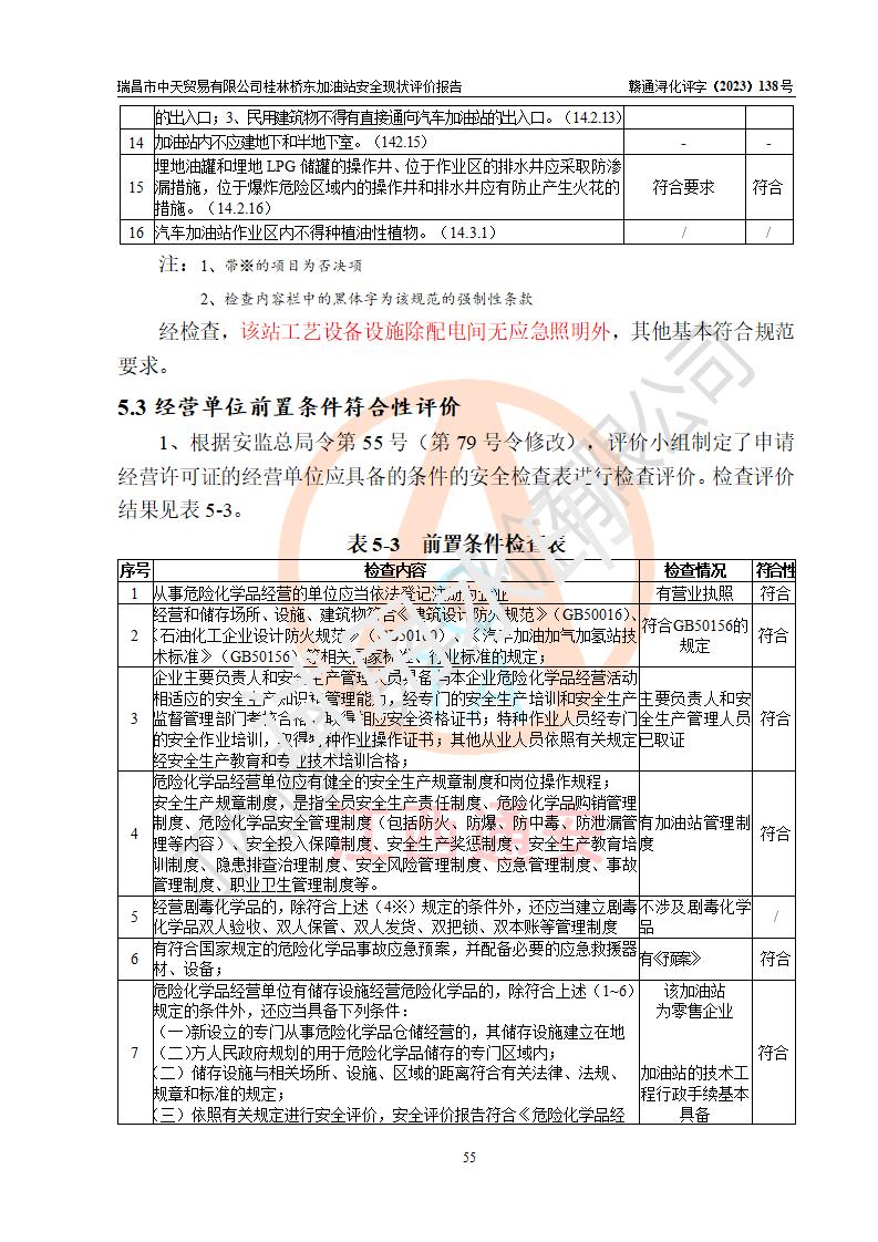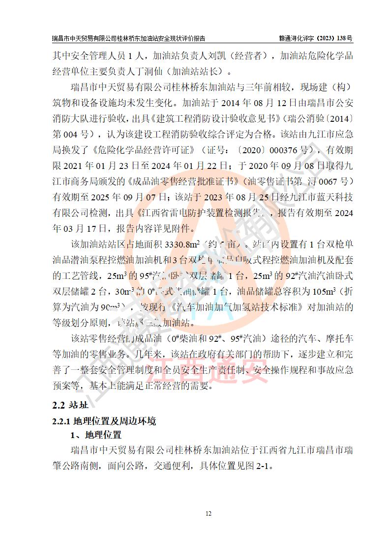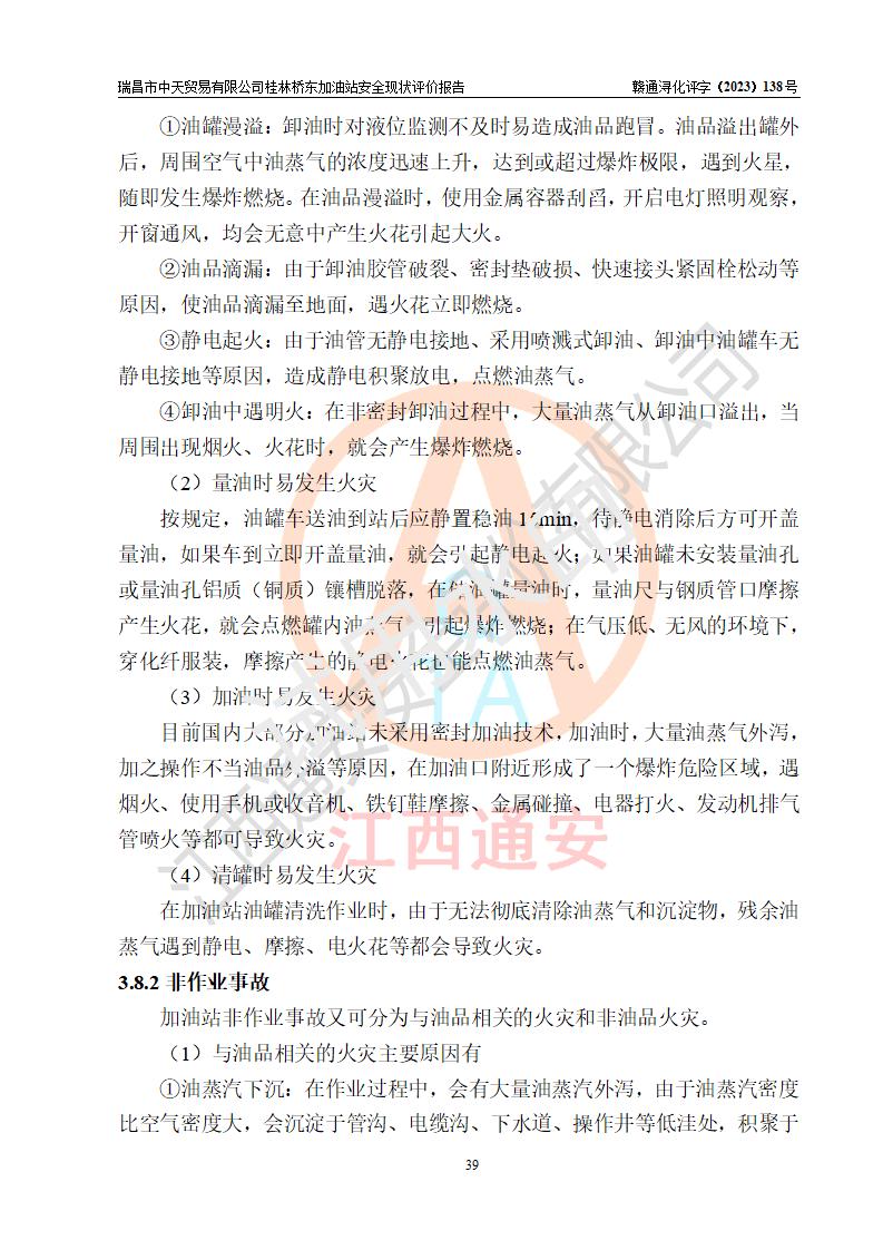 瑞昌市中天貿(mào)易有限公司桂林橋東加油站是一家專門從事成品油(汽油、柴油)、潤滑油零售,預(yù)包裝食品兼散裝食品、卷煙(憑許可證)、日用品、液化氣鋼瓶、灶具及配件零售,汽車清洗服務(wù)的有限責任公司分公司,注冊地址為江西省九江市瑞昌市瑞肇公路南側(cè)。加油站現(xiàn)有從業(yè)人員6名,其中安全管理人員1人,加油站負責人劉凱(經(jīng)營者),加油站危險化學(xué)品經(jīng)營單位主要負責人丁洞仙(加油站站長)。 該加油站站區(qū)占地面積3330.8m2(約5畝)。站區(qū)內(nèi)設(shè)置有1臺雙槍單油品潛油泵程控燃油加油機和3臺雙槍單油品自吸式程控燃油加油機及配套的工藝管線,25m3的95#汽油臥式雙層儲罐1臺,25m3的92#汽油汽油臥式雙層儲罐2臺,30m3的0#臥式柴油儲罐1臺,油品儲罐總?cè)莘e為105m3(折算為汽油為90m3),按現(xiàn)行《汽車加油加氣加氫站技術(shù)標準》對加油站的等級劃分原則,該站屬三級加油站。 該站在經(jīng)營成品油過程中涉及的主要物料為汽油和柴油,按**十部、局聯(lián)合公告〔2022〕第8號公告修改公布的《危險化學(xué)品目錄》,汽油和柴油屬于危險化學(xué)品。根據(jù)**安全監(jiān)管總局安監(jiān)總管三〔2011〕95號文件公布《首批重點監(jiān)管的危險化學(xué)品名錄》和應(yīng)急管理部等4部公告第3號《特別管控危險化學(xué)品目錄(**版)》,汽油屬于**重點監(jiān)管和特別管控的危險化學(xué)品。 該站由九江市應(yīng)急管理局換發(fā)了《危險化學(xué)品經(jīng)營許可證》(證號:贛九危化經(jīng)字〔2020〕000376號),**期限2021年01月23日至2024年01月22日。根據(jù)《危險化學(xué)品經(jīng)營許可證管理辦法》(**安監(jiān)總局第55號令,第79號令修改)的要求,危險化學(xué)品經(jīng)營許可證的**期為3年。**期滿后,企業(yè)需要繼續(xù)從事危險化學(xué)品經(jīng)營活動的,應(yīng)當在危險化學(xué)品經(jīng)營許可證**期滿3個月前,向發(fā)證機關(guān)提出危險化學(xué)品經(jīng)營許可證的延期申請,申請證照延期的所有儲存、經(jīng)營危險化學(xué)品的單位,應(yīng)當提供安全評價報告。瑞昌市中天貿(mào)易有限公司桂林橋東加油站目前正在做危險化學(xué)品經(jīng)營許可證延期換證的準備工作,故委托江西通安安全評價有限公司承擔其加油站經(jīng)營成品油安全條件現(xiàn)狀評價工作。 江西通安安全評價有限公司接受委托后,組織了評價組對該加油站進行了現(xiàn)場踏勘,對加油站零售經(jīng)營成品油的設(shè)施、設(shè)備、裝置實際運行狀況及管理狀況進行了實地調(diào)查、分析,檢查該站是否符合《危險化學(xué)品安全管理條例》、《危險化學(xué)品經(jīng)營許可證管理辦法》中規(guī)定的經(jīng)營單位應(yīng)具備的基本條件。從安全管理角度檢查和評價該站對安全法規(guī)的執(zhí)行情況,從安全技術(shù)角度檢查項目中安全設(shè)施是否符合**有關(guān)安全生產(chǎn)的法律、法規(guī)和標準。評價組運用安全系統(tǒng)工程的方法,進行危險、有害因素的識別及其危險度的評價,查找該系統(tǒng)生產(chǎn)運行中存在的事故隱患并判定其危險程度,提出合理可行的安全對策措施及建議,在此基礎(chǔ)上,根據(jù)加油站加油作業(yè)工藝程序、站區(qū)內(nèi)功能區(qū)域特點,劃分了評價單元;對劃分的評價單元及單元內(nèi)的危險、有害因素選擇了相應(yīng)的安全評價方法逐項進行分析、評價,提出相應(yīng)的預(yù)防和控制對策措施;在此基礎(chǔ)上完成了安全評價報告初稿,經(jīng)評價公司內(nèi)部五級審核程序,及加油站現(xiàn)場存在的安全隱患**落實整改后出具《瑞昌市中天貿(mào)易有限公司桂林橋東加油站安全現(xiàn)狀評價報告》,以作為該企業(yè)申請《危險化學(xué)品經(jīng)營許可證》延期的安全技術(shù)依據(jù)。 |