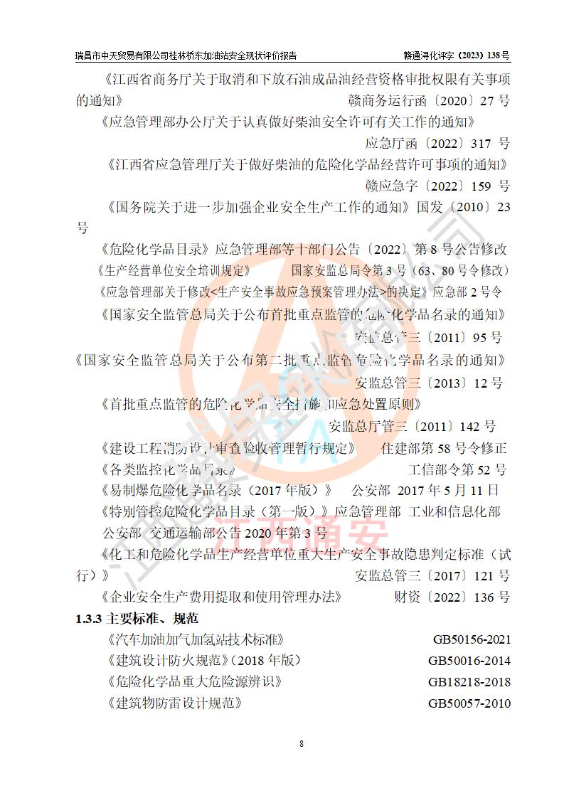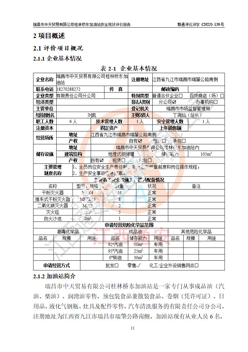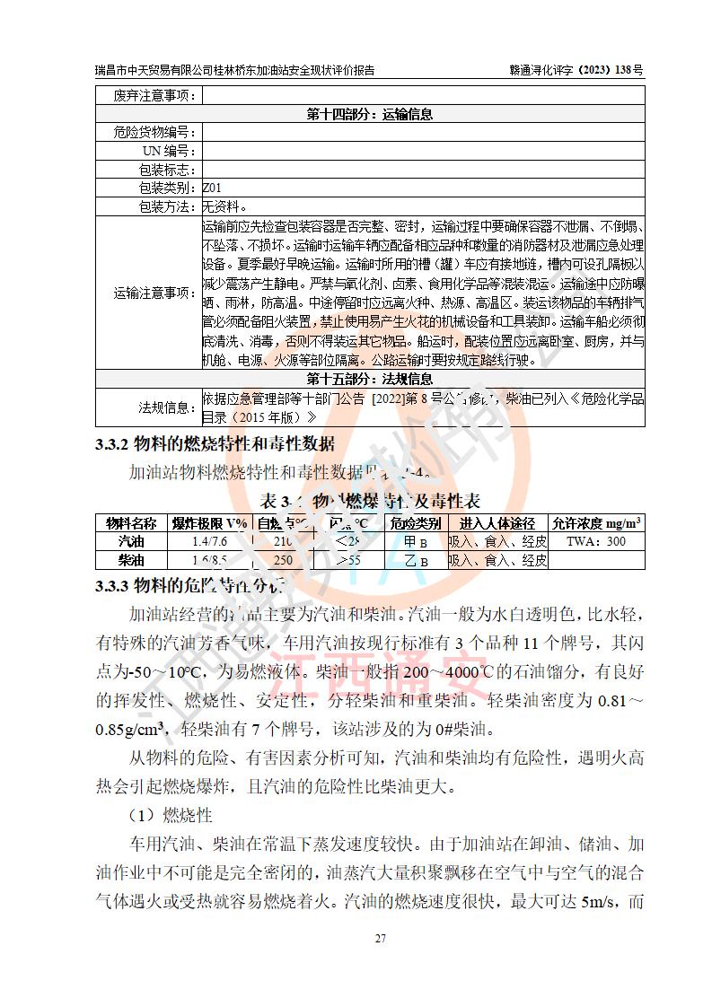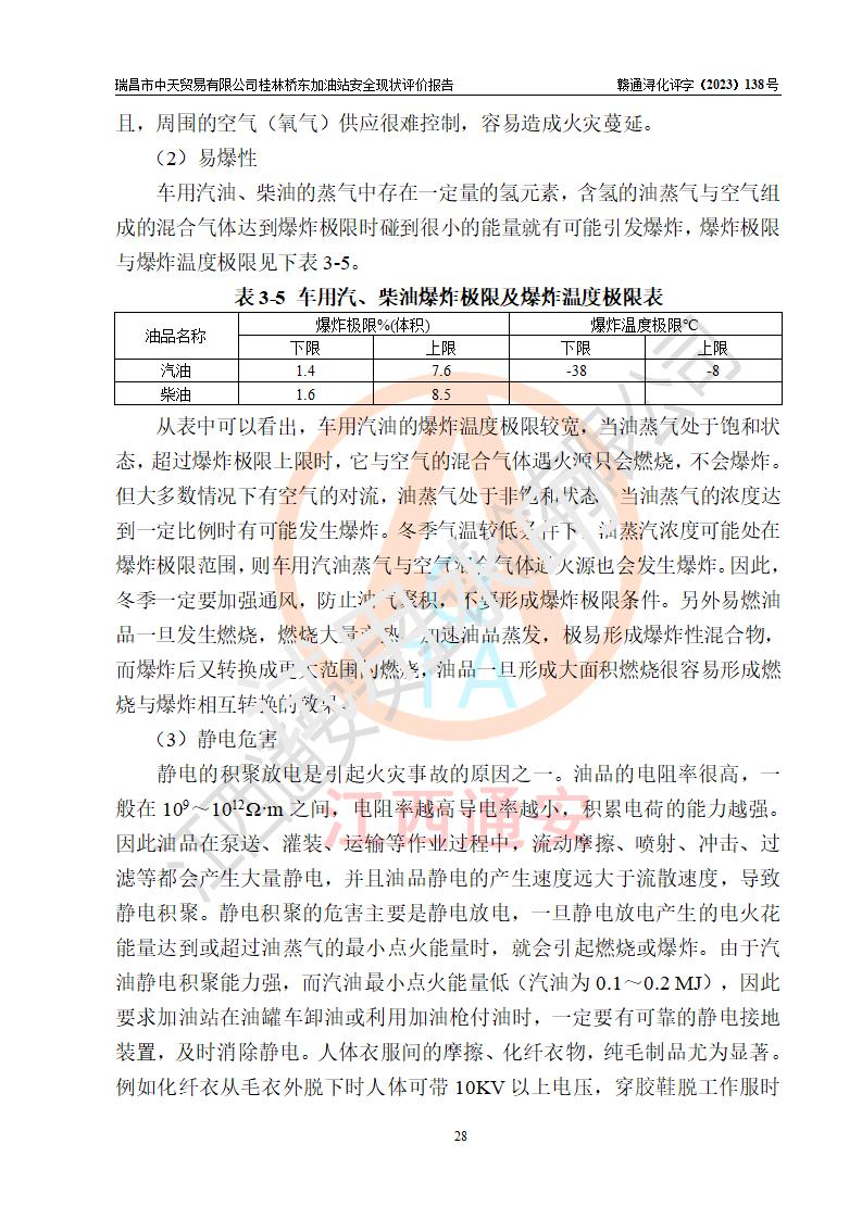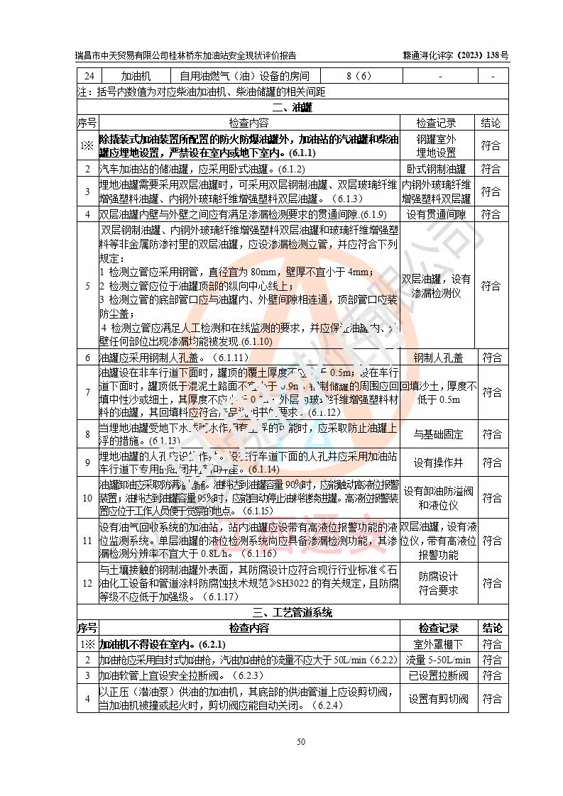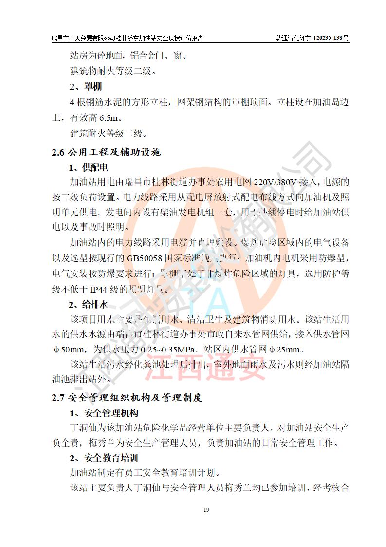 瑞昌市中天貿(mào)易有限公司桂林橋東加油站是一家專門從事成品油(汽油、柴油)、潤滑油零售,預(yù)包裝食品兼散裝食品、卷煙(憑許可證)、日用品、液化氣鋼瓶、灶具及配件零售,汽車清洗服務(wù)的有限責任公司分公司,注冊地址為江西省九江市瑞昌市瑞肇公路南側(cè)。加油站現(xiàn)有從業(yè)人員6名,其中安全管理人員1人,加油站負責人劉凱(經(jīng)營者),加油站危險化學(xué)品經(jīng)營單位主要負責人丁洞仙(加油站站長)。 該加油站站區(qū)占地面積3330.8m2(約5畝)。站區(qū)內(nèi)設(shè)置有1臺雙槍單油品潛油泵程控燃油加油機和3臺雙槍單油品自吸式程控燃油加油機及配套的工藝管線,25m3的95#汽油臥式雙層儲罐1臺,25m3的92#汽油汽油臥式雙層儲罐2臺,30m3的0#臥式柴油儲罐1臺,油品儲罐總?cè)莘e為105m3(折算為汽油為90m3),按現(xiàn)行《汽車加油加氣加氫站技術(shù)標準》對加油站的等級劃分原則,該站屬三級加油站。 該站在經(jīng)營成品油過程中涉及的主要物料為汽油和柴油,按**十部、局聯(lián)合公告〔2022〕第8號公告修改公布的《危險化學(xué)品目錄》,汽油和柴油屬于危險化學(xué)品。根據(jù)**安全監(jiān)管總局安監(jiān)總管三〔2011〕95號文件公布《首批重點監(jiān)管的危險化學(xué)品名錄》和應(yīng)急管理部等4部公告第3號《特別管控危險化學(xué)品目錄(**版)》,汽油屬于**重點監(jiān)管和特別管控的危險化學(xué)品。 該站由九江市應(yīng)急管理局換發(fā)了《危險化學(xué)品經(jīng)營許可證》(證號:贛九危化經(jīng)字〔2020〕000376號),**期限2021年01月23日至2024年01月22日。根據(jù)《危險化學(xué)品經(jīng)營許可證管理辦法》(**安監(jiān)總局第55號令,第79號令修改)的要求,危險化學(xué)品經(jīng)營許可證的**期為3年。**期滿后,企業(yè)需要繼續(xù)從事危險化學(xué)品經(jīng)營活動的,應(yīng)當在危險化學(xué)品經(jīng)營許可證**期滿3個月前,向發(fā)證機關(guān)提出危險化學(xué)品經(jīng)營許可證的延期申請,申請證照延期的所有儲存、經(jīng)營危險化學(xué)品的單位,應(yīng)當提供安全評價報告。瑞昌市中天貿(mào)易有限公司桂林橋東加油站目前正在做危險化學(xué)品經(jīng)營許可證延期換證的準備工作,故委托江西通安安全評價有限公司承擔其加油站經(jīng)營成品油安全條件現(xiàn)狀評價工作。 江西通安安全評價有限公司接受委托后,組織了評價組對該加油站進行了現(xiàn)場踏勘,對加油站零售經(jīng)營成品油的設(shè)施、設(shè)備、裝置實際運行狀況及管理狀況進行了實地調(diào)查、分析,檢查該站是否符合《危險化學(xué)品安全管理條例》、《危險化學(xué)品經(jīng)營許可證管理辦法》中規(guī)定的經(jīng)營單位應(yīng)具備的基本條件。從安全管理角度檢查和評價該站對安全法規(guī)的執(zhí)行情況,從安全技術(shù)角度檢查項目中安全設(shè)施是否符合**有關(guān)安全生產(chǎn)的法律、法規(guī)和標準。評價組運用安全系統(tǒng)工程的方法,進行危險、有害因素的識別及其危險度的評價,查找該系統(tǒng)生產(chǎn)運行中存在的事故隱患并判定其危險程度,提出合理可行的安全對策措施及建議,在此基礎(chǔ)上,根據(jù)加油站加油作業(yè)工藝程序、站區(qū)內(nèi)功能區(qū)域特點,劃分了評價單元;對劃分的評價單元及單元內(nèi)的危險、有害因素選擇了相應(yīng)的安全評價方法逐項進行分析、評價,提出相應(yīng)的預(yù)防和控制對策措施;在此基礎(chǔ)上完成了安全評價報告初稿,經(jīng)評價公司內(nèi)部五級審核程序,及加油站現(xiàn)場存在的安全隱患**落實整改后出具《瑞昌市中天貿(mào)易有限公司桂林橋東加油站安全現(xiàn)狀評價報告》,以作為該企業(yè)申請《危險化學(xué)品經(jīng)營許可證》延期的安全技術(shù)依據(jù)。 |
