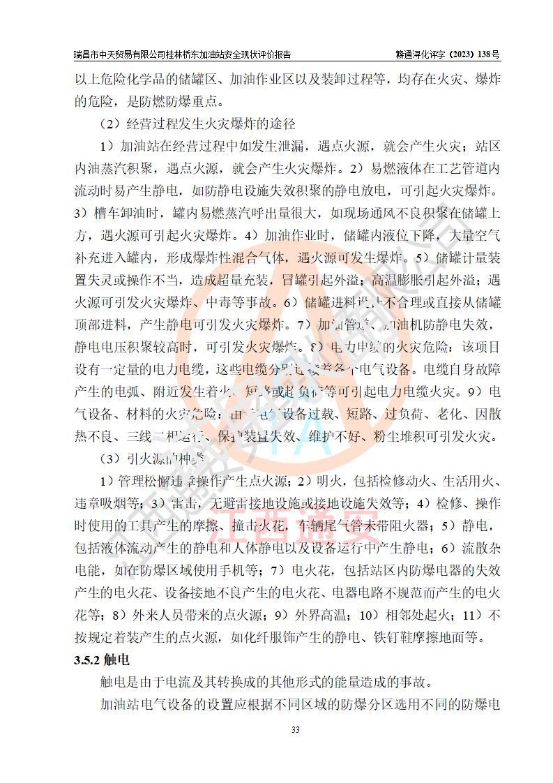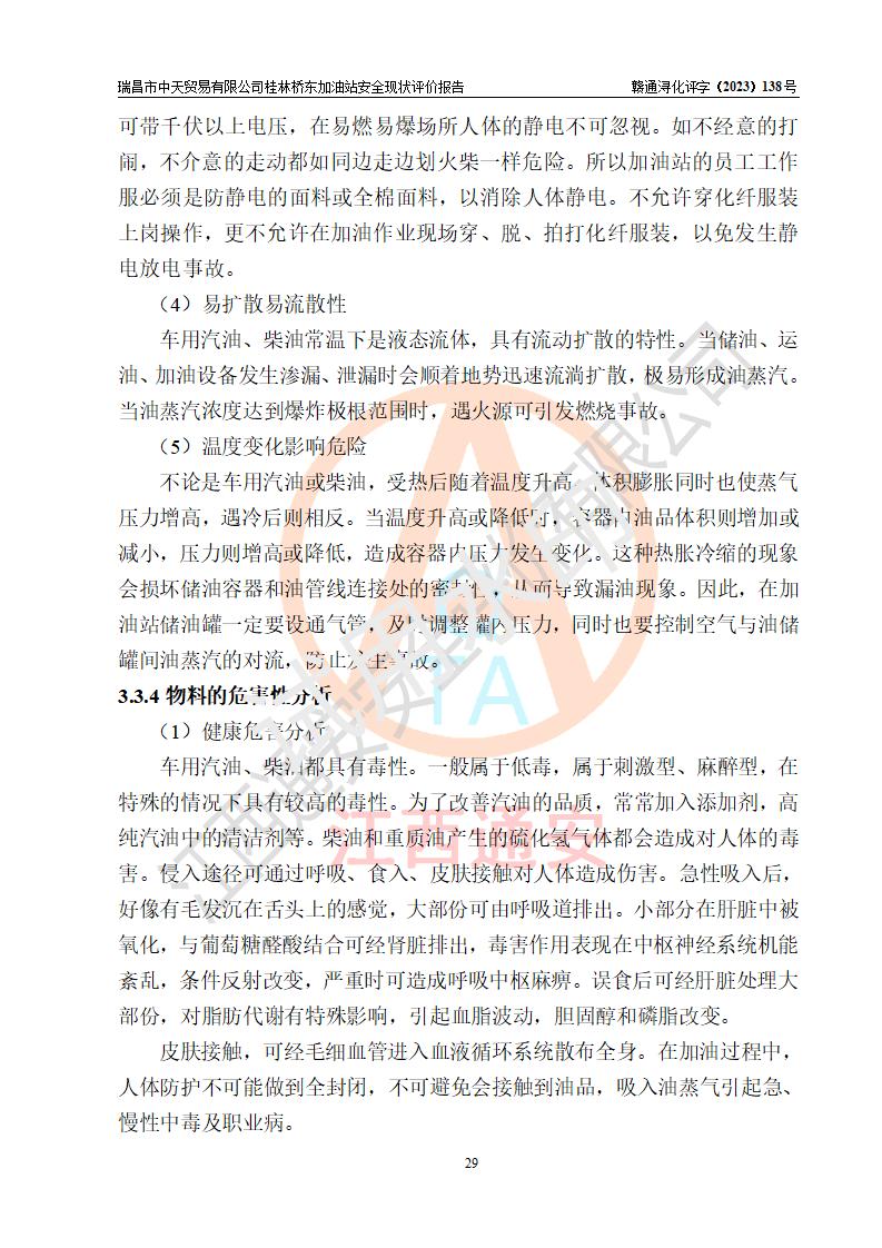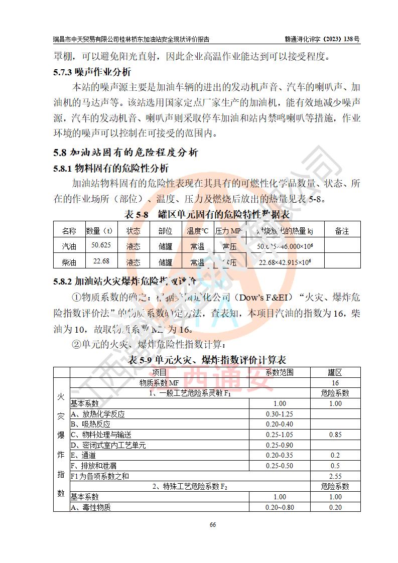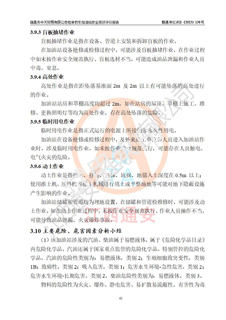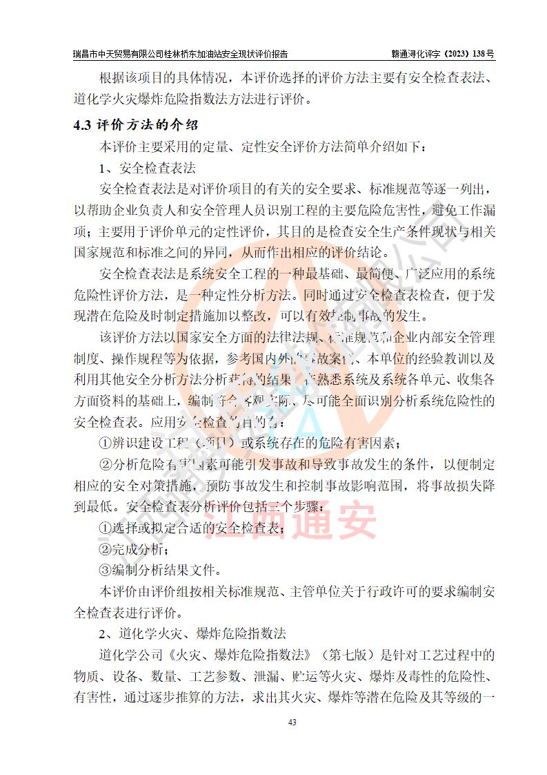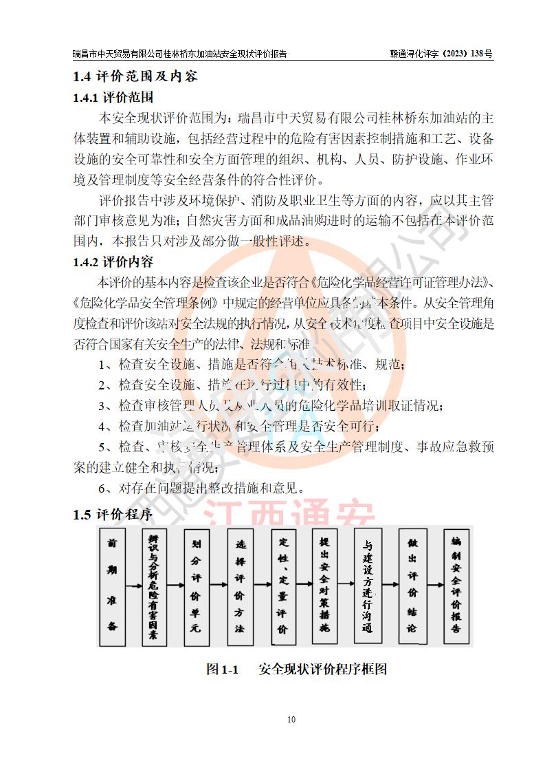 瑞昌市中天貿(mào)易有限公司桂林橋東加油站是一家專門從事成品油(汽油、柴油)、潤滑油零售,預(yù)包裝食品兼散裝食品、卷煙(憑許可證)、日用品、液化氣鋼瓶、灶具及配件零售,汽車清洗服務(wù)的有限責任公司分公司,注冊地址為江西省九江市瑞昌市瑞肇公路南側(cè)。加油站現(xiàn)有從業(yè)人員6名,其中安全管理人員1人,加油站負責人劉凱(經(jīng)營者),加油站危險化學(xué)品經(jīng)營單位主要負責人丁洞仙(加油站站長)。 該加油站站區(qū)占地面積3330.8m2(約5畝)。站區(qū)內(nèi)設(shè)置有1臺雙槍單油品潛油泵程控燃油加油機和3臺雙槍單油品自吸式程控燃油加油機及配套的工藝管線,25m3的95#汽油臥式雙層儲罐1臺,25m3的92#汽油汽油臥式雙層儲罐2臺,30m3的0#臥式柴油儲罐1臺,油品儲罐總?cè)莘e為105m3(折算為汽油為90m3),按現(xiàn)行《汽車加油加氣加氫站技術(shù)標準》對加油站的等級劃分原則,該站屬三級加油站。 該站在經(jīng)營成品油過程中涉及的主要物料為汽油和柴油,按**十部、局聯(lián)合公告〔2022〕第8號公告修改公布的《危險化學(xué)品目錄》,汽油和柴油屬于危險化學(xué)品。根據(jù)**安全監(jiān)管總局安監(jiān)總管三〔2011〕95號文件公布《首批重點監(jiān)管的危險化學(xué)品名錄》和應(yīng)急管理部等4部公告第3號《特別管控危險化學(xué)品目錄(**版)》,汽油屬于**重點監(jiān)管和特別管控的危險化學(xué)品。 該站由九江市應(yīng)急管理局換發(fā)了《危險化學(xué)品經(jīng)營許可證》(證號:贛九危化經(jīng)字〔2020〕000376號),**期限2021年01月23日至2024年01月22日。根據(jù)《危險化學(xué)品經(jīng)營許可證管理辦法》(**安監(jiān)總局第55號令,第79號令修改)的要求,危險化學(xué)品經(jīng)營許可證的**期為3年。**期滿后,企業(yè)需要繼續(xù)從事危險化學(xué)品經(jīng)營活動的,應(yīng)當在危險化學(xué)品經(jīng)營許可證**期滿3個月前,向發(fā)證機關(guān)提出危險化學(xué)品經(jīng)營許可證的延期申請,申請證照延期的所有儲存、經(jīng)營危險化學(xué)品的單位,應(yīng)當提供安全評價報告。瑞昌市中天貿(mào)易有限公司桂林橋東加油站目前正在做危險化學(xué)品經(jīng)營許可證延期換證的準備工作,故委托江西通安安全評價有限公司承擔其加油站經(jīng)營成品油安全條件現(xiàn)狀評價工作。 江西通安安全評價有限公司接受委托后,組織了評價組對該加油站進行了現(xiàn)場踏勘,對加油站零售經(jīng)營成品油的設(shè)施、設(shè)備、裝置實際運行狀況及管理狀況進行了實地調(diào)查、分析,檢查該站是否符合《危險化學(xué)品安全管理條例》、《危險化學(xué)品經(jīng)營許可證管理辦法》中規(guī)定的經(jīng)營單位應(yīng)具備的基本條件。從安全管理角度檢查和評價該站對安全法規(guī)的執(zhí)行情況,從安全技術(shù)角度檢查項目中安全設(shè)施是否符合**有關(guān)安全生產(chǎn)的法律、法規(guī)和標準。評價組運用安全系統(tǒng)工程的方法,進行危險、有害因素的識別及其危險度的評價,查找該系統(tǒng)生產(chǎn)運行中存在的事故隱患并判定其危險程度,提出合理可行的安全對策措施及建議,在此基礎(chǔ)上,根據(jù)加油站加油作業(yè)工藝程序、站區(qū)內(nèi)功能區(qū)域特點,劃分了評價單元;對劃分的評價單元及單元內(nèi)的危險、有害因素選擇了相應(yīng)的安全評價方法逐項進行分析、評價,提出相應(yīng)的預(yù)防和控制對策措施;在此基礎(chǔ)上完成了安全評價報告初稿,經(jīng)評價公司內(nèi)部五級審核程序,及加油站現(xiàn)場存在的安全隱患**落實整改后出具《瑞昌市中天貿(mào)易有限公司桂林橋東加油站安全現(xiàn)狀評價報告》,以作為該企業(yè)申請《危險化學(xué)品經(jīng)營許可證》延期的安全技術(shù)依據(jù)。 |