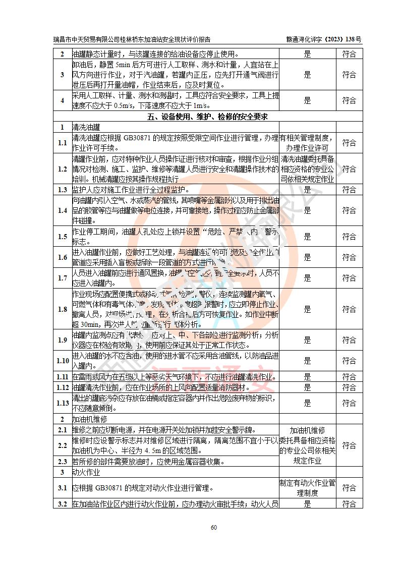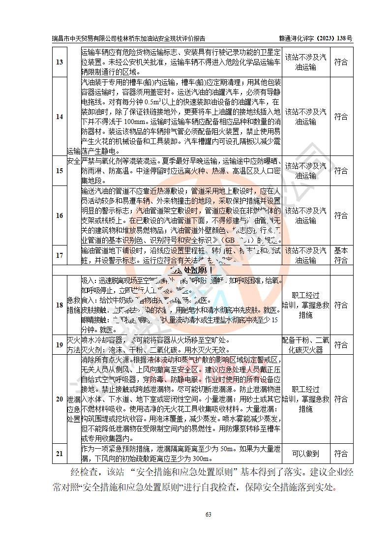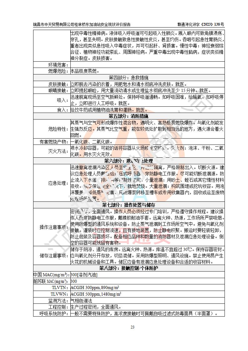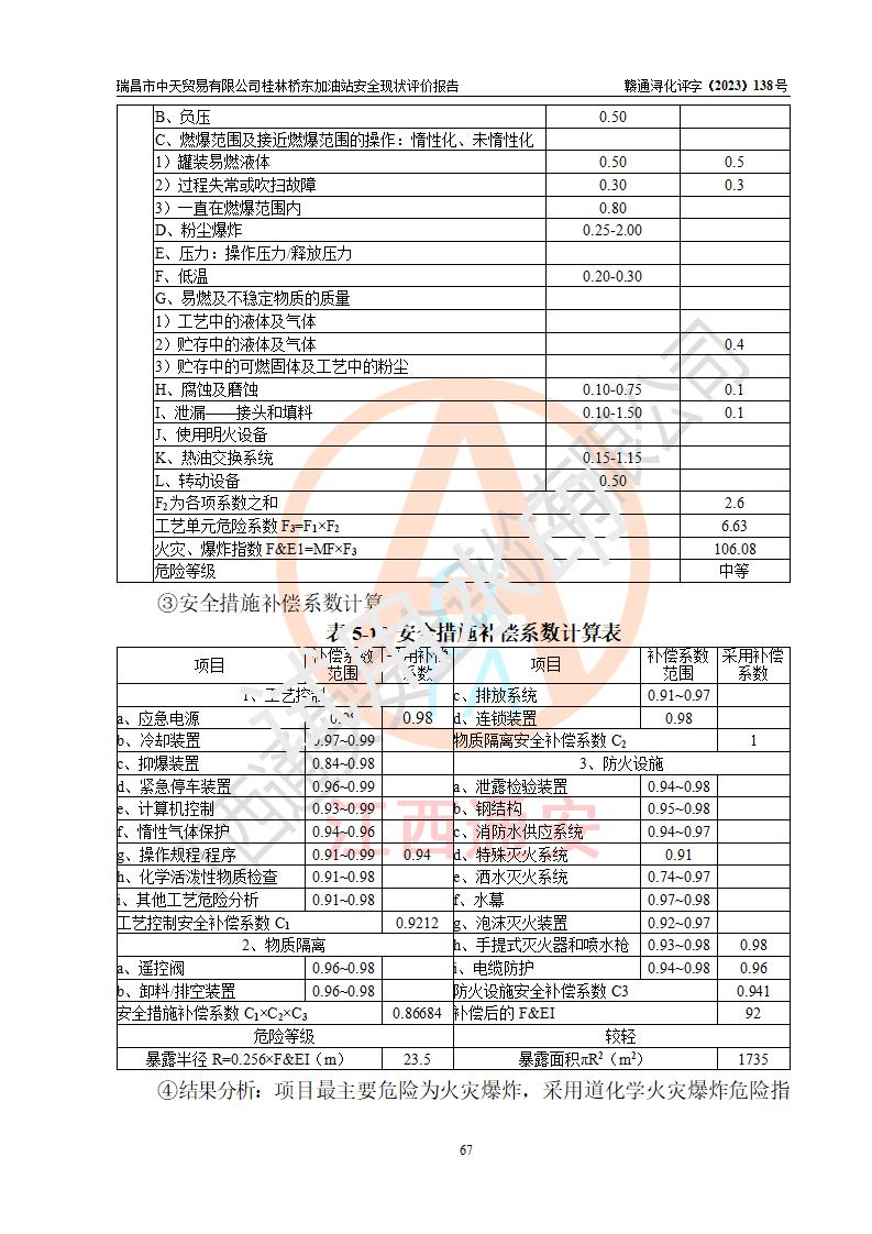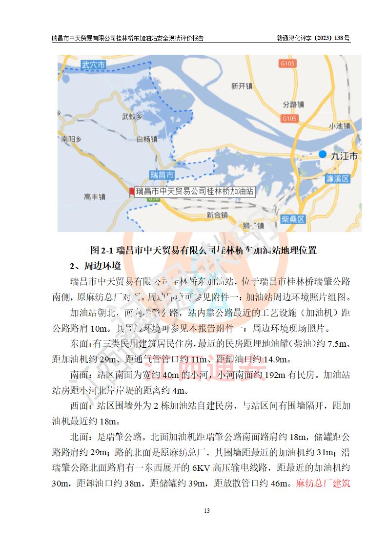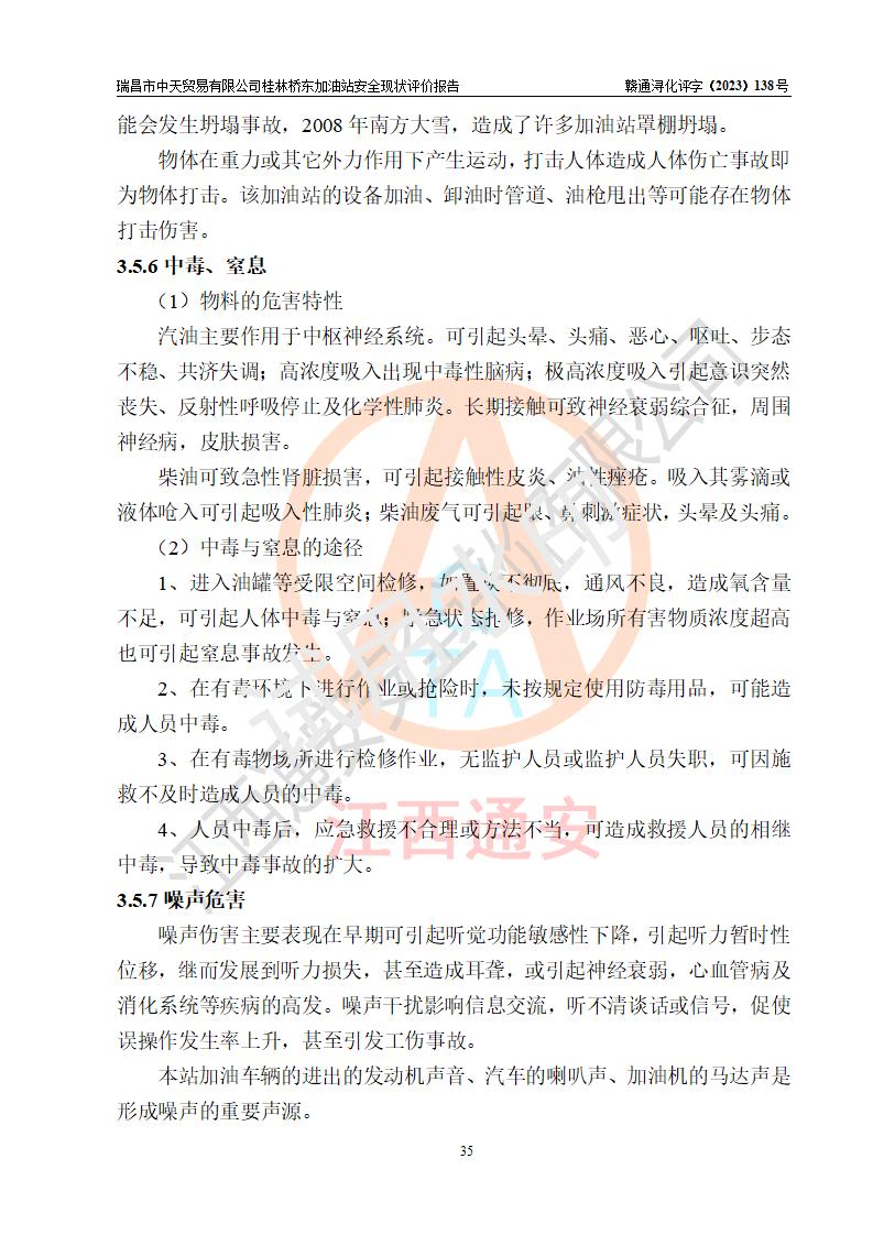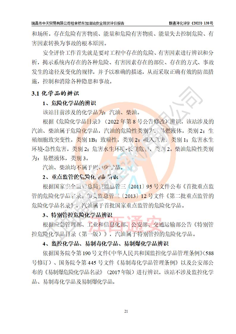 瑞昌市中天貿(mào)易有限公司桂林橋東加油站是一家專門從事成品油(汽油、柴油)、潤滑油零售,預(yù)包裝食品兼散裝食品、卷煙(憑許可證)、日用品、液化氣鋼瓶、灶具及配件零售,汽車清洗服務(wù)的有限責任公司分公司,注冊地址為江西省九江市瑞昌市瑞肇公路南側(cè)。加油站現(xiàn)有從業(yè)人員6名,其中安全管理人員1人,加油站負責人劉凱(經(jīng)營者),加油站危險化學(xué)品經(jīng)營單位主要負責人丁洞仙(加油站站長)。 該加油站站區(qū)占地面積3330.8m2(約5畝)。站區(qū)內(nèi)設(shè)置有1臺雙槍單油品潛油泵程控燃油加油機和3臺雙槍單油品自吸式程控燃油加油機及配套的工藝管線,25m3的95#汽油臥式雙層儲罐1臺,25m3的92#汽油汽油臥式雙層儲罐2臺,30m3的0#臥式柴油儲罐1臺,油品儲罐總?cè)莘e為105m3(折算為汽油為90m3),按現(xiàn)行《汽車加油加氣加氫站技術(shù)標準》對加油站的等級劃分原則,該站屬三級加油站。 該站在經(jīng)營成品油過程中涉及的主要物料為汽油和柴油,按**十部、局聯(lián)合公告〔2022〕第8號公告修改公布的《危險化學(xué)品目錄》,汽油和柴油屬于危險化學(xué)品。根據(jù)**安全監(jiān)管總局安監(jiān)總管三〔2011〕95號文件公布《首批重點監(jiān)管的危險化學(xué)品名錄》和應(yīng)急管理部等4部公告第3號《特別管控危險化學(xué)品目錄(**版)》,汽油屬于**重點監(jiān)管和特別管控的危險化學(xué)品。 該站由九江市應(yīng)急管理局換發(fā)了《危險化學(xué)品經(jīng)營許可證》(證號:贛九危化經(jīng)字〔2020〕000376號),**期限2021年01月23日至2024年01月22日。根據(jù)《危險化學(xué)品經(jīng)營許可證管理辦法》(**安監(jiān)總局第55號令,第79號令修改)的要求,危險化學(xué)品經(jīng)營許可證的**期為3年。**期滿后,企業(yè)需要繼續(xù)從事危險化學(xué)品經(jīng)營活動的,應(yīng)當在危險化學(xué)品經(jīng)營許可證**期滿3個月前,向發(fā)證機關(guān)提出危險化學(xué)品經(jīng)營許可證的延期申請,申請證照延期的所有儲存、經(jīng)營危險化學(xué)品的單位,應(yīng)當提供安全評價報告。瑞昌市中天貿(mào)易有限公司桂林橋東加油站目前正在做危險化學(xué)品經(jīng)營許可證延期換證的準備工作,故委托江西通安安全評價有限公司承擔其加油站經(jīng)營成品油安全條件現(xiàn)狀評價工作。 江西通安安全評價有限公司接受委托后,組織了評價組對該加油站進行了現(xiàn)場踏勘,對加油站零售經(jīng)營成品油的設(shè)施、設(shè)備、裝置實際運行狀況及管理狀況進行了實地調(diào)查、分析,檢查該站是否符合《危險化學(xué)品安全管理條例》、《危險化學(xué)品經(jīng)營許可證管理辦法》中規(guī)定的經(jīng)營單位應(yīng)具備的基本條件。從安全管理角度檢查和評價該站對安全法規(guī)的執(zhí)行情況,從安全技術(shù)角度檢查項目中安全設(shè)施是否符合**有關(guān)安全生產(chǎn)的法律、法規(guī)和標準。評價組運用安全系統(tǒng)工程的方法,進行危險、有害因素的識別及其危險度的評價,查找該系統(tǒng)生產(chǎn)運行中存在的事故隱患并判定其危險程度,提出合理可行的安全對策措施及建議,在此基礎(chǔ)上,根據(jù)加油站加油作業(yè)工藝程序、站區(qū)內(nèi)功能區(qū)域特點,劃分了評價單元;對劃分的評價單元及單元內(nèi)的危險、有害因素選擇了相應(yīng)的安全評價方法逐項進行分析、評價,提出相應(yīng)的預(yù)防和控制對策措施;在此基礎(chǔ)上完成了安全評價報告初稿,經(jīng)評價公司內(nèi)部五級審核程序,及加油站現(xiàn)場存在的安全隱患**落實整改后出具《瑞昌市中天貿(mào)易有限公司桂林橋東加油站安全現(xiàn)狀評價報告》,以作為該企業(yè)申請《危險化學(xué)品經(jīng)營許可證》延期的安全技術(shù)依據(jù)。 |