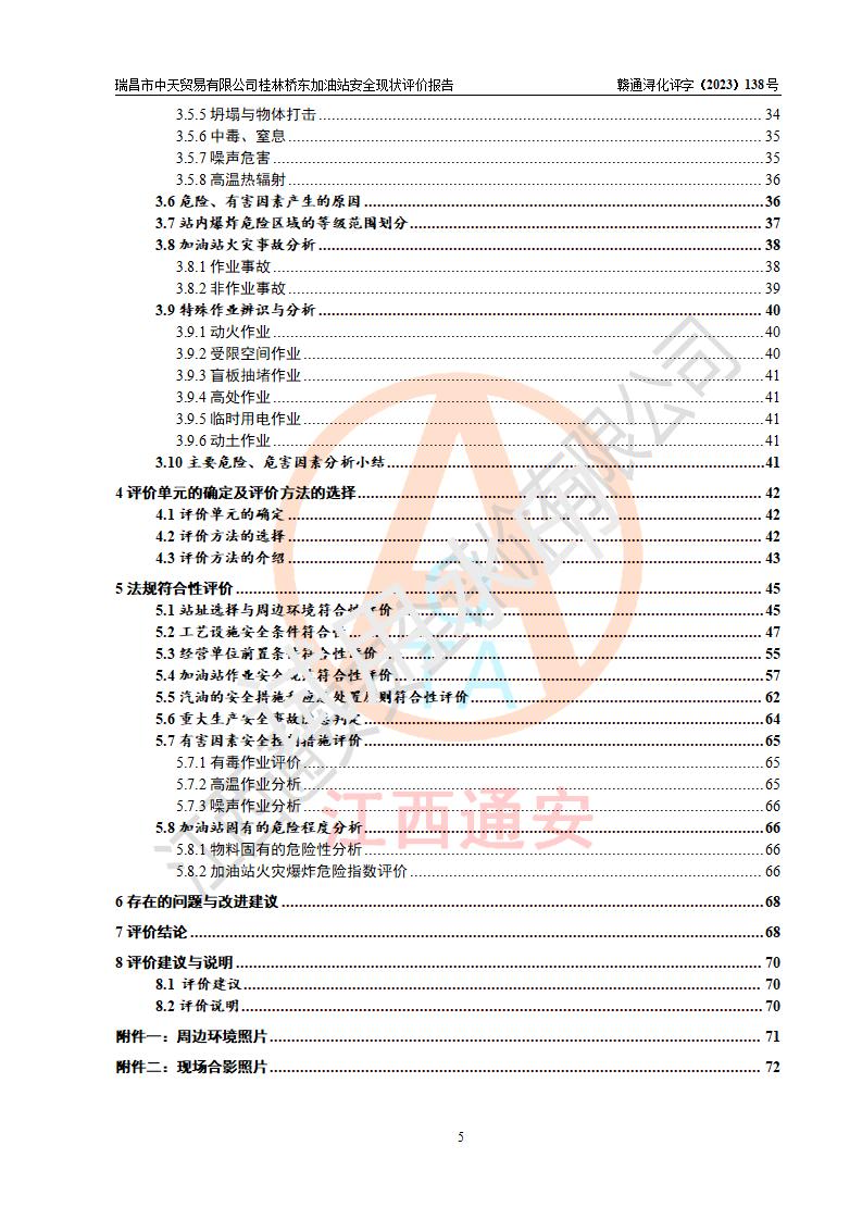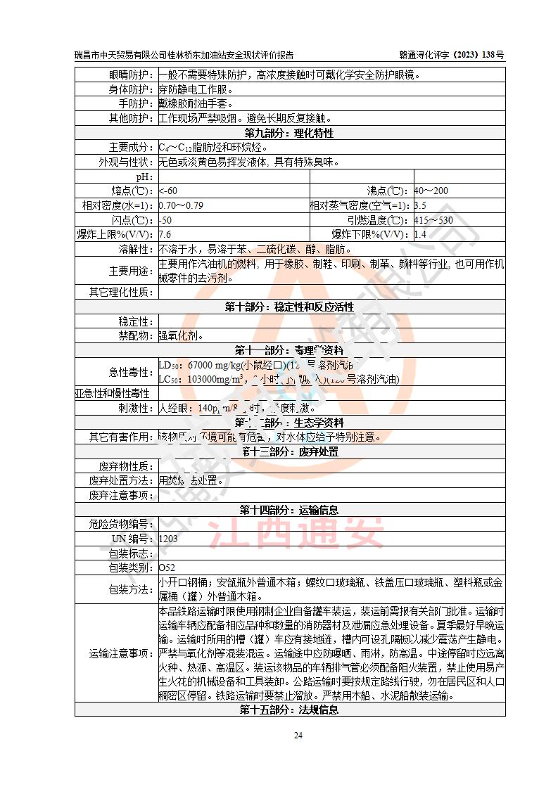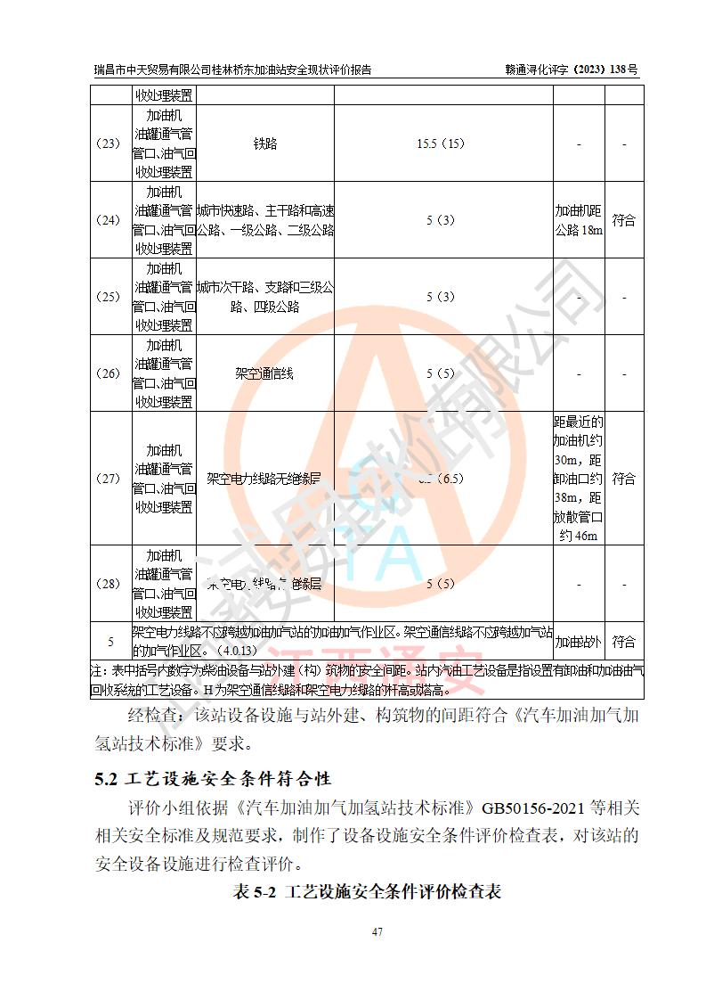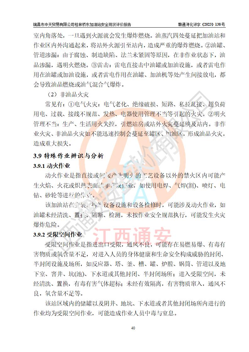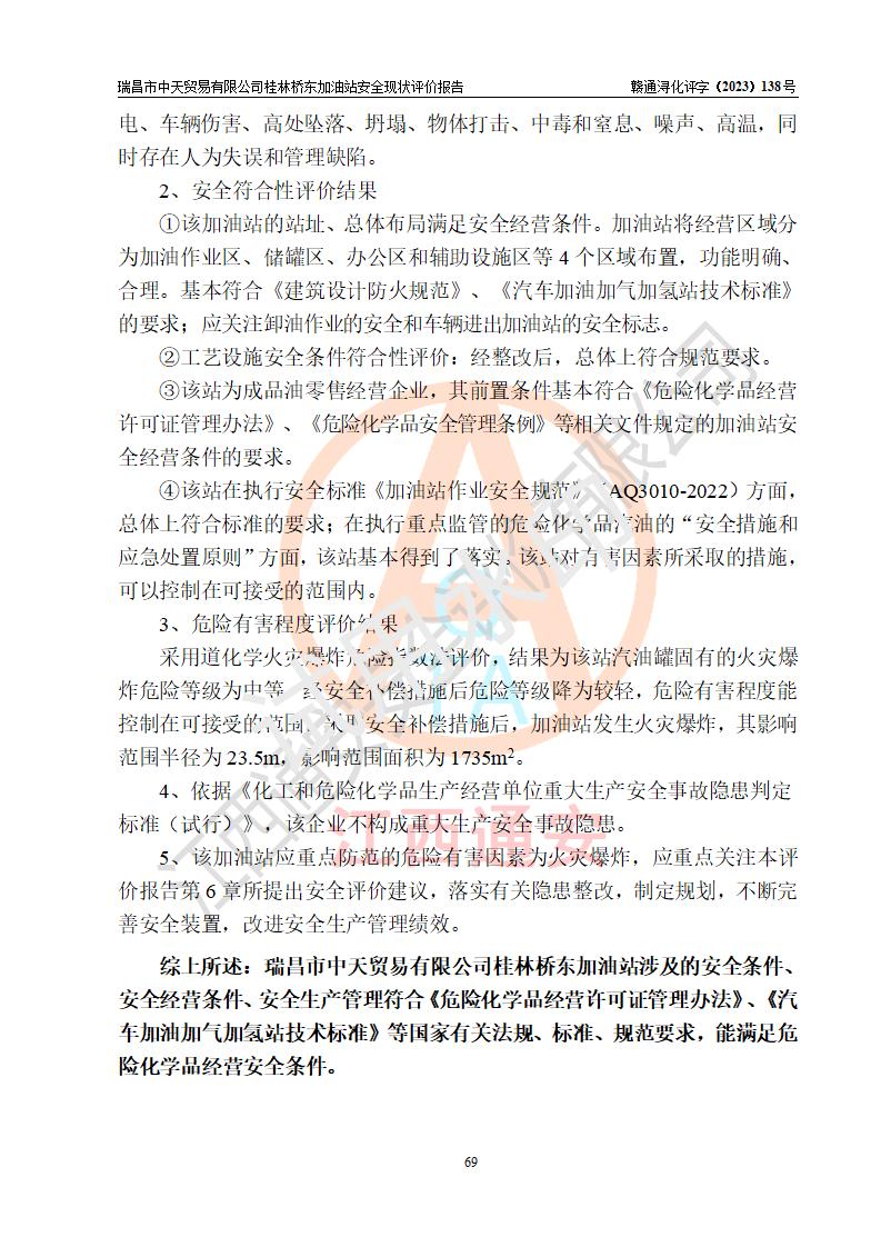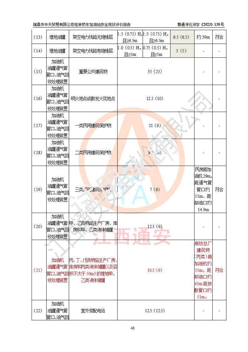 瑞昌市中天貿(mào)易有限公司桂林橋東加油站是一家專門從事成品油(汽油、柴油)、潤滑油零售,預(yù)包裝食品兼散裝食品、卷煙(憑許可證)、日用品、液化氣鋼瓶、灶具及配件零售,汽車清洗服務(wù)的有限責任公司分公司,注冊地址為江西省九江市瑞昌市瑞肇公路南側(cè)。加油站現(xiàn)有從業(yè)人員6名,其中安全管理人員1人,加油站負責人劉凱(經(jīng)營者),加油站危險化學(xué)品經(jīng)營單位主要負責人丁洞仙(加油站站長)。 該加油站站區(qū)占地面積3330.8m2(約5畝)。站區(qū)內(nèi)設(shè)置有1臺雙槍單油品潛油泵程控燃油加油機和3臺雙槍單油品自吸式程控燃油加油機及配套的工藝管線,25m3的95#汽油臥式雙層儲罐1臺,25m3的92#汽油汽油臥式雙層儲罐2臺,30m3的0#臥式柴油儲罐1臺,油品儲罐總?cè)莘e為105m3(折算為汽油為90m3),按現(xiàn)行《汽車加油加氣加氫站技術(shù)標準》對加油站的等級劃分原則,該站屬三級加油站。 該站在經(jīng)營成品油過程中涉及的主要物料為汽油和柴油,按**十部、局聯(lián)合公告〔2022〕第8號公告修改公布的《危險化學(xué)品目錄》,汽油和柴油屬于危險化學(xué)品。根據(jù)**安全監(jiān)管總局安監(jiān)總管三〔2011〕95號文件公布《首批重點監(jiān)管的危險化學(xué)品名錄》和應(yīng)急管理部等4部公告第3號《特別管控危險化學(xué)品目錄(**版)》,汽油屬于**重點監(jiān)管和特別管控的危險化學(xué)品。 該站由九江市應(yīng)急管理局換發(fā)了《危險化學(xué)品經(jīng)營許可證》(證號:贛九危化經(jīng)字〔2020〕000376號),**期限2021年01月23日至2024年01月22日。根據(jù)《危險化學(xué)品經(jīng)營許可證管理辦法》(**安監(jiān)總局第55號令,第79號令修改)的要求,危險化學(xué)品經(jīng)營許可證的**期為3年。**期滿后,企業(yè)需要繼續(xù)從事危險化學(xué)品經(jīng)營活動的,應(yīng)當在危險化學(xué)品經(jīng)營許可證**期滿3個月前,向發(fā)證機關(guān)提出危險化學(xué)品經(jīng)營許可證的延期申請,申請證照延期的所有儲存、經(jīng)營危險化學(xué)品的單位,應(yīng)當提供安全評價報告。瑞昌市中天貿(mào)易有限公司桂林橋東加油站目前正在做危險化學(xué)品經(jīng)營許可證延期換證的準備工作,故委托江西通安安全評價有限公司承擔其加油站經(jīng)營成品油安全條件現(xiàn)狀評價工作。 江西通安安全評價有限公司接受委托后,組織了評價組對該加油站進行了現(xiàn)場踏勘,對加油站零售經(jīng)營成品油的設(shè)施、設(shè)備、裝置實際運行狀況及管理狀況進行了實地調(diào)查、分析,檢查該站是否符合《危險化學(xué)品安全管理條例》、《危險化學(xué)品經(jīng)營許可證管理辦法》中規(guī)定的經(jīng)營單位應(yīng)具備的基本條件。從安全管理角度檢查和評價該站對安全法規(guī)的執(zhí)行情況,從安全技術(shù)角度檢查項目中安全設(shè)施是否符合**有關(guān)安全生產(chǎn)的法律、法規(guī)和標準。評價組運用安全系統(tǒng)工程的方法,進行危險、有害因素的識別及其危險度的評價,查找該系統(tǒng)生產(chǎn)運行中存在的事故隱患并判定其危險程度,提出合理可行的安全對策措施及建議,在此基礎(chǔ)上,根據(jù)加油站加油作業(yè)工藝程序、站區(qū)內(nèi)功能區(qū)域特點,劃分了評價單元;對劃分的評價單元及單元內(nèi)的危險、有害因素選擇了相應(yīng)的安全評價方法逐項進行分析、評價,提出相應(yīng)的預(yù)防和控制對策措施;在此基礎(chǔ)上完成了安全評價報告初稿,經(jīng)評價公司內(nèi)部五級審核程序,及加油站現(xiàn)場存在的安全隱患**落實整改后出具《瑞昌市中天貿(mào)易有限公司桂林橋東加油站安全現(xiàn)狀評價報告》,以作為該企業(yè)申請《危險化學(xué)品經(jīng)營許可證》延期的安全技術(shù)依據(jù)。 |
