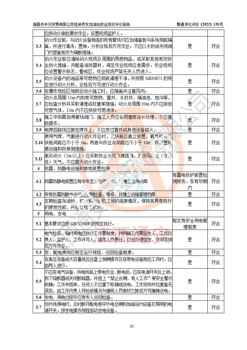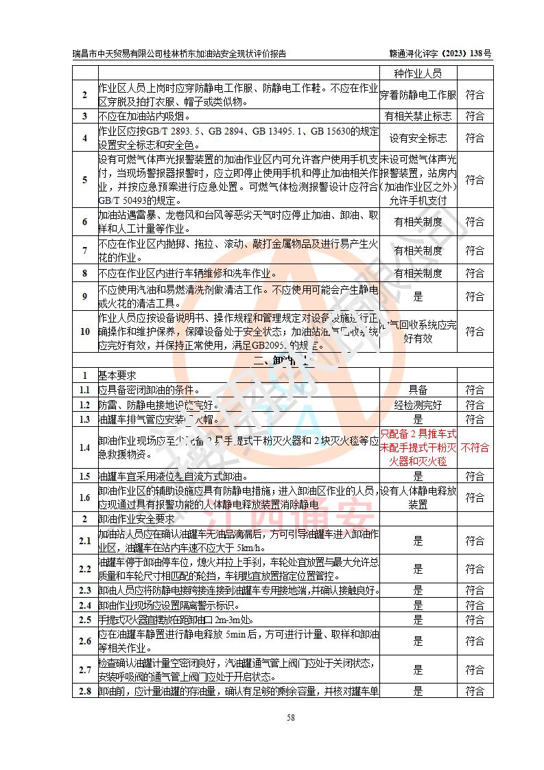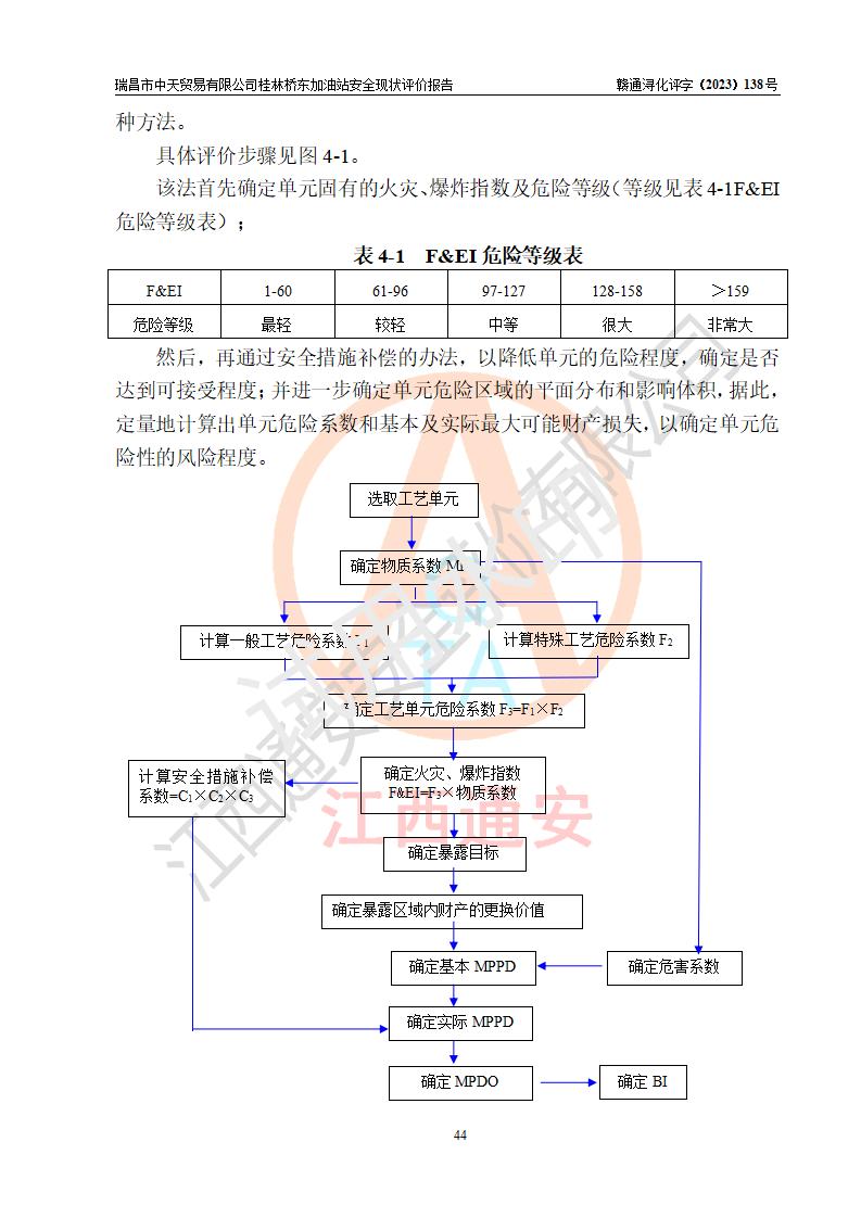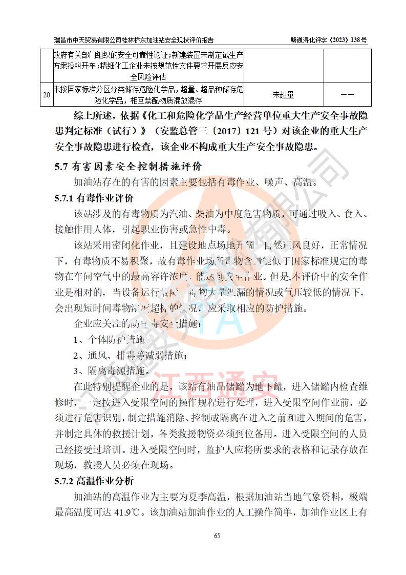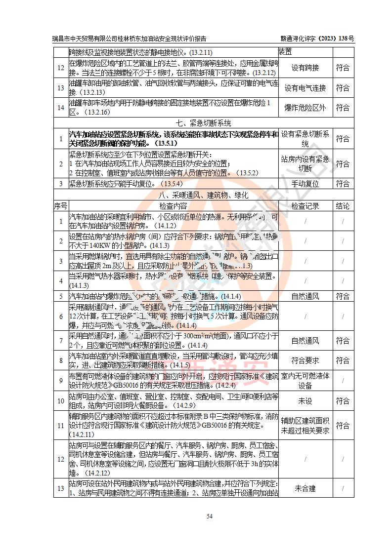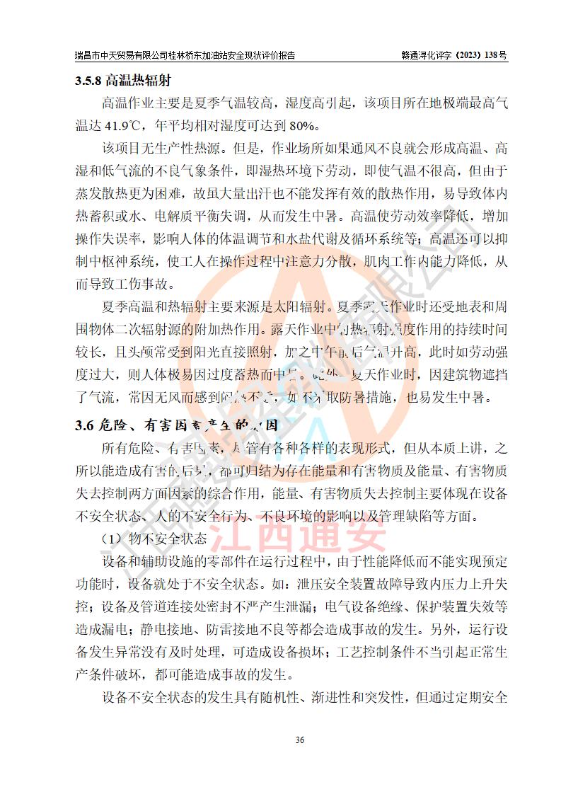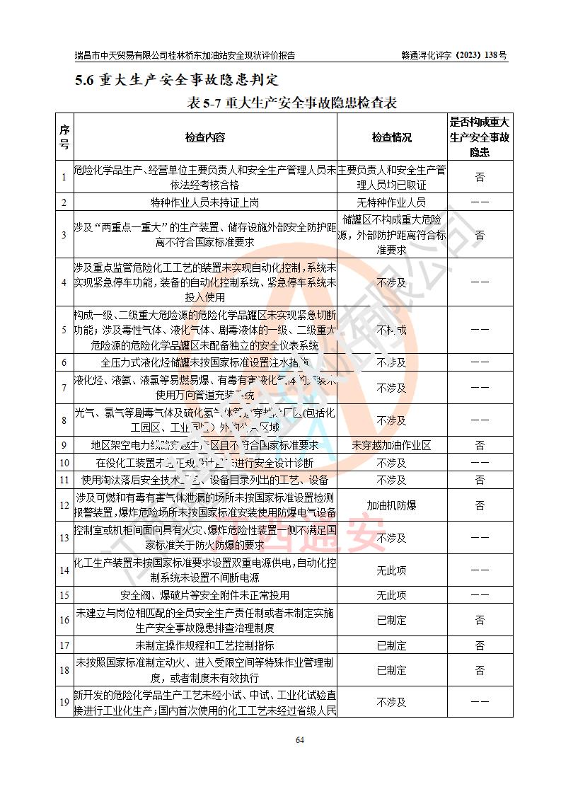 瑞昌市中天貿(mào)易有限公司桂林橋東加油站是一家專門從事成品油(汽油、柴油)、潤滑油零售,預(yù)包裝食品兼散裝食品、卷煙(憑許可證)、日用品、液化氣鋼瓶、灶具及配件零售,汽車清洗服務(wù)的有限責任公司分公司,注冊地址為江西省九江市瑞昌市瑞肇公路南側(cè)。加油站現(xiàn)有從業(yè)人員6名,其中安全管理人員1人,加油站負責人劉凱(經(jīng)營者),加油站危險化學(xué)品經(jīng)營單位主要負責人丁洞仙(加油站站長)。 該加油站站區(qū)占地面積3330.8m2(約5畝)。站區(qū)內(nèi)設(shè)置有1臺雙槍單油品潛油泵程控燃油加油機和3臺雙槍單油品自吸式程控燃油加油機及配套的工藝管線,25m3的95#汽油臥式雙層儲罐1臺,25m3的92#汽油汽油臥式雙層儲罐2臺,30m3的0#臥式柴油儲罐1臺,油品儲罐總?cè)莘e為105m3(折算為汽油為90m3),按現(xiàn)行《汽車加油加氣加氫站技術(shù)標準》對加油站的等級劃分原則,該站屬三級加油站。 該站在經(jīng)營成品油過程中涉及的主要物料為汽油和柴油,按**十部、局聯(lián)合公告〔2022〕第8號公告修改公布的《危險化學(xué)品目錄》,汽油和柴油屬于危險化學(xué)品。根據(jù)**安全監(jiān)管總局安監(jiān)總管三〔2011〕95號文件公布《首批重點監(jiān)管的危險化學(xué)品名錄》和應(yīng)急管理部等4部公告第3號《特別管控危險化學(xué)品目錄(**版)》,汽油屬于**重點監(jiān)管和特別管控的危險化學(xué)品。 該站由九江市應(yīng)急管理局換發(fā)了《危險化學(xué)品經(jīng)營許可證》(證號:贛九危化經(jīng)字〔2020〕000376號),**期限2021年01月23日至2024年01月22日。根據(jù)《危險化學(xué)品經(jīng)營許可證管理辦法》(**安監(jiān)總局第55號令,第79號令修改)的要求,危險化學(xué)品經(jīng)營許可證的**期為3年。**期滿后,企業(yè)需要繼續(xù)從事危險化學(xué)品經(jīng)營活動的,應(yīng)當在危險化學(xué)品經(jīng)營許可證**期滿3個月前,向發(fā)證機關(guān)提出危險化學(xué)品經(jīng)營許可證的延期申請,申請證照延期的所有儲存、經(jīng)營危險化學(xué)品的單位,應(yīng)當提供安全評價報告。瑞昌市中天貿(mào)易有限公司桂林橋東加油站目前正在做危險化學(xué)品經(jīng)營許可證延期換證的準備工作,故委托江西通安安全評價有限公司承擔其加油站經(jīng)營成品油安全條件現(xiàn)狀評價工作。 江西通安安全評價有限公司接受委托后,組織了評價組對該加油站進行了現(xiàn)場踏勘,對加油站零售經(jīng)營成品油的設(shè)施、設(shè)備、裝置實際運行狀況及管理狀況進行了實地調(diào)查、分析,檢查該站是否符合《危險化學(xué)品安全管理條例》、《危險化學(xué)品經(jīng)營許可證管理辦法》中規(guī)定的經(jīng)營單位應(yīng)具備的基本條件。從安全管理角度檢查和評價該站對安全法規(guī)的執(zhí)行情況,從安全技術(shù)角度檢查項目中安全設(shè)施是否符合**有關(guān)安全生產(chǎn)的法律、法規(guī)和標準。評價組運用安全系統(tǒng)工程的方法,進行危險、有害因素的識別及其危險度的評價,查找該系統(tǒng)生產(chǎn)運行中存在的事故隱患并判定其危險程度,提出合理可行的安全對策措施及建議,在此基礎(chǔ)上,根據(jù)加油站加油作業(yè)工藝程序、站區(qū)內(nèi)功能區(qū)域特點,劃分了評價單元;對劃分的評價單元及單元內(nèi)的危險、有害因素選擇了相應(yīng)的安全評價方法逐項進行分析、評價,提出相應(yīng)的預(yù)防和控制對策措施;在此基礎(chǔ)上完成了安全評價報告初稿,經(jīng)評價公司內(nèi)部五級審核程序,及加油站現(xiàn)場存在的安全隱患**落實整改后出具《瑞昌市中天貿(mào)易有限公司桂林橋東加油站安全現(xiàn)狀評價報告》,以作為該企業(yè)申請《危險化學(xué)品經(jīng)營許可證》延期的安全技術(shù)依據(jù)。 |