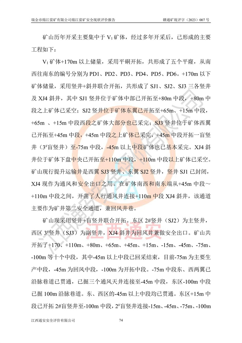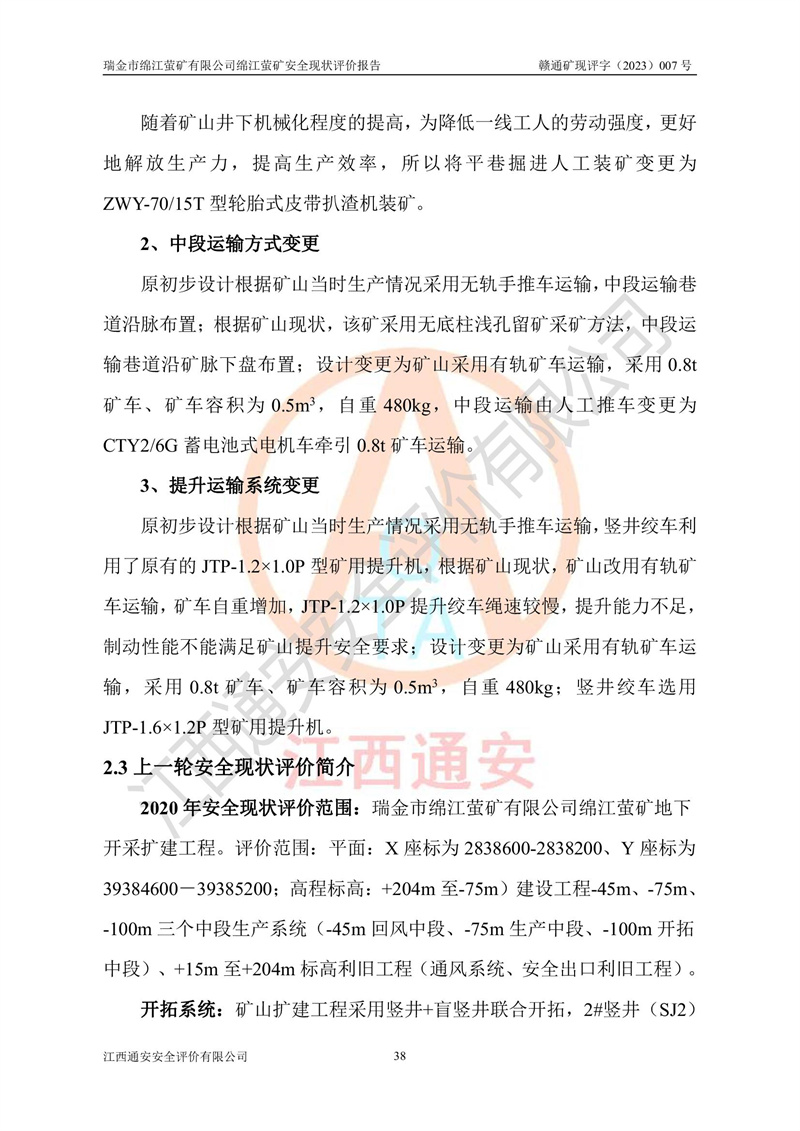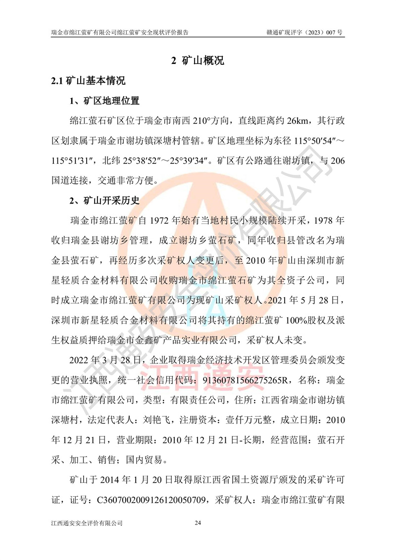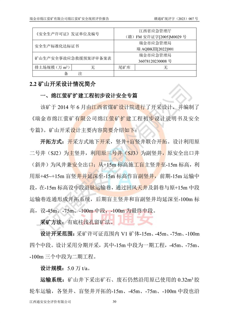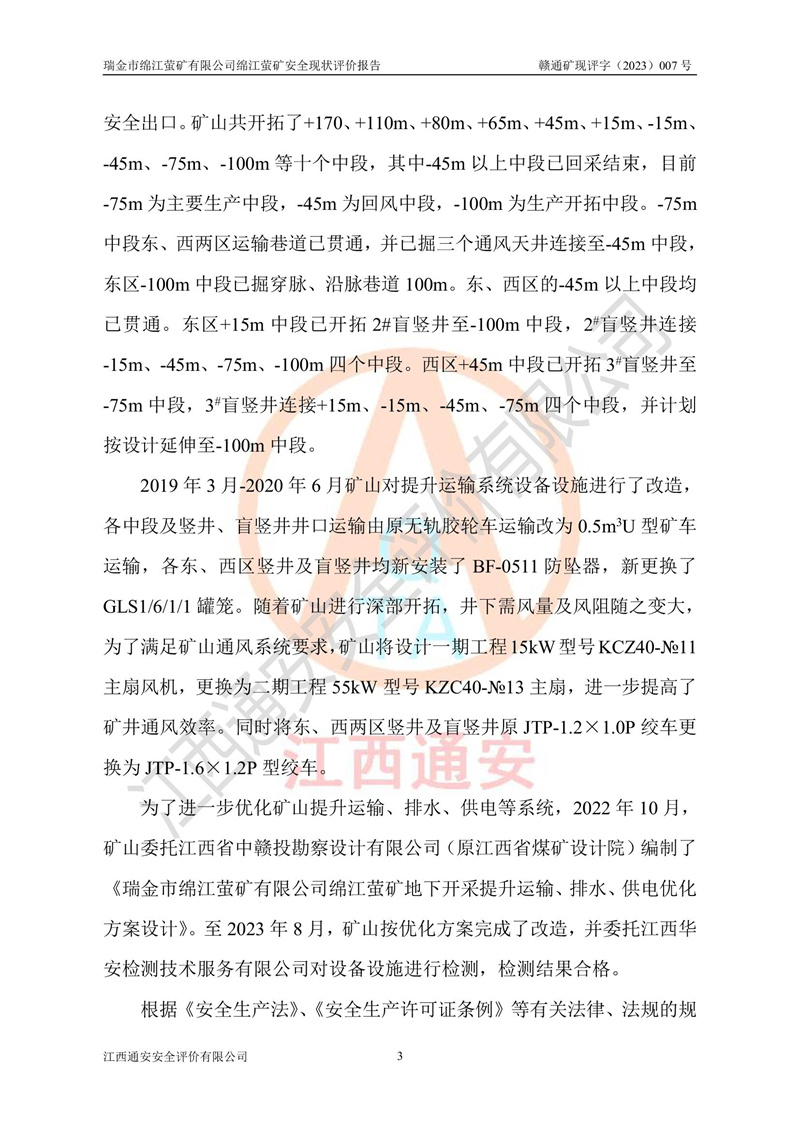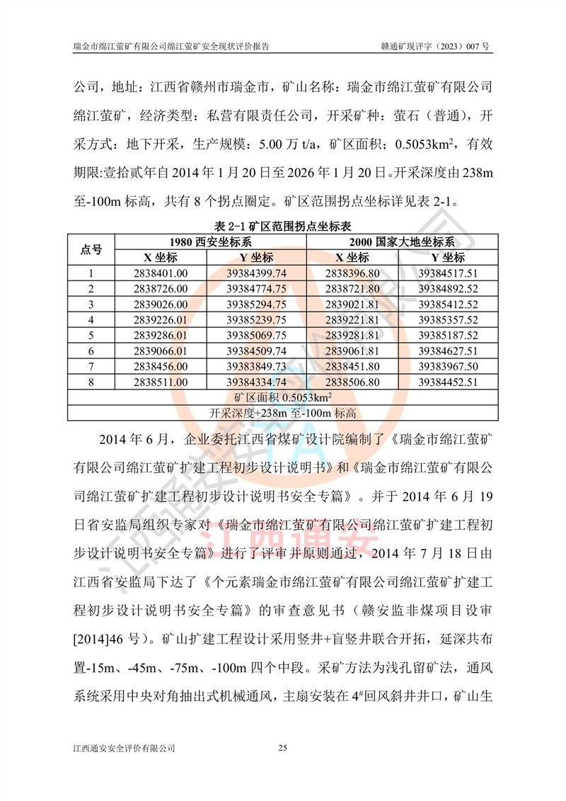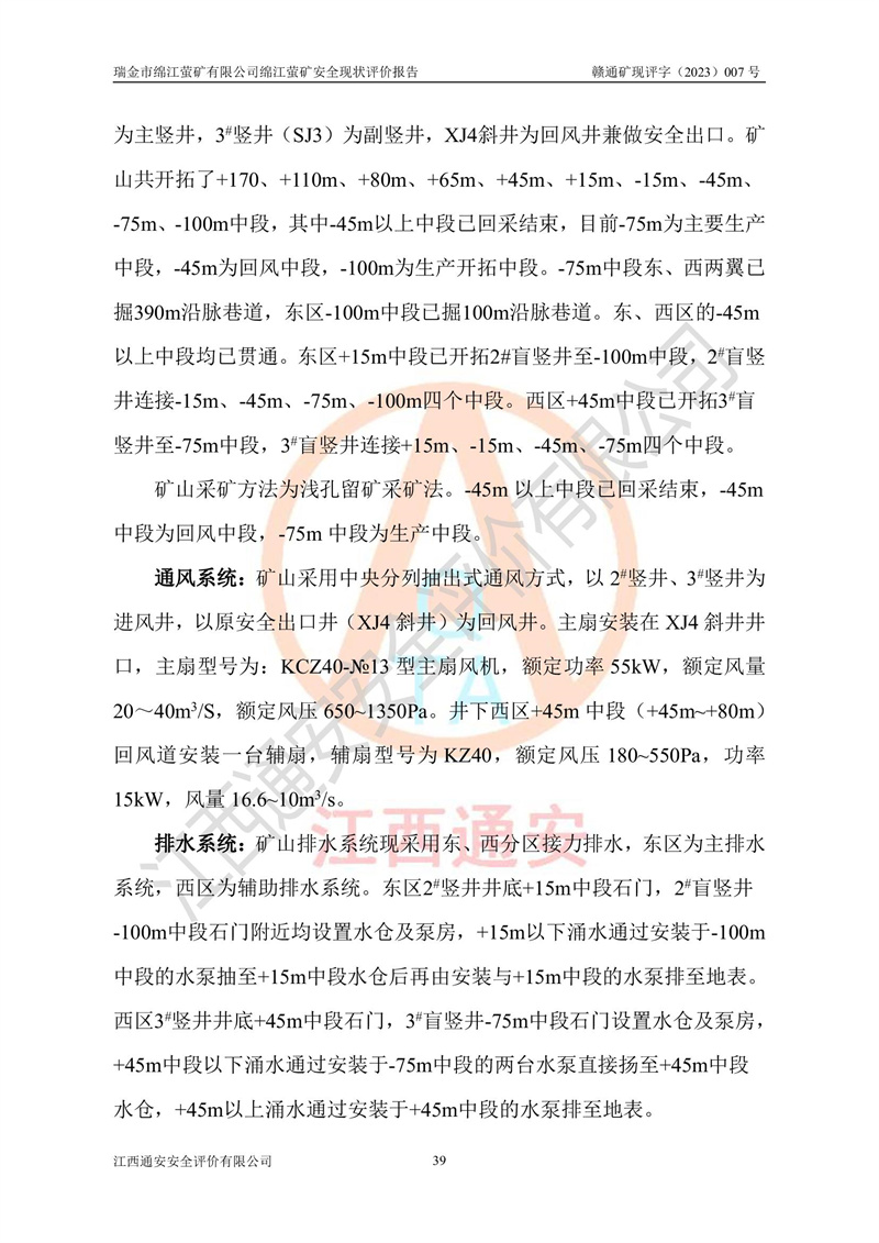綿江螢礦礦區(qū)位于瑞金市南西210°方向,直線距離約26km,礦區(qū)地理坐標為東徑115°50′54″~115°51′31″,北緯25°38′52″~25°39′34″,行政區(qū)劃隸屬于瑞金市謝坊鎮(zhèn)深塘村管轄。 瑞金市綿江螢礦自1972年始有當?shù)卮迕裥∫?guī)模陸續(xù)開采,1978年收歸瑞金縣謝坊鄉(xiāng)管理,成立謝坊鄉(xiāng)螢石礦,同年收歸縣管改名為瑞金縣螢石礦,再經(jīng)歷多次采礦權人變更后,至2010年礦山由深圳市新星輕質(zhì)合金材料有限公司收購瑞金市綿江螢石礦為其全資子公司,同時成立瑞金市綿江螢礦有限公司為現(xiàn)礦山采礦權人。2021年5月28日,深圳市新星輕質(zhì)合金材料有限公司將其持有的綿江螢礦****股權及派生權益質(zhì)押給瑞金市金鑫礦產(chǎn)品實業(yè)有限公司,采礦權人未變。 礦山于2014年1月20日取得原江西省國土資源廳頒發(fā)的采礦許可證,證號:C3607002009126120050709,采礦權人:瑞金市綿江螢礦有限公司,地址:江西省贛州市瑞金市,礦山名稱:瑞金市綿江螢礦有限公司綿江螢礦,經(jīng)濟類型:私營有限責任公司,開采礦種:螢石(普通),開采方式:地下開采,生產(chǎn)規(guī)模:5.00萬t/a,礦區(qū)面積;0.5053km2,**期限:壹拾貳年自2014年1月20日至2026年1月20日。開采深度由238m至-100m標高,共有8個拐點圈定。 2014年6月,企業(yè)委托江西省煤礦設計院編制了《瑞金市綿江螢礦有限公司綿江螢礦擴建工程初步設計說明書》和《瑞金市綿江螢礦有限公司綿江螢礦擴建工程初步設計說明書安全專篇》。并于2014年6月19日省安監(jiān)局組織專家對《瑞金市綿江螢礦有限公司綿江螢礦擴建工程初步設計說明書安全專篇》進行了評審并原則通過,2014年7月18日由江西省安監(jiān)局下達了《關于瑞金市綿江螢礦有限公司綿江螢礦擴建工程初步設計說明書安全專篇》的審查意見書(贛安監(jiān)非煤項目設審[2014]46號)。礦山擴建工程設計采用豎井+盲豎井聯(lián)合開拓,延深共布置-15m、-45m、-75m、-100m四個中段。采礦方法為淺孔留礦法,通風系統(tǒng)采用中央對角抽出式機械通風,主扇安裝在4#回風斜井井口,礦山生產(chǎn)規(guī)模為5萬t/a,服務年限為10年。 2016年7月,礦山委托江西通安安全評價有限公司編制了《瑞金市綿江螢礦有限公司綿江螢礦地下開采擴建工程安全設施驗收評價報告》。2016年7月31日-8月2日,公司組織有關專家對江西通安安全評價有限公司編制的《瑞金市綿江螢礦有限公司綿江螢礦地下開采擴建工程安全設施驗收評價報告》進行了評審,同時對瑞金市綿江螢礦有限公司綿江螢礦地下開采擴建工程建設項目安全設施進行了現(xiàn)場驗收并原則通過。瑞金市安監(jiān)局依法對驗收過程及結果進行監(jiān)督。 2020年10月12日,礦山取得江西省應急管理換發(fā)的安全生產(chǎn)許可證。編號:(贛)FM安許證字[2005]M0029號,單位名稱:瑞金市綿江螢礦有限公司綿江螢礦地下開采,主要負責人:陳勇,單位地址:江西省瑞金市謝坊鎮(zhèn)深塘村,經(jīng)濟類型:有限責任公司,許可范圍:螢石礦5萬t/a,豎井+盲豎井聯(lián)合開拓,-75m、-100m中段地下開采,**期:2020年10月27日至2023年10月26日。 礦山取得安全生產(chǎn)許可證后,嚴格按照設計回采順序(中段按從上到下的順序開采,同時開采中段數(shù)為一個)要求進行開采,目前礦山-15m、-45m中段已結束回采。礦山現(xiàn)采用豎井+盲豎井聯(lián)合開拓。東區(qū)2#豎井(SJ2)為主豎井,西區(qū)3#豎井(SJ3)為副豎井,XJ4斜井為回風井兼做安全出口。礦山共開拓了+170、+110m、+80m、+65m、+45m、+15m、-15m、-45m、-75m、-100m等十個中段,其中-45m以上中段已回采結束,目前-75m為主要生產(chǎn)中段,-45m為回風中段,-100m為生產(chǎn)開拓中段。-75m中段東、西兩區(qū)運輸巷道已貫通,并已掘三個通風天井連接至-45m中段,東區(qū)-100m中段已掘穿脈、沿脈巷道100m。東、西區(qū)的-45m以上中段均已貫通。東區(qū)+15m中段已開拓2#盲豎井至-100m中段,2#盲豎井連接-15m、-45m、-75m、-100m四個中段。西區(qū)+45m中段已開拓3#盲豎井至-75m中段,3#盲豎井連接+15m、-15m、-45m、-75m四個中段,并計劃按設計延伸至-100m中段。 2019年3月-2020年6月礦山對提升運輸系統(tǒng)設備設施進行了改造,各中段及豎井、盲豎井井口運輸由原無軌膠輪車運輸改為0.5m3U型礦車運輸,各東、西區(qū)豎井及盲豎井均新安裝了BF-0511防墜器,新更換了GLS1/6/1/1罐籠。隨著礦山進行深部開拓,井下需風量及風阻隨之變大,為了滿足礦山通風系統(tǒng)要求,礦山將設計一期工程15kW型號KCZ40-№11主扇風機,更換為二期工程55kW型號KZC40-№13主扇,進一步提高了礦井通風效率。同時將東、西兩區(qū)豎井及盲豎井原JTP-1.2×1.0P絞車更換為JTP-1.6×1.2P型絞車。 為了進一步優(yōu)化礦山提升運輸、排水、供電等系統(tǒng),2022年10月,礦山委托江西省中贛投勘察設計有限公司(原江西省煤礦設計院)編制了《瑞金市綿江螢礦有限公司綿江螢礦地下開采提升運輸、排水、供電優(yōu)化方案設計》。至2023年8月,礦山按優(yōu)化方案完成了改造,并委托江西華安檢測技術服務有限公司對設備設施進行檢測,檢測結果合格。 根據(jù)《安全生產(chǎn)法》、《安全生產(chǎn)許可證條例》等有關法律、法規(guī)的規(guī)定以及《關于做好非煤礦礦山企業(yè)安全生產(chǎn)許可證延期換證工作的通知》的要求,2023年4月,瑞金市綿江