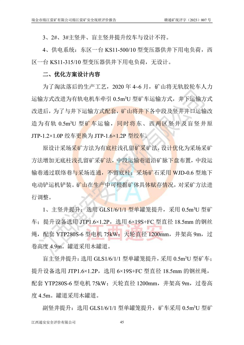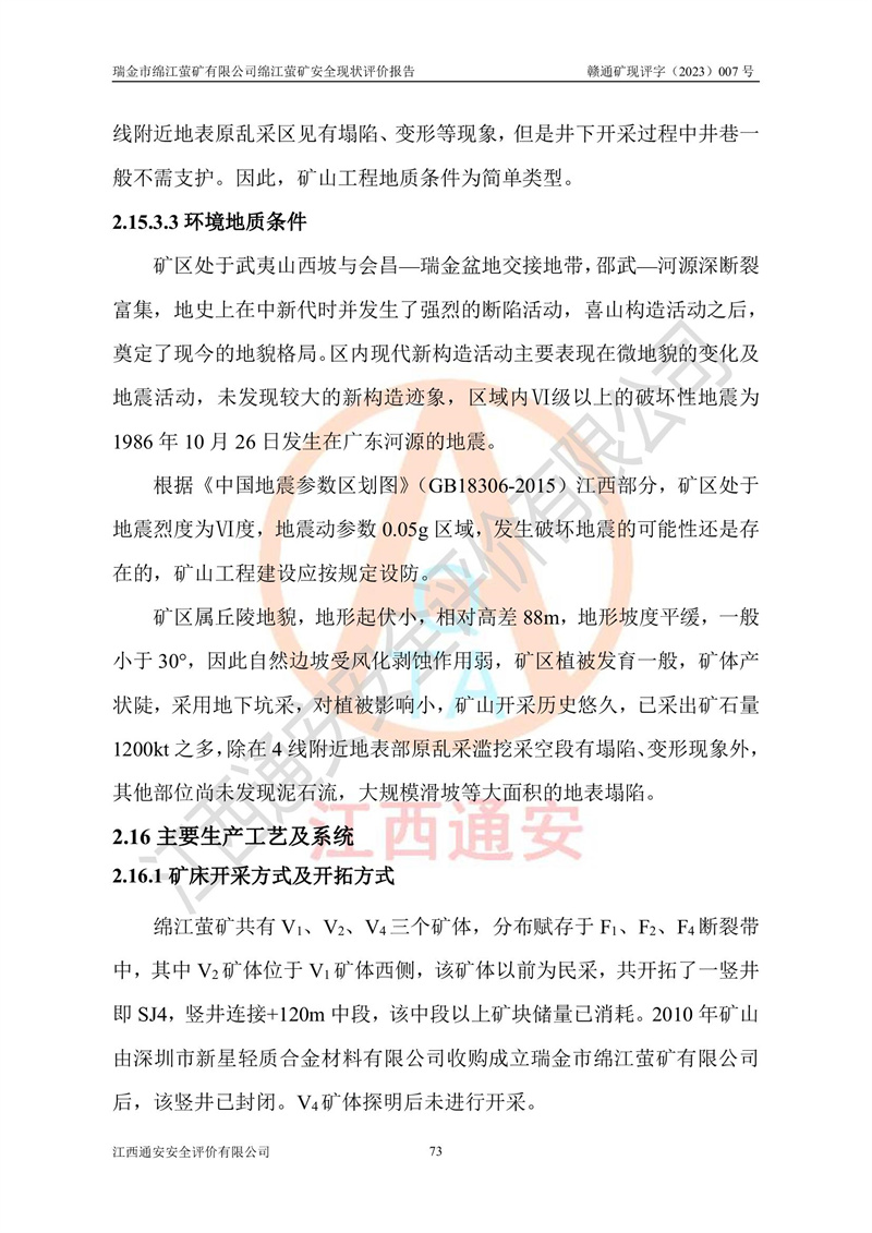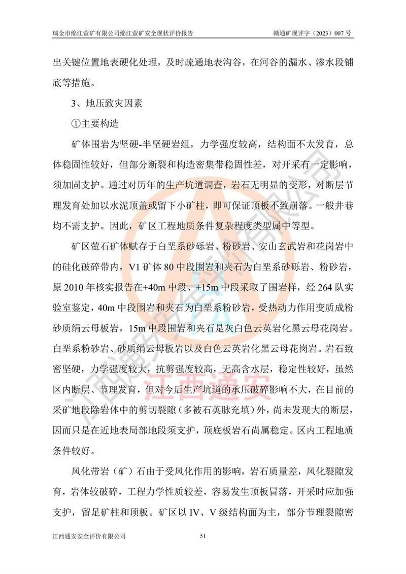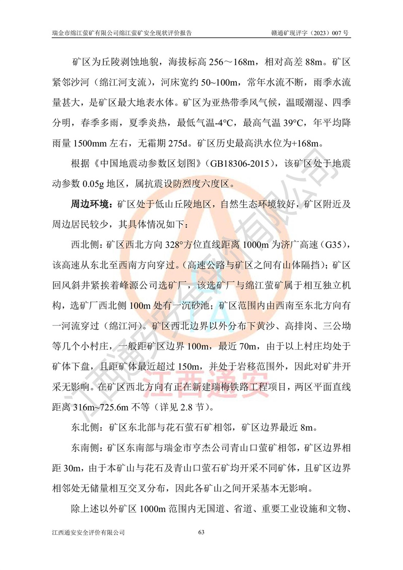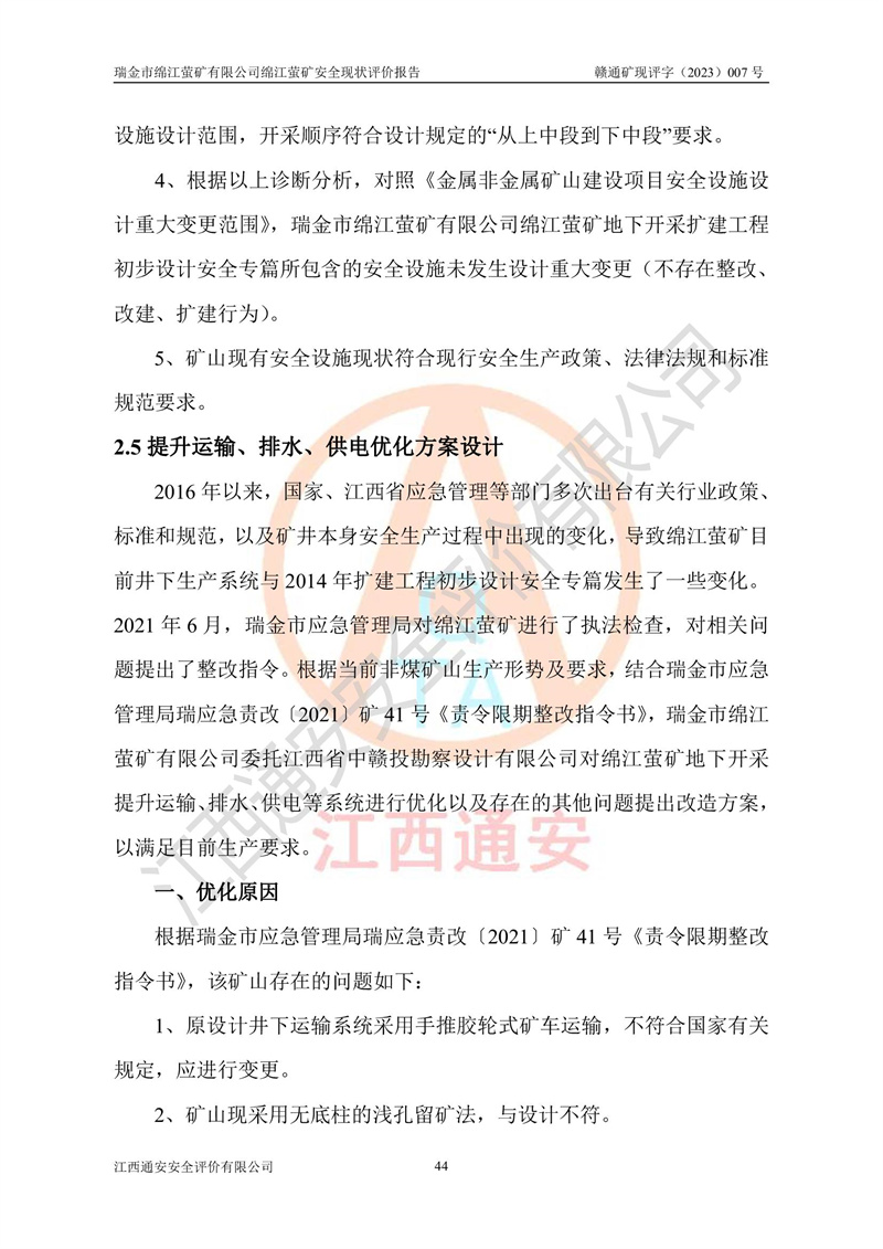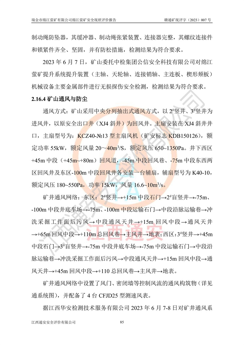 綿江螢礦礦區(qū)位于瑞金市南西210°方向,直線距離約26km,礦區(qū)地理坐標為東徑115°50′54″~115°51′31″,北緯25°38′52″~25°39′34″,行政區(qū)劃隸屬于瑞金市謝坊鎮(zhèn)深塘村管轄。 瑞金市綿江螢礦自1972年始有當?shù)卮迕裥∫?guī)模陸續(xù)開采,1978年收歸瑞金縣謝坊鄉(xiāng)管理,成立謝坊鄉(xiāng)螢石礦,同年收歸縣管改名為瑞金縣螢石礦,再經(jīng)歷多次采礦權人變更后,至2010年礦山由深圳市新星輕質(zhì)合金材料有限公司收購瑞金市綿江螢石礦為其全資子公司,同時成立瑞金市綿江螢礦有限公司為現(xiàn)礦山采礦權人。2021年5月28日,深圳市新星輕質(zhì)合金材料有限公司將其持有的綿江螢礦****股權及派生權益質(zhì)押給瑞金市金鑫礦產(chǎn)品實業(yè)有限公司,采礦權人未變。 礦山于2014年1月20日取得原江西省國土資源廳頒發(fā)的采礦許可證,證號:C3607002009126120050709,采礦權人:瑞金市綿江螢礦有限公司,地址:江西省贛州市瑞金市,礦山名稱:瑞金市綿江螢礦有限公司綿江螢礦,經(jīng)濟類型:私營有限責任公司,開采礦種:螢石(普通),開采方式:地下開采,生產(chǎn)規(guī)模:5.00萬t/a,礦區(qū)面積;0.5053km2,**期限:壹拾貳年自2014年1月20日至2026年1月20日。開采深度由238m至-100m標高,共有8個拐點圈定。 2014年6月,企業(yè)委托江西省煤礦設計院編制了《瑞金市綿江螢礦有限公司綿江螢礦擴建工程初步設計說明書》和《瑞金市綿江螢礦有限公司綿江螢礦擴建工程初步設計說明書安全專篇》。并于2014年6月19日省安監(jiān)局組織專家對《瑞金市綿江螢礦有限公司綿江螢礦擴建工程初步設計說明書安全專篇》進行了評審并原則通過,2014年7月18日由江西省安監(jiān)局下達了《關于瑞金市綿江螢礦有限公司綿江螢礦擴建工程初步設計說明書安全專篇》的審查意見書(贛安監(jiān)非煤項目設審[2014]46號)。礦山擴建工程設計采用豎井+盲豎井聯(lián)合開拓,延深共布置-15m、-45m、-75m、-100m四個中段。采礦方法為淺孔留礦法,通風系統(tǒng)采用中央對角抽出式機械通風,主扇安裝在4#回風斜井井口,礦山生產(chǎn)規(guī)模為5萬t/a,服務年限為10年。 2016年7月,礦山委托江西通安安全評價有限公司編制了《瑞金市綿江螢礦有限公司綿江螢礦地下開采擴建工程安全設施驗收評價報告》。2016年7月31日-8月2日,公司組織有關專家對江西通安安全評價有限公司編制的《瑞金市綿江螢礦有限公司綿江螢礦地下開采擴建工程安全設施驗收評價報告》進行了評審,同時對瑞金市綿江螢礦有限公司綿江螢礦地下開采擴建工程建設項目安全設施進行了現(xiàn)場驗收并原則通過。瑞金市安監(jiān)局依法對驗收過程及結果進行監(jiān)督。 2020年10月12日,礦山取得江西省應急管理換發(fā)的安全生產(chǎn)許可證。編號:(贛)FM安許證字[2005]M0029號,單位名稱:瑞金市綿江螢礦有限公司綿江螢礦地下開采,主要負責人:陳勇,單位地址:江西省瑞金市謝坊鎮(zhèn)深塘村,經(jīng)濟類型:有限責任公司,許可范圍:螢石礦5萬t/a,豎井+盲豎井聯(lián)合開拓,-75m、-100m中段地下開采,**期:2020年10月27日至2023年10月26日。 礦山取得安全生產(chǎn)許可證后,嚴格按照設計回采順序(中段按從上到下的順序開采,同時開采中段數(shù)為一個)要求進行開采,目前礦山-15m、-45m中段已結束回采。礦山現(xiàn)采用豎井+盲豎井聯(lián)合開拓。東區(qū)2#豎井(SJ2)為主豎井,西區(qū)3#豎井(SJ3)為副豎井,XJ4斜井為回風井兼做安全出口。礦山共開拓了+170、+110m、+80m、+65m、+45m、+15m、-15m、-45m、-75m、-100m等十個中段,其中-45m以上中段已回采結束,目前-75m為主要生產(chǎn)中段,-45m為回風中段,-100m為生產(chǎn)開拓中段。-75m中段東、西兩區(qū)運輸巷道已貫通,并已掘三個通風天井連接至-45m中段,東區(qū)-100m中段已掘穿脈、沿脈巷道100m。東、西區(qū)的-45m以上中段均已貫通。東區(qū)+15m中段已開拓2#盲豎井至-100m中段,2#盲豎井連接-15m、-45m、-75m、-100m四個中段。西區(qū)+45m中段已開拓3#盲豎井至-75m中段,3#盲豎井連接+15m、-15m、-45m、-75m四個中段,并計劃按設計延伸至-100m中段。 2019年3月-2020年6月礦山對提升運輸系統(tǒng)設備設施進行了改造,各中段及豎井、盲豎井井口運輸由原無軌膠輪車運輸改為0.5m3U型礦車運輸,各東、西區(qū)豎井及盲豎井均新安裝了BF-0511防墜器,新更換了GLS1/6/1/1罐籠。隨著礦山進行深部開拓,井下需風量及風阻隨之變大,為了滿足礦山通風系統(tǒng)要求,礦山將設計一期工程15kW型號KCZ40-№11主扇風機,更換為二期工程55kW型號KZC40-№13主扇,進一步提高了礦井通風效率。同時將東、西兩區(qū)豎井及盲豎井原JTP-1.2×1.0P絞車更換為JTP-1.6×1.2P型絞車。 為了進一步優(yōu)化礦山提升運輸、排水、供電等系統(tǒng),2022年10月,礦山委托江西省中贛投勘察設計有限公司(原江西省煤礦設計院)編制了《瑞金市綿江螢礦有限公司綿江螢礦地下開采提升運輸、排水、供電優(yōu)化方案設計》。至2023年8月,礦山按優(yōu)化方案完成了改造,并委托江西華安檢測技術服務有限公司對設備設施進行檢測,檢測結果合格。 根據(jù)《安全生產(chǎn)法》、《安全生產(chǎn)許可證條例》等有關法律、法規(guī)的規(guī)定以及《關于做好非煤礦礦山企業(yè)安全生產(chǎn)許可證延期換證工作的通知》的要求,2023年4月,瑞金市綿江