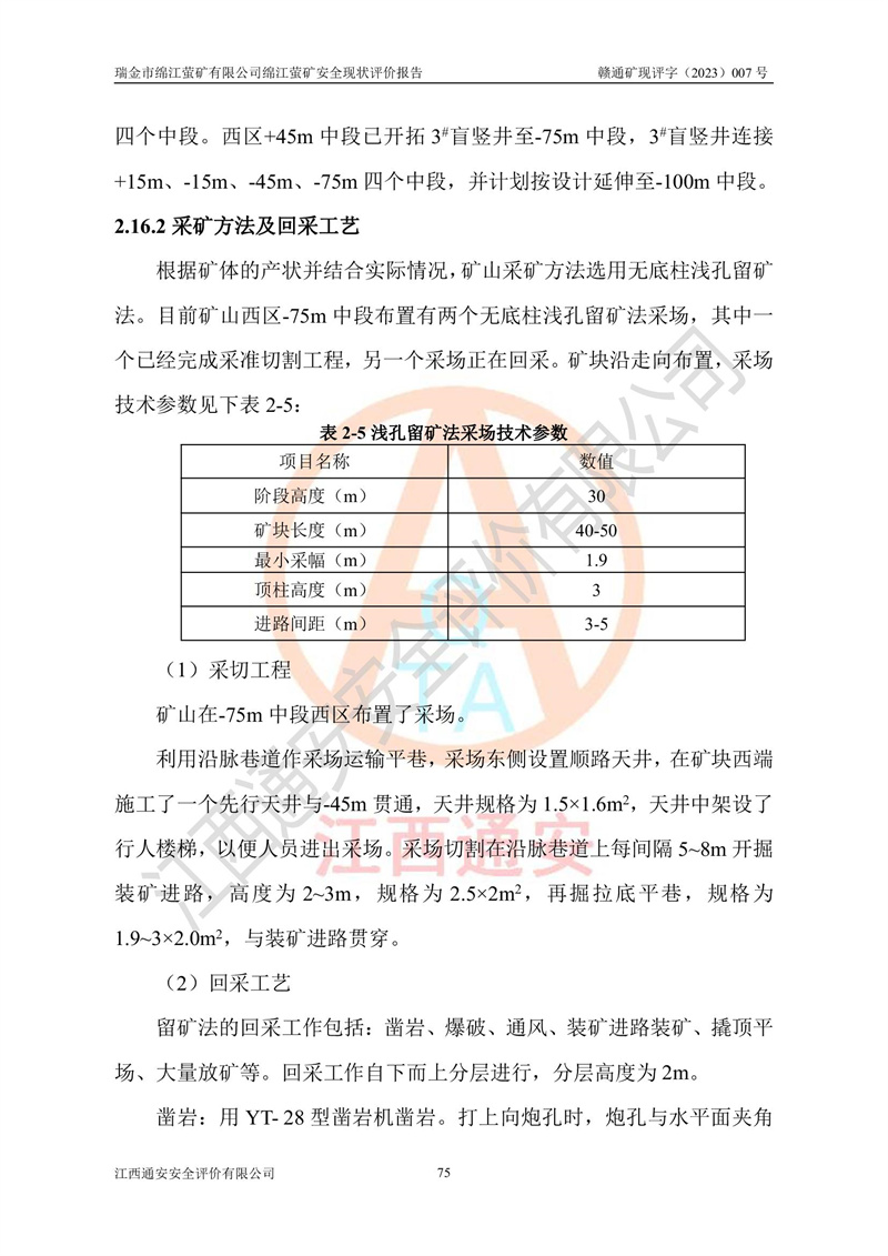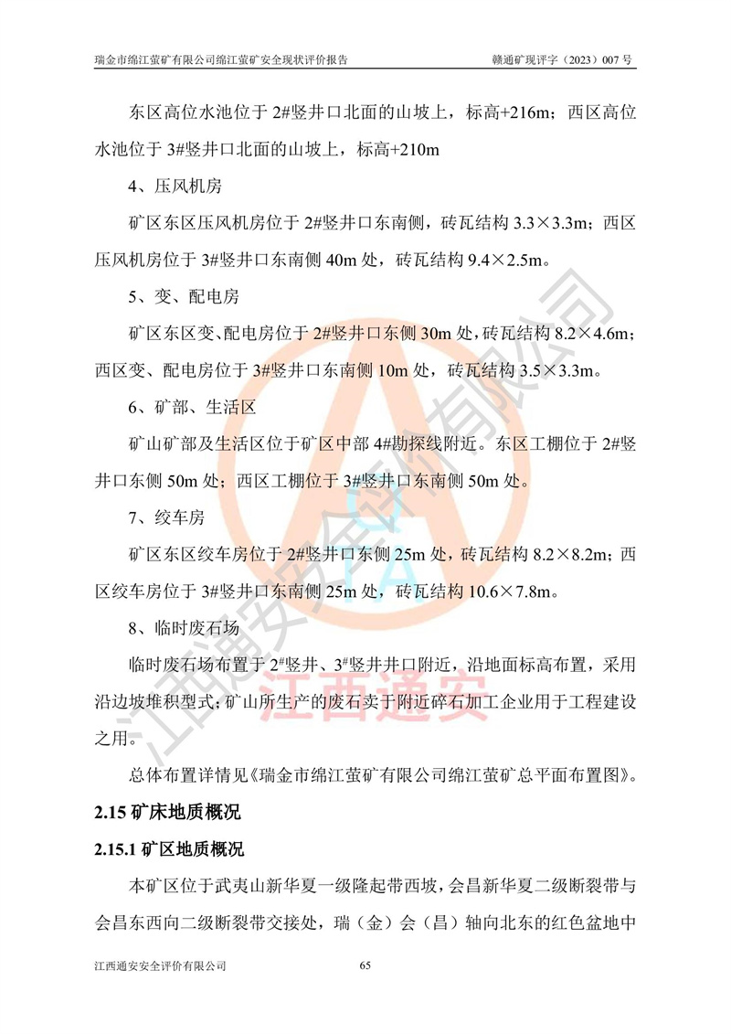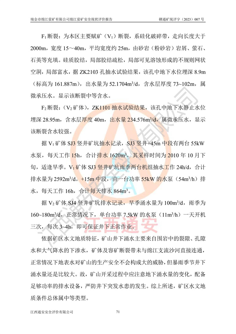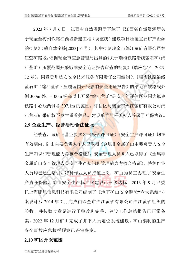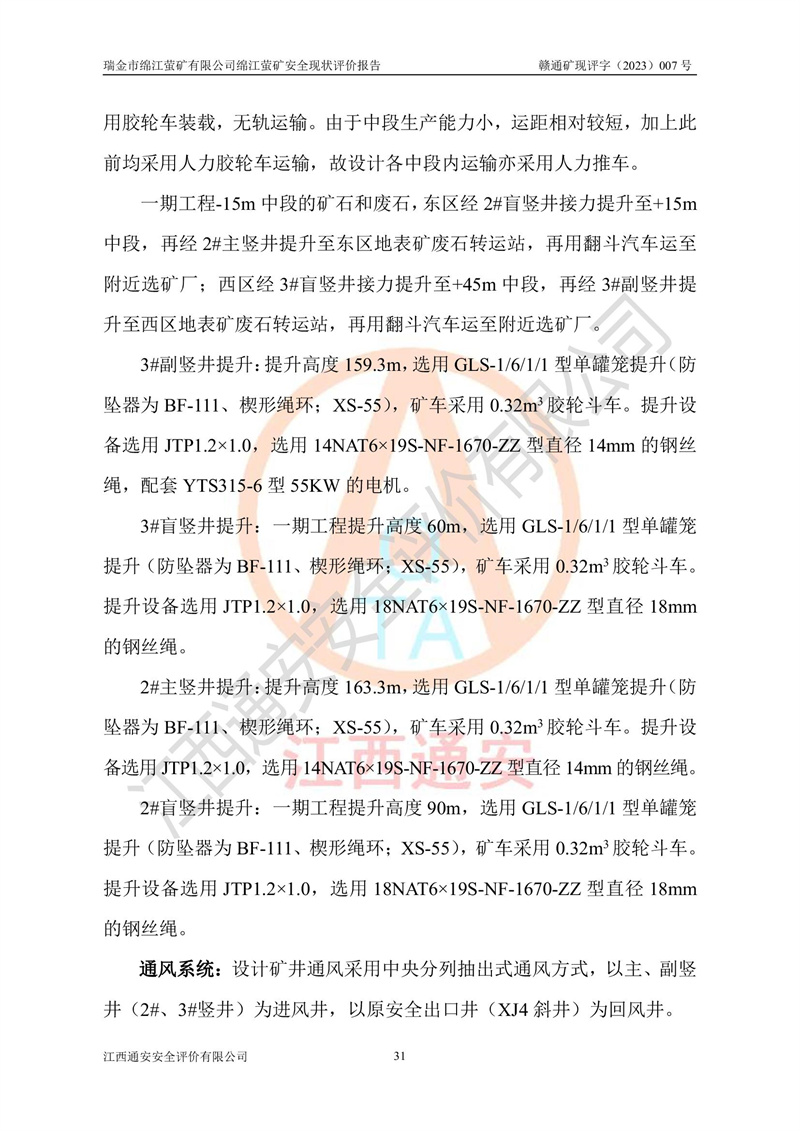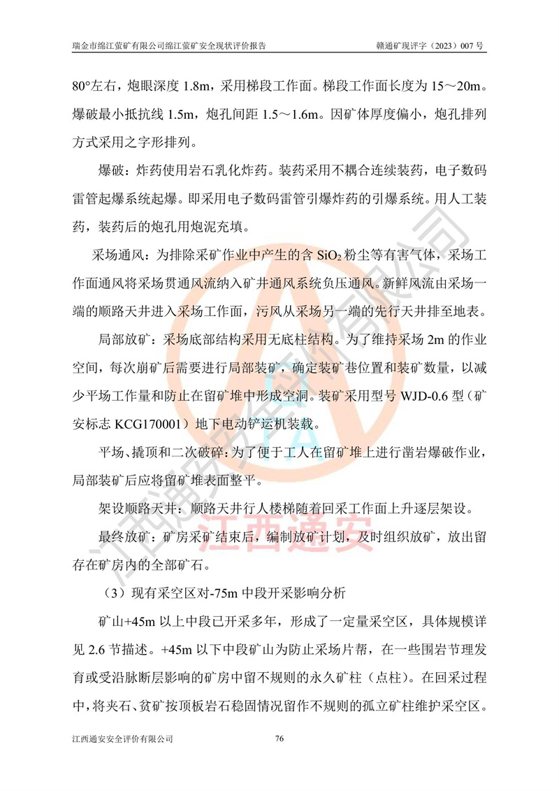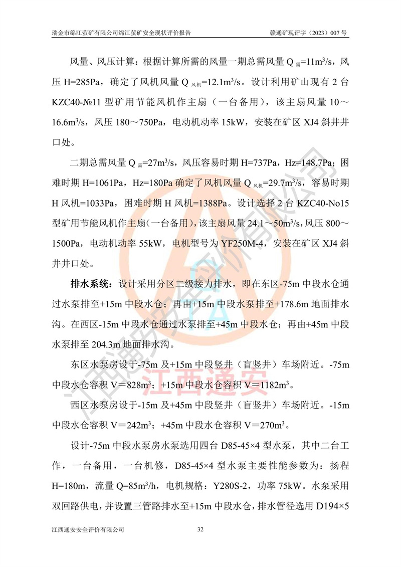 綿江螢礦礦區(qū)位于瑞金市南西210°方向,直線距離約26km,礦區(qū)地理坐標為東徑115°50′54″~115°51′31″,北緯25°38′52″~25°39′34″,行政區(qū)劃隸屬于瑞金市謝坊鎮(zhèn)深塘村管轄。 瑞金市綿江螢礦自1972年始有當?shù)卮迕裥∫?guī)模陸續(xù)開采,1978年收歸瑞金縣謝坊鄉(xiāng)管理,成立謝坊鄉(xiāng)螢石礦,同年收歸縣管改名為瑞金縣螢石礦,再經(jīng)歷多次采礦權人變更后,至2010年礦山由深圳市新星輕質(zhì)合金材料有限公司收購瑞金市綿江螢石礦為其全資子公司,同時成立瑞金市綿江螢礦有限公司為現(xiàn)礦山采礦權人。2021年5月28日,深圳市新星輕質(zhì)合金材料有限公司將其持有的綿江螢礦****股權及派生權益質(zhì)押給瑞金市金鑫礦產(chǎn)品實業(yè)有限公司,采礦權人未變。 礦山于2014年1月20日取得原江西省國土資源廳頒發(fā)的采礦許可證,證號:C3607002009126120050709,采礦權人:瑞金市綿江螢礦有限公司,地址:江西省贛州市瑞金市,礦山名稱:瑞金市綿江螢礦有限公司綿江螢礦,經(jīng)濟類型:私營有限責任公司,開采礦種:螢石(普通),開采方式:地下開采,生產(chǎn)規(guī)模:5.00萬t/a,礦區(qū)面積;0.5053km2,**期限:壹拾貳年自2014年1月20日至2026年1月20日。開采深度由238m至-100m標高,共有8個拐點圈定。 2014年6月,企業(yè)委托江西省煤礦設計院編制了《瑞金市綿江螢礦有限公司綿江螢礦擴建工程初步設計說明書》和《瑞金市綿江螢礦有限公司綿江螢礦擴建工程初步設計說明書安全專篇》。并于2014年6月19日省安監(jiān)局組織專家對《瑞金市綿江螢礦有限公司綿江螢礦擴建工程初步設計說明書安全專篇》進行了評審并原則通過,2014年7月18日由江西省安監(jiān)局下達了《關于瑞金市綿江螢礦有限公司綿江螢礦擴建工程初步設計說明書安全專篇》的審查意見書(贛安監(jiān)非煤項目設審[2014]46號)。礦山擴建工程設計采用豎井+盲豎井聯(lián)合開拓,延深共布置-15m、-45m、-75m、-100m四個中段。采礦方法為淺孔留礦法,通風系統(tǒng)采用中央對角抽出式機械通風,主扇安裝在4#回風斜井井口,礦山生產(chǎn)規(guī)模為5萬t/a,服務年限為10年。 2016年7月,礦山委托江西通安安全評價有限公司編制了《瑞金市綿江螢礦有限公司綿江螢礦地下開采擴建工程安全設施驗收評價報告》。2016年7月31日-8月2日,公司組織有關專家對江西通安安全評價有限公司編制的《瑞金市綿江螢礦有限公司綿江螢礦地下開采擴建工程安全設施驗收評價報告》進行了評審,同時對瑞金市綿江螢礦有限公司綿江螢礦地下開采擴建工程建設項目安全設施進行了現(xiàn)場驗收并原則通過。瑞金市安監(jiān)局依法對驗收過程及結果進行監(jiān)督。 2020年10月12日,礦山取得江西省應急管理換發(fā)的安全生產(chǎn)許可證。編號:(贛)FM安許證字[2005]M0029號,單位名稱:瑞金市綿江螢礦有限公司綿江螢礦地下開采,主要負責人:陳勇,單位地址:江西省瑞金市謝坊鎮(zhèn)深塘村,經(jīng)濟類型:有限責任公司,許可范圍:螢石礦5萬t/a,豎井+盲豎井聯(lián)合開拓,-75m、-100m中段地下開采,**期:2020年10月27日至2023年10月26日。 礦山取得安全生產(chǎn)許可證后,嚴格按照設計回采順序(中段按從上到下的順序開采,同時開采中段數(shù)為一個)要求進行開采,目前礦山-15m、-45m中段已結束回采。礦山現(xiàn)采用豎井+盲豎井聯(lián)合開拓。東區(qū)2#豎井(SJ2)為主豎井,西區(qū)3#豎井(SJ3)為副豎井,XJ4斜井為回風井兼做安全出口。礦山共開拓了+170、+110m、+80m、+65m、+45m、+15m、-15m、-45m、-75m、-100m等十個中段,其中-45m以上中段已回采結束,目前-75m為主要生產(chǎn)中段,-45m為回風中段,-100m為生產(chǎn)開拓中段。-75m中段東、西兩區(qū)運輸巷道已貫通,并已掘三個通風天井連接至-45m中段,東區(qū)-100m中段已掘穿脈、沿脈巷道100m。東、西區(qū)的-45m以上中段均已貫通。東區(qū)+15m中段已開拓2#盲豎井至-100m中段,2#盲豎井連接-15m、-45m、-75m、-100m四個中段。西區(qū)+45m中段已開拓3#盲豎井至-75m中段,3#盲豎井連接+15m、-15m、-45m、-75m四個中段,并計劃按設計延伸至-100m中段。 2019年3月-2020年6月礦山對提升運輸系統(tǒng)設備設施進行了改造,各中段及豎井、盲豎井井口運輸由原無軌膠輪車運輸改為0.5m3U型礦車運輸,各東、西區(qū)豎井及盲豎井均新安裝了BF-0511防墜器,新更換了GLS1/6/1/1罐籠。隨著礦山進行深部開拓,井下需風量及風阻隨之變大,為了滿足礦山通風系統(tǒng)要求,礦山將設計一期工程15kW型號KCZ40-№11主扇風機,更換為二期工程55kW型號KZC40-№13主扇,進一步提高了礦井通風效率。同時將東、西兩區(qū)豎井及盲豎井原JTP-1.2×1.0P絞車更換為JTP-1.6×1.2P型絞車。 為了進一步優(yōu)化礦山提升運輸、排水、供電等系統(tǒng),2022年10月,礦山委托江西省中贛投勘察設計有限公司(原江西省煤礦設計院)編制了《瑞金市綿江螢礦有限公司綿江螢礦地下開采提升運輸、排水、供電優(yōu)化方案設計》。至2023年8月,礦山按優(yōu)化方案完成了改造,并委托江西華安檢測技術服務有限公司對設備設施進行檢測,檢測結果合格。 根據(jù)《安全生產(chǎn)法》、《安全生產(chǎn)許可證條例》等有關法律、法規(guī)的規(guī)定以及《關于做好非煤礦礦山企業(yè)安全生產(chǎn)許可證延期換證工作的通知》的要求,2023年4月,瑞金市綿江