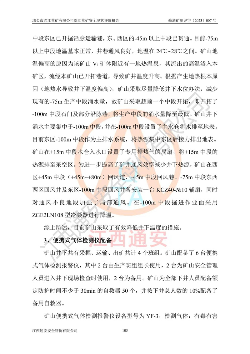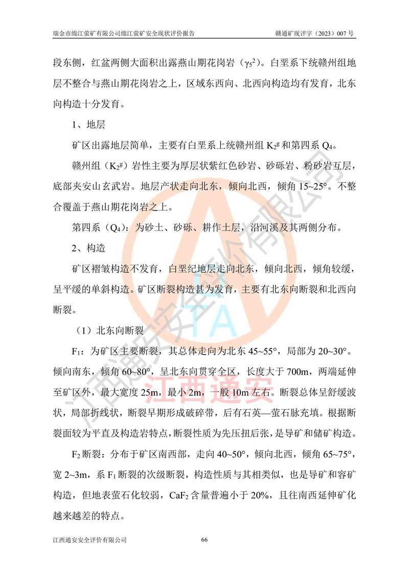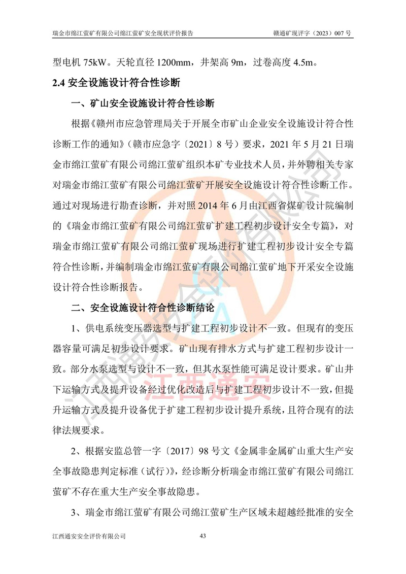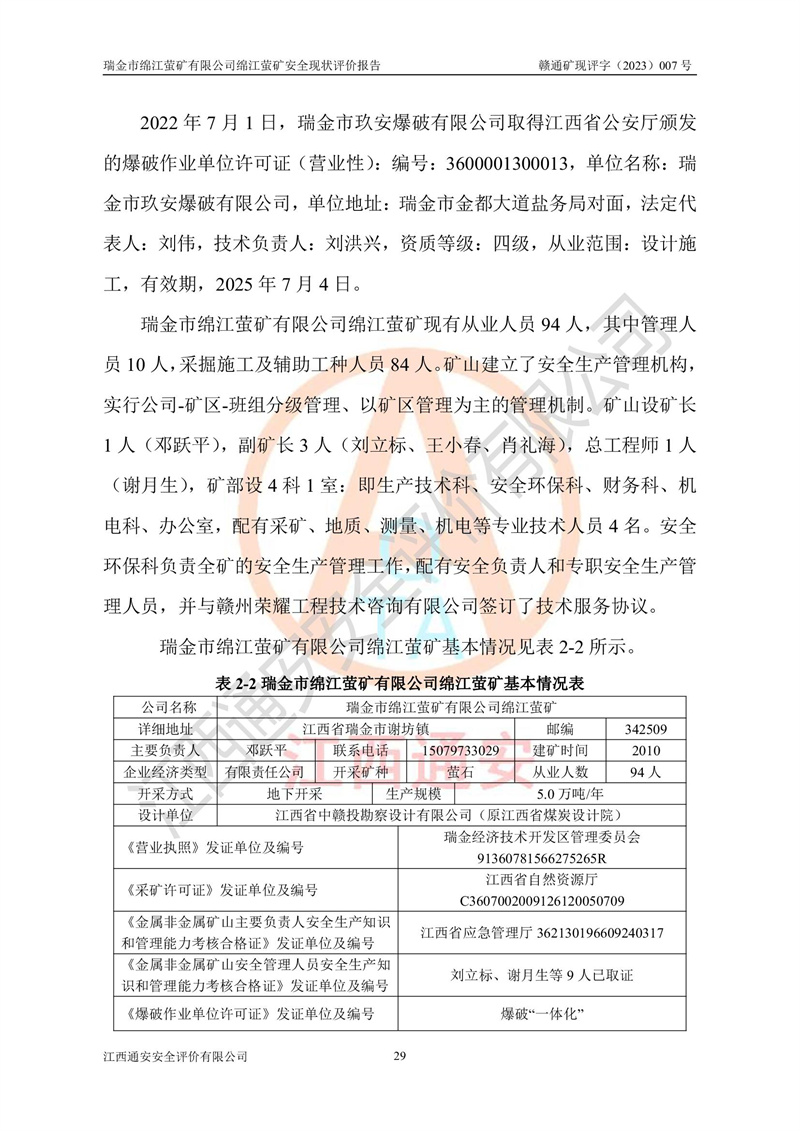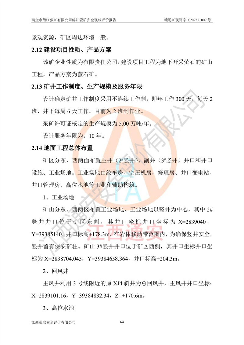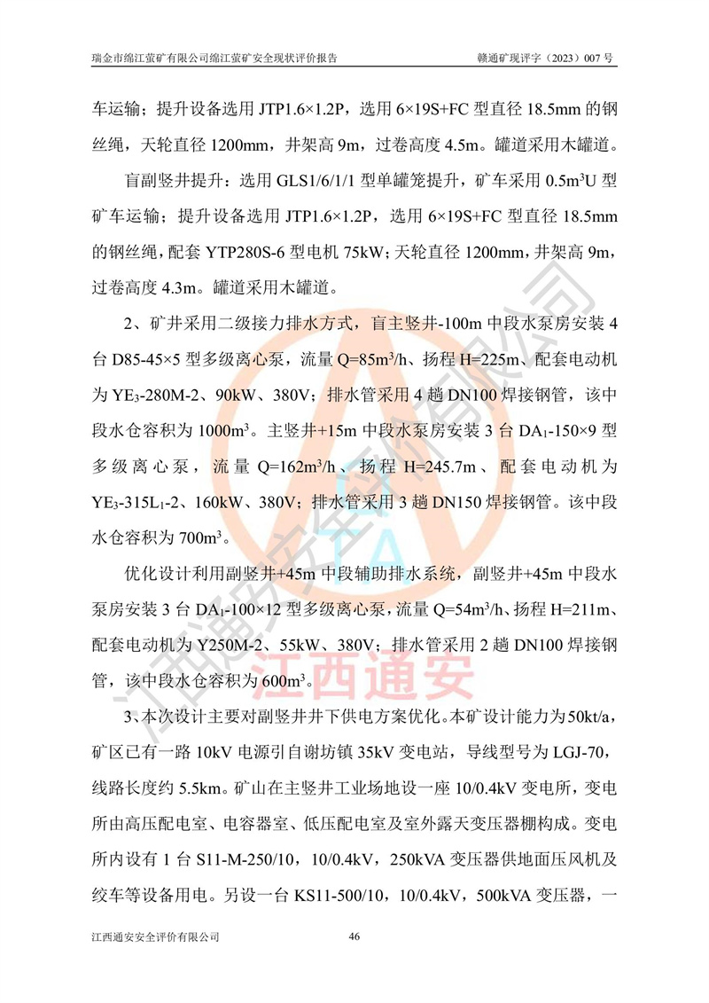 綿江螢礦礦區(qū)位于瑞金市南西210°方向,直線距離約26km,礦區(qū)地理坐標為東徑115°50′54″~115°51′31″,北緯25°38′52″~25°39′34″,行政區(qū)劃隸屬于瑞金市謝坊鎮(zhèn)深塘村管轄。 瑞金市綿江螢礦自1972年始有當?shù)卮迕裥∫?guī)模陸續(xù)開采,1978年收歸瑞金縣謝坊鄉(xiāng)管理,成立謝坊鄉(xiāng)螢石礦,同年收歸縣管改名為瑞金縣螢石礦,再經(jīng)歷多次采礦權人變更后,至2010年礦山由深圳市新星輕質(zhì)合金材料有限公司收購瑞金市綿江螢石礦為其全資子公司,同時成立瑞金市綿江螢礦有限公司為現(xiàn)礦山采礦權人。2021年5月28日,深圳市新星輕質(zhì)合金材料有限公司將其持有的綿江螢礦****股權及派生權益質(zhì)押給瑞金市金鑫礦產(chǎn)品實業(yè)有限公司,采礦權人未變。 礦山于2014年1月20日取得原江西省國土資源廳頒發(fā)的采礦許可證,證號:C3607002009126120050709,采礦權人:瑞金市綿江螢礦有限公司,地址:江西省贛州市瑞金市,礦山名稱:瑞金市綿江螢礦有限公司綿江螢礦,經(jīng)濟類型:私營有限責任公司,開采礦種:螢石(普通),開采方式:地下開采,生產(chǎn)規(guī)模:5.00萬t/a,礦區(qū)面積;0.5053km2,**期限:壹拾貳年自2014年1月20日至2026年1月20日。開采深度由238m至-100m標高,共有8個拐點圈定。 2014年6月,企業(yè)委托江西省煤礦設計院編制了《瑞金市綿江螢礦有限公司綿江螢礦擴建工程初步設計說明書》和《瑞金市綿江螢礦有限公司綿江螢礦擴建工程初步設計說明書安全專篇》。并于2014年6月19日省安監(jiān)局組織專家對《瑞金市綿江螢礦有限公司綿江螢礦擴建工程初步設計說明書安全專篇》進行了評審并原則通過,2014年7月18日由江西省安監(jiān)局下達了《關于瑞金市綿江螢礦有限公司綿江螢礦擴建工程初步設計說明書安全專篇》的審查意見書(贛安監(jiān)非煤項目設審[2014]46號)。礦山擴建工程設計采用豎井+盲豎井聯(lián)合開拓,延深共布置-15m、-45m、-75m、-100m四個中段。采礦方法為淺孔留礦法,通風系統(tǒng)采用中央對角抽出式機械通風,主扇安裝在4#回風斜井井口,礦山生產(chǎn)規(guī)模為5萬t/a,服務年限為10年。 2016年7月,礦山委托江西通安安全評價有限公司編制了《瑞金市綿江螢礦有限公司綿江螢礦地下開采擴建工程安全設施驗收評價報告》。2016年7月31日-8月2日,公司組織有關專家對江西通安安全評價有限公司編制的《瑞金市綿江螢礦有限公司綿江螢礦地下開采擴建工程安全設施驗收評價報告》進行了評審,同時對瑞金市綿江螢礦有限公司綿江螢礦地下開采擴建工程建設項目安全設施進行了現(xiàn)場驗收并原則通過。瑞金市安監(jiān)局依法對驗收過程及結果進行監(jiān)督。 2020年10月12日,礦山取得江西省應急管理換發(fā)的安全生產(chǎn)許可證。編號:(贛)FM安許證字[2005]M0029號,單位名稱:瑞金市綿江螢礦有限公司綿江螢礦地下開采,主要負責人:陳勇,單位地址:江西省瑞金市謝坊鎮(zhèn)深塘村,經(jīng)濟類型:有限責任公司,許可范圍:螢石礦5萬t/a,豎井+盲豎井聯(lián)合開拓,-75m、-100m中段地下開采,**期:2020年10月27日至2023年10月26日。 礦山取得安全生產(chǎn)許可證后,嚴格按照設計回采順序(中段按從上到下的順序開采,同時開采中段數(shù)為一個)要求進行開采,目前礦山-15m、-45m中段已結束回采。礦山現(xiàn)采用豎井+盲豎井聯(lián)合開拓。東區(qū)2#豎井(SJ2)為主豎井,西區(qū)3#豎井(SJ3)為副豎井,XJ4斜井為回風井兼做安全出口。礦山共開拓了+170、+110m、+80m、+65m、+45m、+15m、-15m、-45m、-75m、-100m等十個中段,其中-45m以上中段已回采結束,目前-75m為主要生產(chǎn)中段,-45m為回風中段,-100m為生產(chǎn)開拓中段。-75m中段東、西兩區(qū)運輸巷道已貫通,并已掘三個通風天井連接至-45m中段,東區(qū)-100m中段已掘穿脈、沿脈巷道100m。東、西區(qū)的-45m以上中段均已貫通。東區(qū)+15m中段已開拓2#盲豎井至-100m中段,2#盲豎井連接-15m、-45m、-75m、-100m四個中段。西區(qū)+45m中段已開拓3#盲豎井至-75m中段,3#盲豎井連接+15m、-15m、-45m、-75m四個中段,并計劃按設計延伸至-100m中段。 2019年3月-2020年6月礦山對提升運輸系統(tǒng)設備設施進行了改造,各中段及豎井、盲豎井井口運輸由原無軌膠輪車運輸改為0.5m3U型礦車運輸,各東、西區(qū)豎井及盲豎井均新安裝了BF-0511防墜器,新更換了GLS1/6/1/1罐籠。隨著礦山進行深部開拓,井下需風量及風阻隨之變大,為了滿足礦山通風系統(tǒng)要求,礦山將設計一期工程15kW型號KCZ40-№11主扇風機,更換為二期工程55kW型號KZC40-№13主扇,進一步提高了礦井通風效率。同時將東、西兩區(qū)豎井及盲豎井原JTP-1.2×1.0P絞車更換為JTP-1.6×1.2P型絞車。 為了進一步優(yōu)化礦山提升運輸、排水、供電等系統(tǒng),2022年10月,礦山委托江西省中贛投勘察設計有限公司(原江西省煤礦設計院)編制了《瑞金市綿江螢礦有限公司綿江螢礦地下開采提升運輸、排水、供電優(yōu)化方案設計》。至2023年8月,礦山按優(yōu)化方案完成了改造,并委托江西華安檢測技術服務有限公司對設備設施進行檢測,檢測結果合格。 根據(jù)《安全生產(chǎn)法》、《安全生產(chǎn)許可證條例》等有關法律、法規(guī)的規(guī)定以及《關于做好非煤礦礦山企業(yè)安全生產(chǎn)許可證延期換證工作的通知》的要求,2023年4月,瑞金市綿江