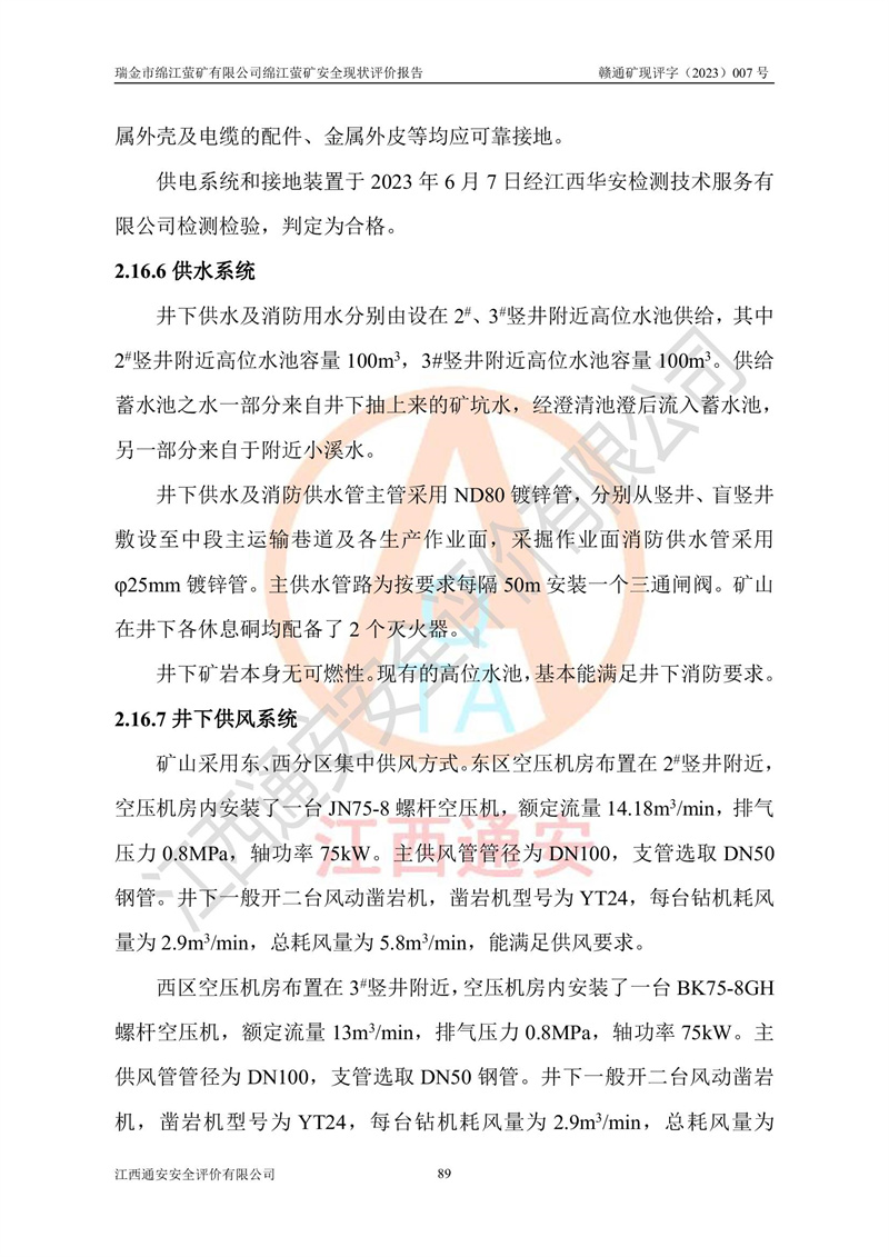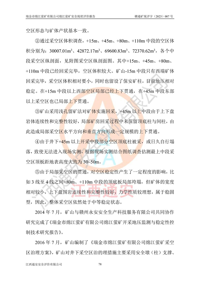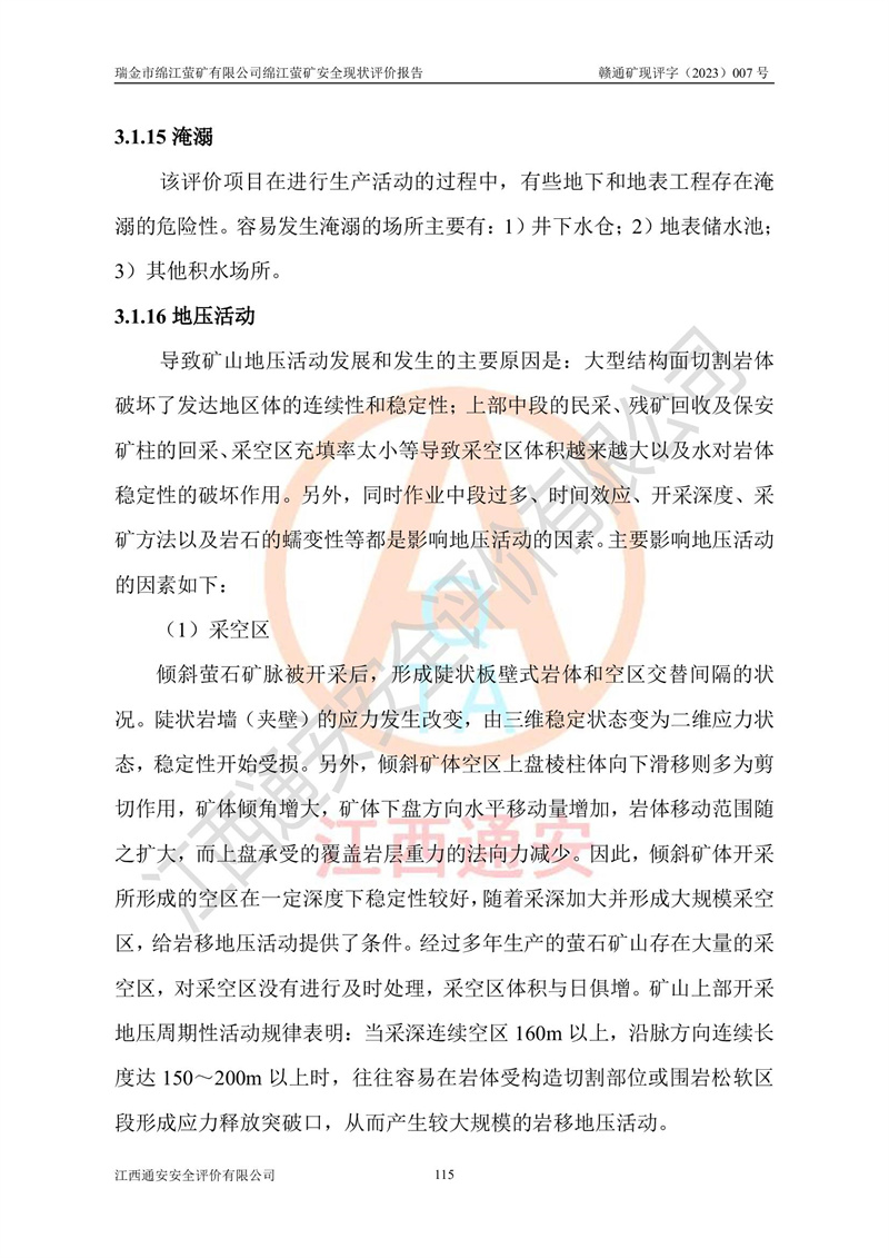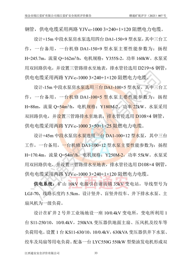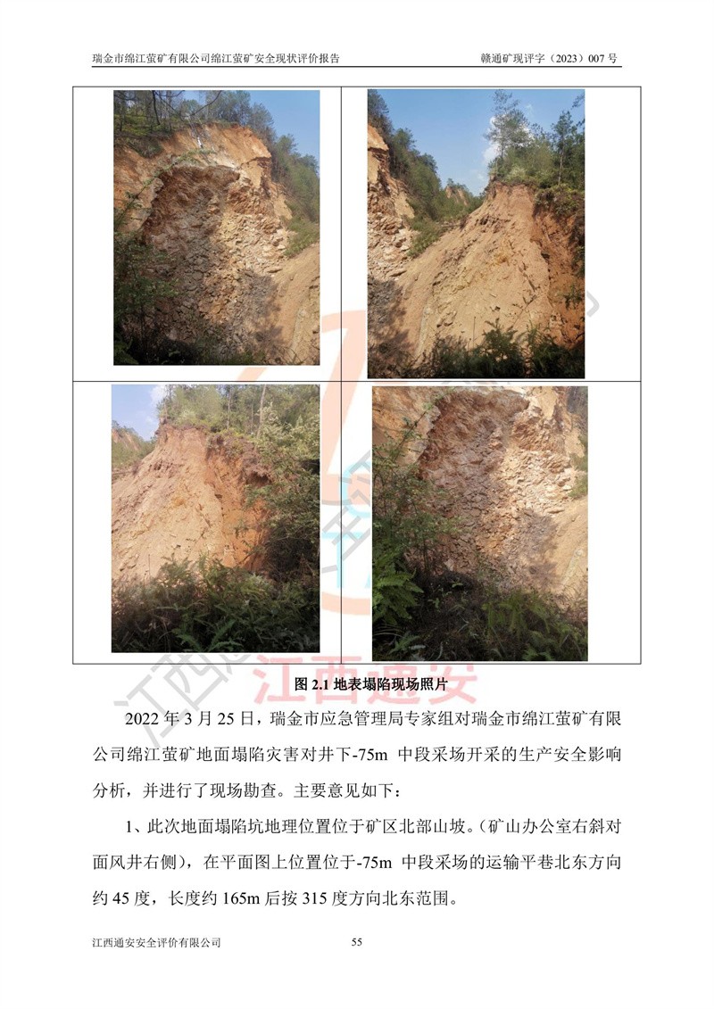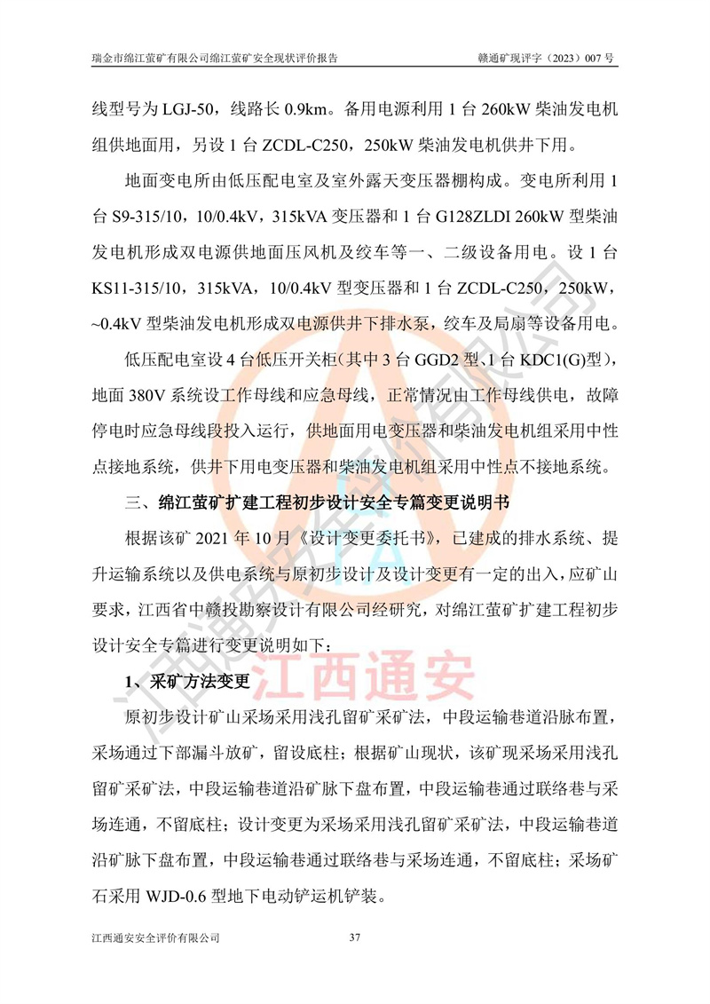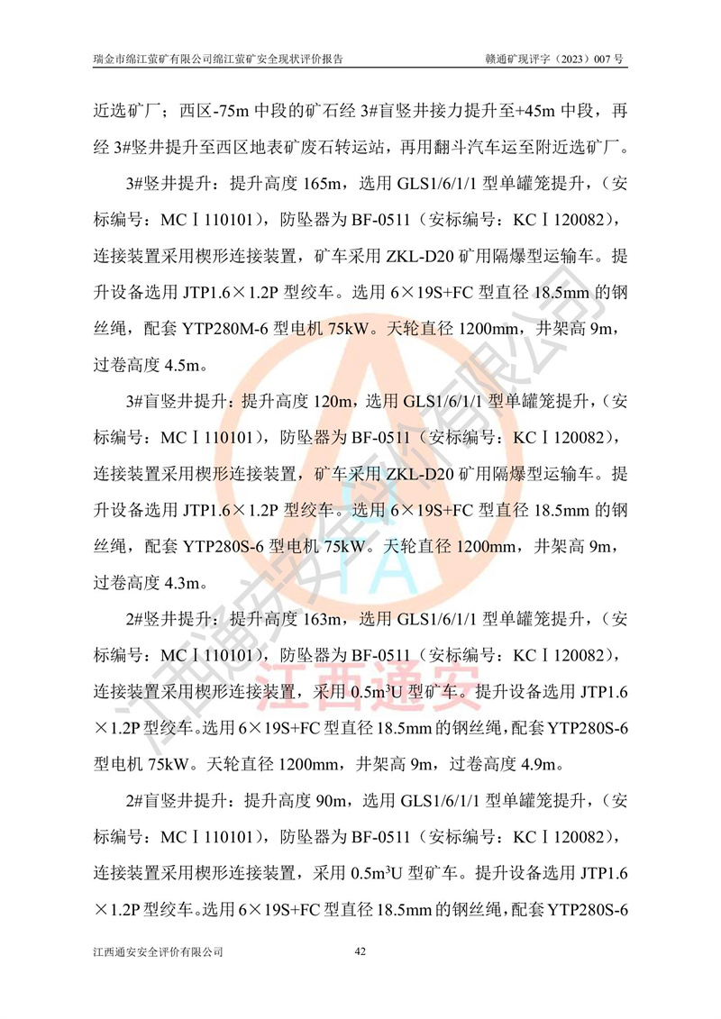 綿江螢礦礦區(qū)位于瑞金市南西210°方向,直線距離約26km,礦區(qū)地理坐標為東徑115°50′54″~115°51′31″,北緯25°38′52″~25°39′34″,行政區(qū)劃隸屬于瑞金市謝坊鎮(zhèn)深塘村管轄。 瑞金市綿江螢礦自1972年始有當?shù)卮迕裥∫?guī)模陸續(xù)開采,1978年收歸瑞金縣謝坊鄉(xiāng)管理,成立謝坊鄉(xiāng)螢石礦,同年收歸縣管改名為瑞金縣螢石礦,再經(jīng)歷多次采礦權人變更后,至2010年礦山由深圳市新星輕質(zhì)合金材料有限公司收購瑞金市綿江螢石礦為其全資子公司,同時成立瑞金市綿江螢礦有限公司為現(xiàn)礦山采礦權人。2021年5月28日,深圳市新星輕質(zhì)合金材料有限公司將其持有的綿江螢礦****股權及派生權益質(zhì)押給瑞金市金鑫礦產(chǎn)品實業(yè)有限公司,采礦權人未變。 礦山于2014年1月20日取得原江西省國土資源廳頒發(fā)的采礦許可證,證號:C3607002009126120050709,采礦權人:瑞金市綿江螢礦有限公司,地址:江西省贛州市瑞金市,礦山名稱:瑞金市綿江螢礦有限公司綿江螢礦,經(jīng)濟類型:私營有限責任公司,開采礦種:螢石(普通),開采方式:地下開采,生產(chǎn)規(guī)模:5.00萬t/a,礦區(qū)面積;0.5053km2,**期限:壹拾貳年自2014年1月20日至2026年1月20日。開采深度由238m至-100m標高,共有8個拐點圈定。 2014年6月,企業(yè)委托江西省煤礦設計院編制了《瑞金市綿江螢礦有限公司綿江螢礦擴建工程初步設計說明書》和《瑞金市綿江螢礦有限公司綿江螢礦擴建工程初步設計說明書安全專篇》。并于2014年6月19日省安監(jiān)局組織專家對《瑞金市綿江螢礦有限公司綿江螢礦擴建工程初步設計說明書安全專篇》進行了評審并原則通過,2014年7月18日由江西省安監(jiān)局下達了《關于瑞金市綿江螢礦有限公司綿江螢礦擴建工程初步設計說明書安全專篇》的審查意見書(贛安監(jiān)非煤項目設審[2014]46號)。礦山擴建工程設計采用豎井+盲豎井聯(lián)合開拓,延深共布置-15m、-45m、-75m、-100m四個中段。采礦方法為淺孔留礦法,通風系統(tǒng)采用中央對角抽出式機械通風,主扇安裝在4#回風斜井井口,礦山生產(chǎn)規(guī)模為5萬t/a,服務年限為10年。 2016年7月,礦山委托江西通安安全評價有限公司編制了《瑞金市綿江螢礦有限公司綿江螢礦地下開采擴建工程安全設施驗收評價報告》。2016年7月31日-8月2日,公司組織有關專家對江西通安安全評價有限公司編制的《瑞金市綿江螢礦有限公司綿江螢礦地下開采擴建工程安全設施驗收評價報告》進行了評審,同時對瑞金市綿江螢礦有限公司綿江螢礦地下開采擴建工程建設項目安全設施進行了現(xiàn)場驗收并原則通過。瑞金市安監(jiān)局依法對驗收過程及結果進行監(jiān)督。 2020年10月12日,礦山取得江西省應急管理換發(fā)的安全生產(chǎn)許可證。編號:(贛)FM安許證字[2005]M0029號,單位名稱:瑞金市綿江螢礦有限公司綿江螢礦地下開采,主要負責人:陳勇,單位地址:江西省瑞金市謝坊鎮(zhèn)深塘村,經(jīng)濟類型:有限責任公司,許可范圍:螢石礦5萬t/a,豎井+盲豎井聯(lián)合開拓,-75m、-100m中段地下開采,**期:2020年10月27日至2023年10月26日。 礦山取得安全生產(chǎn)許可證后,嚴格按照設計回采順序(中段按從上到下的順序開采,同時開采中段數(shù)為一個)要求進行開采,目前礦山-15m、-45m中段已結束回采。礦山現(xiàn)采用豎井+盲豎井聯(lián)合開拓。東區(qū)2#豎井(SJ2)為主豎井,西區(qū)3#豎井(SJ3)為副豎井,XJ4斜井為回風井兼做安全出口。礦山共開拓了+170、+110m、+80m、+65m、+45m、+15m、-15m、-45m、-75m、-100m等十個中段,其中-45m以上中段已回采結束,目前-75m為主要生產(chǎn)中段,-45m為回風中段,-100m為生產(chǎn)開拓中段。-75m中段東、西兩區(qū)運輸巷道已貫通,并已掘三個通風天井連接至-45m中段,東區(qū)-100m中段已掘穿脈、沿脈巷道100m。東、西區(qū)的-45m以上中段均已貫通。東區(qū)+15m中段已開拓2#盲豎井至-100m中段,2#盲豎井連接-15m、-45m、-75m、-100m四個中段。西區(qū)+45m中段已開拓3#盲豎井至-75m中段,3#盲豎井連接+15m、-15m、-45m、-75m四個中段,并計劃按設計延伸至-100m中段。 2019年3月-2020年6月礦山對提升運輸系統(tǒng)設備設施進行了改造,各中段及豎井、盲豎井井口運輸由原無軌膠輪車運輸改為0.5m3U型礦車運輸,各東、西區(qū)豎井及盲豎井均新安裝了BF-0511防墜器,新更換了GLS1/6/1/1罐籠。隨著礦山進行深部開拓,井下需風量及風阻隨之變大,為了滿足礦山通風系統(tǒng)要求,礦山將設計一期工程15kW型號KCZ40-№11主扇風機,更換為二期工程55kW型號KZC40-№13主扇,進一步提高了礦井通風效率。同時將東、西兩區(qū)豎井及盲豎井原JTP-1.2×1.0P絞車更換為JTP-1.6×1.2P型絞車。 為了進一步優(yōu)化礦山提升運輸、排水、供電等系統(tǒng),2022年10月,礦山委托江西省中贛投勘察設計有限公司(原江西省煤礦設計院)編制了《瑞金市綿江螢礦有限公司綿江螢礦地下開采提升運輸、排水、供電優(yōu)化方案設計》。至2023年8月,礦山按優(yōu)化方案完成了改造,并委托江西華安檢測技術服務有限公司對設備設施進行檢測,檢測結果合格。 根據(jù)《安全生產(chǎn)法》、《安全生產(chǎn)許可證條例》等有關法律、法規(guī)的規(guī)定以及《關于做好非煤礦礦山企業(yè)安全生產(chǎn)許可證延期換證工作的通知》的要求,2023年4月,瑞金市綿江