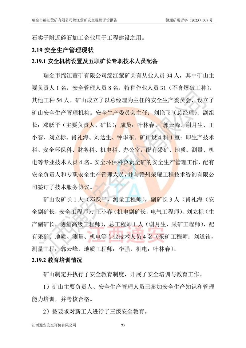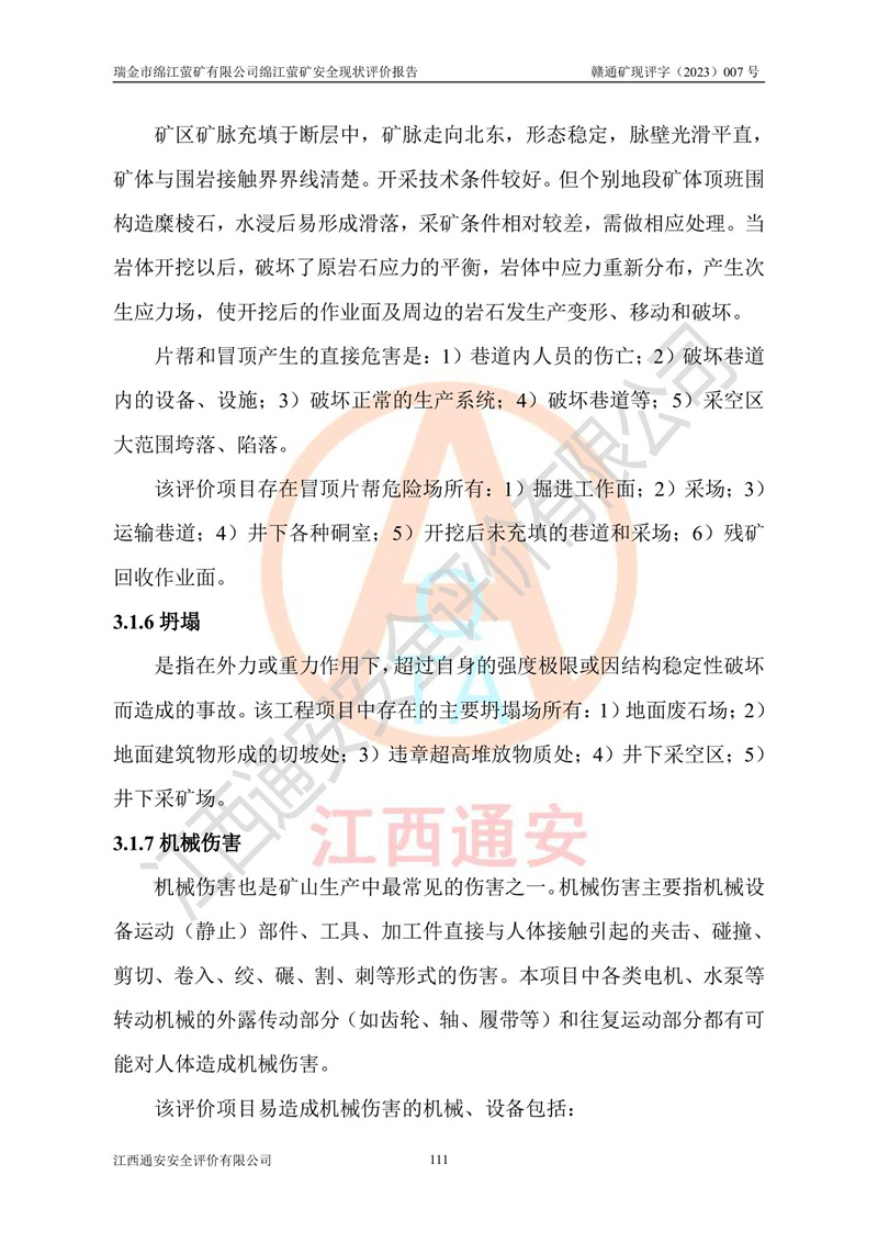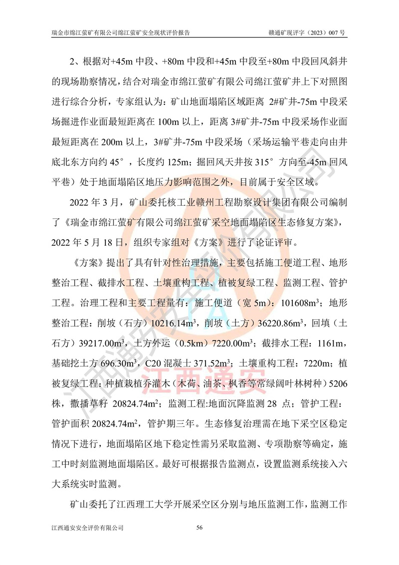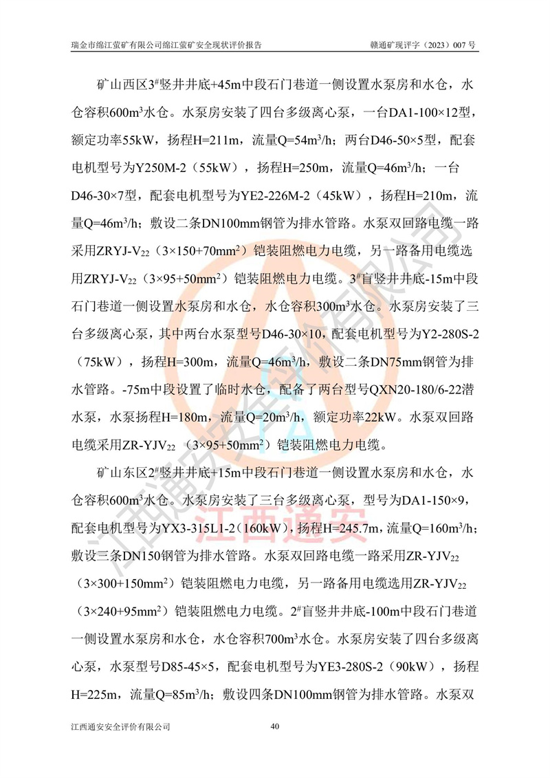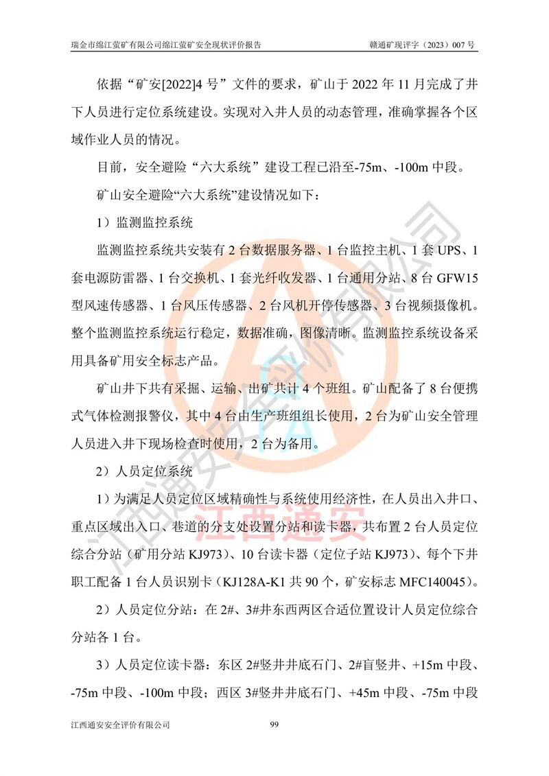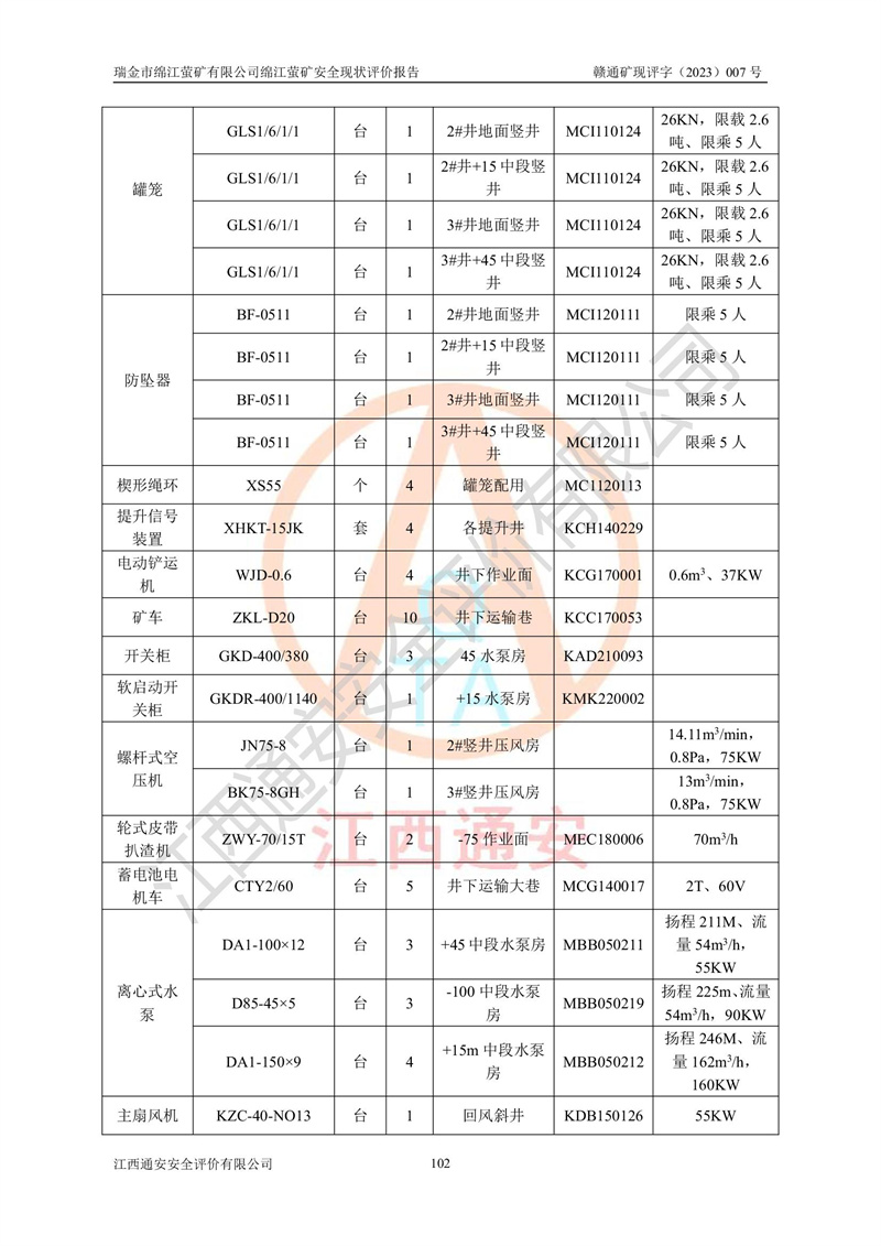綿江螢礦礦區(qū)位于瑞金市南西210°方向,直線距離約26km,礦區(qū)地理坐標為東徑115°50′54″~115°51′31″,北緯25°38′52″~25°39′34″,行政區(qū)劃隸屬于瑞金市謝坊鎮(zhèn)深塘村管轄。 瑞金市綿江螢礦自1972年始有當?shù)卮迕裥∫?guī)模陸續(xù)開采,1978年收歸瑞金縣謝坊鄉(xiāng)管理,成立謝坊鄉(xiāng)螢石礦,同年收歸縣管改名為瑞金縣螢石礦,再經(jīng)歷多次采礦權人變更后,至2010年礦山由深圳市新星輕質(zhì)合金材料有限公司收購瑞金市綿江螢石礦為其全資子公司,同時成立瑞金市綿江螢礦有限公司為現(xiàn)礦山采礦權人。2021年5月28日,深圳市新星輕質(zhì)合金材料有限公司將其持有的綿江螢礦****股權及派生權益質(zhì)押給瑞金市金鑫礦產(chǎn)品實業(yè)有限公司,采礦權人未變。 礦山于2014年1月20日取得原江西省國土資源廳頒發(fā)的采礦許可證,證號:C3607002009126120050709,采礦權人:瑞金市綿江螢礦有限公司,地址:江西省贛州市瑞金市,礦山名稱:瑞金市綿江螢礦有限公司綿江螢礦,經(jīng)濟類型:私營有限責任公司,開采礦種:螢石(普通),開采方式:地下開采,生產(chǎn)規(guī)模:5.00萬t/a,礦區(qū)面積;0.5053km2,**期限:壹拾貳年自2014年1月20日至2026年1月20日。開采深度由238m至-100m標高,共有8個拐點圈定。 2014年6月,企業(yè)委托江西省煤礦設計院編制了《瑞金市綿江螢礦有限公司綿江螢礦擴建工程初步設計說明書》和《瑞金市綿江螢礦有限公司綿江螢礦擴建工程初步設計說明書安全專篇》。并于2014年6月19日省安監(jiān)局組織專家對《瑞金市綿江螢礦有限公司綿江螢礦擴建工程初步設計說明書安全專篇》進行了評審并原則通過,2014年7月18日由江西省安監(jiān)局下達了《關于瑞金市綿江螢礦有限公司綿江螢礦擴建工程初步設計說明書安全專篇》的審查意見書(贛安監(jiān)非煤項目設審[2014]46號)。礦山擴建工程設計采用豎井+盲豎井聯(lián)合開拓,延深共布置-15m、-45m、-75m、-100m四個中段。采礦方法為淺孔留礦法,通風系統(tǒng)采用中央對角抽出式機械通風,主扇安裝在4#回風斜井井口,礦山生產(chǎn)規(guī)模為5萬t/a,服務年限為10年。 2016年7月,礦山委托江西通安安全評價有限公司編制了《瑞金市綿江螢礦有限公司綿江螢礦地下開采擴建工程安全設施驗收評價報告》。2016年7月31日-8月2日,公司組織有關專家對江西通安安全評價有限公司編制的《瑞金市綿江螢礦有限公司綿江螢礦地下開采擴建工程安全設施驗收評價報告》進行了評審,同時對瑞金市綿江螢礦有限公司綿江螢礦地下開采擴建工程建設項目安全設施進行了現(xiàn)場驗收并原則通過。瑞金市安監(jiān)局依法對驗收過程及結果進行監(jiān)督。 2020年10月12日,礦山取得江西省應急管理換發(fā)的安全生產(chǎn)許可證。編號:(贛)FM安許證字[2005]M0029號,單位名稱:瑞金市綿江螢礦有限公司綿江螢礦地下開采,主要負責人:陳勇,單位地址:江西省瑞金市謝坊鎮(zhèn)深塘村,經(jīng)濟類型:有限責任公司,許可范圍:螢石礦5萬t/a,豎井+盲豎井聯(lián)合開拓,-75m、-100m中段地下開采,**期:2020年10月27日至2023年10月26日。 礦山取得安全生產(chǎn)許可證后,嚴格按照設計回采順序(中段按從上到下的順序開采,同時開采中段數(shù)為一個)要求進行開采,目前礦山-15m、-45m中段已結束回采。礦山現(xiàn)采用豎井+盲豎井聯(lián)合開拓。東區(qū)2#豎井(SJ2)為主豎井,西區(qū)3#豎井(SJ3)為副豎井,XJ4斜井為回風井兼做安全出口。礦山共開拓了+170、+110m、+80m、+65m、+45m、+15m、-15m、-45m、-75m、-100m等十個中段,其中-45m以上中段已回采結束,目前-75m為主要生產(chǎn)中段,-45m為回風中段,-100m為生產(chǎn)開拓中段。-75m中段東、西兩區(qū)運輸巷道已貫通,并已掘三個通風天井連接至-45m中段,東區(qū)-100m中段已掘穿脈、沿脈巷道100m。東、西區(qū)的-45m以上中段均已貫通。東區(qū)+15m中段已開拓2#盲豎井至-100m中段,2#盲豎井連接-15m、-45m、-75m、-100m四個中段。西區(qū)+45m中段已開拓3#盲豎井至-75m中段,3#盲豎井連接+15m、-15m、-45m、-75m四個中段,并計劃按設計延伸至-100m中段。 2019年3月-2020年6月礦山對提升運輸系統(tǒng)設備設施進行了改造,各中段及豎井、盲豎井井口運輸由原無軌膠輪車運輸改為0.5m3U型礦車運輸,各東、西區(qū)豎井及盲豎井均新安裝了BF-0511防墜器,新更換了GLS1/6/1/1罐籠。隨著礦山進行深部開拓,井下需風量及風阻隨之變大,為了滿足礦山通風系統(tǒng)要求,礦山將設計一期工程15kW型號KCZ40-№11主扇風機,更換為二期工程55kW型號KZC40-№13主扇,進一步提高了礦井通風效率。同時將東、西兩區(qū)豎井及盲豎井原JTP-1.2×1.0P絞車更換為JTP-1.6×1.2P型絞車。 為了進一步優(yōu)化礦山提升運輸、排水、供電等系統(tǒng),2022年10月,礦山委托江西省中贛投勘察設計有限公司(原江西省煤礦設計院)編制了《瑞金市綿江螢礦有限公司綿江螢礦地下開采提升運輸、排水、供電優(yōu)化方案設計》。至2023年8月,礦山按優(yōu)化方案完成了改造,并委托江西華安檢測技術服務有限公司對設備設施進行檢測,檢測結果合格。 根據(jù)《安全生產(chǎn)法》、《安全生產(chǎn)許可證條例》等有關法律、法規(guī)的規(guī)定以及《關于做好非煤礦礦山企業(yè)安全生產(chǎn)許可證延期換證工作的通知》的要求,2023年4月,瑞金市綿江