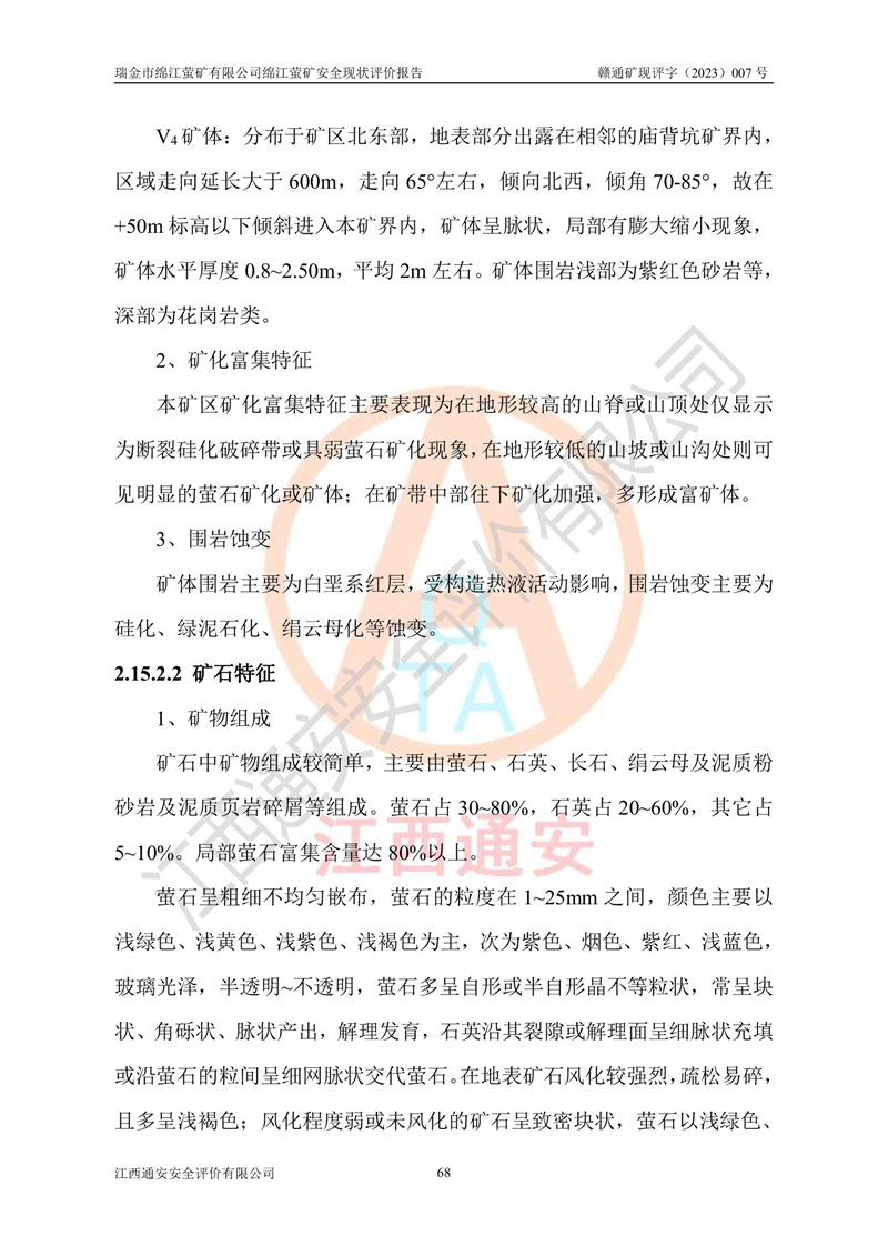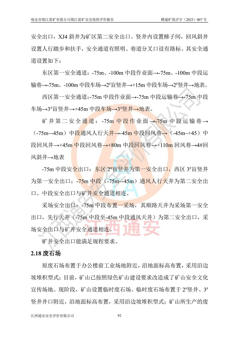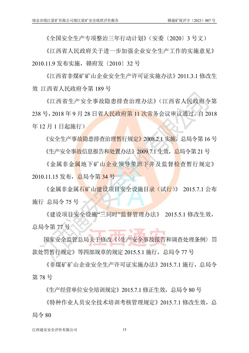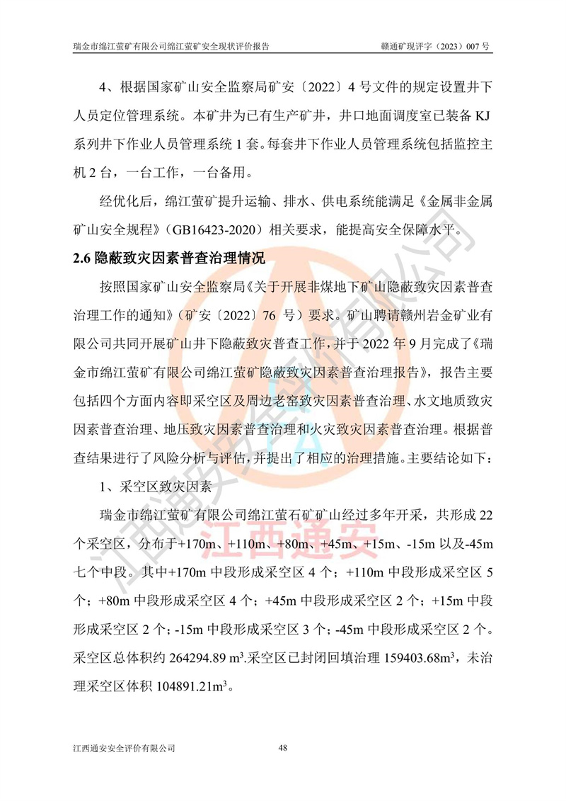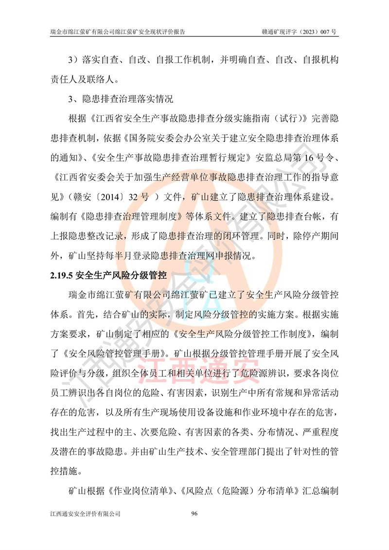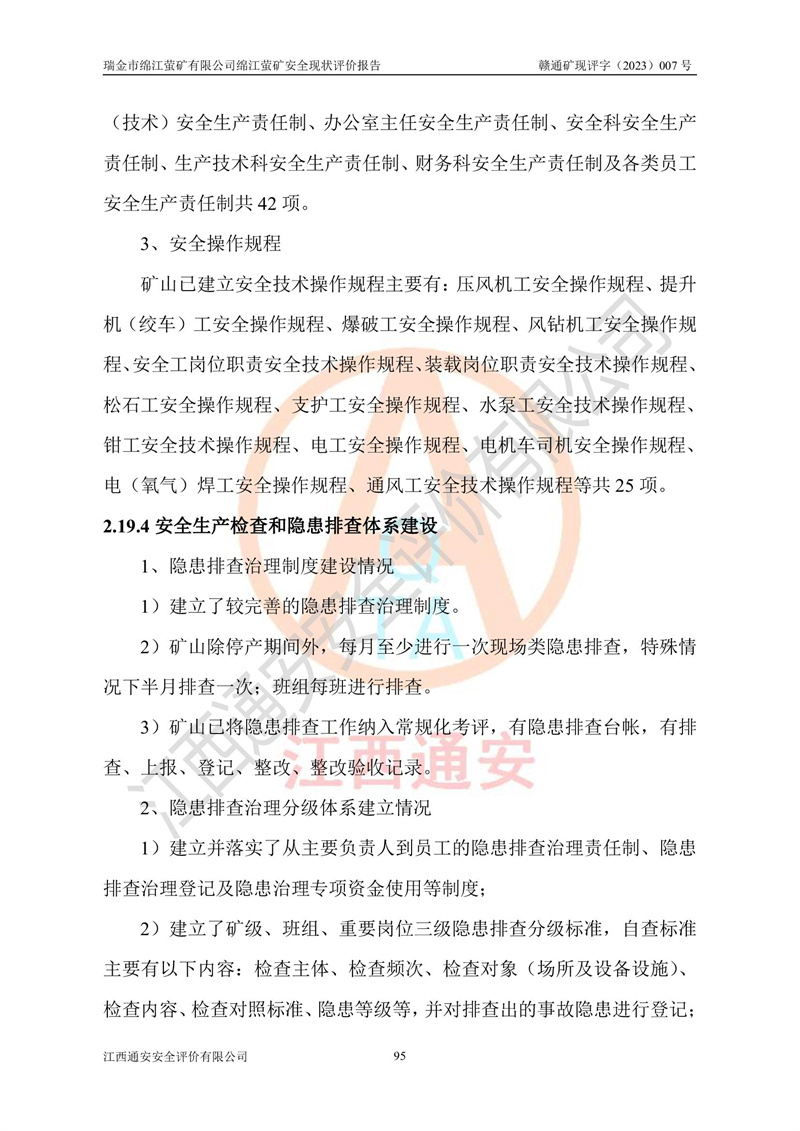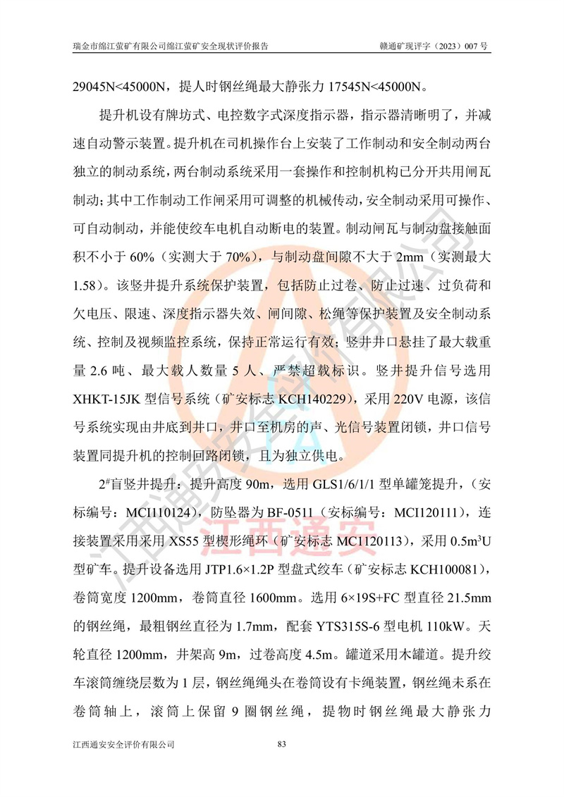 綿江螢礦礦區(qū)位于瑞金市南西210°方向,直線距離約26km,礦區(qū)地理坐標為東徑115°50′54″~115°51′31″,北緯25°38′52″~25°39′34″,行政區(qū)劃隸屬于瑞金市謝坊鎮(zhèn)深塘村管轄。 瑞金市綿江螢礦自1972年始有當?shù)卮迕裥∫?guī)模陸續(xù)開采,1978年收歸瑞金縣謝坊鄉(xiāng)管理,成立謝坊鄉(xiāng)螢石礦,同年收歸縣管改名為瑞金縣螢石礦,再經(jīng)歷多次采礦權人變更后,至2010年礦山由深圳市新星輕質(zhì)合金材料有限公司收購瑞金市綿江螢石礦為其全資子公司,同時成立瑞金市綿江螢礦有限公司為現(xiàn)礦山采礦權人。2021年5月28日,深圳市新星輕質(zhì)合金材料有限公司將其持有的綿江螢礦****股權及派生權益質(zhì)押給瑞金市金鑫礦產(chǎn)品實業(yè)有限公司,采礦權人未變。 礦山于2014年1月20日取得原江西省國土資源廳頒發(fā)的采礦許可證,證號:C3607002009126120050709,采礦權人:瑞金市綿江螢礦有限公司,地址:江西省贛州市瑞金市,礦山名稱:瑞金市綿江螢礦有限公司綿江螢礦,經(jīng)濟類型:私營有限責任公司,開采礦種:螢石(普通),開采方式:地下開采,生產(chǎn)規(guī)模:5.00萬t/a,礦區(qū)面積;0.5053km2,**期限:壹拾貳年自2014年1月20日至2026年1月20日。開采深度由238m至-100m標高,共有8個拐點圈定。 2014年6月,企業(yè)委托江西省煤礦設計院編制了《瑞金市綿江螢礦有限公司綿江螢礦擴建工程初步設計說明書》和《瑞金市綿江螢礦有限公司綿江螢礦擴建工程初步設計說明書安全專篇》。并于2014年6月19日省安監(jiān)局組織專家對《瑞金市綿江螢礦有限公司綿江螢礦擴建工程初步設計說明書安全專篇》進行了評審并原則通過,2014年7月18日由江西省安監(jiān)局下達了《關于瑞金市綿江螢礦有限公司綿江螢礦擴建工程初步設計說明書安全專篇》的審查意見書(贛安監(jiān)非煤項目設審[2014]46號)。礦山擴建工程設計采用豎井+盲豎井聯(lián)合開拓,延深共布置-15m、-45m、-75m、-100m四個中段。采礦方法為淺孔留礦法,通風系統(tǒng)采用中央對角抽出式機械通風,主扇安裝在4#回風斜井井口,礦山生產(chǎn)規(guī)模為5萬t/a,服務年限為10年。 2016年7月,礦山委托江西通安安全評價有限公司編制了《瑞金市綿江螢礦有限公司綿江螢礦地下開采擴建工程安全設施驗收評價報告》。2016年7月31日-8月2日,公司組織有關專家對江西通安安全評價有限公司編制的《瑞金市綿江螢礦有限公司綿江螢礦地下開采擴建工程安全設施驗收評價報告》進行了評審,同時對瑞金市綿江螢礦有限公司綿江螢礦地下開采擴建工程建設項目安全設施進行了現(xiàn)場驗收并原則通過。瑞金市安監(jiān)局依法對驗收過程及結果進行監(jiān)督。 2020年10月12日,礦山取得江西省應急管理換發(fā)的安全生產(chǎn)許可證。編號:(贛)FM安許證字[2005]M0029號,單位名稱:瑞金市綿江螢礦有限公司綿江螢礦地下開采,主要負責人:陳勇,單位地址:江西省瑞金市謝坊鎮(zhèn)深塘村,經(jīng)濟類型:有限責任公司,許可范圍:螢石礦5萬t/a,豎井+盲豎井聯(lián)合開拓,-75m、-100m中段地下開采,**期:2020年10月27日至2023年10月26日。 礦山取得安全生產(chǎn)許可證后,嚴格按照設計回采順序(中段按從上到下的順序開采,同時開采中段數(shù)為一個)要求進行開采,目前礦山-15m、-45m中段已結束回采。礦山現(xiàn)采用豎井+盲豎井聯(lián)合開拓。東區(qū)2#豎井(SJ2)為主豎井,西區(qū)3#豎井(SJ3)為副豎井,XJ4斜井為回風井兼做安全出口。礦山共開拓了+170、+110m、+80m、+65m、+45m、+15m、-15m、-45m、-75m、-100m等十個中段,其中-45m以上中段已回采結束,目前-75m為主要生產(chǎn)中段,-45m為回風中段,-100m為生產(chǎn)開拓中段。-75m中段東、西兩區(qū)運輸巷道已貫通,并已掘三個通風天井連接至-45m中段,東區(qū)-100m中段已掘穿脈、沿脈巷道100m。東、西區(qū)的-45m以上中段均已貫通。東區(qū)+15m中段已開拓2#盲豎井至-100m中段,2#盲豎井連接-15m、-45m、-75m、-100m四個中段。西區(qū)+45m中段已開拓3#盲豎井至-75m中段,3#盲豎井連接+15m、-15m、-45m、-75m四個中段,并計劃按設計延伸至-100m中段。 2019年3月-2020年6月礦山對提升運輸系統(tǒng)設備設施進行了改造,各中段及豎井、盲豎井井口運輸由原無軌膠輪車運輸改為0.5m3U型礦車運輸,各東、西區(qū)豎井及盲豎井均新安裝了BF-0511防墜器,新更換了GLS1/6/1/1罐籠。隨著礦山進行深部開拓,井下需風量及風阻隨之變大,為了滿足礦山通風系統(tǒng)要求,礦山將設計一期工程15kW型號KCZ40-№11主扇風機,更換為二期工程55kW型號KZC40-№13主扇,進一步提高了礦井通風效率。同時將東、西兩區(qū)豎井及盲豎井原JTP-1.2×1.0P絞車更換為JTP-1.6×1.2P型絞車。 為了進一步優(yōu)化礦山提升運輸、排水、供電等系統(tǒng),2022年10月,礦山委托江西省中贛投勘察設計有限公司(原江西省煤礦設計院)編制了《瑞金市綿江螢礦有限公司綿江螢礦地下開采提升運輸、排水、供電優(yōu)化方案設計》。至2023年8月,礦山按優(yōu)化方案完成了改造,并委托江西華安檢測技術服務有限公司對設備設施進行檢測,檢測結果合格。 根據(jù)《安全生產(chǎn)法》、《安全生產(chǎn)許可證條例》等有關法律、法規(guī)的規(guī)定以及《關于做好非煤礦礦山企業(yè)安全生產(chǎn)許可證延期換證工作的通知》的要求,2023年4月,瑞金市綿江