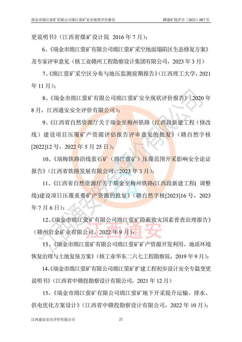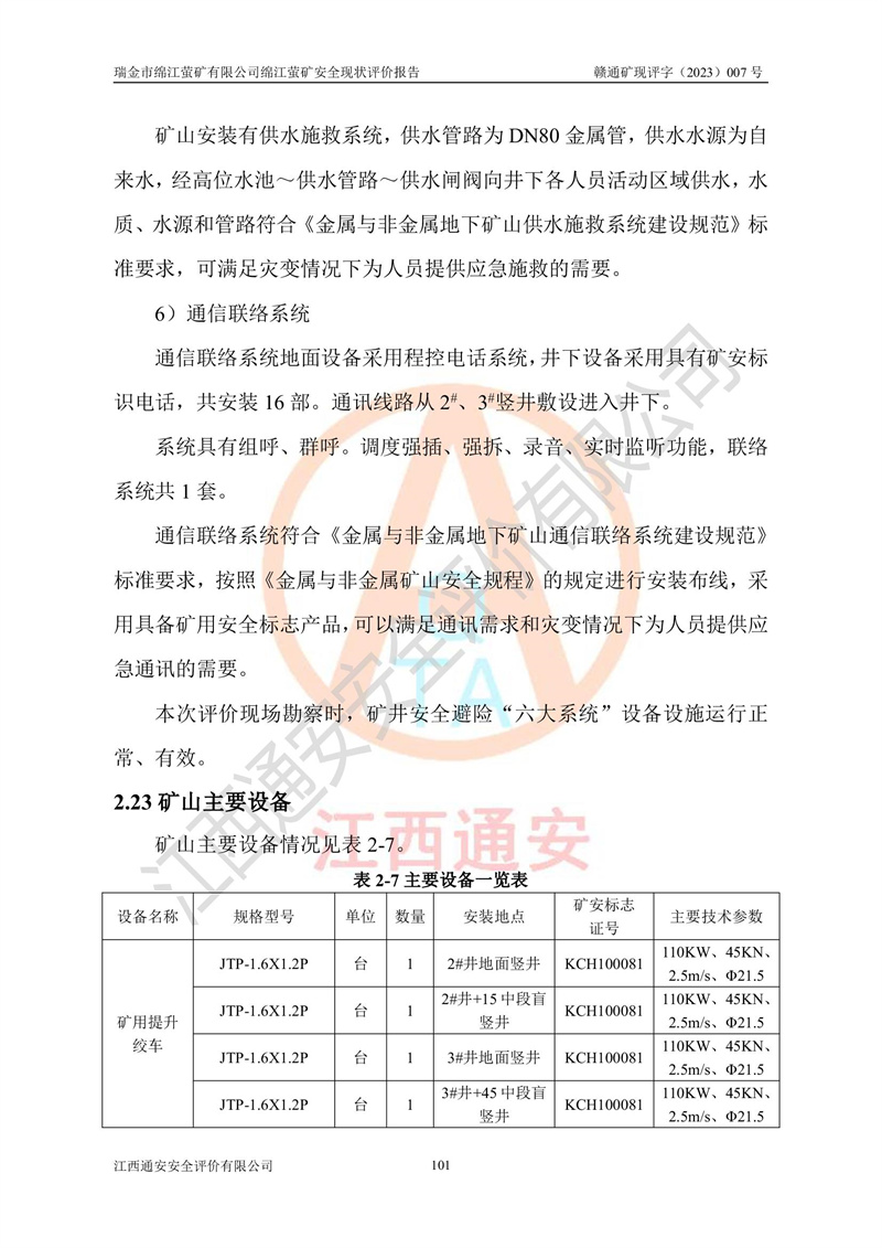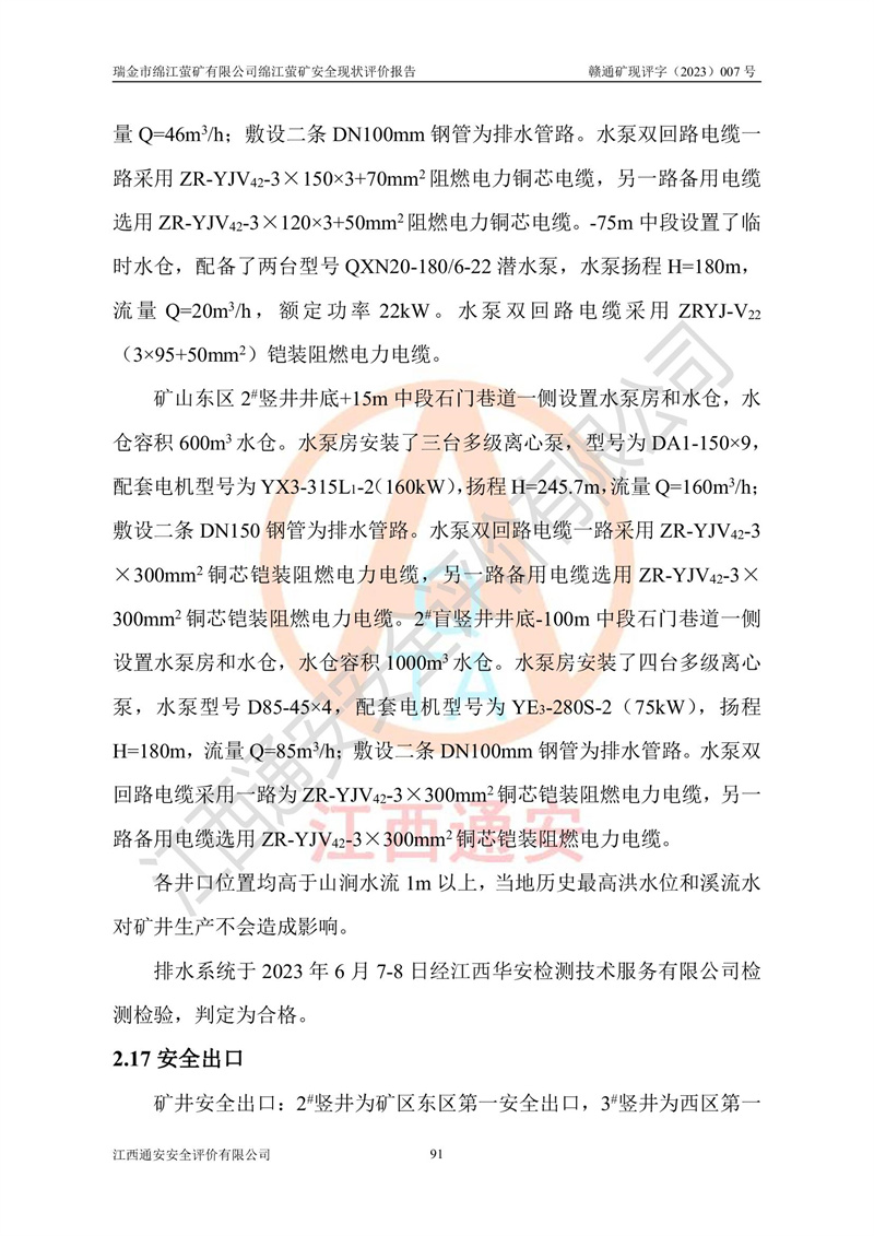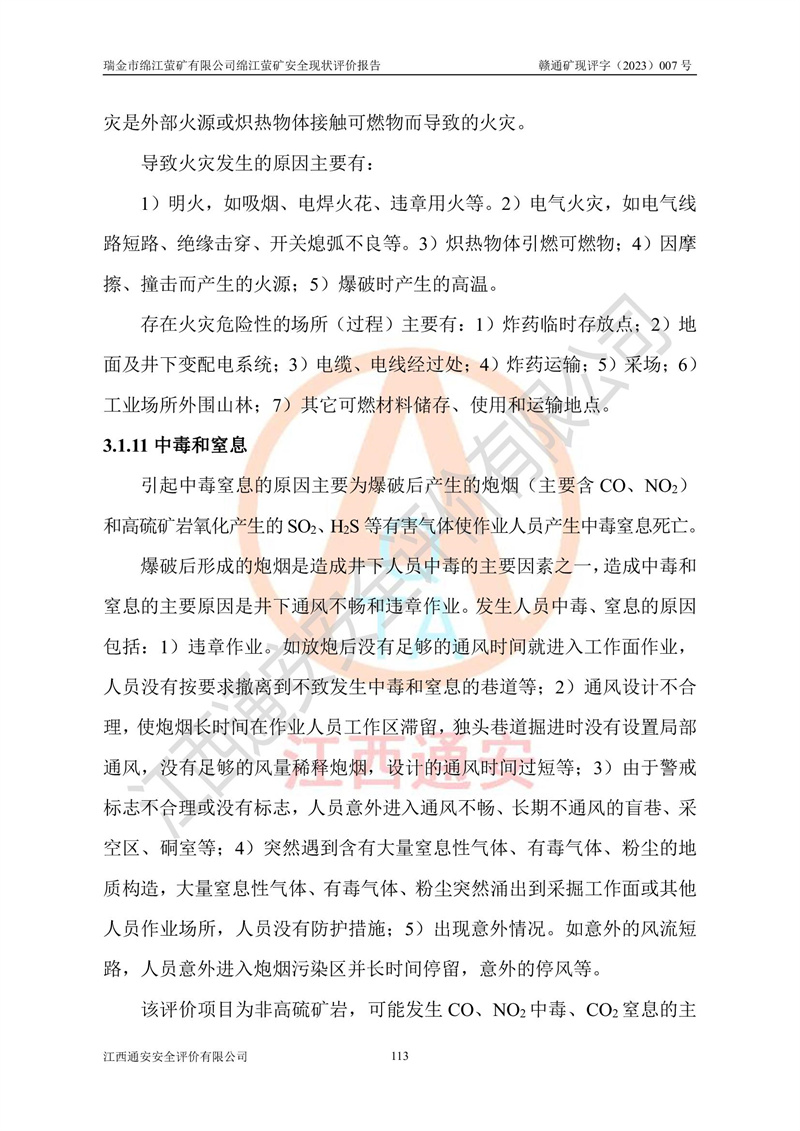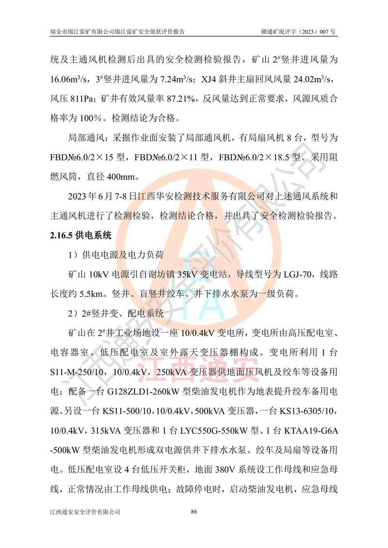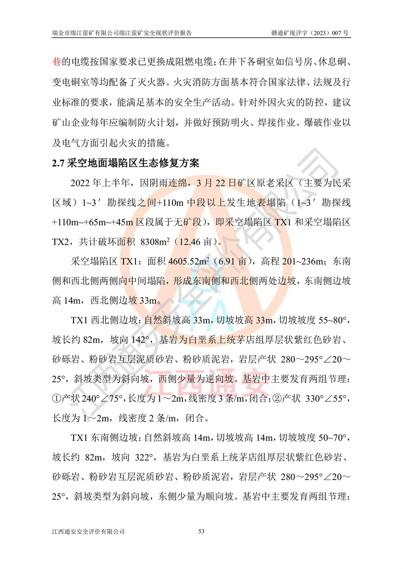 綿江螢礦礦區(qū)位于瑞金市南西210°方向,直線距離約26km,礦區(qū)地理坐標為東徑115°50′54″~115°51′31″,北緯25°38′52″~25°39′34″,行政區(qū)劃隸屬于瑞金市謝坊鎮(zhèn)深塘村管轄。 瑞金市綿江螢礦自1972年始有當?shù)卮迕裥∫?guī)模陸續(xù)開采,1978年收歸瑞金縣謝坊鄉(xiāng)管理,成立謝坊鄉(xiāng)螢石礦,同年收歸縣管改名為瑞金縣螢石礦,再經(jīng)歷多次采礦權人變更后,至2010年礦山由深圳市新星輕質(zhì)合金材料有限公司收購瑞金市綿江螢石礦為其全資子公司,同時成立瑞金市綿江螢礦有限公司為現(xiàn)礦山采礦權人。2021年5月28日,深圳市新星輕質(zhì)合金材料有限公司將其持有的綿江螢礦****股權及派生權益質(zhì)押給瑞金市金鑫礦產(chǎn)品實業(yè)有限公司,采礦權人未變。 礦山于2014年1月20日取得原江西省國土資源廳頒發(fā)的采礦許可證,證號:C3607002009126120050709,采礦權人:瑞金市綿江螢礦有限公司,地址:江西省贛州市瑞金市,礦山名稱:瑞金市綿江螢礦有限公司綿江螢礦,經(jīng)濟類型:私營有限責任公司,開采礦種:螢石(普通),開采方式:地下開采,生產(chǎn)規(guī)模:5.00萬t/a,礦區(qū)面積;0.5053km2,**期限:壹拾貳年自2014年1月20日至2026年1月20日。開采深度由238m至-100m標高,共有8個拐點圈定。 2014年6月,企業(yè)委托江西省煤礦設計院編制了《瑞金市綿江螢礦有限公司綿江螢礦擴建工程初步設計說明書》和《瑞金市綿江螢礦有限公司綿江螢礦擴建工程初步設計說明書安全專篇》。并于2014年6月19日省安監(jiān)局組織專家對《瑞金市綿江螢礦有限公司綿江螢礦擴建工程初步設計說明書安全專篇》進行了評審并原則通過,2014年7月18日由江西省安監(jiān)局下達了《關于瑞金市綿江螢礦有限公司綿江螢礦擴建工程初步設計說明書安全專篇》的審查意見書(贛安監(jiān)非煤項目設審[2014]46號)。礦山擴建工程設計采用豎井+盲豎井聯(lián)合開拓,延深共布置-15m、-45m、-75m、-100m四個中段。采礦方法為淺孔留礦法,通風系統(tǒng)采用中央對角抽出式機械通風,主扇安裝在4#回風斜井井口,礦山生產(chǎn)規(guī)模為5萬t/a,服務年限為10年。 2016年7月,礦山委托江西通安安全評價有限公司編制了《瑞金市綿江螢礦有限公司綿江螢礦地下開采擴建工程安全設施驗收評價報告》。2016年7月31日-8月2日,公司組織有關專家對江西通安安全評價有限公司編制的《瑞金市綿江螢礦有限公司綿江螢礦地下開采擴建工程安全設施驗收評價報告》進行了評審,同時對瑞金市綿江螢礦有限公司綿江螢礦地下開采擴建工程建設項目安全設施進行了現(xiàn)場驗收并原則通過。瑞金市安監(jiān)局依法對驗收過程及結果進行監(jiān)督。 2020年10月12日,礦山取得江西省應急管理換發(fā)的安全生產(chǎn)許可證。編號:(贛)FM安許證字[2005]M0029號,單位名稱:瑞金市綿江螢礦有限公司綿江螢礦地下開采,主要負責人:陳勇,單位地址:江西省瑞金市謝坊鎮(zhèn)深塘村,經(jīng)濟類型:有限責任公司,許可范圍:螢石礦5萬t/a,豎井+盲豎井聯(lián)合開拓,-75m、-100m中段地下開采,**期:2020年10月27日至2023年10月26日。 礦山取得安全生產(chǎn)許可證后,嚴格按照設計回采順序(中段按從上到下的順序開采,同時開采中段數(shù)為一個)要求進行開采,目前礦山-15m、-45m中段已結束回采。礦山現(xiàn)采用豎井+盲豎井聯(lián)合開拓。東區(qū)2#豎井(SJ2)為主豎井,西區(qū)3#豎井(SJ3)為副豎井,XJ4斜井為回風井兼做安全出口。礦山共開拓了+170、+110m、+80m、+65m、+45m、+15m、-15m、-45m、-75m、-100m等十個中段,其中-45m以上中段已回采結束,目前-75m為主要生產(chǎn)中段,-45m為回風中段,-100m為生產(chǎn)開拓中段。-75m中段東、西兩區(qū)運輸巷道已貫通,并已掘三個通風天井連接至-45m中段,東區(qū)-100m中段已掘穿脈、沿脈巷道100m。東、西區(qū)的-45m以上中段均已貫通。東區(qū)+15m中段已開拓2#盲豎井至-100m中段,2#盲豎井連接-15m、-45m、-75m、-100m四個中段。西區(qū)+45m中段已開拓3#盲豎井至-75m中段,3#盲豎井連接+15m、-15m、-45m、-75m四個中段,并計劃按設計延伸至-100m中段。 2019年3月-2020年6月礦山對提升運輸系統(tǒng)設備設施進行了改造,各中段及豎井、盲豎井井口運輸由原無軌膠輪車運輸改為0.5m3U型礦車運輸,各東、西區(qū)豎井及盲豎井均新安裝了BF-0511防墜器,新更換了GLS1/6/1/1罐籠。隨著礦山進行深部開拓,井下需風量及風阻隨之變大,為了滿足礦山通風系統(tǒng)要求,礦山將設計一期工程15kW型號KCZ40-№11主扇風機,更換為二期工程55kW型號KZC40-№13主扇,進一步提高了礦井通風效率。同時將東、西兩區(qū)豎井及盲豎井原JTP-1.2×1.0P絞車更換為JTP-1.6×1.2P型絞車。 為了進一步優(yōu)化礦山提升運輸、排水、供電等系統(tǒng),2022年10月,礦山委托江西省中贛投勘察設計有限公司(原江西省煤礦設計院)編制了《瑞金市綿江螢礦有限公司綿江螢礦地下開采提升運輸、排水、供電優(yōu)化方案設計》。至2023年8月,礦山按優(yōu)化方案完成了改造,并委托江西華安檢測技術服務有限公司對設備設施進行檢測,檢測結果合格。 根據(jù)《安全生產(chǎn)法》、《安全生產(chǎn)許可證條例》等有關法律、法規(guī)的規(guī)定以及《關于做好非煤礦礦山企業(yè)安全生產(chǎn)許可證延期換證工作的通知》的要求,2023年4月,瑞金市綿江