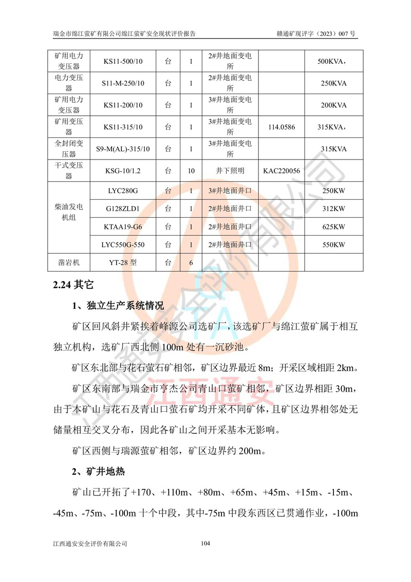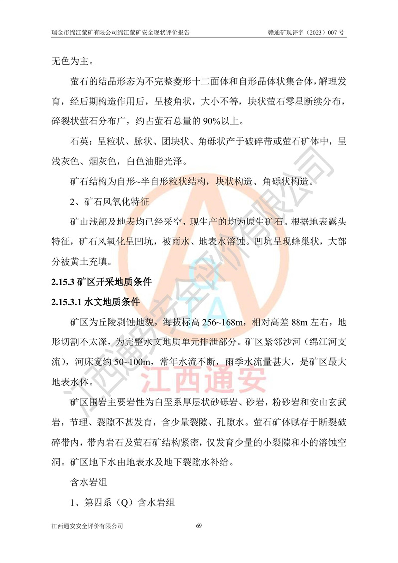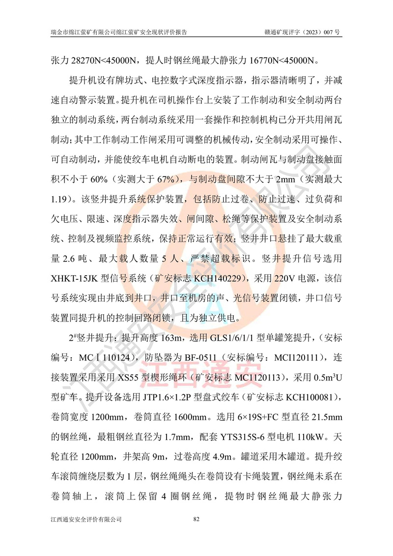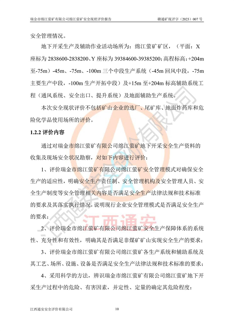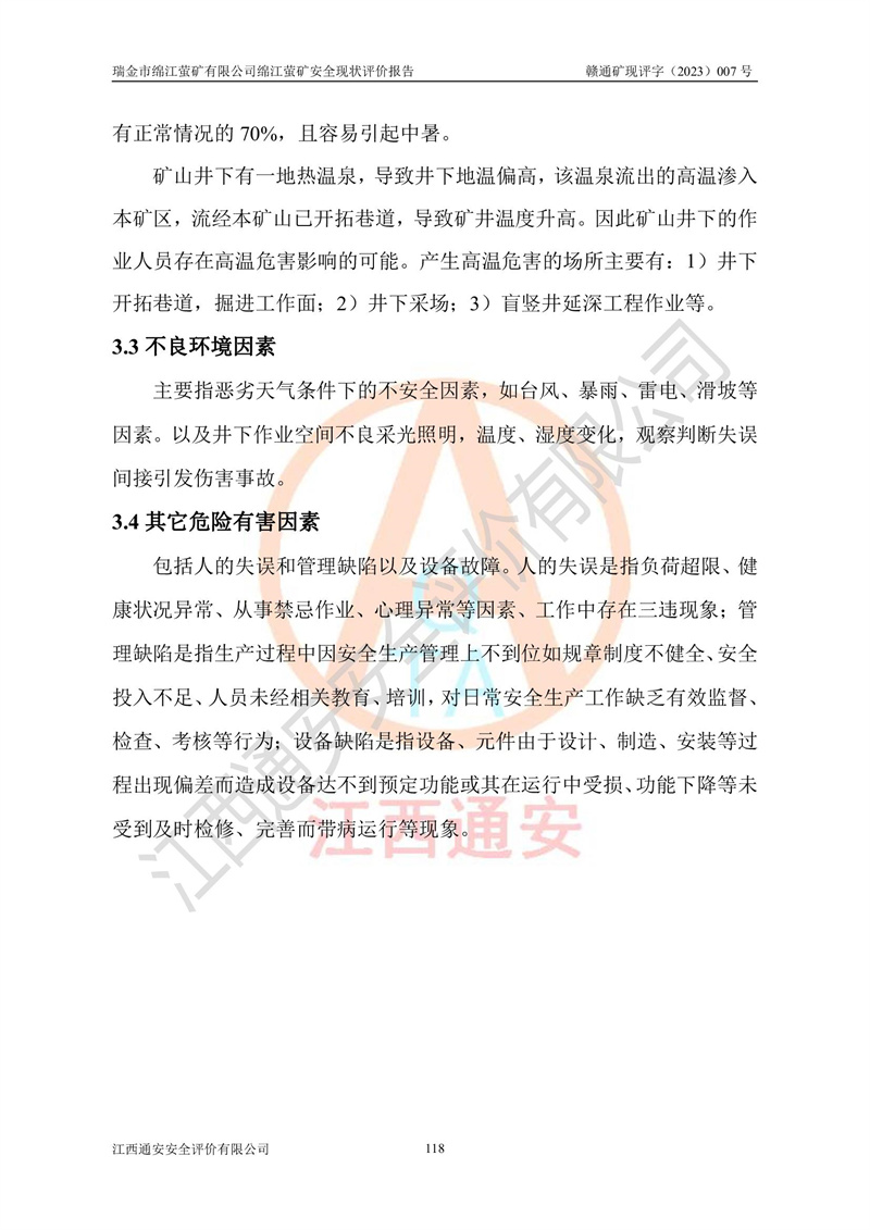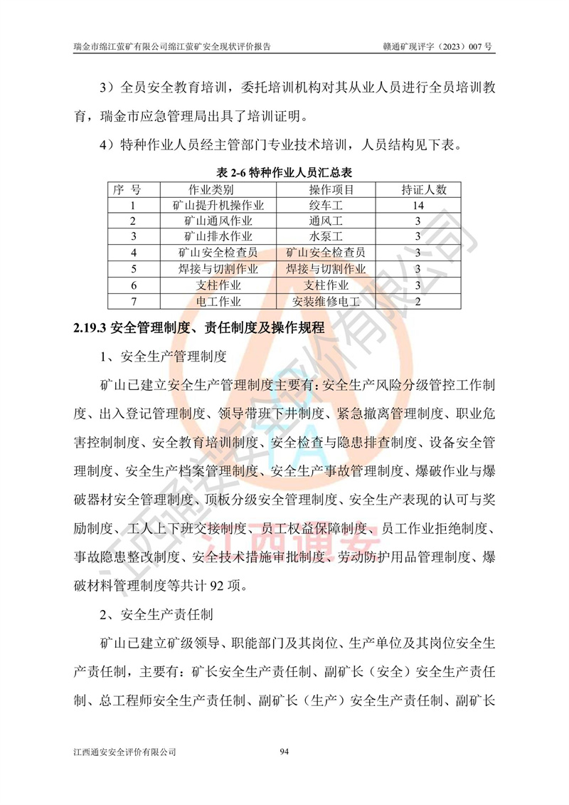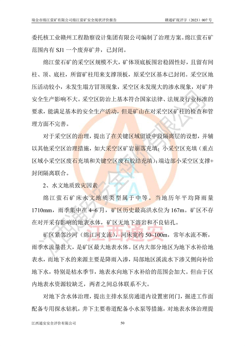 綿江螢礦礦區(qū)位于瑞金市南西210°方向,直線距離約26km,礦區(qū)地理坐標為東徑115°50′54″~115°51′31″,北緯25°38′52″~25°39′34″,行政區(qū)劃隸屬于瑞金市謝坊鎮(zhèn)深塘村管轄。 瑞金市綿江螢礦自1972年始有當?shù)卮迕裥∫?guī)模陸續(xù)開采,1978年收歸瑞金縣謝坊鄉(xiāng)管理,成立謝坊鄉(xiāng)螢石礦,同年收歸縣管改名為瑞金縣螢石礦,再經(jīng)歷多次采礦權人變更后,至2010年礦山由深圳市新星輕質(zhì)合金材料有限公司收購瑞金市綿江螢石礦為其全資子公司,同時成立瑞金市綿江螢礦有限公司為現(xiàn)礦山采礦權人。2021年5月28日,深圳市新星輕質(zhì)合金材料有限公司將其持有的綿江螢礦****股權及派生權益質(zhì)押給瑞金市金鑫礦產(chǎn)品實業(yè)有限公司,采礦權人未變。 礦山于2014年1月20日取得原江西省國土資源廳頒發(fā)的采礦許可證,證號:C3607002009126120050709,采礦權人:瑞金市綿江螢礦有限公司,地址:江西省贛州市瑞金市,礦山名稱:瑞金市綿江螢礦有限公司綿江螢礦,經(jīng)濟類型:私營有限責任公司,開采礦種:螢石(普通),開采方式:地下開采,生產(chǎn)規(guī)模:5.00萬t/a,礦區(qū)面積;0.5053km2,**期限:壹拾貳年自2014年1月20日至2026年1月20日。開采深度由238m至-100m標高,共有8個拐點圈定。 2014年6月,企業(yè)委托江西省煤礦設計院編制了《瑞金市綿江螢礦有限公司綿江螢礦擴建工程初步設計說明書》和《瑞金市綿江螢礦有限公司綿江螢礦擴建工程初步設計說明書安全專篇》。并于2014年6月19日省安監(jiān)局組織專家對《瑞金市綿江螢礦有限公司綿江螢礦擴建工程初步設計說明書安全專篇》進行了評審并原則通過,2014年7月18日由江西省安監(jiān)局下達了《關于瑞金市綿江螢礦有限公司綿江螢礦擴建工程初步設計說明書安全專篇》的審查意見書(贛安監(jiān)非煤項目設審[2014]46號)。礦山擴建工程設計采用豎井+盲豎井聯(lián)合開拓,延深共布置-15m、-45m、-75m、-100m四個中段。采礦方法為淺孔留礦法,通風系統(tǒng)采用中央對角抽出式機械通風,主扇安裝在4#回風斜井井口,礦山生產(chǎn)規(guī)模為5萬t/a,服務年限為10年。 2016年7月,礦山委托江西通安安全評價有限公司編制了《瑞金市綿江螢礦有限公司綿江螢礦地下開采擴建工程安全設施驗收評價報告》。2016年7月31日-8月2日,公司組織有關專家對江西通安安全評價有限公司編制的《瑞金市綿江螢礦有限公司綿江螢礦地下開采擴建工程安全設施驗收評價報告》進行了評審,同時對瑞金市綿江螢礦有限公司綿江螢礦地下開采擴建工程建設項目安全設施進行了現(xiàn)場驗收并原則通過。瑞金市安監(jiān)局依法對驗收過程及結果進行監(jiān)督。 2020年10月12日,礦山取得江西省應急管理換發(fā)的安全生產(chǎn)許可證。編號:(贛)FM安許證字[2005]M0029號,單位名稱:瑞金市綿江螢礦有限公司綿江螢礦地下開采,主要負責人:陳勇,單位地址:江西省瑞金市謝坊鎮(zhèn)深塘村,經(jīng)濟類型:有限責任公司,許可范圍:螢石礦5萬t/a,豎井+盲豎井聯(lián)合開拓,-75m、-100m中段地下開采,**期:2020年10月27日至2023年10月26日。 礦山取得安全生產(chǎn)許可證后,嚴格按照設計回采順序(中段按從上到下的順序開采,同時開采中段數(shù)為一個)要求進行開采,目前礦山-15m、-45m中段已結束回采。礦山現(xiàn)采用豎井+盲豎井聯(lián)合開拓。東區(qū)2#豎井(SJ2)為主豎井,西區(qū)3#豎井(SJ3)為副豎井,XJ4斜井為回風井兼做安全出口。礦山共開拓了+170、+110m、+80m、+65m、+45m、+15m、-15m、-45m、-75m、-100m等十個中段,其中-45m以上中段已回采結束,目前-75m為主要生產(chǎn)中段,-45m為回風中段,-100m為生產(chǎn)開拓中段。-75m中段東、西兩區(qū)運輸巷道已貫通,并已掘三個通風天井連接至-45m中段,東區(qū)-100m中段已掘穿脈、沿脈巷道100m。東、西區(qū)的-45m以上中段均已貫通。東區(qū)+15m中段已開拓2#盲豎井至-100m中段,2#盲豎井連接-15m、-45m、-75m、-100m四個中段。西區(qū)+45m中段已開拓3#盲豎井至-75m中段,3#盲豎井連接+15m、-15m、-45m、-75m四個中段,并計劃按設計延伸至-100m中段。 2019年3月-2020年6月礦山對提升運輸系統(tǒng)設備設施進行了改造,各中段及豎井、盲豎井井口運輸由原無軌膠輪車運輸改為0.5m3U型礦車運輸,各東、西區(qū)豎井及盲豎井均新安裝了BF-0511防墜器,新更換了GLS1/6/1/1罐籠。隨著礦山進行深部開拓,井下需風量及風阻隨之變大,為了滿足礦山通風系統(tǒng)要求,礦山將設計一期工程15kW型號KCZ40-№11主扇風機,更換為二期工程55kW型號KZC40-№13主扇,進一步提高了礦井通風效率。同時將東、西兩區(qū)豎井及盲豎井原JTP-1.2×1.0P絞車更換為JTP-1.6×1.2P型絞車。 為了進一步優(yōu)化礦山提升運輸、排水、供電等系統(tǒng),2022年10月,礦山委托江西省中贛投勘察設計有限公司(原江西省煤礦設計院)編制了《瑞金市綿江螢礦有限公司綿江螢礦地下開采提升運輸、排水、供電優(yōu)化方案設計》。至2023年8月,礦山按優(yōu)化方案完成了改造,并委托江西華安檢測技術服務有限公司對設備設施進行檢測,檢測結果合格。 根據(jù)《安全生產(chǎn)法》、《安全生產(chǎn)許可證條例》等有關法律、法規(guī)的規(guī)定以及《關于做好非煤礦礦山企業(yè)安全生產(chǎn)許可證延期換證工作的通知》的要求,2023年4月,瑞金市綿江