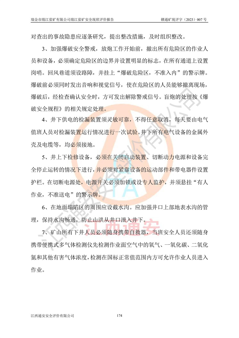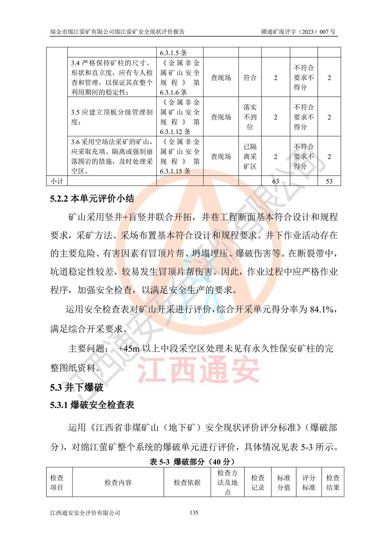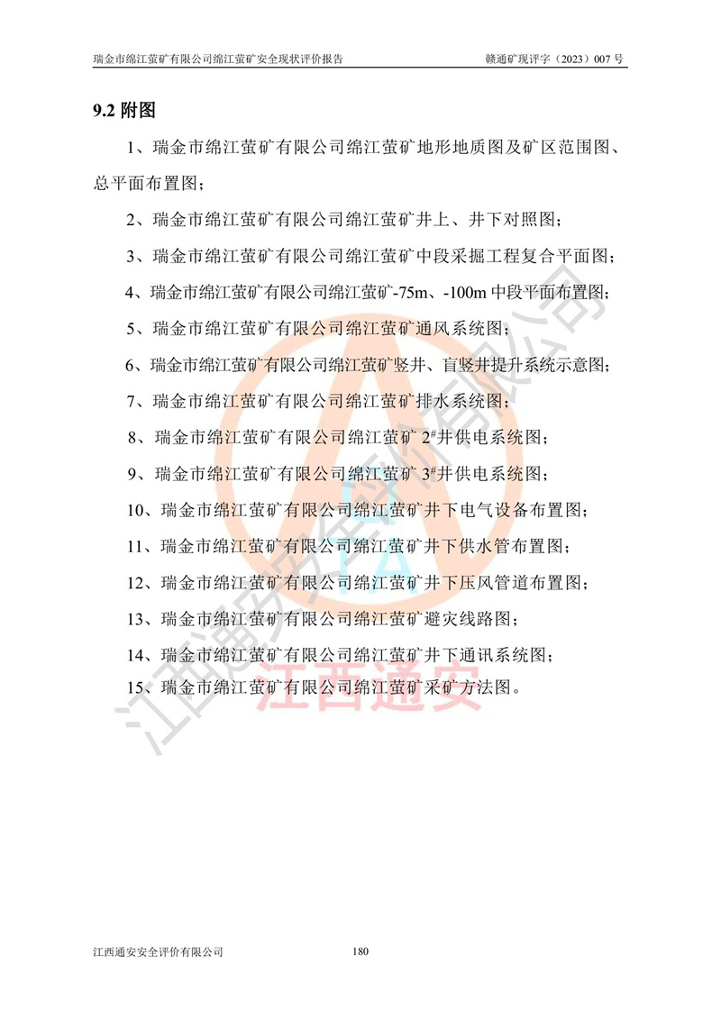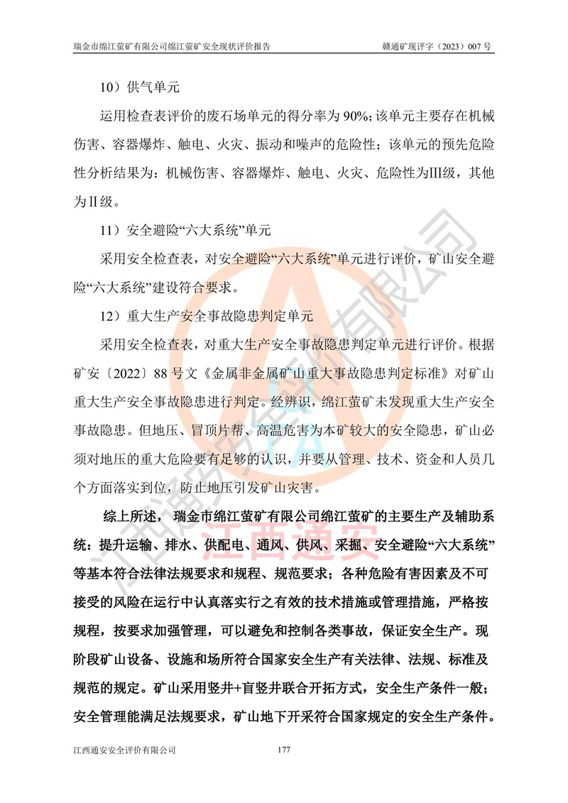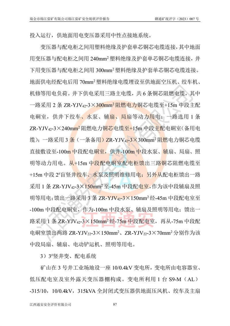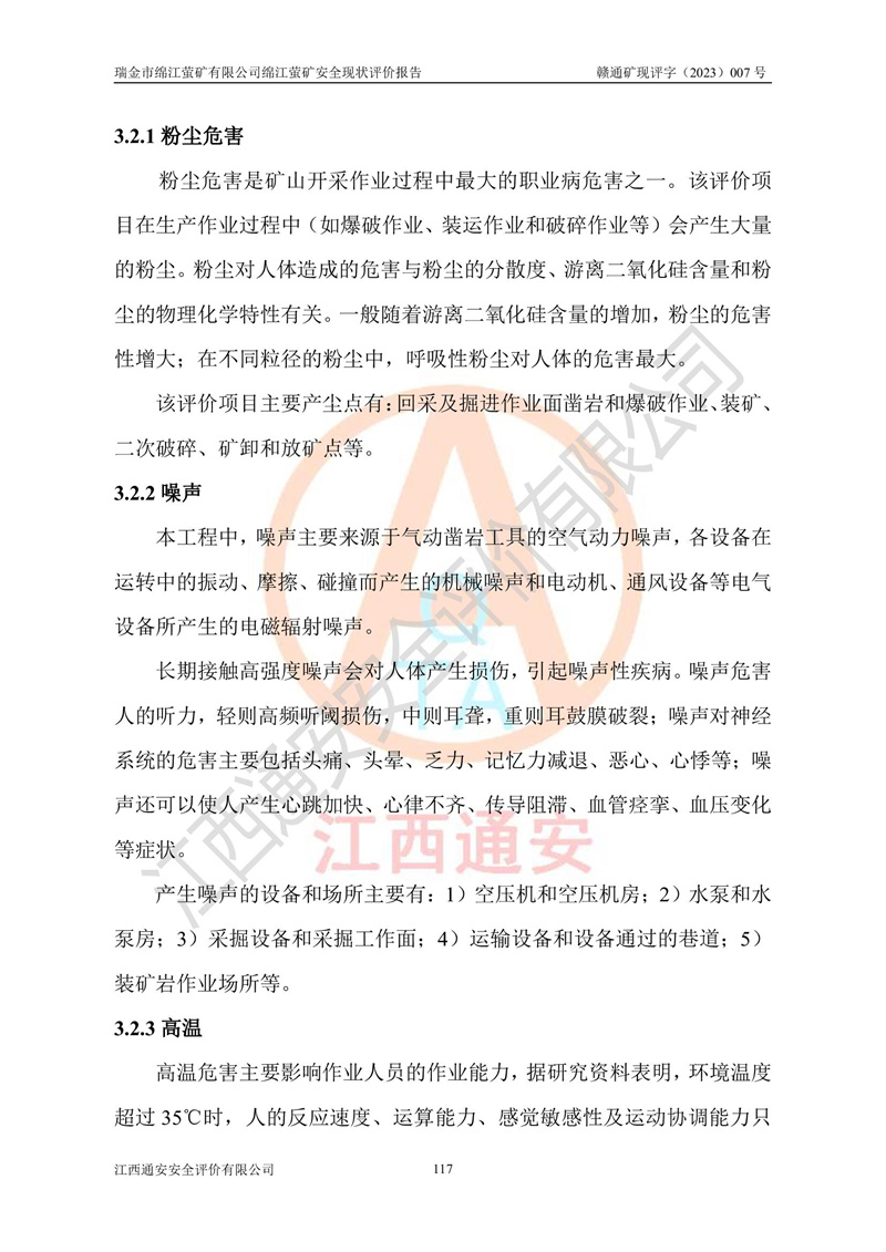 綿江螢礦礦區(qū)位于瑞金市南西210°方向,直線距離約26km,礦區(qū)地理坐標為東徑115°50′54″~115°51′31″,北緯25°38′52″~25°39′34″,行政區(qū)劃隸屬于瑞金市謝坊鎮(zhèn)深塘村管轄。 瑞金市綿江螢礦自1972年始有當?shù)卮迕裥∫?guī)模陸續(xù)開采,1978年收歸瑞金縣謝坊鄉(xiāng)管理,成立謝坊鄉(xiāng)螢石礦,同年收歸縣管改名為瑞金縣螢石礦,再經(jīng)歷多次采礦權人變更后,至2010年礦山由深圳市新星輕質(zhì)合金材料有限公司收購瑞金市綿江螢石礦為其全資子公司,同時成立瑞金市綿江螢礦有限公司為現(xiàn)礦山采礦權人。2021年5月28日,深圳市新星輕質(zhì)合金材料有限公司將其持有的綿江螢礦****股權及派生權益質(zhì)押給瑞金市金鑫礦產(chǎn)品實業(yè)有限公司,采礦權人未變。 礦山于2014年1月20日取得原江西省國土資源廳頒發(fā)的采礦許可證,證號:C3607002009126120050709,采礦權人:瑞金市綿江螢礦有限公司,地址:江西省贛州市瑞金市,礦山名稱:瑞金市綿江螢礦有限公司綿江螢礦,經(jīng)濟類型:私營有限責任公司,開采礦種:螢石(普通),開采方式:地下開采,生產(chǎn)規(guī)模:5.00萬t/a,礦區(qū)面積;0.5053km2,**期限:壹拾貳年自2014年1月20日至2026年1月20日。開采深度由238m至-100m標高,共有8個拐點圈定。 2014年6月,企業(yè)委托江西省煤礦設計院編制了《瑞金市綿江螢礦有限公司綿江螢礦擴建工程初步設計說明書》和《瑞金市綿江螢礦有限公司綿江螢礦擴建工程初步設計說明書安全專篇》。并于2014年6月19日省安監(jiān)局組織專家對《瑞金市綿江螢礦有限公司綿江螢礦擴建工程初步設計說明書安全專篇》進行了評審并原則通過,2014年7月18日由江西省安監(jiān)局下達了《關于瑞金市綿江螢礦有限公司綿江螢礦擴建工程初步設計說明書安全專篇》的審查意見書(贛安監(jiān)非煤項目設審[2014]46號)。礦山擴建工程設計采用豎井+盲豎井聯(lián)合開拓,延深共布置-15m、-45m、-75m、-100m四個中段。采礦方法為淺孔留礦法,通風系統(tǒng)采用中央對角抽出式機械通風,主扇安裝在4#回風斜井井口,礦山生產(chǎn)規(guī)模為5萬t/a,服務年限為10年。 2016年7月,礦山委托江西通安安全評價有限公司編制了《瑞金市綿江螢礦有限公司綿江螢礦地下開采擴建工程安全設施驗收評價報告》。2016年7月31日-8月2日,公司組織有關專家對江西通安安全評價有限公司編制的《瑞金市綿江螢礦有限公司綿江螢礦地下開采擴建工程安全設施驗收評價報告》進行了評審,同時對瑞金市綿江螢礦有限公司綿江螢礦地下開采擴建工程建設項目安全設施進行了現(xiàn)場驗收并原則通過。瑞金市安監(jiān)局依法對驗收過程及結果進行監(jiān)督。 2020年10月12日,礦山取得江西省應急管理換發(fā)的安全生產(chǎn)許可證。編號:(贛)FM安許證字[2005]M0029號,單位名稱:瑞金市綿江螢礦有限公司綿江螢礦地下開采,主要負責人:陳勇,單位地址:江西省瑞金市謝坊鎮(zhèn)深塘村,經(jīng)濟類型:有限責任公司,許可范圍:螢石礦5萬t/a,豎井+盲豎井聯(lián)合開拓,-75m、-100m中段地下開采,**期:2020年10月27日至2023年10月26日。 礦山取得安全生產(chǎn)許可證后,嚴格按照設計回采順序(中段按從上到下的順序開采,同時開采中段數(shù)為一個)要求進行開采,目前礦山-15m、-45m中段已結束回采。礦山現(xiàn)采用豎井+盲豎井聯(lián)合開拓。東區(qū)2#豎井(SJ2)為主豎井,西區(qū)3#豎井(SJ3)為副豎井,XJ4斜井為回風井兼做安全出口。礦山共開拓了+170、+110m、+80m、+65m、+45m、+15m、-15m、-45m、-75m、-100m等十個中段,其中-45m以上中段已回采結束,目前-75m為主要生產(chǎn)中段,-45m為回風中段,-100m為生產(chǎn)開拓中段。-75m中段東、西兩區(qū)運輸巷道已貫通,并已掘三個通風天井連接至-45m中段,東區(qū)-100m中段已掘穿脈、沿脈巷道100m。東、西區(qū)的-45m以上中段均已貫通。東區(qū)+15m中段已開拓2#盲豎井至-100m中段,2#盲豎井連接-15m、-45m、-75m、-100m四個中段。西區(qū)+45m中段已開拓3#盲豎井至-75m中段,3#盲豎井連接+15m、-15m、-45m、-75m四個中段,并計劃按設計延伸至-100m中段。 2019年3月-2020年6月礦山對提升運輸系統(tǒng)設備設施進行了改造,各中段及豎井、盲豎井井口運輸由原無軌膠輪車運輸改為0.5m3U型礦車運輸,各東、西區(qū)豎井及盲豎井均新安裝了BF-0511防墜器,新更換了GLS1/6/1/1罐籠。隨著礦山進行深部開拓,井下需風量及風阻隨之變大,為了滿足礦山通風系統(tǒng)要求,礦山將設計一期工程15kW型號KCZ40-№11主扇風機,更換為二期工程55kW型號KZC40-№13主扇,進一步提高了礦井通風效率。同時將東、西兩區(qū)豎井及盲豎井原JTP-1.2×1.0P絞車更換為JTP-1.6×1.2P型絞車。 為了進一步優(yōu)化礦山提升運輸、排水、供電等系統(tǒng),2022年10月,礦山委托江西省中贛投勘察設計有限公司(原江西省煤礦設計院)編制了《瑞金市綿江螢礦有限公司綿江螢礦地下開采提升運輸、排水、供電優(yōu)化方案設計》。至2023年8月,礦山按優(yōu)化方案完成了改造,并委托江西華安檢測技術服務有限公司對設備設施進行檢測,檢測結果合格。 根據(jù)《安全生產(chǎn)法》、《安全生產(chǎn)許可證條例》等有關法律、法規(guī)的規(guī)定以及《關于做好非煤礦礦山企業(yè)安全生產(chǎn)許可證延期換證工作的通知》的要求,2023年4月,瑞金市綿江