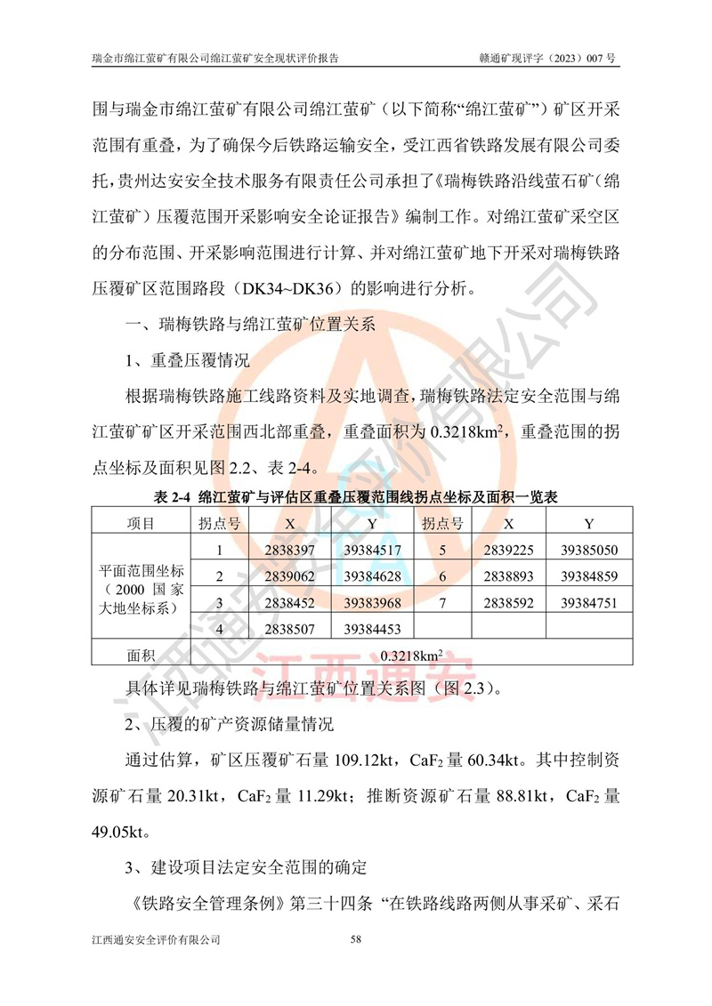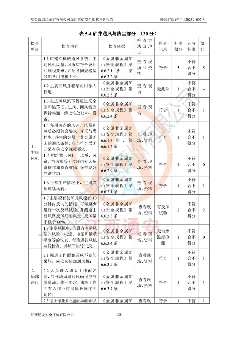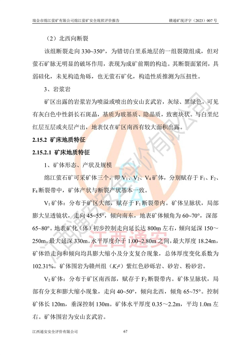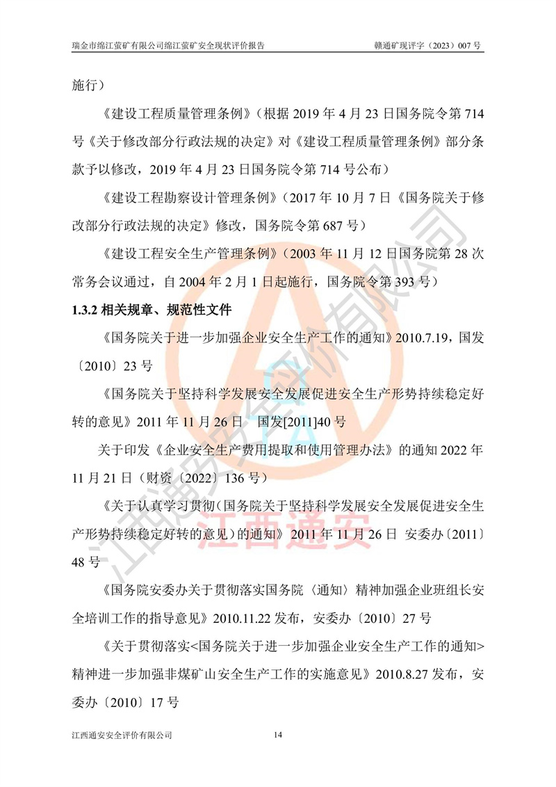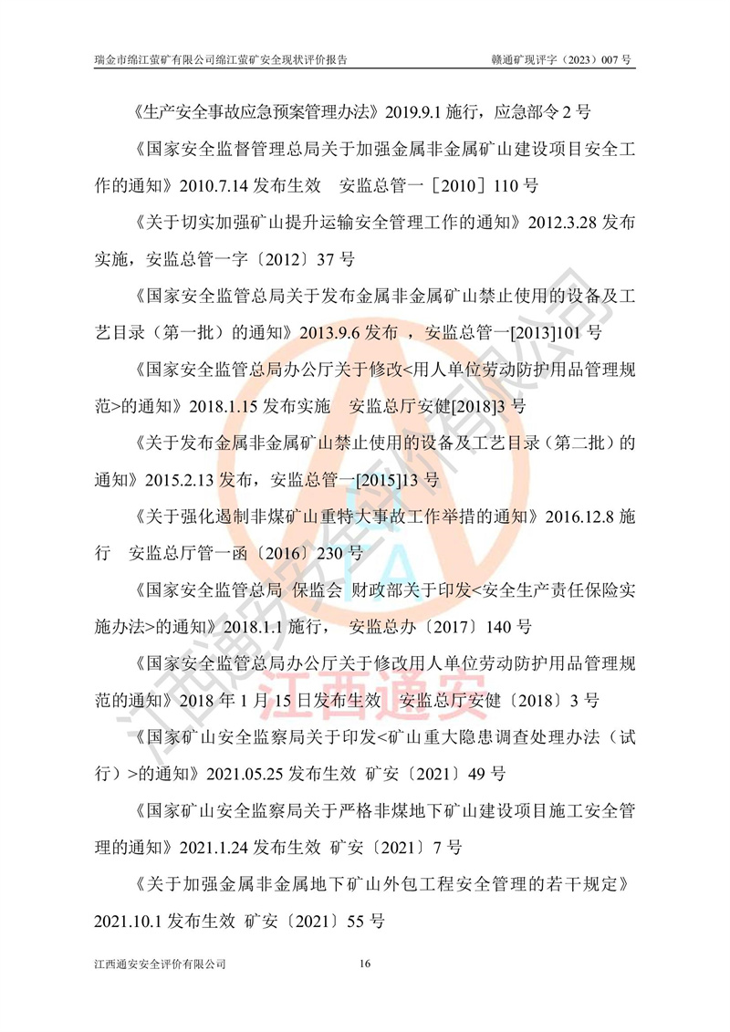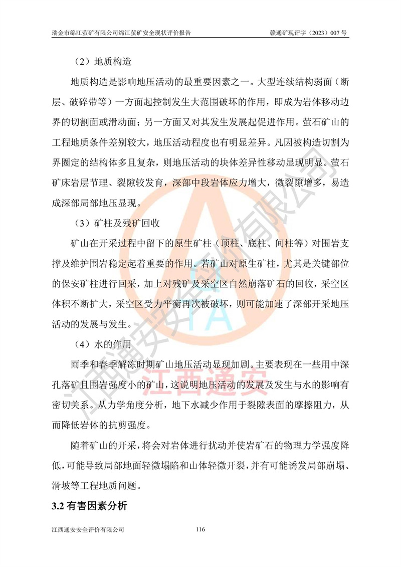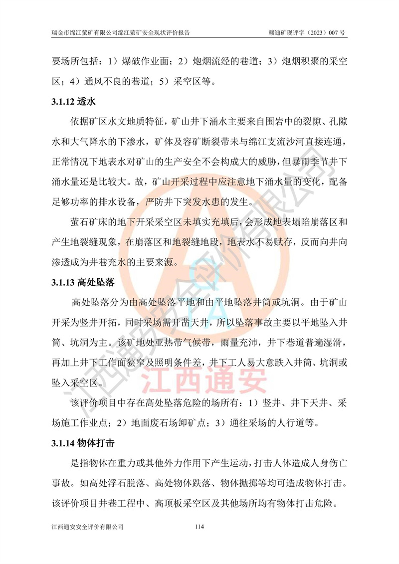 綿江螢礦礦區(qū)位于瑞金市南西210°方向,直線距離約26km,礦區(qū)地理坐標為東徑115°50′54″~115°51′31″,北緯25°38′52″~25°39′34″,行政區(qū)劃隸屬于瑞金市謝坊鎮(zhèn)深塘村管轄。 瑞金市綿江螢礦自1972年始有當?shù)卮迕裥∫?guī)模陸續(xù)開采,1978年收歸瑞金縣謝坊鄉(xiāng)管理,成立謝坊鄉(xiāng)螢石礦,同年收歸縣管改名為瑞金縣螢石礦,再經(jīng)歷多次采礦權人變更后,至2010年礦山由深圳市新星輕質(zhì)合金材料有限公司收購瑞金市綿江螢石礦為其全資子公司,同時成立瑞金市綿江螢礦有限公司為現(xiàn)礦山采礦權人。2021年5月28日,深圳市新星輕質(zhì)合金材料有限公司將其持有的綿江螢礦****股權及派生權益質(zhì)押給瑞金市金鑫礦產(chǎn)品實業(yè)有限公司,采礦權人未變。 礦山于2014年1月20日取得原江西省國土資源廳頒發(fā)的采礦許可證,證號:C3607002009126120050709,采礦權人:瑞金市綿江螢礦有限公司,地址:江西省贛州市瑞金市,礦山名稱:瑞金市綿江螢礦有限公司綿江螢礦,經(jīng)濟類型:私營有限責任公司,開采礦種:螢石(普通),開采方式:地下開采,生產(chǎn)規(guī)模:5.00萬t/a,礦區(qū)面積;0.5053km2,**期限:壹拾貳年自2014年1月20日至2026年1月20日。開采深度由238m至-100m標高,共有8個拐點圈定。 2014年6月,企業(yè)委托江西省煤礦設計院編制了《瑞金市綿江螢礦有限公司綿江螢礦擴建工程初步設計說明書》和《瑞金市綿江螢礦有限公司綿江螢礦擴建工程初步設計說明書安全專篇》。并于2014年6月19日省安監(jiān)局組織專家對《瑞金市綿江螢礦有限公司綿江螢礦擴建工程初步設計說明書安全專篇》進行了評審并原則通過,2014年7月18日由江西省安監(jiān)局下達了《關于瑞金市綿江螢礦有限公司綿江螢礦擴建工程初步設計說明書安全專篇》的審查意見書(贛安監(jiān)非煤項目設審[2014]46號)。礦山擴建工程設計采用豎井+盲豎井聯(lián)合開拓,延深共布置-15m、-45m、-75m、-100m四個中段。采礦方法為淺孔留礦法,通風系統(tǒng)采用中央對角抽出式機械通風,主扇安裝在4#回風斜井井口,礦山生產(chǎn)規(guī)模為5萬t/a,服務年限為10年。 2016年7月,礦山委托江西通安安全評價有限公司編制了《瑞金市綿江螢礦有限公司綿江螢礦地下開采擴建工程安全設施驗收評價報告》。2016年7月31日-8月2日,公司組織有關專家對江西通安安全評價有限公司編制的《瑞金市綿江螢礦有限公司綿江螢礦地下開采擴建工程安全設施驗收評價報告》進行了評審,同時對瑞金市綿江螢礦有限公司綿江螢礦地下開采擴建工程建設項目安全設施進行了現(xiàn)場驗收并原則通過。瑞金市安監(jiān)局依法對驗收過程及結果進行監(jiān)督。 2020年10月12日,礦山取得江西省應急管理換發(fā)的安全生產(chǎn)許可證。編號:(贛)FM安許證字[2005]M0029號,單位名稱:瑞金市綿江螢礦有限公司綿江螢礦地下開采,主要負責人:陳勇,單位地址:江西省瑞金市謝坊鎮(zhèn)深塘村,經(jīng)濟類型:有限責任公司,許可范圍:螢石礦5萬t/a,豎井+盲豎井聯(lián)合開拓,-75m、-100m中段地下開采,**期:2020年10月27日至2023年10月26日。 礦山取得安全生產(chǎn)許可證后,嚴格按照設計回采順序(中段按從上到下的順序開采,同時開采中段數(shù)為一個)要求進行開采,目前礦山-15m、-45m中段已結束回采。礦山現(xiàn)采用豎井+盲豎井聯(lián)合開拓。東區(qū)2#豎井(SJ2)為主豎井,西區(qū)3#豎井(SJ3)為副豎井,XJ4斜井為回風井兼做安全出口。礦山共開拓了+170、+110m、+80m、+65m、+45m、+15m、-15m、-45m、-75m、-100m等十個中段,其中-45m以上中段已回采結束,目前-75m為主要生產(chǎn)中段,-45m為回風中段,-100m為生產(chǎn)開拓中段。-75m中段東、西兩區(qū)運輸巷道已貫通,并已掘三個通風天井連接至-45m中段,東區(qū)-100m中段已掘穿脈、沿脈巷道100m。東、西區(qū)的-45m以上中段均已貫通。東區(qū)+15m中段已開拓2#盲豎井至-100m中段,2#盲豎井連接-15m、-45m、-75m、-100m四個中段。西區(qū)+45m中段已開拓3#盲豎井至-75m中段,3#盲豎井連接+15m、-15m、-45m、-75m四個中段,并計劃按設計延伸至-100m中段。 2019年3月-2020年6月礦山對提升運輸系統(tǒng)設備設施進行了改造,各中段及豎井、盲豎井井口運輸由原無軌膠輪車運輸改為0.5m3U型礦車運輸,各東、西區(qū)豎井及盲豎井均新安裝了BF-0511防墜器,新更換了GLS1/6/1/1罐籠。隨著礦山進行深部開拓,井下需風量及風阻隨之變大,為了滿足礦山通風系統(tǒng)要求,礦山將設計一期工程15kW型號KCZ40-№11主扇風機,更換為二期工程55kW型號KZC40-№13主扇,進一步提高了礦井通風效率。同時將東、西兩區(qū)豎井及盲豎井原JTP-1.2×1.0P絞車更換為JTP-1.6×1.2P型絞車。 為了進一步優(yōu)化礦山提升運輸、排水、供電等系統(tǒng),2022年10月,礦山委托江西省中贛投勘察設計有限公司(原江西省煤礦設計院)編制了《瑞金市綿江螢礦有限公司綿江螢礦地下開采提升運輸、排水、供電優(yōu)化方案設計》。至2023年8月,礦山按優(yōu)化方案完成了改造,并委托江西華安檢測技術服務有限公司對設備設施進行檢測,檢測結果合格。 根據(jù)《安全生產(chǎn)法》、《安全生產(chǎn)許可證條例》等有關法律、法規(guī)的規(guī)定以及《關于做好非煤礦礦山企業(yè)安全生產(chǎn)許可證延期換證工作的通知》的要求,2023年4月,瑞金市綿江