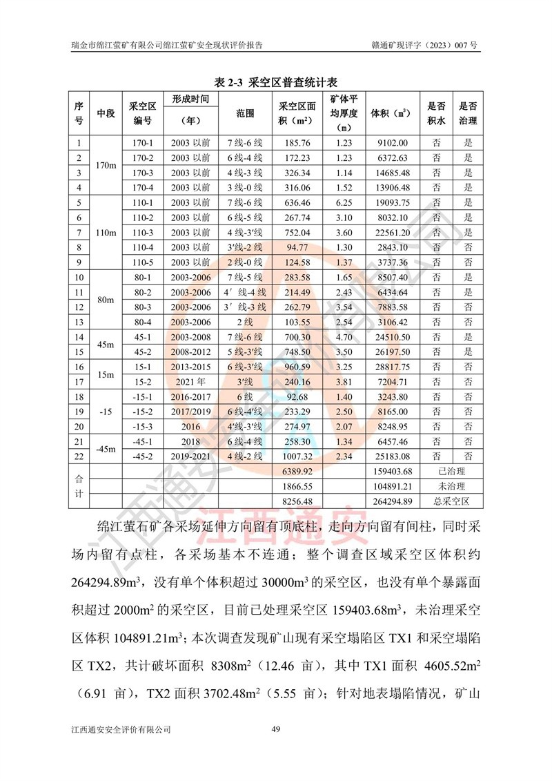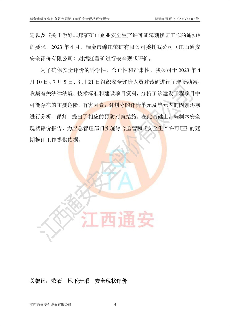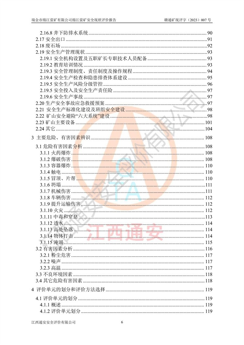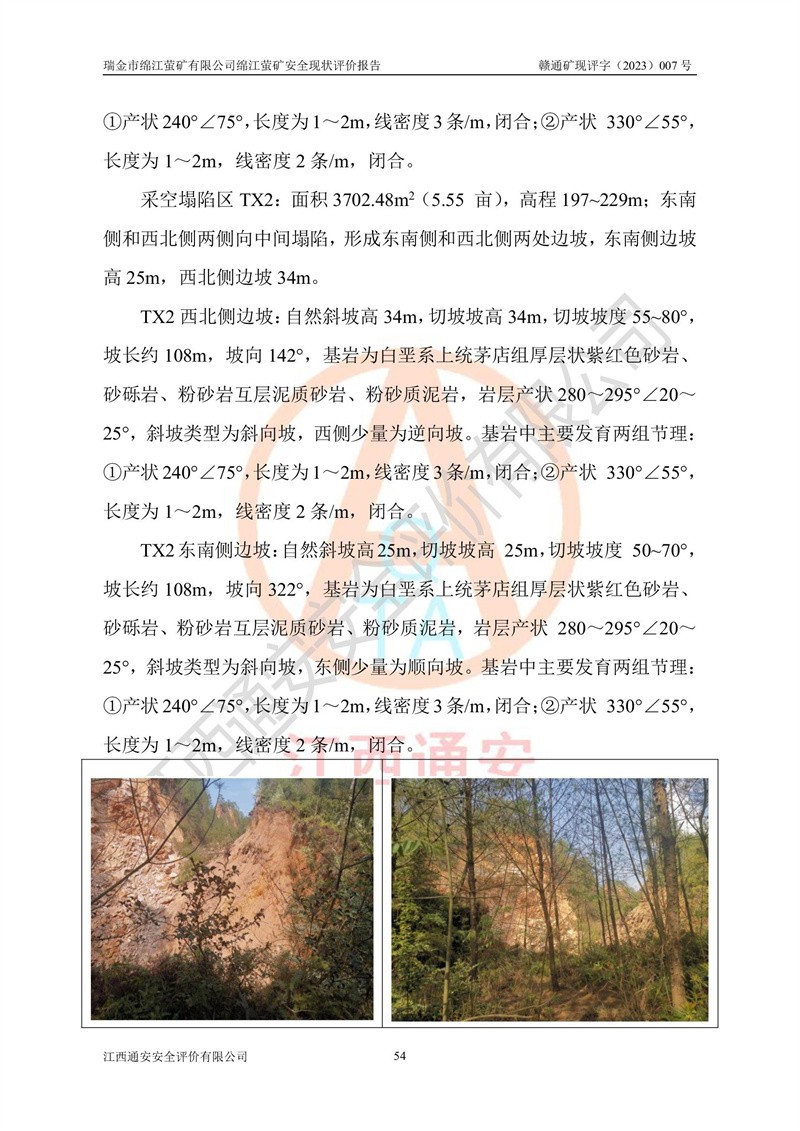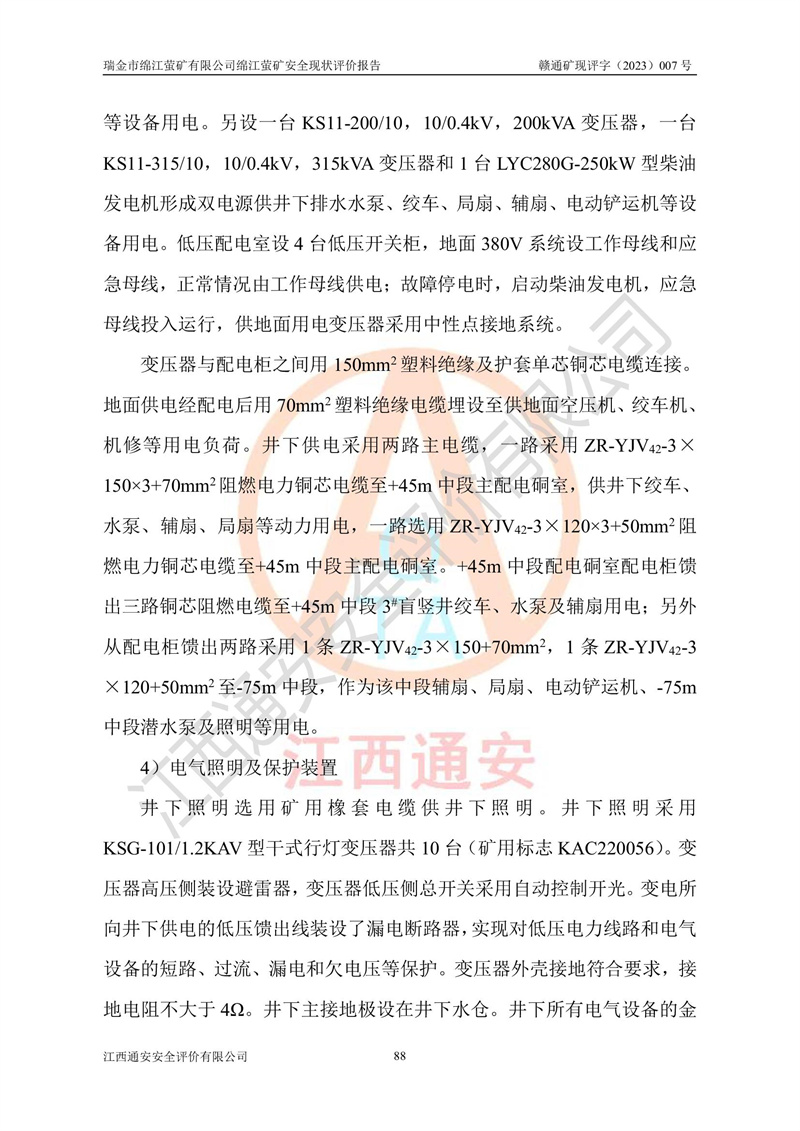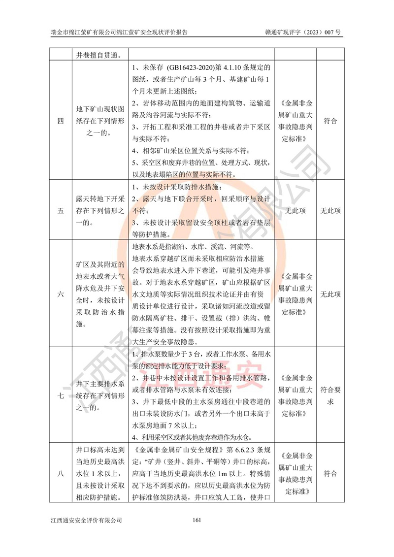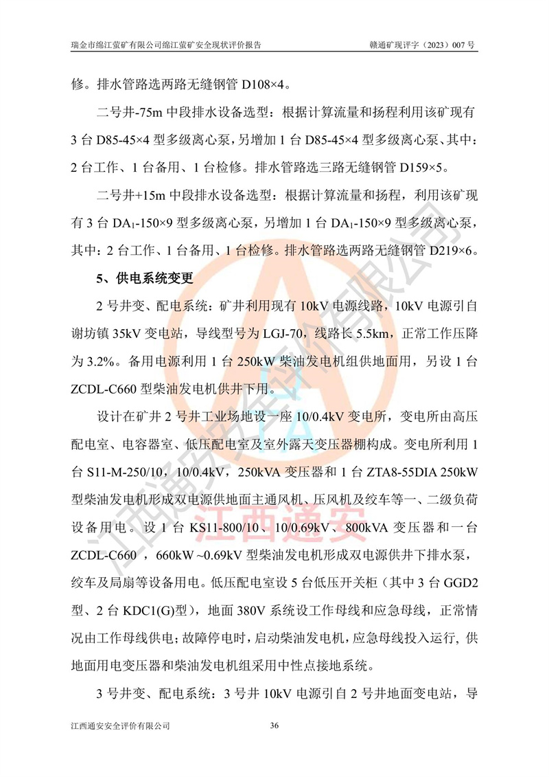 綿江螢礦礦區(qū)位于瑞金市南西210°方向,直線距離約26km,礦區(qū)地理坐標為東徑115°50′54″~115°51′31″,北緯25°38′52″~25°39′34″,行政區(qū)劃隸屬于瑞金市謝坊鎮(zhèn)深塘村管轄。 瑞金市綿江螢礦自1972年始有當?shù)卮迕裥∫?guī)模陸續(xù)開采,1978年收歸瑞金縣謝坊鄉(xiāng)管理,成立謝坊鄉(xiāng)螢石礦,同年收歸縣管改名為瑞金縣螢石礦,再經(jīng)歷多次采礦權人變更后,至2010年礦山由深圳市新星輕質(zhì)合金材料有限公司收購瑞金市綿江螢石礦為其全資子公司,同時成立瑞金市綿江螢礦有限公司為現(xiàn)礦山采礦權人。2021年5月28日,深圳市新星輕質(zhì)合金材料有限公司將其持有的綿江螢礦****股權及派生權益質(zhì)押給瑞金市金鑫礦產(chǎn)品實業(yè)有限公司,采礦權人未變。 礦山于2014年1月20日取得原江西省國土資源廳頒發(fā)的采礦許可證,證號:C3607002009126120050709,采礦權人:瑞金市綿江螢礦有限公司,地址:江西省贛州市瑞金市,礦山名稱:瑞金市綿江螢礦有限公司綿江螢礦,經(jīng)濟類型:私營有限責任公司,開采礦種:螢石(普通),開采方式:地下開采,生產(chǎn)規(guī)模:5.00萬t/a,礦區(qū)面積;0.5053km2,**期限:壹拾貳年自2014年1月20日至2026年1月20日。開采深度由238m至-100m標高,共有8個拐點圈定。 2014年6月,企業(yè)委托江西省煤礦設計院編制了《瑞金市綿江螢礦有限公司綿江螢礦擴建工程初步設計說明書》和《瑞金市綿江螢礦有限公司綿江螢礦擴建工程初步設計說明書安全專篇》。并于2014年6月19日省安監(jiān)局組織專家對《瑞金市綿江螢礦有限公司綿江螢礦擴建工程初步設計說明書安全專篇》進行了評審并原則通過,2014年7月18日由江西省安監(jiān)局下達了《關于瑞金市綿江螢礦有限公司綿江螢礦擴建工程初步設計說明書安全專篇》的審查意見書(贛安監(jiān)非煤項目設審[2014]46號)。礦山擴建工程設計采用豎井+盲豎井聯(lián)合開拓,延深共布置-15m、-45m、-75m、-100m四個中段。采礦方法為淺孔留礦法,通風系統(tǒng)采用中央對角抽出式機械通風,主扇安裝在4#回風斜井井口,礦山生產(chǎn)規(guī)模為5萬t/a,服務年限為10年。 2016年7月,礦山委托江西通安安全評價有限公司編制了《瑞金市綿江螢礦有限公司綿江螢礦地下開采擴建工程安全設施驗收評價報告》。2016年7月31日-8月2日,公司組織有關專家對江西通安安全評價有限公司編制的《瑞金市綿江螢礦有限公司綿江螢礦地下開采擴建工程安全設施驗收評價報告》進行了評審,同時對瑞金市綿江螢礦有限公司綿江螢礦地下開采擴建工程建設項目安全設施進行了現(xiàn)場驗收并原則通過。瑞金市安監(jiān)局依法對驗收過程及結果進行監(jiān)督。 2020年10月12日,礦山取得江西省應急管理換發(fā)的安全生產(chǎn)許可證。編號:(贛)FM安許證字[2005]M0029號,單位名稱:瑞金市綿江螢礦有限公司綿江螢礦地下開采,主要負責人:陳勇,單位地址:江西省瑞金市謝坊鎮(zhèn)深塘村,經(jīng)濟類型:有限責任公司,許可范圍:螢石礦5萬t/a,豎井+盲豎井聯(lián)合開拓,-75m、-100m中段地下開采,**期:2020年10月27日至2023年10月26日。 礦山取得安全生產(chǎn)許可證后,嚴格按照設計回采順序(中段按從上到下的順序開采,同時開采中段數(shù)為一個)要求進行開采,目前礦山-15m、-45m中段已結束回采。礦山現(xiàn)采用豎井+盲豎井聯(lián)合開拓。東區(qū)2#豎井(SJ2)為主豎井,西區(qū)3#豎井(SJ3)為副豎井,XJ4斜井為回風井兼做安全出口。礦山共開拓了+170、+110m、+80m、+65m、+45m、+15m、-15m、-45m、-75m、-100m等十個中段,其中-45m以上中段已回采結束,目前-75m為主要生產(chǎn)中段,-45m為回風中段,-100m為生產(chǎn)開拓中段。-75m中段東、西兩區(qū)運輸巷道已貫通,并已掘三個通風天井連接至-45m中段,東區(qū)-100m中段已掘穿脈、沿脈巷道100m。東、西區(qū)的-45m以上中段均已貫通。東區(qū)+15m中段已開拓2#盲豎井至-100m中段,2#盲豎井連接-15m、-45m、-75m、-100m四個中段。西區(qū)+45m中段已開拓3#盲豎井至-75m中段,3#盲豎井連接+15m、-15m、-45m、-75m四個中段,并計劃按設計延伸至-100m中段。 2019年3月-2020年6月礦山對提升運輸系統(tǒng)設備設施進行了改造,各中段及豎井、盲豎井井口運輸由原無軌膠輪車運輸改為0.5m3U型礦車運輸,各東、西區(qū)豎井及盲豎井均新安裝了BF-0511防墜器,新更換了GLS1/6/1/1罐籠。隨著礦山進行深部開拓,井下需風量及風阻隨之變大,為了滿足礦山通風系統(tǒng)要求,礦山將設計一期工程15kW型號KCZ40-№11主扇風機,更換為二期工程55kW型號KZC40-№13主扇,進一步提高了礦井通風效率。同時將東、西兩區(qū)豎井及盲豎井原JTP-1.2×1.0P絞車更換為JTP-1.6×1.2P型絞車。 為了進一步優(yōu)化礦山提升運輸、排水、供電等系統(tǒng),2022年10月,礦山委托江西省中贛投勘察設計有限公司(原江西省煤礦設計院)編制了《瑞金市綿江螢礦有限公司綿江螢礦地下開采提升運輸、排水、供電優(yōu)化方案設計》。至2023年8月,礦山按優(yōu)化方案完成了改造,并委托江西華安檢測技術服務有限公司對設備設施進行檢測,檢測結果合格。 根據(jù)《安全生產(chǎn)法》、《安全生產(chǎn)許可證條例》等有關法律、法規(guī)的規(guī)定以及《關于做好非煤礦礦山企業(yè)安全生產(chǎn)許可證延期換證工作的通知》的要求,2023年4月,瑞金市綿江