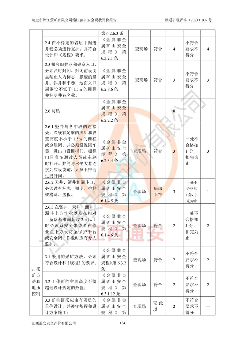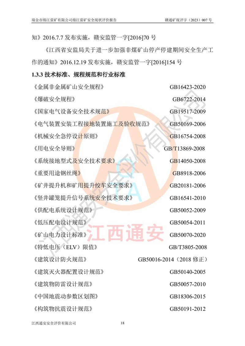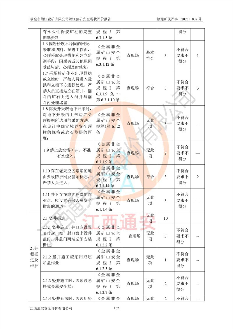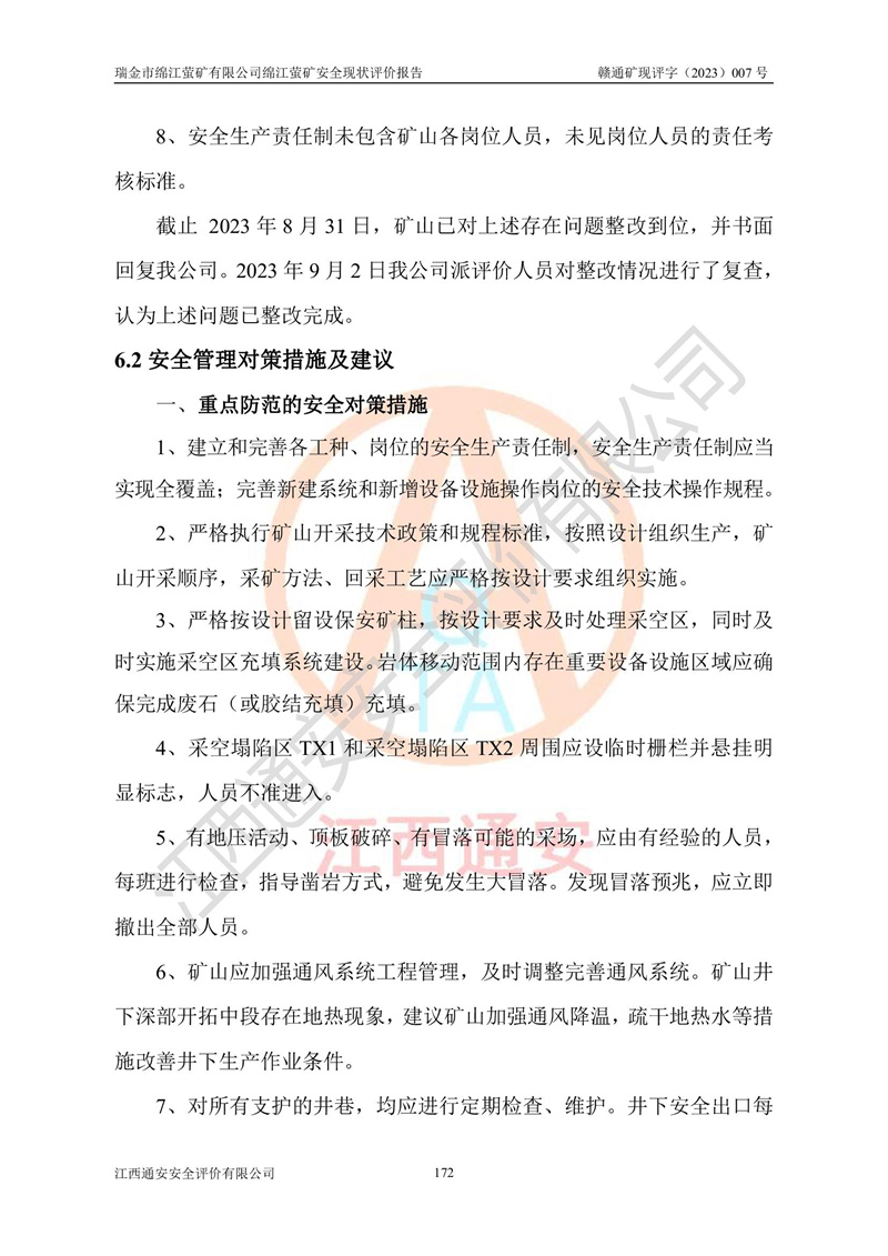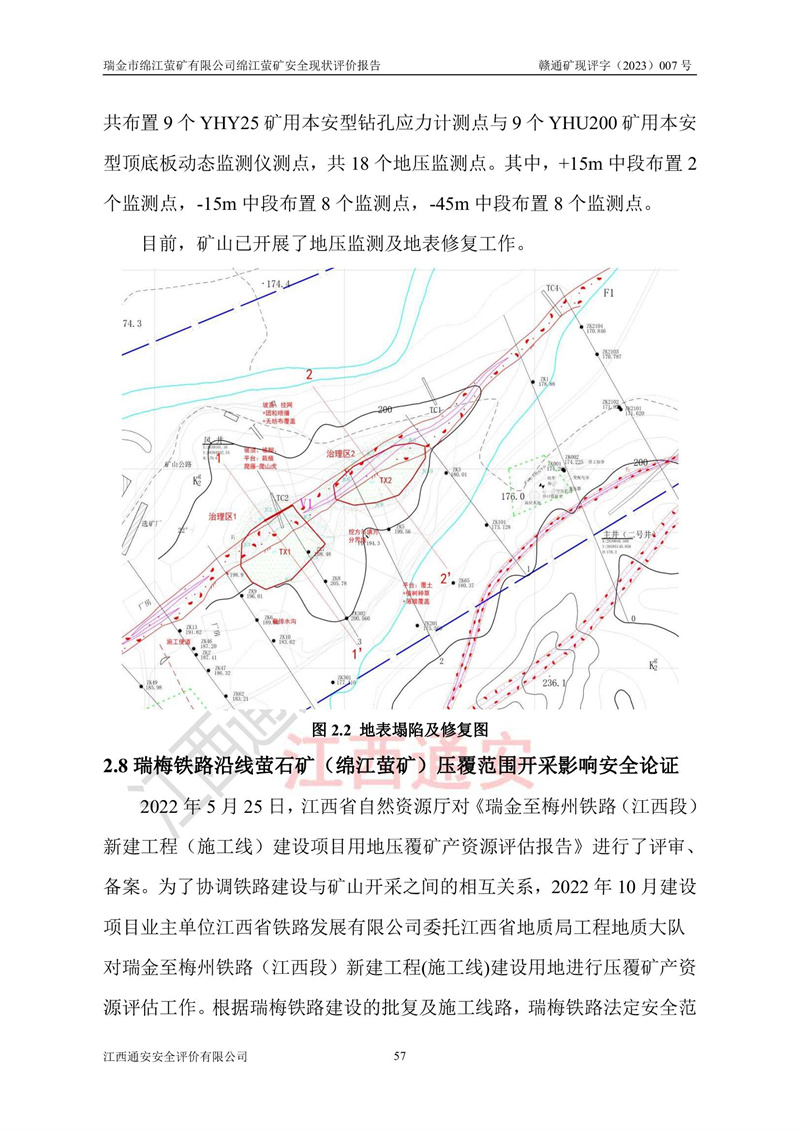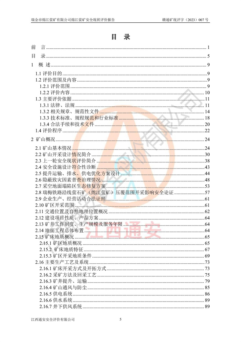 綿江螢礦礦區(qū)位于瑞金市南西210°方向,直線距離約26km,礦區(qū)地理坐標為東徑115°50′54″~115°51′31″,北緯25°38′52″~25°39′34″,行政區(qū)劃隸屬于瑞金市謝坊鎮(zhèn)深塘村管轄。 瑞金市綿江螢礦自1972年始有當?shù)卮迕裥∫?guī)模陸續(xù)開采,1978年收歸瑞金縣謝坊鄉(xiāng)管理,成立謝坊鄉(xiāng)螢石礦,同年收歸縣管改名為瑞金縣螢石礦,再經(jīng)歷多次采礦權人變更后,至2010年礦山由深圳市新星輕質(zhì)合金材料有限公司收購瑞金市綿江螢石礦為其全資子公司,同時成立瑞金市綿江螢礦有限公司為現(xiàn)礦山采礦權人。2021年5月28日,深圳市新星輕質(zhì)合金材料有限公司將其持有的綿江螢礦****股權及派生權益質(zhì)押給瑞金市金鑫礦產(chǎn)品實業(yè)有限公司,采礦權人未變。 礦山于2014年1月20日取得原江西省國土資源廳頒發(fā)的采礦許可證,證號:C3607002009126120050709,采礦權人:瑞金市綿江螢礦有限公司,地址:江西省贛州市瑞金市,礦山名稱:瑞金市綿江螢礦有限公司綿江螢礦,經(jīng)濟類型:私營有限責任公司,開采礦種:螢石(普通),開采方式:地下開采,生產(chǎn)規(guī)模:5.00萬t/a,礦區(qū)面積;0.5053km2,**期限:壹拾貳年自2014年1月20日至2026年1月20日。開采深度由238m至-100m標高,共有8個拐點圈定。 2014年6月,企業(yè)委托江西省煤礦設計院編制了《瑞金市綿江螢礦有限公司綿江螢礦擴建工程初步設計說明書》和《瑞金市綿江螢礦有限公司綿江螢礦擴建工程初步設計說明書安全專篇》。并于2014年6月19日省安監(jiān)局組織專家對《瑞金市綿江螢礦有限公司綿江螢礦擴建工程初步設計說明書安全專篇》進行了評審并原則通過,2014年7月18日由江西省安監(jiān)局下達了《關于瑞金市綿江螢礦有限公司綿江螢礦擴建工程初步設計說明書安全專篇》的審查意見書(贛安監(jiān)非煤項目設審[2014]46號)。礦山擴建工程設計采用豎井+盲豎井聯(lián)合開拓,延深共布置-15m、-45m、-75m、-100m四個中段。采礦方法為淺孔留礦法,通風系統(tǒng)采用中央對角抽出式機械通風,主扇安裝在4#回風斜井井口,礦山生產(chǎn)規(guī)模為5萬t/a,服務年限為10年。 2016年7月,礦山委托江西通安安全評價有限公司編制了《瑞金市綿江螢礦有限公司綿江螢礦地下開采擴建工程安全設施驗收評價報告》。2016年7月31日-8月2日,公司組織有關專家對江西通安安全評價有限公司編制的《瑞金市綿江螢礦有限公司綿江螢礦地下開采擴建工程安全設施驗收評價報告》進行了評審,同時對瑞金市綿江螢礦有限公司綿江螢礦地下開采擴建工程建設項目安全設施進行了現(xiàn)場驗收并原則通過。瑞金市安監(jiān)局依法對驗收過程及結果進行監(jiān)督。 2020年10月12日,礦山取得江西省應急管理換發(fā)的安全生產(chǎn)許可證。編號:(贛)FM安許證字[2005]M0029號,單位名稱:瑞金市綿江螢礦有限公司綿江螢礦地下開采,主要負責人:陳勇,單位地址:江西省瑞金市謝坊鎮(zhèn)深塘村,經(jīng)濟類型:有限責任公司,許可范圍:螢石礦5萬t/a,豎井+盲豎井聯(lián)合開拓,-75m、-100m中段地下開采,**期:2020年10月27日至2023年10月26日。 礦山取得安全生產(chǎn)許可證后,嚴格按照設計回采順序(中段按從上到下的順序開采,同時開采中段數(shù)為一個)要求進行開采,目前礦山-15m、-45m中段已結束回采。礦山現(xiàn)采用豎井+盲豎井聯(lián)合開拓。東區(qū)2#豎井(SJ2)為主豎井,西區(qū)3#豎井(SJ3)為副豎井,XJ4斜井為回風井兼做安全出口。礦山共開拓了+170、+110m、+80m、+65m、+45m、+15m、-15m、-45m、-75m、-100m等十個中段,其中-45m以上中段已回采結束,目前-75m為主要生產(chǎn)中段,-45m為回風中段,-100m為生產(chǎn)開拓中段。-75m中段東、西兩區(qū)運輸巷道已貫通,并已掘三個通風天井連接至-45m中段,東區(qū)-100m中段已掘穿脈、沿脈巷道100m。東、西區(qū)的-45m以上中段均已貫通。東區(qū)+15m中段已開拓2#盲豎井至-100m中段,2#盲豎井連接-15m、-45m、-75m、-100m四個中段。西區(qū)+45m中段已開拓3#盲豎井至-75m中段,3#盲豎井連接+15m、-15m、-45m、-75m四個中段,并計劃按設計延伸至-100m中段。 2019年3月-2020年6月礦山對提升運輸系統(tǒng)設備設施進行了改造,各中段及豎井、盲豎井井口運輸由原無軌膠輪車運輸改為0.5m3U型礦車運輸,各東、西區(qū)豎井及盲豎井均新安裝了BF-0511防墜器,新更換了GLS1/6/1/1罐籠。隨著礦山進行深部開拓,井下需風量及風阻隨之變大,為了滿足礦山通風系統(tǒng)要求,礦山將設計一期工程15kW型號KCZ40-№11主扇風機,更換為二期工程55kW型號KZC40-№13主扇,進一步提高了礦井通風效率。同時將東、西兩區(qū)豎井及盲豎井原JTP-1.2×1.0P絞車更換為JTP-1.6×1.2P型絞車。 為了進一步優(yōu)化礦山提升運輸、排水、供電等系統(tǒng),2022年10月,礦山委托江西省中贛投勘察設計有限公司(原江西省煤礦設計院)編制了《瑞金市綿江螢礦有限公司綿江螢礦地下開采提升運輸、排水、供電優(yōu)化方案設計》。至2023年8月,礦山按優(yōu)化方案完成了改造,并委托江西華安檢測技術服務有限公司對設備設施進行檢測,檢測結果合格。 根據(jù)《安全生產(chǎn)法》、《安全生產(chǎn)許可證條例》等有關法律、法規(guī)的規(guī)定以及《關于做好非煤礦礦山企業(yè)安全生產(chǎn)許可證延期換證工作的通知》的要求,2023年4月,瑞金市綿江