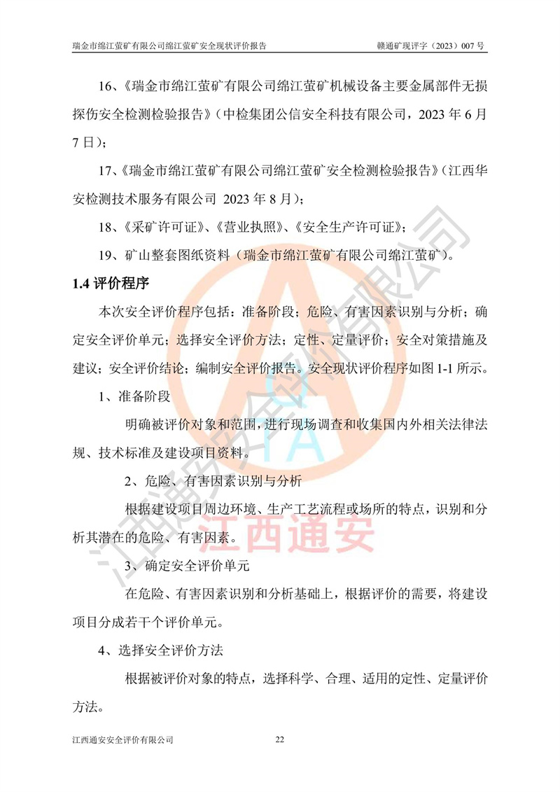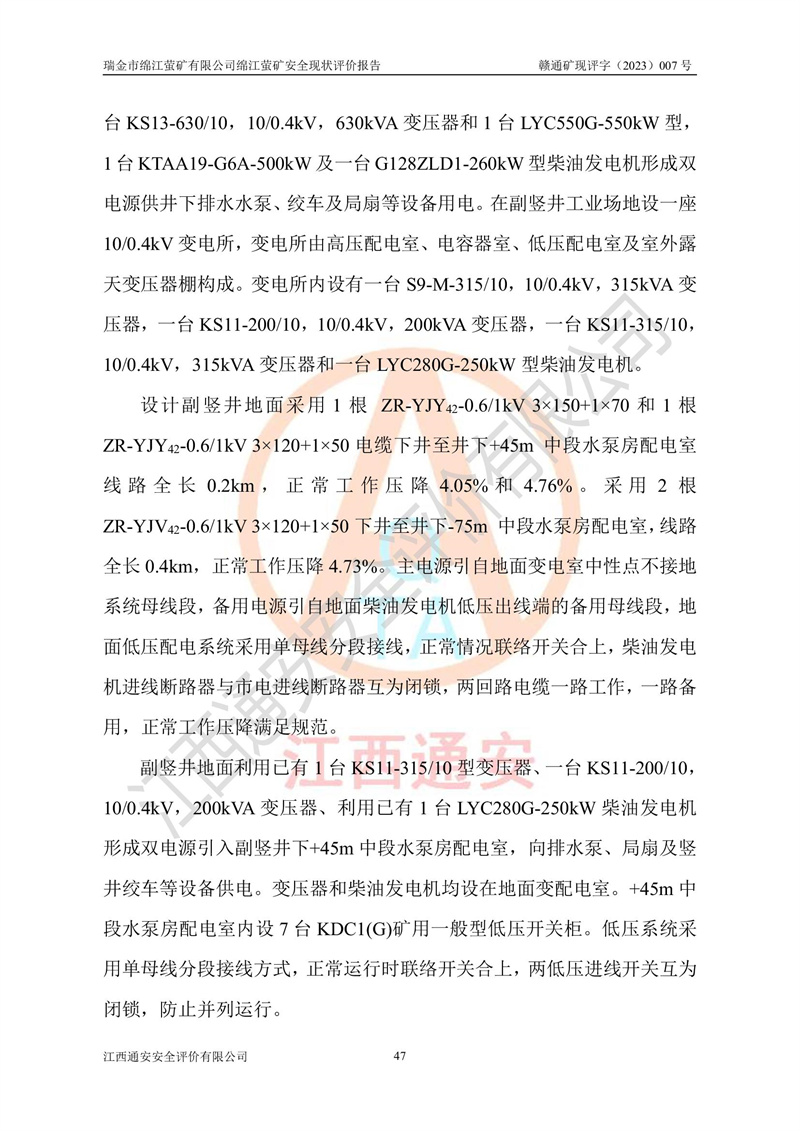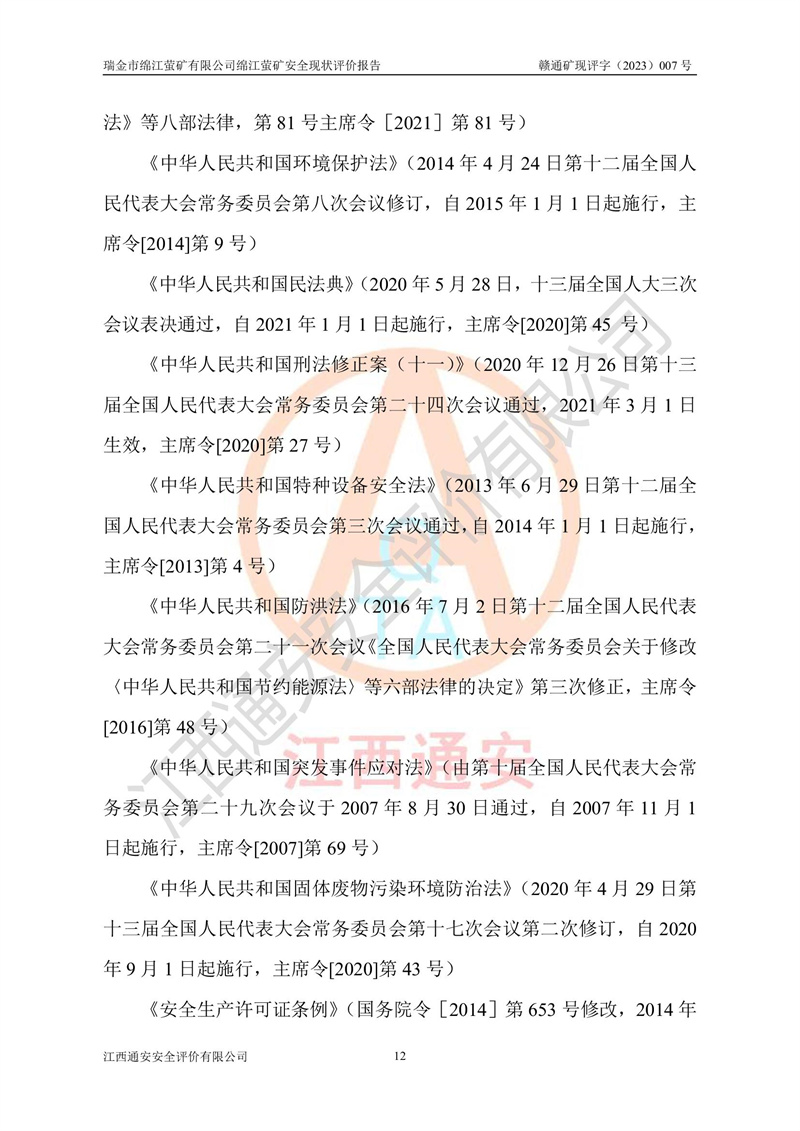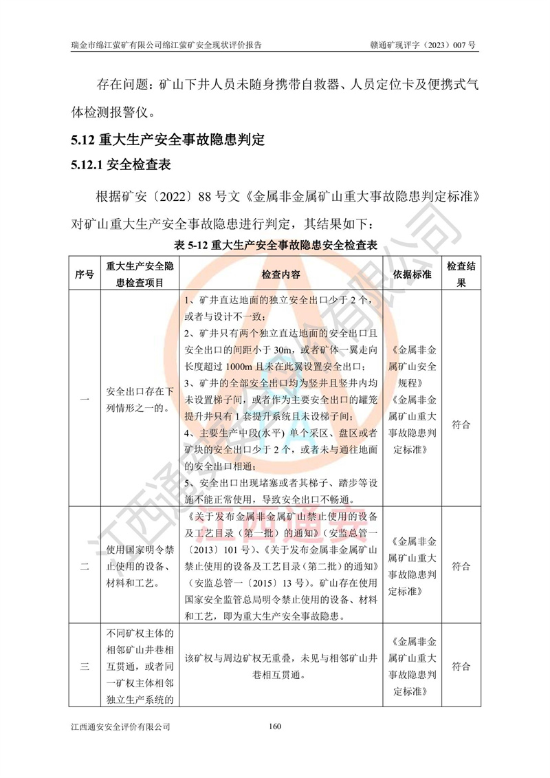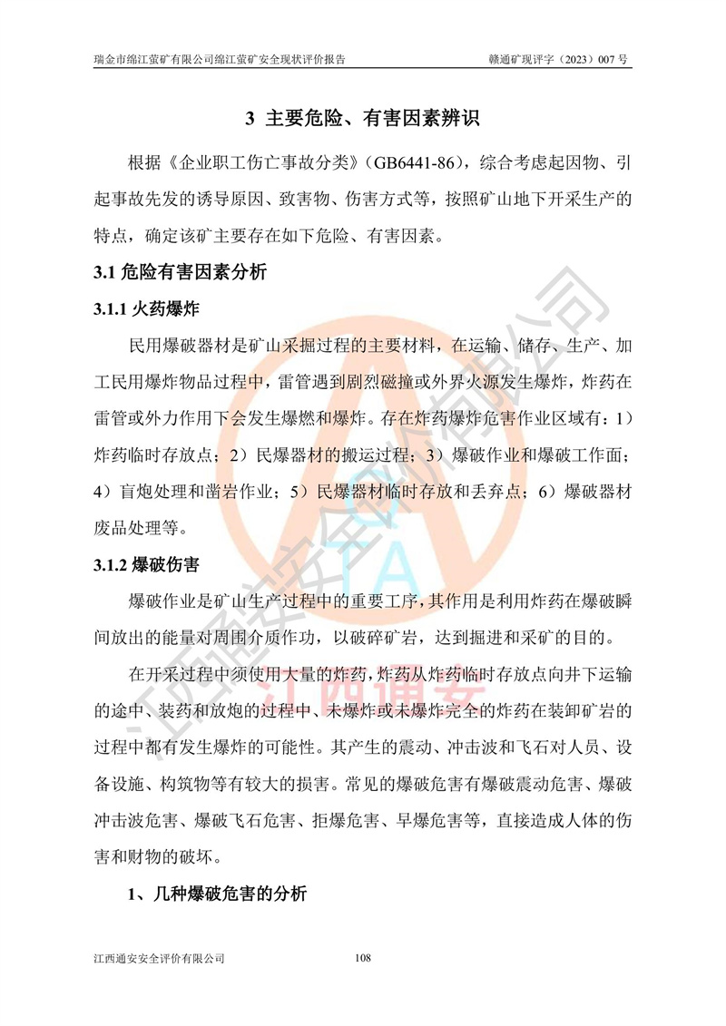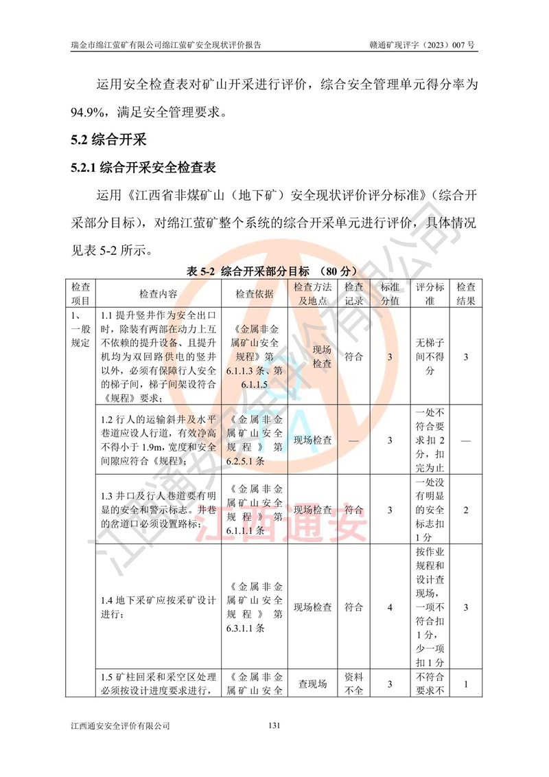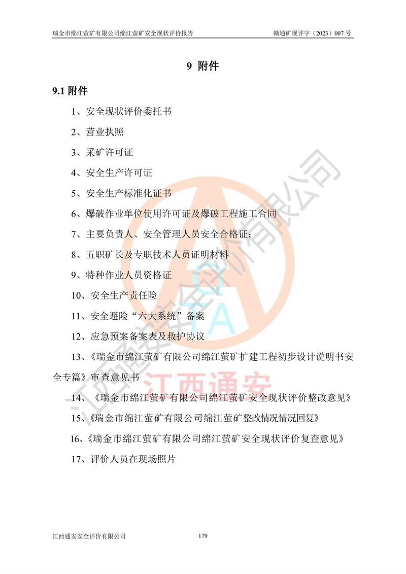 綿江螢礦礦區(qū)位于瑞金市南西210°方向,直線距離約26km,礦區(qū)地理坐標為東徑115°50′54″~115°51′31″,北緯25°38′52″~25°39′34″,行政區(qū)劃隸屬于瑞金市謝坊鎮(zhèn)深塘村管轄。 瑞金市綿江螢礦自1972年始有當?shù)卮迕裥∫?guī)模陸續(xù)開采,1978年收歸瑞金縣謝坊鄉(xiāng)管理,成立謝坊鄉(xiāng)螢石礦,同年收歸縣管改名為瑞金縣螢石礦,再經(jīng)歷多次采礦權人變更后,至2010年礦山由深圳市新星輕質(zhì)合金材料有限公司收購瑞金市綿江螢石礦為其全資子公司,同時成立瑞金市綿江螢礦有限公司為現(xiàn)礦山采礦權人。2021年5月28日,深圳市新星輕質(zhì)合金材料有限公司將其持有的綿江螢礦****股權及派生權益質(zhì)押給瑞金市金鑫礦產(chǎn)品實業(yè)有限公司,采礦權人未變。 礦山于2014年1月20日取得原江西省國土資源廳頒發(fā)的采礦許可證,證號:C3607002009126120050709,采礦權人:瑞金市綿江螢礦有限公司,地址:江西省贛州市瑞金市,礦山名稱:瑞金市綿江螢礦有限公司綿江螢礦,經(jīng)濟類型:私營有限責任公司,開采礦種:螢石(普通),開采方式:地下開采,生產(chǎn)規(guī)模:5.00萬t/a,礦區(qū)面積;0.5053km2,**期限:壹拾貳年自2014年1月20日至2026年1月20日。開采深度由238m至-100m標高,共有8個拐點圈定。 2014年6月,企業(yè)委托江西省煤礦設計院編制了《瑞金市綿江螢礦有限公司綿江螢礦擴建工程初步設計說明書》和《瑞金市綿江螢礦有限公司綿江螢礦擴建工程初步設計說明書安全專篇》。并于2014年6月19日省安監(jiān)局組織專家對《瑞金市綿江螢礦有限公司綿江螢礦擴建工程初步設計說明書安全專篇》進行了評審并原則通過,2014年7月18日由江西省安監(jiān)局下達了《關于瑞金市綿江螢礦有限公司綿江螢礦擴建工程初步設計說明書安全專篇》的審查意見書(贛安監(jiān)非煤項目設審[2014]46號)。礦山擴建工程設計采用豎井+盲豎井聯(lián)合開拓,延深共布置-15m、-45m、-75m、-100m四個中段。采礦方法為淺孔留礦法,通風系統(tǒng)采用中央對角抽出式機械通風,主扇安裝在4#回風斜井井口,礦山生產(chǎn)規(guī)模為5萬t/a,服務年限為10年。 2016年7月,礦山委托江西通安安全評價有限公司編制了《瑞金市綿江螢礦有限公司綿江螢礦地下開采擴建工程安全設施驗收評價報告》。2016年7月31日-8月2日,公司組織有關專家對江西通安安全評價有限公司編制的《瑞金市綿江螢礦有限公司綿江螢礦地下開采擴建工程安全設施驗收評價報告》進行了評審,同時對瑞金市綿江螢礦有限公司綿江螢礦地下開采擴建工程建設項目安全設施進行了現(xiàn)場驗收并原則通過。瑞金市安監(jiān)局依法對驗收過程及結果進行監(jiān)督。 2020年10月12日,礦山取得江西省應急管理換發(fā)的安全生產(chǎn)許可證。編號:(贛)FM安許證字[2005]M0029號,單位名稱:瑞金市綿江螢礦有限公司綿江螢礦地下開采,主要負責人:陳勇,單位地址:江西省瑞金市謝坊鎮(zhèn)深塘村,經(jīng)濟類型:有限責任公司,許可范圍:螢石礦5萬t/a,豎井+盲豎井聯(lián)合開拓,-75m、-100m中段地下開采,**期:2020年10月27日至2023年10月26日。 礦山取得安全生產(chǎn)許可證后,嚴格按照設計回采順序(中段按從上到下的順序開采,同時開采中段數(shù)為一個)要求進行開采,目前礦山-15m、-45m中段已結束回采。礦山現(xiàn)采用豎井+盲豎井聯(lián)合開拓。東區(qū)2#豎井(SJ2)為主豎井,西區(qū)3#豎井(SJ3)為副豎井,XJ4斜井為回風井兼做安全出口。礦山共開拓了+170、+110m、+80m、+65m、+45m、+15m、-15m、-45m、-75m、-100m等十個中段,其中-45m以上中段已回采結束,目前-75m為主要生產(chǎn)中段,-45m為回風中段,-100m為生產(chǎn)開拓中段。-75m中段東、西兩區(qū)運輸巷道已貫通,并已掘三個通風天井連接至-45m中段,東區(qū)-100m中段已掘穿脈、沿脈巷道100m。東、西區(qū)的-45m以上中段均已貫通。東區(qū)+15m中段已開拓2#盲豎井至-100m中段,2#盲豎井連接-15m、-45m、-75m、-100m四個中段。西區(qū)+45m中段已開拓3#盲豎井至-75m中段,3#盲豎井連接+15m、-15m、-45m、-75m四個中段,并計劃按設計延伸至-100m中段。 2019年3月-2020年6月礦山對提升運輸系統(tǒng)設備設施進行了改造,各中段及豎井、盲豎井井口運輸由原無軌膠輪車運輸改為0.5m3U型礦車運輸,各東、西區(qū)豎井及盲豎井均新安裝了BF-0511防墜器,新更換了GLS1/6/1/1罐籠。隨著礦山進行深部開拓,井下需風量及風阻隨之變大,為了滿足礦山通風系統(tǒng)要求,礦山將設計一期工程15kW型號KCZ40-№11主扇風機,更換為二期工程55kW型號KZC40-№13主扇,進一步提高了礦井通風效率。同時將東、西兩區(qū)豎井及盲豎井原JTP-1.2×1.0P絞車更換為JTP-1.6×1.2P型絞車。 為了進一步優(yōu)化礦山提升運輸、排水、供電等系統(tǒng),2022年10月,礦山委托江西省中贛投勘察設計有限公司(原江西省煤礦設計院)編制了《瑞金市綿江螢礦有限公司綿江螢礦地下開采提升運輸、排水、供電優(yōu)化方案設計》。至2023年8月,礦山按優(yōu)化方案完成了改造,并委托江西華安檢測技術服務有限公司對設備設施進行檢測,檢測結果合格。 根據(jù)《安全生產(chǎn)法》、《安全生產(chǎn)許可證條例》等有關法律、法規(guī)的規(guī)定以及《關于做好非煤礦礦山企業(yè)安全生產(chǎn)許可證延期換證工作的通知》的要求,2023年4月,瑞金市綿江