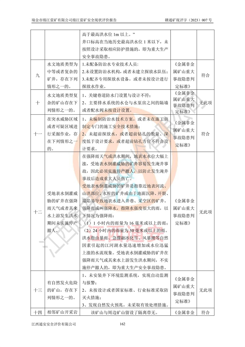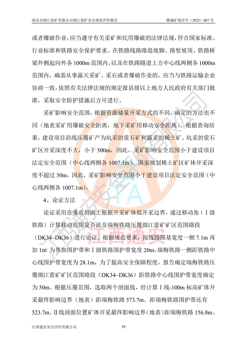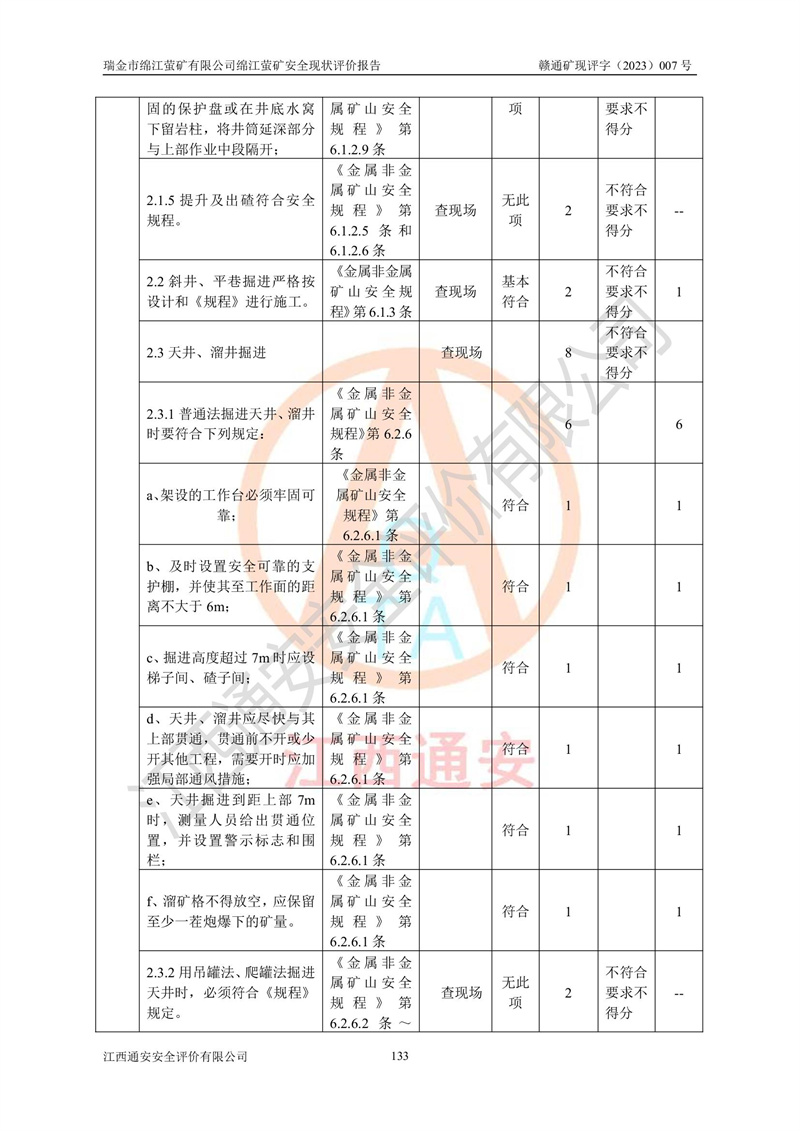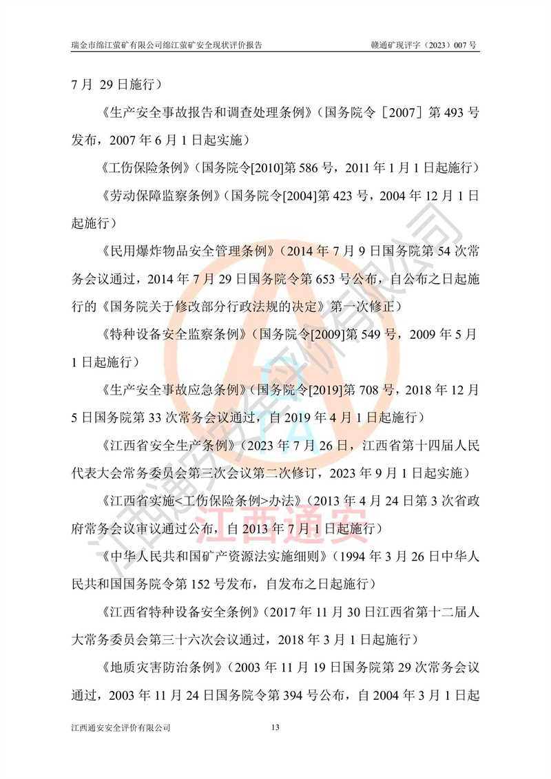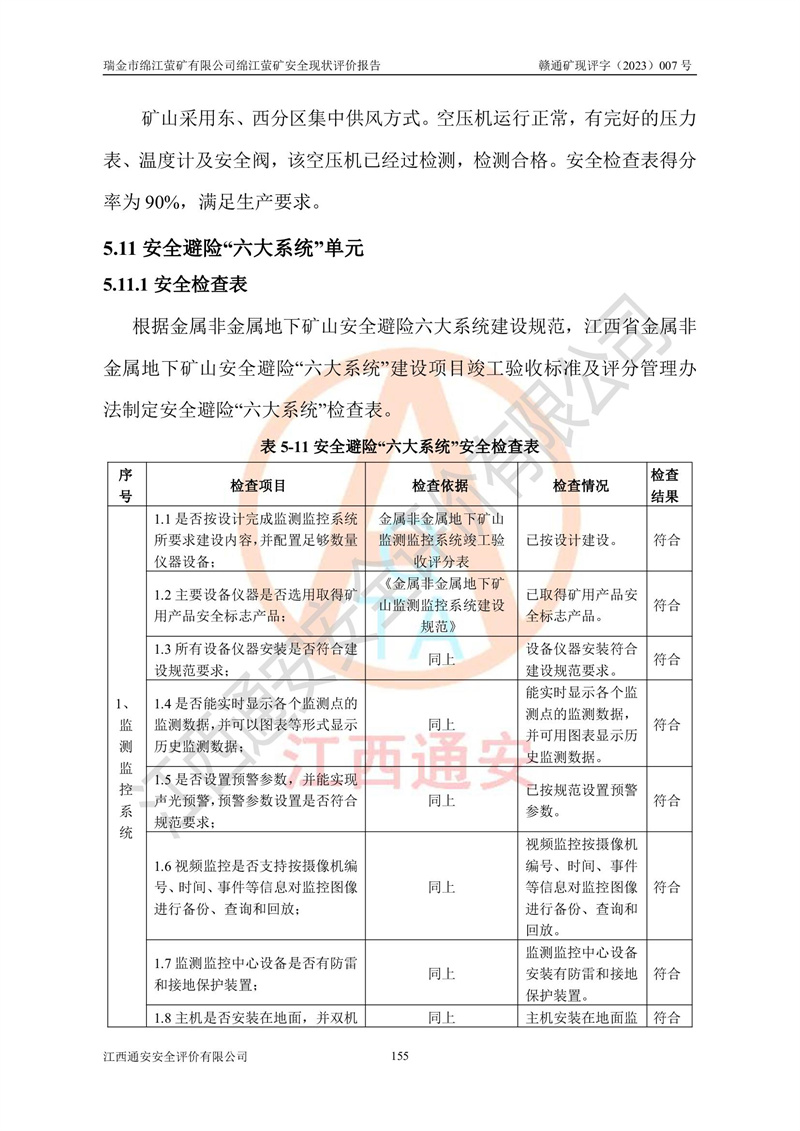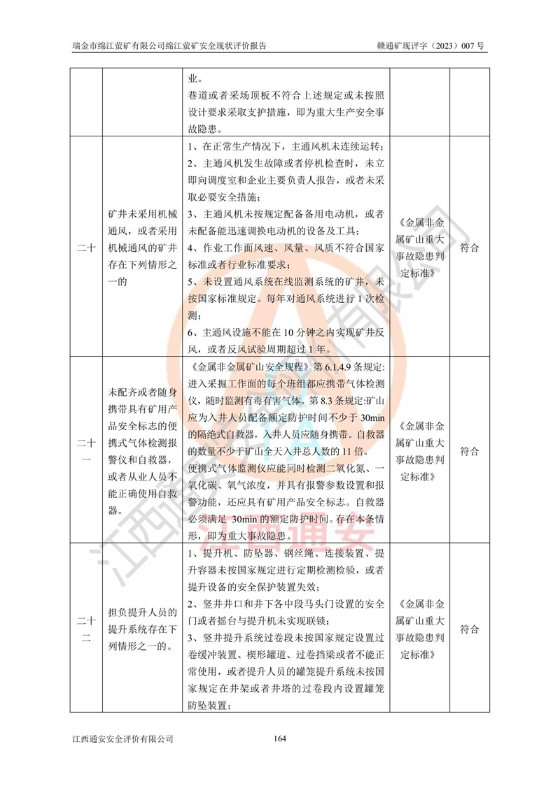 綿江螢礦礦區(qū)位于瑞金市南西210°方向,直線距離約26km,礦區(qū)地理坐標為東徑115°50′54″~115°51′31″,北緯25°38′52″~25°39′34″,行政區(qū)劃隸屬于瑞金市謝坊鎮(zhèn)深塘村管轄。 瑞金市綿江螢礦自1972年始有當?shù)卮迕裥∫?guī)模陸續(xù)開采,1978年收歸瑞金縣謝坊鄉(xiāng)管理,成立謝坊鄉(xiāng)螢石礦,同年收歸縣管改名為瑞金縣螢石礦,再經(jīng)歷多次采礦權人變更后,至2010年礦山由深圳市新星輕質(zhì)合金材料有限公司收購瑞金市綿江螢石礦為其全資子公司,同時成立瑞金市綿江螢礦有限公司為現(xiàn)礦山采礦權人。2021年5月28日,深圳市新星輕質(zhì)合金材料有限公司將其持有的綿江螢礦****股權及派生權益質(zhì)押給瑞金市金鑫礦產(chǎn)品實業(yè)有限公司,采礦權人未變。 礦山于2014年1月20日取得原江西省國土資源廳頒發(fā)的采礦許可證,證號:C3607002009126120050709,采礦權人:瑞金市綿江螢礦有限公司,地址:江西省贛州市瑞金市,礦山名稱:瑞金市綿江螢礦有限公司綿江螢礦,經(jīng)濟類型:私營有限責任公司,開采礦種:螢石(普通),開采方式:地下開采,生產(chǎn)規(guī)模:5.00萬t/a,礦區(qū)面積;0.5053km2,**期限:壹拾貳年自2014年1月20日至2026年1月20日。開采深度由238m至-100m標高,共有8個拐點圈定。 2014年6月,企業(yè)委托江西省煤礦設計院編制了《瑞金市綿江螢礦有限公司綿江螢礦擴建工程初步設計說明書》和《瑞金市綿江螢礦有限公司綿江螢礦擴建工程初步設計說明書安全專篇》。并于2014年6月19日省安監(jiān)局組織專家對《瑞金市綿江螢礦有限公司綿江螢礦擴建工程初步設計說明書安全專篇》進行了評審并原則通過,2014年7月18日由江西省安監(jiān)局下達了《關于瑞金市綿江螢礦有限公司綿江螢礦擴建工程初步設計說明書安全專篇》的審查意見書(贛安監(jiān)非煤項目設審[2014]46號)。礦山擴建工程設計采用豎井+盲豎井聯(lián)合開拓,延深共布置-15m、-45m、-75m、-100m四個中段。采礦方法為淺孔留礦法,通風系統(tǒng)采用中央對角抽出式機械通風,主扇安裝在4#回風斜井井口,礦山生產(chǎn)規(guī)模為5萬t/a,服務年限為10年。 2016年7月,礦山委托江西通安安全評價有限公司編制了《瑞金市綿江螢礦有限公司綿江螢礦地下開采擴建工程安全設施驗收評價報告》。2016年7月31日-8月2日,公司組織有關專家對江西通安安全評價有限公司編制的《瑞金市綿江螢礦有限公司綿江螢礦地下開采擴建工程安全設施驗收評價報告》進行了評審,同時對瑞金市綿江螢礦有限公司綿江螢礦地下開采擴建工程建設項目安全設施進行了現(xiàn)場驗收并原則通過。瑞金市安監(jiān)局依法對驗收過程及結果進行監(jiān)督。 2020年10月12日,礦山取得江西省應急管理換發(fā)的安全生產(chǎn)許可證。編號:(贛)FM安許證字[2005]M0029號,單位名稱:瑞金市綿江螢礦有限公司綿江螢礦地下開采,主要負責人:陳勇,單位地址:江西省瑞金市謝坊鎮(zhèn)深塘村,經(jīng)濟類型:有限責任公司,許可范圍:螢石礦5萬t/a,豎井+盲豎井聯(lián)合開拓,-75m、-100m中段地下開采,**期:2020年10月27日至2023年10月26日。 礦山取得安全生產(chǎn)許可證后,嚴格按照設計回采順序(中段按從上到下的順序開采,同時開采中段數(shù)為一個)要求進行開采,目前礦山-15m、-45m中段已結束回采。礦山現(xiàn)采用豎井+盲豎井聯(lián)合開拓。東區(qū)2#豎井(SJ2)為主豎井,西區(qū)3#豎井(SJ3)為副豎井,XJ4斜井為回風井兼做安全出口。礦山共開拓了+170、+110m、+80m、+65m、+45m、+15m、-15m、-45m、-75m、-100m等十個中段,其中-45m以上中段已回采結束,目前-75m為主要生產(chǎn)中段,-45m為回風中段,-100m為生產(chǎn)開拓中段。-75m中段東、西兩區(qū)運輸巷道已貫通,并已掘三個通風天井連接至-45m中段,東區(qū)-100m中段已掘穿脈、沿脈巷道100m。東、西區(qū)的-45m以上中段均已貫通。東區(qū)+15m中段已開拓2#盲豎井至-100m中段,2#盲豎井連接-15m、-45m、-75m、-100m四個中段。西區(qū)+45m中段已開拓3#盲豎井至-75m中段,3#盲豎井連接+15m、-15m、-45m、-75m四個中段,并計劃按設計延伸至-100m中段。 2019年3月-2020年6月礦山對提升運輸系統(tǒng)設備設施進行了改造,各中段及豎井、盲豎井井口運輸由原無軌膠輪車運輸改為0.5m3U型礦車運輸,各東、西區(qū)豎井及盲豎井均新安裝了BF-0511防墜器,新更換了GLS1/6/1/1罐籠。隨著礦山進行深部開拓,井下需風量及風阻隨之變大,為了滿足礦山通風系統(tǒng)要求,礦山將設計一期工程15kW型號KCZ40-№11主扇風機,更換為二期工程55kW型號KZC40-№13主扇,進一步提高了礦井通風效率。同時將東、西兩區(qū)豎井及盲豎井原JTP-1.2×1.0P絞車更換為JTP-1.6×1.2P型絞車。 為了進一步優(yōu)化礦山提升運輸、排水、供電等系統(tǒng),2022年10月,礦山委托江西省中贛投勘察設計有限公司(原江西省煤礦設計院)編制了《瑞金市綿江螢礦有限公司綿江螢礦地下開采提升運輸、排水、供電優(yōu)化方案設計》。至2023年8月,礦山按優(yōu)化方案完成了改造,并委托江西華安檢測技術服務有限公司對設備設施進行檢測,檢測結果合格。 根據(jù)《安全生產(chǎn)法》、《安全生產(chǎn)許可證條例》等有關法律、法規(guī)的規(guī)定以及《關于做好非煤礦礦山企業(yè)安全生產(chǎn)許可證延期換證工作的通知》的要求,2023年4月,瑞金市綿江