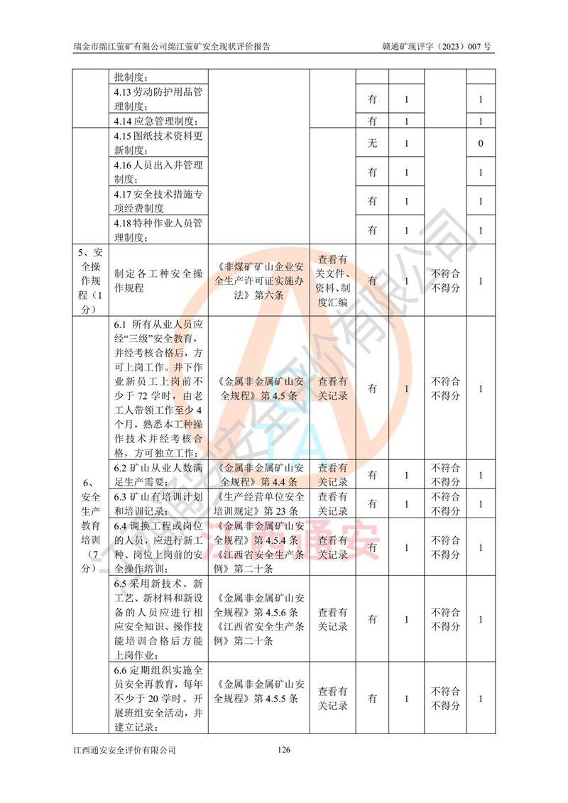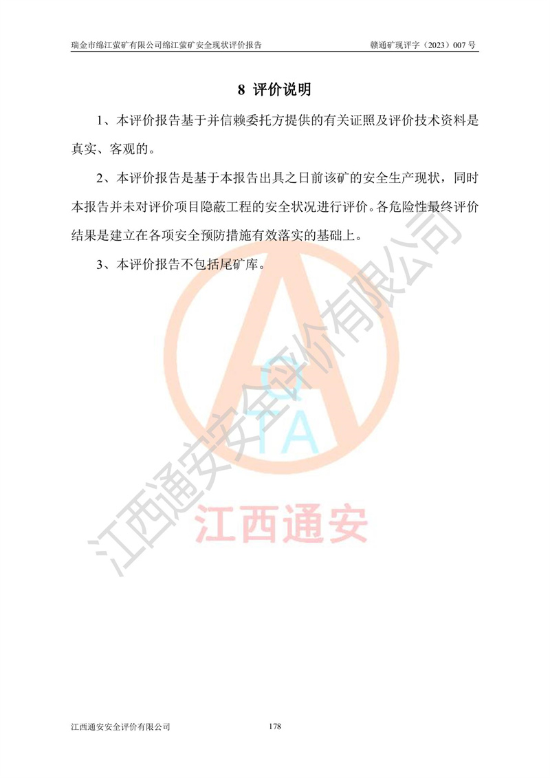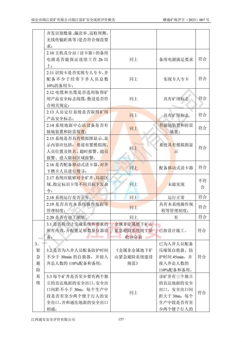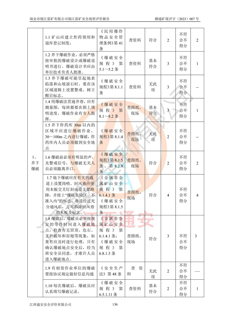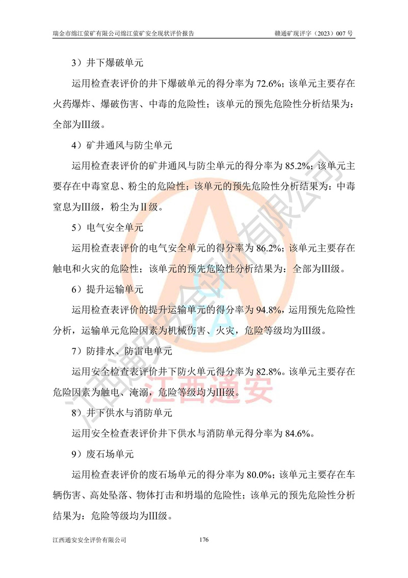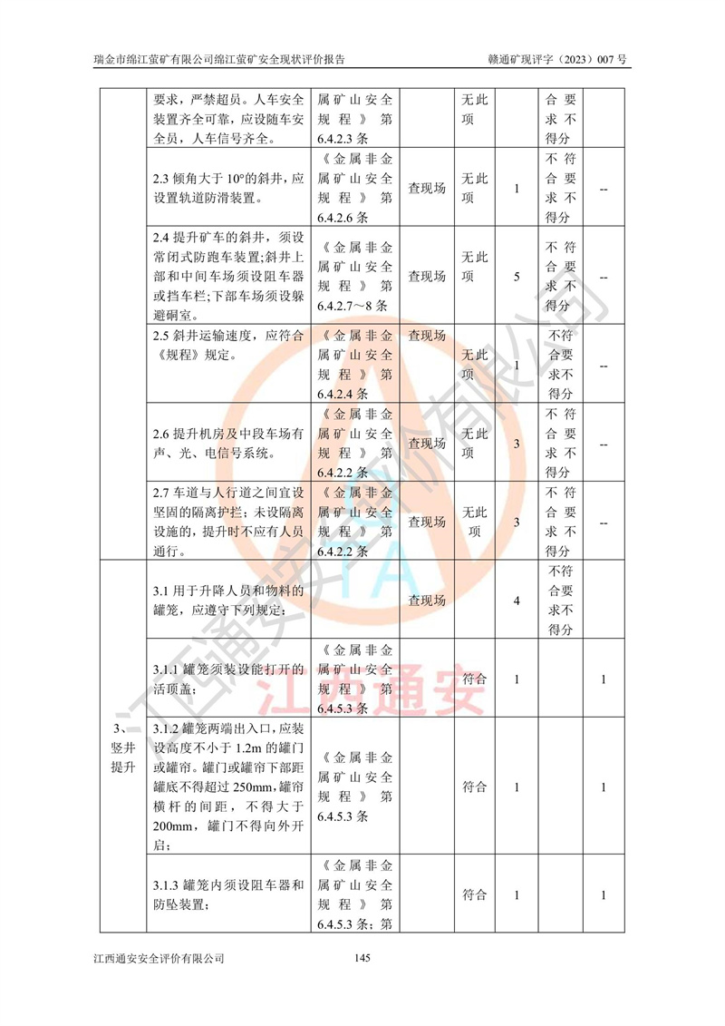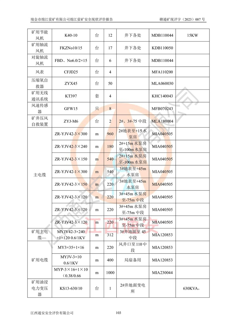 綿江螢礦礦區(qū)位于瑞金市南西210°方向,直線距離約26km,礦區(qū)地理坐標為東徑115°50′54″~115°51′31″,北緯25°38′52″~25°39′34″,行政區(qū)劃隸屬于瑞金市謝坊鎮(zhèn)深塘村管轄。 瑞金市綿江螢礦自1972年始有當?shù)卮迕裥∫?guī)模陸續(xù)開采,1978年收歸瑞金縣謝坊鄉(xiāng)管理,成立謝坊鄉(xiāng)螢石礦,同年收歸縣管改名為瑞金縣螢石礦,再經(jīng)歷多次采礦權人變更后,至2010年礦山由深圳市新星輕質(zhì)合金材料有限公司收購瑞金市綿江螢石礦為其全資子公司,同時成立瑞金市綿江螢礦有限公司為現(xiàn)礦山采礦權人。2021年5月28日,深圳市新星輕質(zhì)合金材料有限公司將其持有的綿江螢礦****股權及派生權益質(zhì)押給瑞金市金鑫礦產(chǎn)品實業(yè)有限公司,采礦權人未變。 礦山于2014年1月20日取得原江西省國土資源廳頒發(fā)的采礦許可證,證號:C3607002009126120050709,采礦權人:瑞金市綿江螢礦有限公司,地址:江西省贛州市瑞金市,礦山名稱:瑞金市綿江螢礦有限公司綿江螢礦,經(jīng)濟類型:私營有限責任公司,開采礦種:螢石(普通),開采方式:地下開采,生產(chǎn)規(guī)模:5.00萬t/a,礦區(qū)面積;0.5053km2,**期限:壹拾貳年自2014年1月20日至2026年1月20日。開采深度由238m至-100m標高,共有8個拐點圈定。 2014年6月,企業(yè)委托江西省煤礦設計院編制了《瑞金市綿江螢礦有限公司綿江螢礦擴建工程初步設計說明書》和《瑞金市綿江螢礦有限公司綿江螢礦擴建工程初步設計說明書安全專篇》。并于2014年6月19日省安監(jiān)局組織專家對《瑞金市綿江螢礦有限公司綿江螢礦擴建工程初步設計說明書安全專篇》進行了評審并原則通過,2014年7月18日由江西省安監(jiān)局下達了《關于瑞金市綿江螢礦有限公司綿江螢礦擴建工程初步設計說明書安全專篇》的審查意見書(贛安監(jiān)非煤項目設審[2014]46號)。礦山擴建工程設計采用豎井+盲豎井聯(lián)合開拓,延深共布置-15m、-45m、-75m、-100m四個中段。采礦方法為淺孔留礦法,通風系統(tǒng)采用中央對角抽出式機械通風,主扇安裝在4#回風斜井井口,礦山生產(chǎn)規(guī)模為5萬t/a,服務年限為10年。 2016年7月,礦山委托江西通安安全評價有限公司編制了《瑞金市綿江螢礦有限公司綿江螢礦地下開采擴建工程安全設施驗收評價報告》。2016年7月31日-8月2日,公司組織有關專家對江西通安安全評價有限公司編制的《瑞金市綿江螢礦有限公司綿江螢礦地下開采擴建工程安全設施驗收評價報告》進行了評審,同時對瑞金市綿江螢礦有限公司綿江螢礦地下開采擴建工程建設項目安全設施進行了現(xiàn)場驗收并原則通過。瑞金市安監(jiān)局依法對驗收過程及結果進行監(jiān)督。 2020年10月12日,礦山取得江西省應急管理換發(fā)的安全生產(chǎn)許可證。編號:(贛)FM安許證字[2005]M0029號,單位名稱:瑞金市綿江螢礦有限公司綿江螢礦地下開采,主要負責人:陳勇,單位地址:江西省瑞金市謝坊鎮(zhèn)深塘村,經(jīng)濟類型:有限責任公司,許可范圍:螢石礦5萬t/a,豎井+盲豎井聯(lián)合開拓,-75m、-100m中段地下開采,**期:2020年10月27日至2023年10月26日。 礦山取得安全生產(chǎn)許可證后,嚴格按照設計回采順序(中段按從上到下的順序開采,同時開采中段數(shù)為一個)要求進行開采,目前礦山-15m、-45m中段已結束回采。礦山現(xiàn)采用豎井+盲豎井聯(lián)合開拓。東區(qū)2#豎井(SJ2)為主豎井,西區(qū)3#豎井(SJ3)為副豎井,XJ4斜井為回風井兼做安全出口。礦山共開拓了+170、+110m、+80m、+65m、+45m、+15m、-15m、-45m、-75m、-100m等十個中段,其中-45m以上中段已回采結束,目前-75m為主要生產(chǎn)中段,-45m為回風中段,-100m為生產(chǎn)開拓中段。-75m中段東、西兩區(qū)運輸巷道已貫通,并已掘三個通風天井連接至-45m中段,東區(qū)-100m中段已掘穿脈、沿脈巷道100m。東、西區(qū)的-45m以上中段均已貫通。東區(qū)+15m中段已開拓2#盲豎井至-100m中段,2#盲豎井連接-15m、-45m、-75m、-100m四個中段。西區(qū)+45m中段已開拓3#盲豎井至-75m中段,3#盲豎井連接+15m、-15m、-45m、-75m四個中段,并計劃按設計延伸至-100m中段。 2019年3月-2020年6月礦山對提升運輸系統(tǒng)設備設施進行了改造,各中段及豎井、盲豎井井口運輸由原無軌膠輪車運輸改為0.5m3U型礦車運輸,各東、西區(qū)豎井及盲豎井均新安裝了BF-0511防墜器,新更換了GLS1/6/1/1罐籠。隨著礦山進行深部開拓,井下需風量及風阻隨之變大,為了滿足礦山通風系統(tǒng)要求,礦山將設計一期工程15kW型號KCZ40-№11主扇風機,更換為二期工程55kW型號KZC40-№13主扇,進一步提高了礦井通風效率。同時將東、西兩區(qū)豎井及盲豎井原JTP-1.2×1.0P絞車更換為JTP-1.6×1.2P型絞車。 為了進一步優(yōu)化礦山提升運輸、排水、供電等系統(tǒng),2022年10月,礦山委托江西省中贛投勘察設計有限公司(原江西省煤礦設計院)編制了《瑞金市綿江螢礦有限公司綿江螢礦地下開采提升運輸、排水、供電優(yōu)化方案設計》。至2023年8月,礦山按優(yōu)化方案完成了改造,并委托江西華安檢測技術服務有限公司對設備設施進行檢測,檢測結果合格。 根據(jù)《安全生產(chǎn)法》、《安全生產(chǎn)許可證條例》等有關法律、法規(guī)的規(guī)定以及《關于做好非煤礦礦山企業(yè)安全生產(chǎn)許可證延期換證工作的通知》的要求,2023年4月,瑞金市綿江