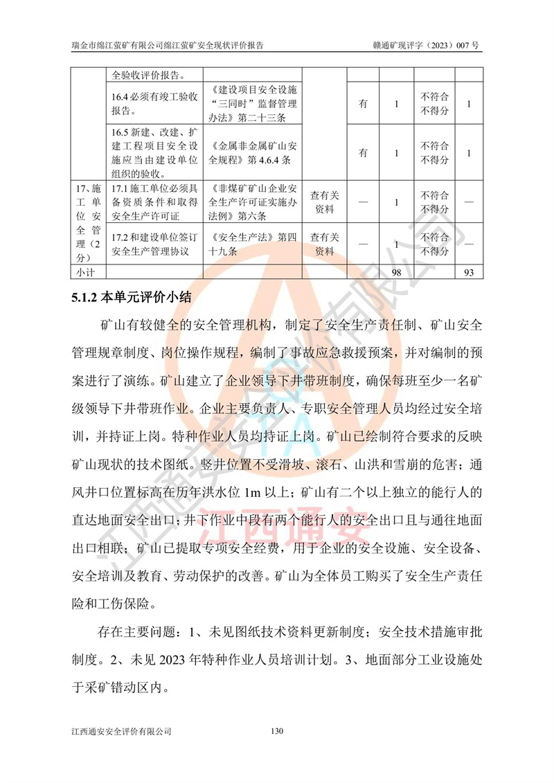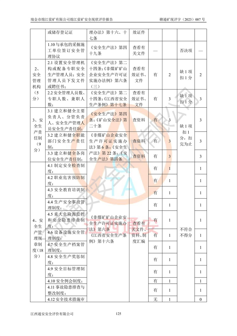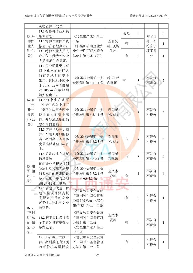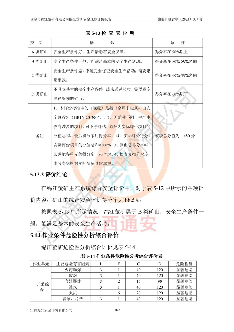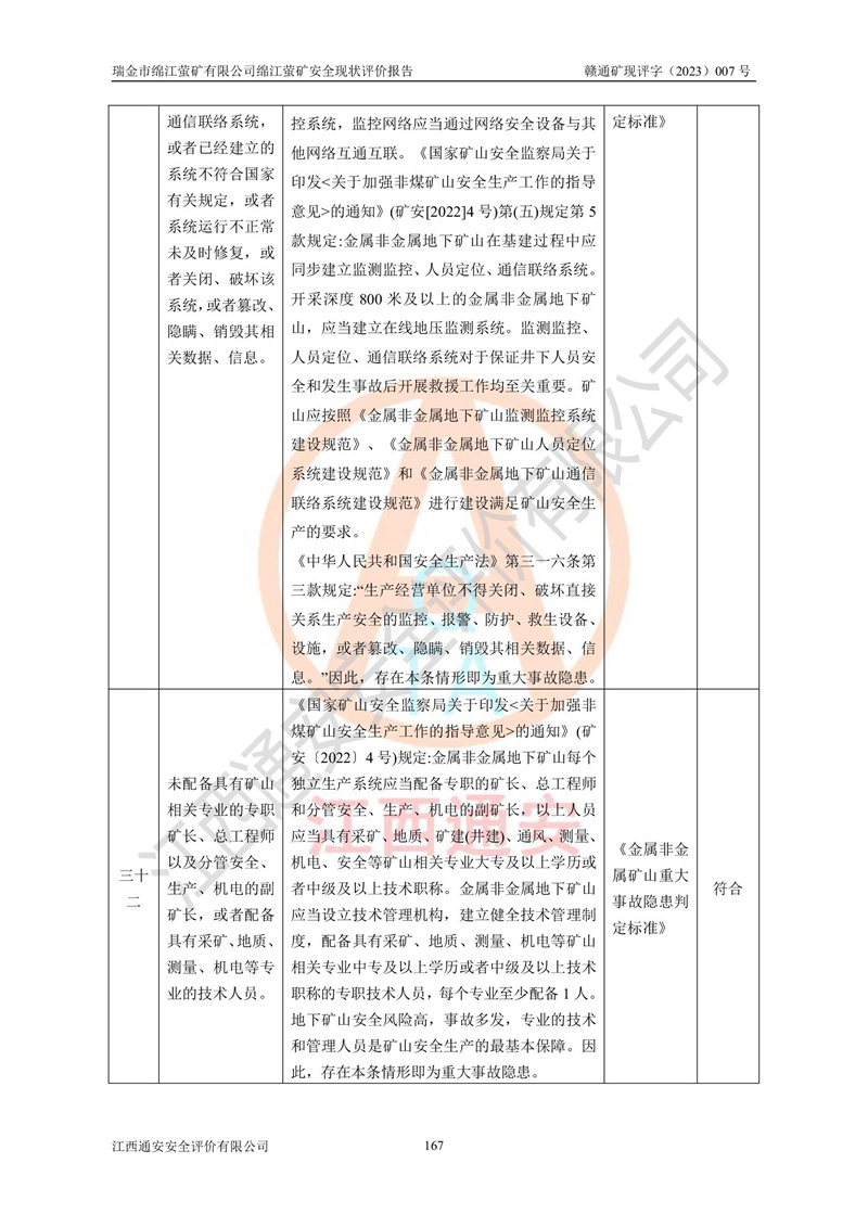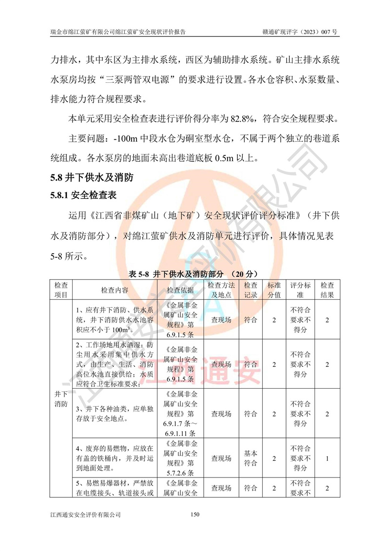 綿江螢礦礦區(qū)位于瑞金市南西210°方向,直線距離約26km,礦區(qū)地理坐標為東徑115°50′54″~115°51′31″,北緯25°38′52″~25°39′34″,行政區(qū)劃隸屬于瑞金市謝坊鎮(zhèn)深塘村管轄。 瑞金市綿江螢礦自1972年始有當?shù)卮迕裥∫?guī)模陸續(xù)開采,1978年收歸瑞金縣謝坊鄉(xiāng)管理,成立謝坊鄉(xiāng)螢石礦,同年收歸縣管改名為瑞金縣螢石礦,再經(jīng)歷多次采礦權人變更后,至2010年礦山由深圳市新星輕質(zhì)合金材料有限公司收購瑞金市綿江螢石礦為其全資子公司,同時成立瑞金市綿江螢礦有限公司為現(xiàn)礦山采礦權人。2021年5月28日,深圳市新星輕質(zhì)合金材料有限公司將其持有的綿江螢礦****股權及派生權益質(zhì)押給瑞金市金鑫礦產(chǎn)品實業(yè)有限公司,采礦權人未變。 礦山于2014年1月20日取得原江西省國土資源廳頒發(fā)的采礦許可證,證號:C3607002009126120050709,采礦權人:瑞金市綿江螢礦有限公司,地址:江西省贛州市瑞金市,礦山名稱:瑞金市綿江螢礦有限公司綿江螢礦,經(jīng)濟類型:私營有限責任公司,開采礦種:螢石(普通),開采方式:地下開采,生產(chǎn)規(guī)模:5.00萬t/a,礦區(qū)面積;0.5053km2,**期限:壹拾貳年自2014年1月20日至2026年1月20日。開采深度由238m至-100m標高,共有8個拐點圈定。 2014年6月,企業(yè)委托江西省煤礦設計院編制了《瑞金市綿江螢礦有限公司綿江螢礦擴建工程初步設計說明書》和《瑞金市綿江螢礦有限公司綿江螢礦擴建工程初步設計說明書安全專篇》。并于2014年6月19日省安監(jiān)局組織專家對《瑞金市綿江螢礦有限公司綿江螢礦擴建工程初步設計說明書安全專篇》進行了評審并原則通過,2014年7月18日由江西省安監(jiān)局下達了《關于瑞金市綿江螢礦有限公司綿江螢礦擴建工程初步設計說明書安全專篇》的審查意見書(贛安監(jiān)非煤項目設審[2014]46號)。礦山擴建工程設計采用豎井+盲豎井聯(lián)合開拓,延深共布置-15m、-45m、-75m、-100m四個中段。采礦方法為淺孔留礦法,通風系統(tǒng)采用中央對角抽出式機械通風,主扇安裝在4#回風斜井井口,礦山生產(chǎn)規(guī)模為5萬t/a,服務年限為10年。 2016年7月,礦山委托江西通安安全評價有限公司編制了《瑞金市綿江螢礦有限公司綿江螢礦地下開采擴建工程安全設施驗收評價報告》。2016年7月31日-8月2日,公司組織有關專家對江西通安安全評價有限公司編制的《瑞金市綿江螢礦有限公司綿江螢礦地下開采擴建工程安全設施驗收評價報告》進行了評審,同時對瑞金市綿江螢礦有限公司綿江螢礦地下開采擴建工程建設項目安全設施進行了現(xiàn)場驗收并原則通過。瑞金市安監(jiān)局依法對驗收過程及結果進行監(jiān)督。 2020年10月12日,礦山取得江西省應急管理換發(fā)的安全生產(chǎn)許可證。編號:(贛)FM安許證字[2005]M0029號,單位名稱:瑞金市綿江螢礦有限公司綿江螢礦地下開采,主要負責人:陳勇,單位地址:江西省瑞金市謝坊鎮(zhèn)深塘村,經(jīng)濟類型:有限責任公司,許可范圍:螢石礦5萬t/a,豎井+盲豎井聯(lián)合開拓,-75m、-100m中段地下開采,**期:2020年10月27日至2023年10月26日。 礦山取得安全生產(chǎn)許可證后,嚴格按照設計回采順序(中段按從上到下的順序開采,同時開采中段數(shù)為一個)要求進行開采,目前礦山-15m、-45m中段已結束回采。礦山現(xiàn)采用豎井+盲豎井聯(lián)合開拓。東區(qū)2#豎井(SJ2)為主豎井,西區(qū)3#豎井(SJ3)為副豎井,XJ4斜井為回風井兼做安全出口。礦山共開拓了+170、+110m、+80m、+65m、+45m、+15m、-15m、-45m、-75m、-100m等十個中段,其中-45m以上中段已回采結束,目前-75m為主要生產(chǎn)中段,-45m為回風中段,-100m為生產(chǎn)開拓中段。-75m中段東、西兩區(qū)運輸巷道已貫通,并已掘三個通風天井連接至-45m中段,東區(qū)-100m中段已掘穿脈、沿脈巷道100m。東、西區(qū)的-45m以上中段均已貫通。東區(qū)+15m中段已開拓2#盲豎井至-100m中段,2#盲豎井連接-15m、-45m、-75m、-100m四個中段。西區(qū)+45m中段已開拓3#盲豎井至-75m中段,3#盲豎井連接+15m、-15m、-45m、-75m四個中段,并計劃按設計延伸至-100m中段。 2019年3月-2020年6月礦山對提升運輸系統(tǒng)設備設施進行了改造,各中段及豎井、盲豎井井口運輸由原無軌膠輪車運輸改為0.5m3U型礦車運輸,各東、西區(qū)豎井及盲豎井均新安裝了BF-0511防墜器,新更換了GLS1/6/1/1罐籠。隨著礦山進行深部開拓,井下需風量及風阻隨之變大,為了滿足礦山通風系統(tǒng)要求,礦山將設計一期工程15kW型號KCZ40-№11主扇風機,更換為二期工程55kW型號KZC40-№13主扇,進一步提高了礦井通風效率。同時將東、西兩區(qū)豎井及盲豎井原JTP-1.2×1.0P絞車更換為JTP-1.6×1.2P型絞車。 為了進一步優(yōu)化礦山提升運輸、排水、供電等系統(tǒng),2022年10月,礦山委托江西省中贛投勘察設計有限公司(原江西省煤礦設計院)編制了《瑞金市綿江螢礦有限公司綿江螢礦地下開采提升運輸、排水、供電優(yōu)化方案設計》。至2023年8月,礦山按優(yōu)化方案完成了改造,并委托江西華安檢測技術服務有限公司對設備設施進行檢測,檢測結果合格。 根據(jù)《安全生產(chǎn)法》、《安全生產(chǎn)許可證條例》等有關法律、法規(guī)的規(guī)定以及《關于做好非煤礦礦山企業(yè)安全生產(chǎn)許可證延期換證工作的通知》的要求,2023年4月,瑞金市綿江