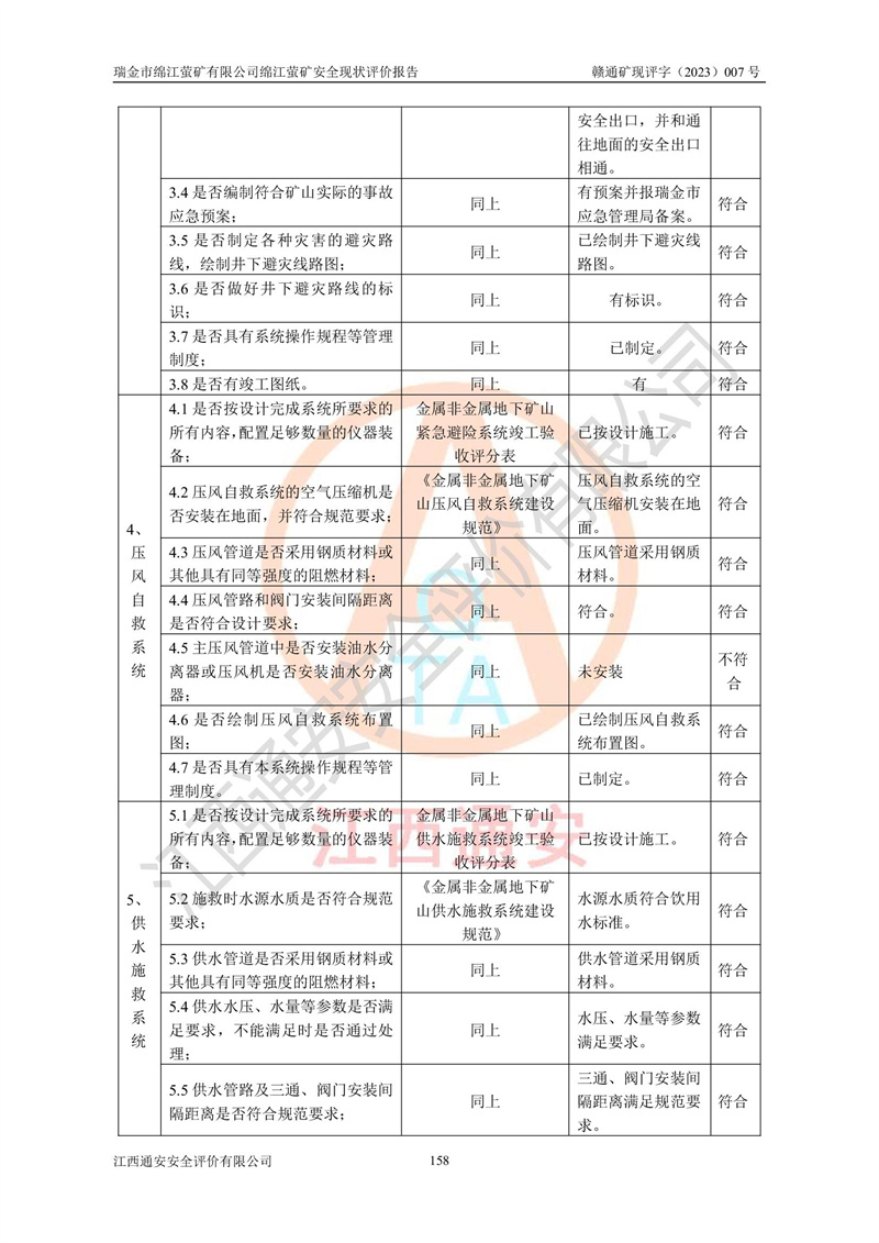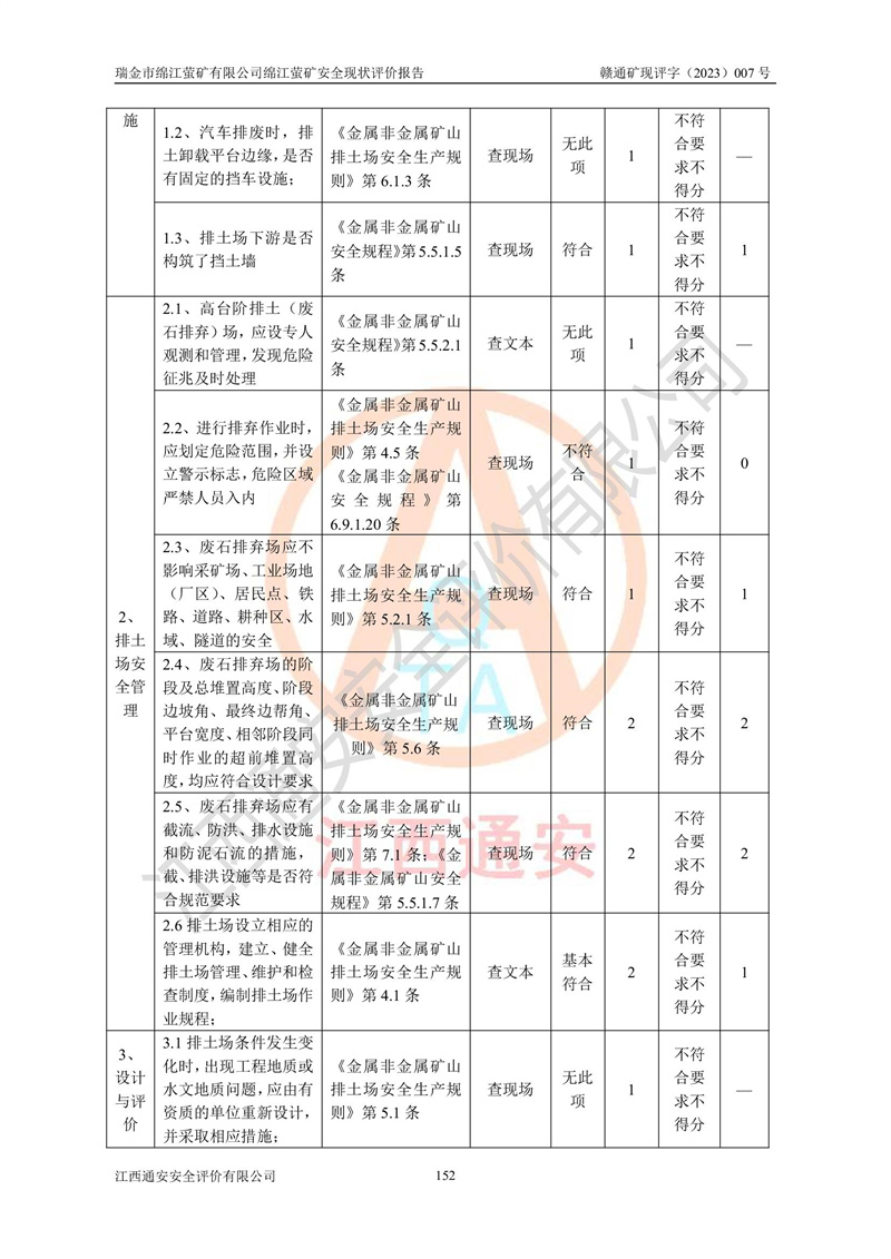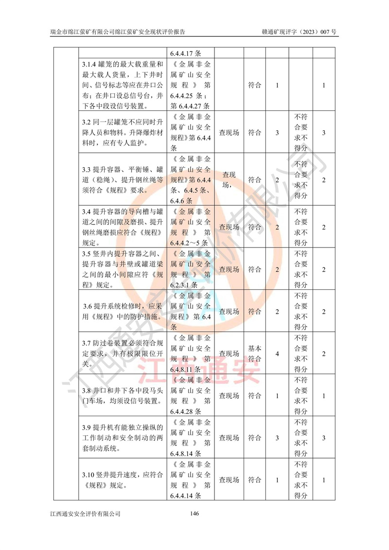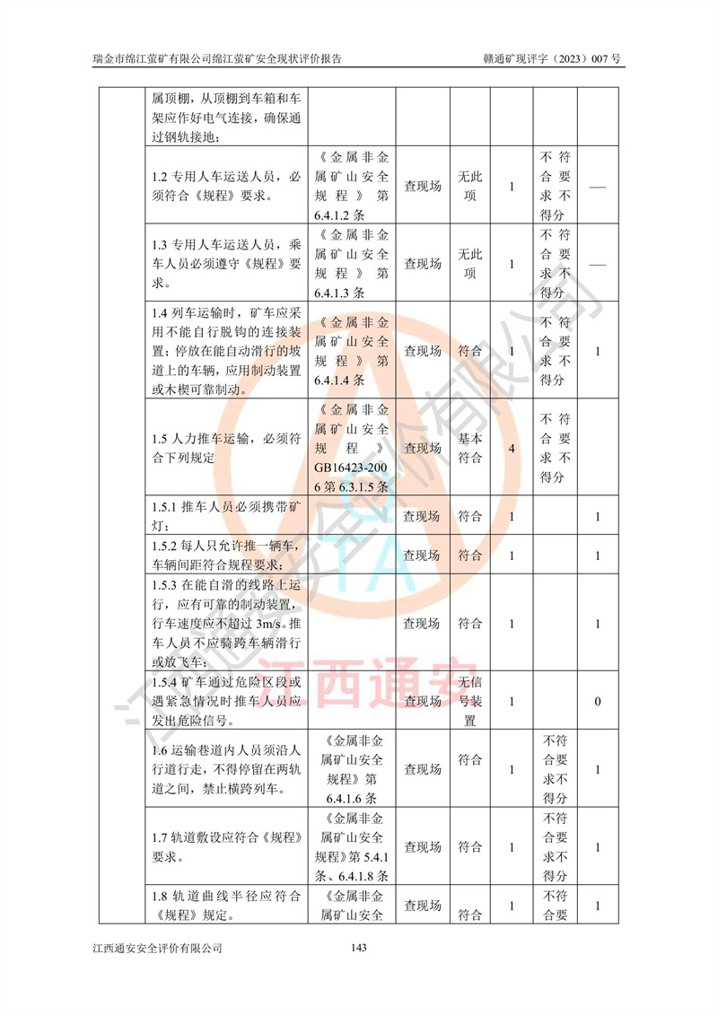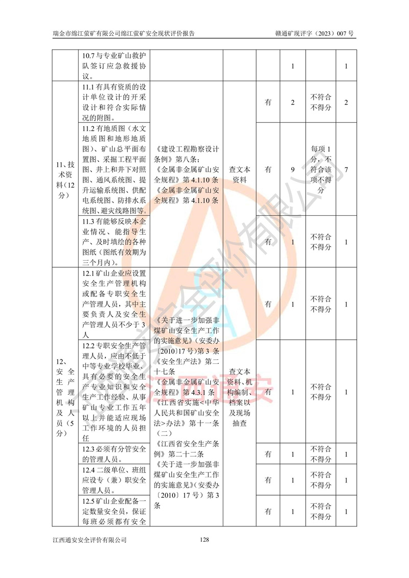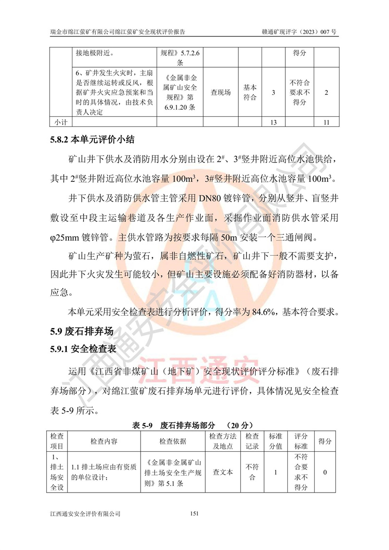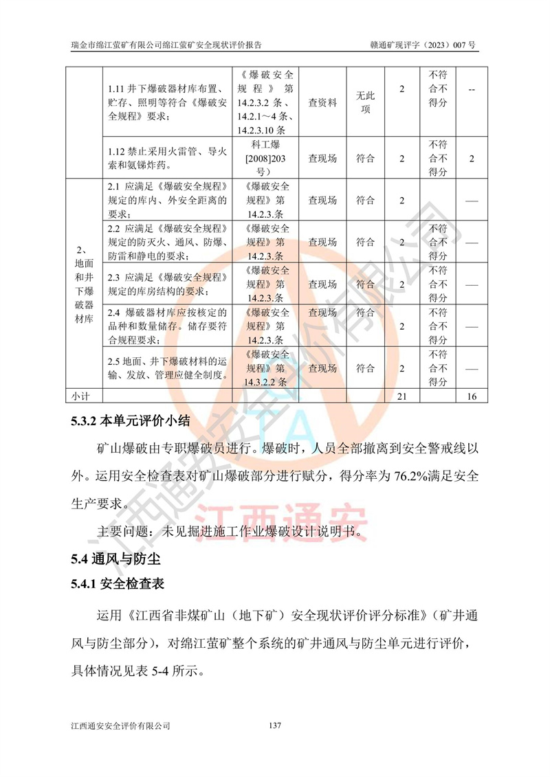 綿江螢礦礦區(qū)位于瑞金市南西210°方向,直線距離約26km,礦區(qū)地理坐標為東徑115°50′54″~115°51′31″,北緯25°38′52″~25°39′34″,行政區(qū)劃隸屬于瑞金市謝坊鎮(zhèn)深塘村管轄。 瑞金市綿江螢礦自1972年始有當?shù)卮迕裥∫?guī)模陸續(xù)開采,1978年收歸瑞金縣謝坊鄉(xiāng)管理,成立謝坊鄉(xiāng)螢石礦,同年收歸縣管改名為瑞金縣螢石礦,再經(jīng)歷多次采礦權人變更后,至2010年礦山由深圳市新星輕質(zhì)合金材料有限公司收購瑞金市綿江螢石礦為其全資子公司,同時成立瑞金市綿江螢礦有限公司為現(xiàn)礦山采礦權人。2021年5月28日,深圳市新星輕質(zhì)合金材料有限公司將其持有的綿江螢礦****股權及派生權益質(zhì)押給瑞金市金鑫礦產(chǎn)品實業(yè)有限公司,采礦權人未變。 礦山于2014年1月20日取得原江西省國土資源廳頒發(fā)的采礦許可證,證號:C3607002009126120050709,采礦權人:瑞金市綿江螢礦有限公司,地址:江西省贛州市瑞金市,礦山名稱:瑞金市綿江螢礦有限公司綿江螢礦,經(jīng)濟類型:私營有限責任公司,開采礦種:螢石(普通),開采方式:地下開采,生產(chǎn)規(guī)模:5.00萬t/a,礦區(qū)面積;0.5053km2,**期限:壹拾貳年自2014年1月20日至2026年1月20日。開采深度由238m至-100m標高,共有8個拐點圈定。 2014年6月,企業(yè)委托江西省煤礦設計院編制了《瑞金市綿江螢礦有限公司綿江螢礦擴建工程初步設計說明書》和《瑞金市綿江螢礦有限公司綿江螢礦擴建工程初步設計說明書安全專篇》。并于2014年6月19日省安監(jiān)局組織專家對《瑞金市綿江螢礦有限公司綿江螢礦擴建工程初步設計說明書安全專篇》進行了評審并原則通過,2014年7月18日由江西省安監(jiān)局下達了《關于瑞金市綿江螢礦有限公司綿江螢礦擴建工程初步設計說明書安全專篇》的審查意見書(贛安監(jiān)非煤項目設審[2014]46號)。礦山擴建工程設計采用豎井+盲豎井聯(lián)合開拓,延深共布置-15m、-45m、-75m、-100m四個中段。采礦方法為淺孔留礦法,通風系統(tǒng)采用中央對角抽出式機械通風,主扇安裝在4#回風斜井井口,礦山生產(chǎn)規(guī)模為5萬t/a,服務年限為10年。 2016年7月,礦山委托江西通安安全評價有限公司編制了《瑞金市綿江螢礦有限公司綿江螢礦地下開采擴建工程安全設施驗收評價報告》。2016年7月31日-8月2日,公司組織有關專家對江西通安安全評價有限公司編制的《瑞金市綿江螢礦有限公司綿江螢礦地下開采擴建工程安全設施驗收評價報告》進行了評審,同時對瑞金市綿江螢礦有限公司綿江螢礦地下開采擴建工程建設項目安全設施進行了現(xiàn)場驗收并原則通過。瑞金市安監(jiān)局依法對驗收過程及結果進行監(jiān)督。 2020年10月12日,礦山取得江西省應急管理換發(fā)的安全生產(chǎn)許可證。編號:(贛)FM安許證字[2005]M0029號,單位名稱:瑞金市綿江螢礦有限公司綿江螢礦地下開采,主要負責人:陳勇,單位地址:江西省瑞金市謝坊鎮(zhèn)深塘村,經(jīng)濟類型:有限責任公司,許可范圍:螢石礦5萬t/a,豎井+盲豎井聯(lián)合開拓,-75m、-100m中段地下開采,**期:2020年10月27日至2023年10月26日。 礦山取得安全生產(chǎn)許可證后,嚴格按照設計回采順序(中段按從上到下的順序開采,同時開采中段數(shù)為一個)要求進行開采,目前礦山-15m、-45m中段已結束回采。礦山現(xiàn)采用豎井+盲豎井聯(lián)合開拓。東區(qū)2#豎井(SJ2)為主豎井,西區(qū)3#豎井(SJ3)為副豎井,XJ4斜井為回風井兼做安全出口。礦山共開拓了+170、+110m、+80m、+65m、+45m、+15m、-15m、-45m、-75m、-100m等十個中段,其中-45m以上中段已回采結束,目前-75m為主要生產(chǎn)中段,-45m為回風中段,-100m為生產(chǎn)開拓中段。-75m中段東、西兩區(qū)運輸巷道已貫通,并已掘三個通風天井連接至-45m中段,東區(qū)-100m中段已掘穿脈、沿脈巷道100m。東、西區(qū)的-45m以上中段均已貫通。東區(qū)+15m中段已開拓2#盲豎井至-100m中段,2#盲豎井連接-15m、-45m、-75m、-100m四個中段。西區(qū)+45m中段已開拓3#盲豎井至-75m中段,3#盲豎井連接+15m、-15m、-45m、-75m四個中段,并計劃按設計延伸至-100m中段。 2019年3月-2020年6月礦山對提升運輸系統(tǒng)設備設施進行了改造,各中段及豎井、盲豎井井口運輸由原無軌膠輪車運輸改為0.5m3U型礦車運輸,各東、西區(qū)豎井及盲豎井均新安裝了BF-0511防墜器,新更換了GLS1/6/1/1罐籠。隨著礦山進行深部開拓,井下需風量及風阻隨之變大,為了滿足礦山通風系統(tǒng)要求,礦山將設計一期工程15kW型號KCZ40-№11主扇風機,更換為二期工程55kW型號KZC40-№13主扇,進一步提高了礦井通風效率。同時將東、西兩區(qū)豎井及盲豎井原JTP-1.2×1.0P絞車更換為JTP-1.6×1.2P型絞車。 為了進一步優(yōu)化礦山提升運輸、排水、供電等系統(tǒng),2022年10月,礦山委托江西省中贛投勘察設計有限公司(原江西省煤礦設計院)編制了《瑞金市綿江螢礦有限公司綿江螢礦地下開采提升運輸、排水、供電優(yōu)化方案設計》。至2023年8月,礦山按優(yōu)化方案完成了改造,并委托江西華安檢測技術服務有限公司對設備設施進行檢測,檢測結果合格。 根據(jù)《安全生產(chǎn)法》、《安全生產(chǎn)許可證條例》等有關法律、法規(guī)的規(guī)定以及《關于做好非煤礦礦山企業(yè)安全生產(chǎn)許可證延期換證工作的通知》的要求,2023年4月,瑞金市綿江