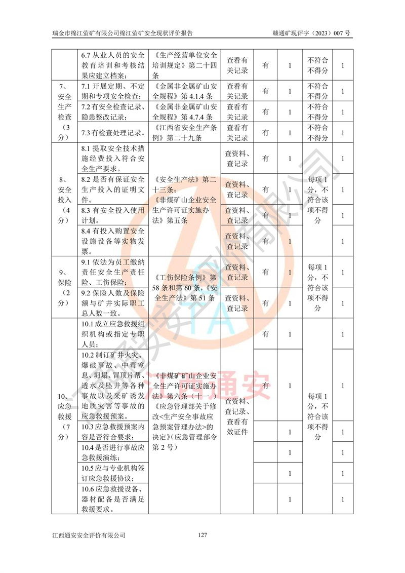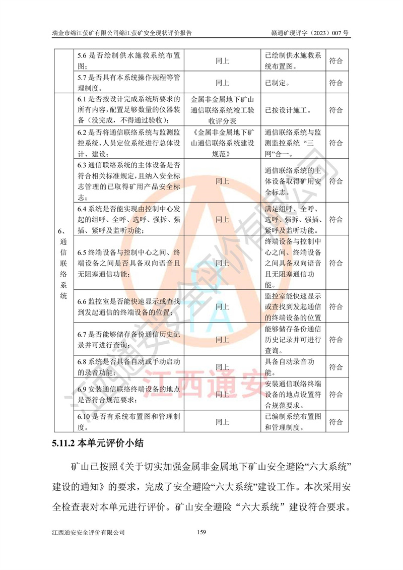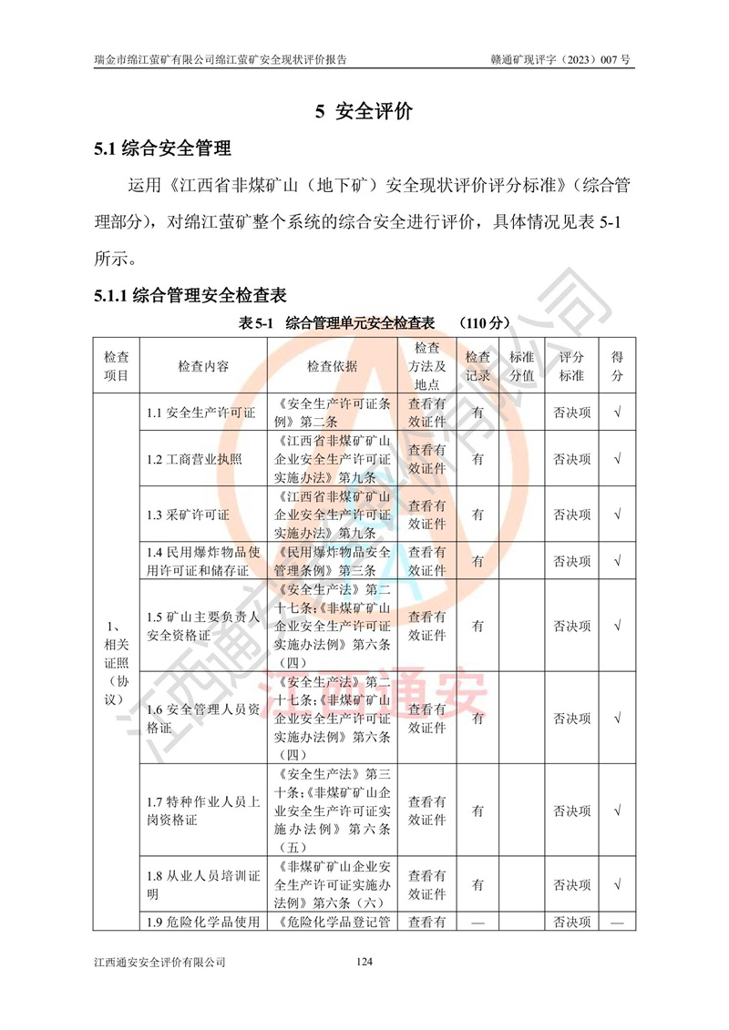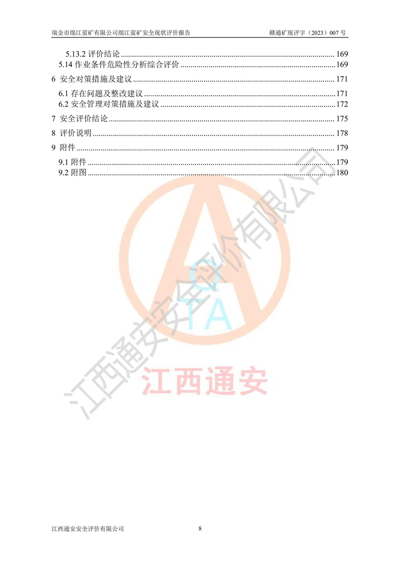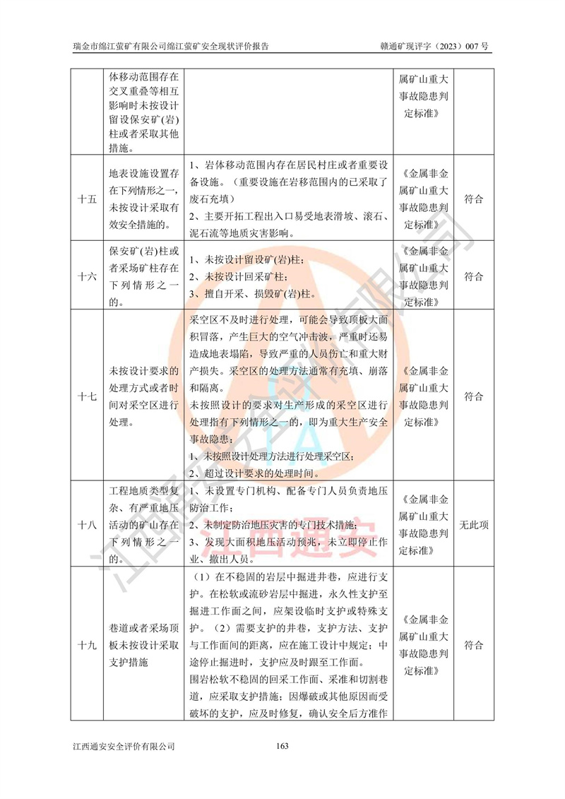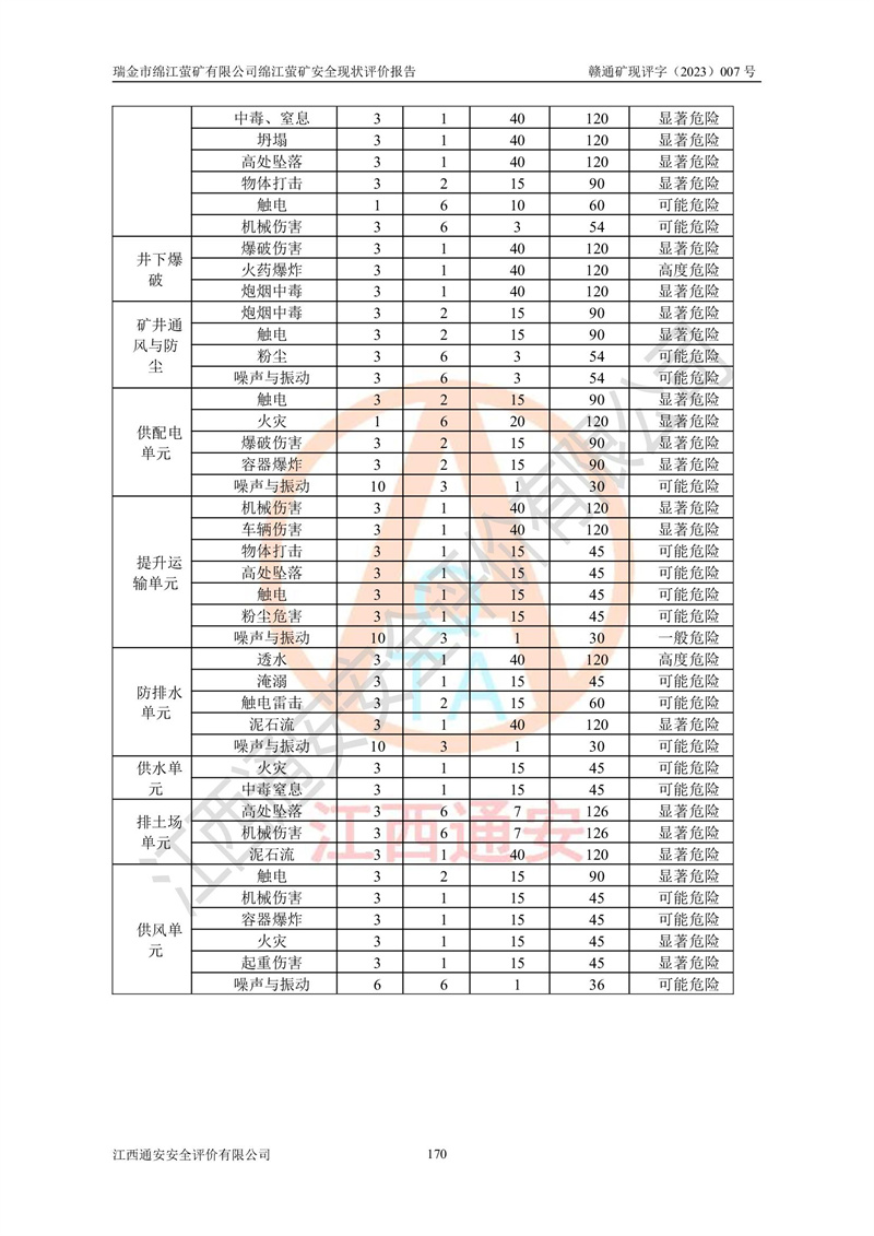 綿江螢礦礦區(qū)位于瑞金市南西210°方向,直線距離約26km,礦區(qū)地理坐標為東徑115°50′54″~115°51′31″,北緯25°38′52″~25°39′34″,行政區(qū)劃隸屬于瑞金市謝坊鎮(zhèn)深塘村管轄。 瑞金市綿江螢礦自1972年始有當?shù)卮迕裥∫?guī)模陸續(xù)開采,1978年收歸瑞金縣謝坊鄉(xiāng)管理,成立謝坊鄉(xiāng)螢石礦,同年收歸縣管改名為瑞金縣螢石礦,再經(jīng)歷多次采礦權人變更后,至2010年礦山由深圳市新星輕質(zhì)合金材料有限公司收購瑞金市綿江螢石礦為其全資子公司,同時成立瑞金市綿江螢礦有限公司為現(xiàn)礦山采礦權人。2021年5月28日,深圳市新星輕質(zhì)合金材料有限公司將其持有的綿江螢礦****股權及派生權益質(zhì)押給瑞金市金鑫礦產(chǎn)品實業(yè)有限公司,采礦權人未變。 礦山于2014年1月20日取得原江西省國土資源廳頒發(fā)的采礦許可證,證號:C3607002009126120050709,采礦權人:瑞金市綿江螢礦有限公司,地址:江西省贛州市瑞金市,礦山名稱:瑞金市綿江螢礦有限公司綿江螢礦,經(jīng)濟類型:私營有限責任公司,開采礦種:螢石(普通),開采方式:地下開采,生產(chǎn)規(guī)模:5.00萬t/a,礦區(qū)面積;0.5053km2,**期限:壹拾貳年自2014年1月20日至2026年1月20日。開采深度由238m至-100m標高,共有8個拐點圈定。 2014年6月,企業(yè)委托江西省煤礦設計院編制了《瑞金市綿江螢礦有限公司綿江螢礦擴建工程初步設計說明書》和《瑞金市綿江螢礦有限公司綿江螢礦擴建工程初步設計說明書安全專篇》。并于2014年6月19日省安監(jiān)局組織專家對《瑞金市綿江螢礦有限公司綿江螢礦擴建工程初步設計說明書安全專篇》進行了評審并原則通過,2014年7月18日由江西省安監(jiān)局下達了《關于瑞金市綿江螢礦有限公司綿江螢礦擴建工程初步設計說明書安全專篇》的審查意見書(贛安監(jiān)非煤項目設審[2014]46號)。礦山擴建工程設計采用豎井+盲豎井聯(lián)合開拓,延深共布置-15m、-45m、-75m、-100m四個中段。采礦方法為淺孔留礦法,通風系統(tǒng)采用中央對角抽出式機械通風,主扇安裝在4#回風斜井井口,礦山生產(chǎn)規(guī)模為5萬t/a,服務年限為10年。 2016年7月,礦山委托江西通安安全評價有限公司編制了《瑞金市綿江螢礦有限公司綿江螢礦地下開采擴建工程安全設施驗收評價報告》。2016年7月31日-8月2日,公司組織有關專家對江西通安安全評價有限公司編制的《瑞金市綿江螢礦有限公司綿江螢礦地下開采擴建工程安全設施驗收評價報告》進行了評審,同時對瑞金市綿江螢礦有限公司綿江螢礦地下開采擴建工程建設項目安全設施進行了現(xiàn)場驗收并原則通過。瑞金市安監(jiān)局依法對驗收過程及結果進行監(jiān)督。 2020年10月12日,礦山取得江西省應急管理換發(fā)的安全生產(chǎn)許可證。編號:(贛)FM安許證字[2005]M0029號,單位名稱:瑞金市綿江螢礦有限公司綿江螢礦地下開采,主要負責人:陳勇,單位地址:江西省瑞金市謝坊鎮(zhèn)深塘村,經(jīng)濟類型:有限責任公司,許可范圍:螢石礦5萬t/a,豎井+盲豎井聯(lián)合開拓,-75m、-100m中段地下開采,**期:2020年10月27日至2023年10月26日。 礦山取得安全生產(chǎn)許可證后,嚴格按照設計回采順序(中段按從上到下的順序開采,同時開采中段數(shù)為一個)要求進行開采,目前礦山-15m、-45m中段已結束回采。礦山現(xiàn)采用豎井+盲豎井聯(lián)合開拓。東區(qū)2#豎井(SJ2)為主豎井,西區(qū)3#豎井(SJ3)為副豎井,XJ4斜井為回風井兼做安全出口。礦山共開拓了+170、+110m、+80m、+65m、+45m、+15m、-15m、-45m、-75m、-100m等十個中段,其中-45m以上中段已回采結束,目前-75m為主要生產(chǎn)中段,-45m為回風中段,-100m為生產(chǎn)開拓中段。-75m中段東、西兩區(qū)運輸巷道已貫通,并已掘三個通風天井連接至-45m中段,東區(qū)-100m中段已掘穿脈、沿脈巷道100m。東、西區(qū)的-45m以上中段均已貫通。東區(qū)+15m中段已開拓2#盲豎井至-100m中段,2#盲豎井連接-15m、-45m、-75m、-100m四個中段。西區(qū)+45m中段已開拓3#盲豎井至-75m中段,3#盲豎井連接+15m、-15m、-45m、-75m四個中段,并計劃按設計延伸至-100m中段。 2019年3月-2020年6月礦山對提升運輸系統(tǒng)設備設施進行了改造,各中段及豎井、盲豎井井口運輸由原無軌膠輪車運輸改為0.5m3U型礦車運輸,各東、西區(qū)豎井及盲豎井均新安裝了BF-0511防墜器,新更換了GLS1/6/1/1罐籠。隨著礦山進行深部開拓,井下需風量及風阻隨之變大,為了滿足礦山通風系統(tǒng)要求,礦山將設計一期工程15kW型號KCZ40-№11主扇風機,更換為二期工程55kW型號KZC40-№13主扇,進一步提高了礦井通風效率。同時將東、西兩區(qū)豎井及盲豎井原JTP-1.2×1.0P絞車更換為JTP-1.6×1.2P型絞車。 為了進一步優(yōu)化礦山提升運輸、排水、供電等系統(tǒng),2022年10月,礦山委托江西省中贛投勘察設計有限公司(原江西省煤礦設計院)編制了《瑞金市綿江螢礦有限公司綿江螢礦地下開采提升運輸、排水、供電優(yōu)化方案設計》。至2023年8月,礦山按優(yōu)化方案完成了改造,并委托江西華安檢測技術服務有限公司對設備設施進行檢測,檢測結果合格。 根據(jù)《安全生產(chǎn)法》、《安全生產(chǎn)許可證條例》等有關法律、法規(guī)的規(guī)定以及《關于做好非煤礦礦山企業(yè)安全生產(chǎn)許可證延期換證工作的通知》的要求,2023年4月,瑞金市綿江