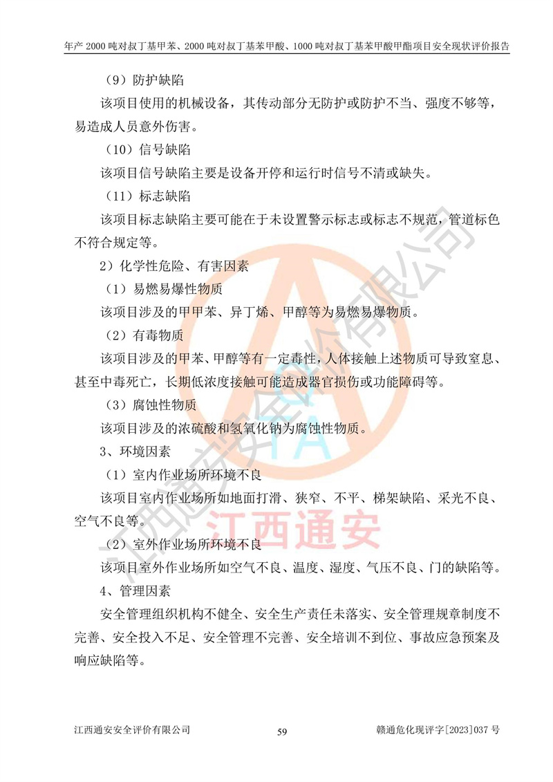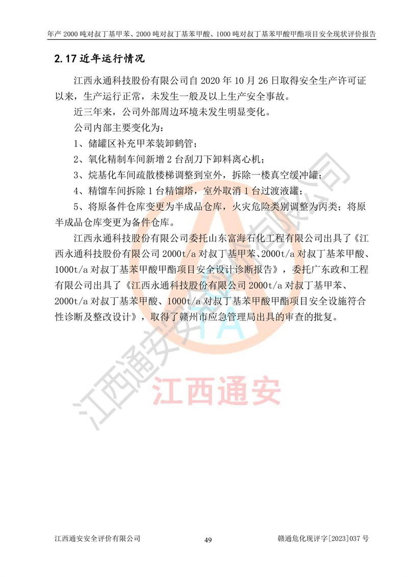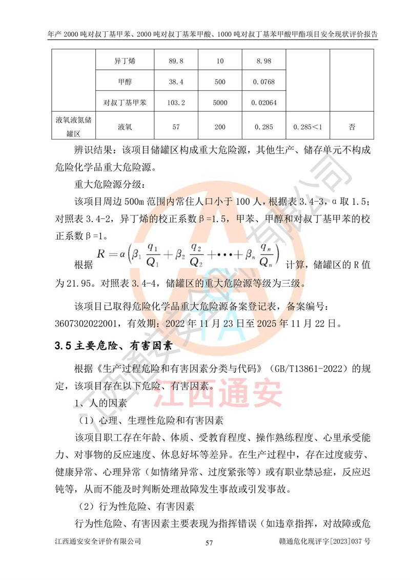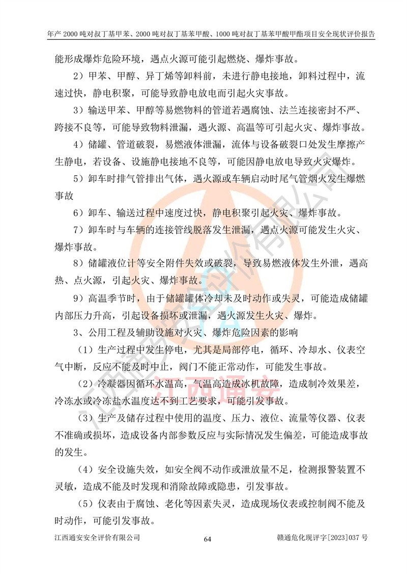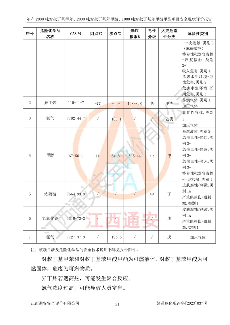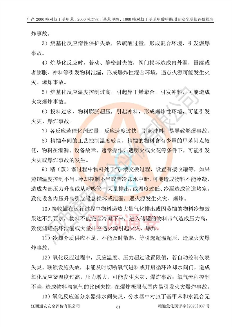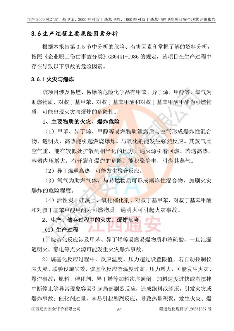 江西永通科技股份有限公司位于江西省贛州市寧都縣工業(yè)園,法定**人為劉忠春,成立于2009年09月25日,注冊(cè)資本玖仟陸佰肆拾陸萬(wàn)陸仟元整,營(yíng)業(yè)執(zhí)照經(jīng)營(yíng)范圍為化學(xué)原料藥、醫(yī)藥中間體等研發(fā)、生產(chǎn)、銷售等。 江西永通科技股份有限公司2020年10月26日取得了《安全生產(chǎn)許可證》,許可證編號(hào):(贛)WH安許證字[2011]0642號(hào),許可范圍為對(duì)叔丁基甲苯(2kt/a)、對(duì)叔丁基苯甲酸(2kt/a)、對(duì)叔丁基苯甲酸甲酯(1kt/a),**期:2020年10月26日至2023年10月25日。該公司2021年10月22日取得了安全生產(chǎn)標(biāo)準(zhǔn)化證書,證書編號(hào):贛市AQBWHⅢ[2021]168,**期至2024年10月21日。該公司現(xiàn)有員工133人,其中專職安全管理人員3人。 江西永通科技股份有限公司年產(chǎn)2000噸對(duì)叔丁基甲苯、2000噸對(duì)叔丁基苯甲酸、1000噸對(duì)叔丁基苯甲酸甲酯項(xiàng)目生產(chǎn)過(guò)程中涉及的原輔材料為甲苯、異丁烯、液氧(氧氣)、甲醇、濃硫酸、液堿(氫氧化鈉)、活性炭、硅藻土、氧化催化劑和氮?dú)?,產(chǎn)品為對(duì)叔丁基甲苯、對(duì)叔丁基苯甲酸和對(duì)叔丁基苯甲酸甲酯。根據(jù)《危險(xiǎn)化學(xué)品目錄》,該項(xiàng)目涉及的甲苯、異丁烯、液氧(氧氣)、甲醇、濃硫酸、液堿(氫氧化鈉)和氮?dú)鈱儆?/span>危險(xiǎn)化學(xué)品。經(jīng)辨識(shí),甲苯和甲醇屬于重點(diǎn)監(jiān)管的危險(xiǎn)化學(xué)品,甲苯和硫酸屬于第三類易制毒化學(xué)品、甲醇屬于特別管控的危險(xiǎn)化學(xué)品,不涉及監(jiān)控化學(xué)品、易制爆危險(xiǎn)化學(xué)品、劇毒化學(xué)品和高毒物品,儲(chǔ)罐區(qū)構(gòu)成三級(jí)重大危險(xiǎn)源,其他生產(chǎn)、儲(chǔ)存單元不構(gòu)成危險(xiǎn)化學(xué)品重大危險(xiǎn)源,涉及的烷基化反應(yīng)和氧化反應(yīng)屬于重點(diǎn)監(jiān)管的危險(xiǎn)化工工藝。根據(jù)《安全生產(chǎn)許可證條例》、《危險(xiǎn)化學(xué)品安全管理?xiàng)l例》和《危險(xiǎn)化學(xué)品生產(chǎn)企業(yè)安全生產(chǎn)許可實(shí)施辦法》的相關(guān)規(guī)定,該項(xiàng)目涉及甲苯回收,需要辦理危險(xiǎn)化學(xué)品安全生產(chǎn)許可證。根據(jù)生產(chǎn)工藝特點(diǎn)及物料的理化特性可知,該項(xiàng)目生產(chǎn)過(guò)程中存在火災(zāi)與爆炸、中毒與窒息、觸電、機(jī)械傷害等危險(xiǎn)有害因素。 該公司自2020年10月26日取得安全生產(chǎn)許可證以來(lái),生產(chǎn)運(yùn)行正常,未發(fā)生一般及以上生產(chǎn)安全事故。 |