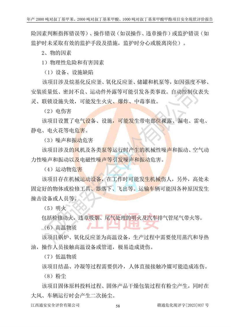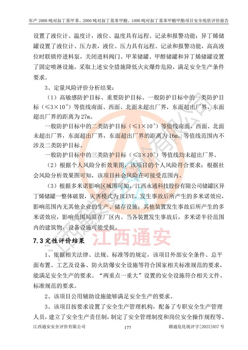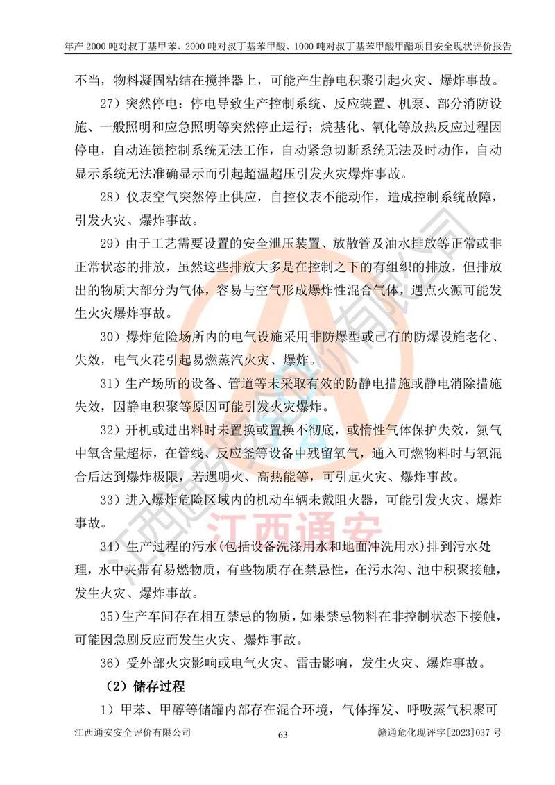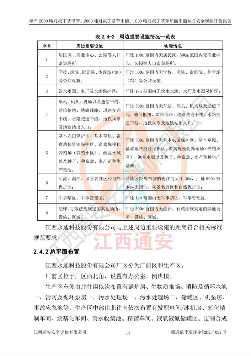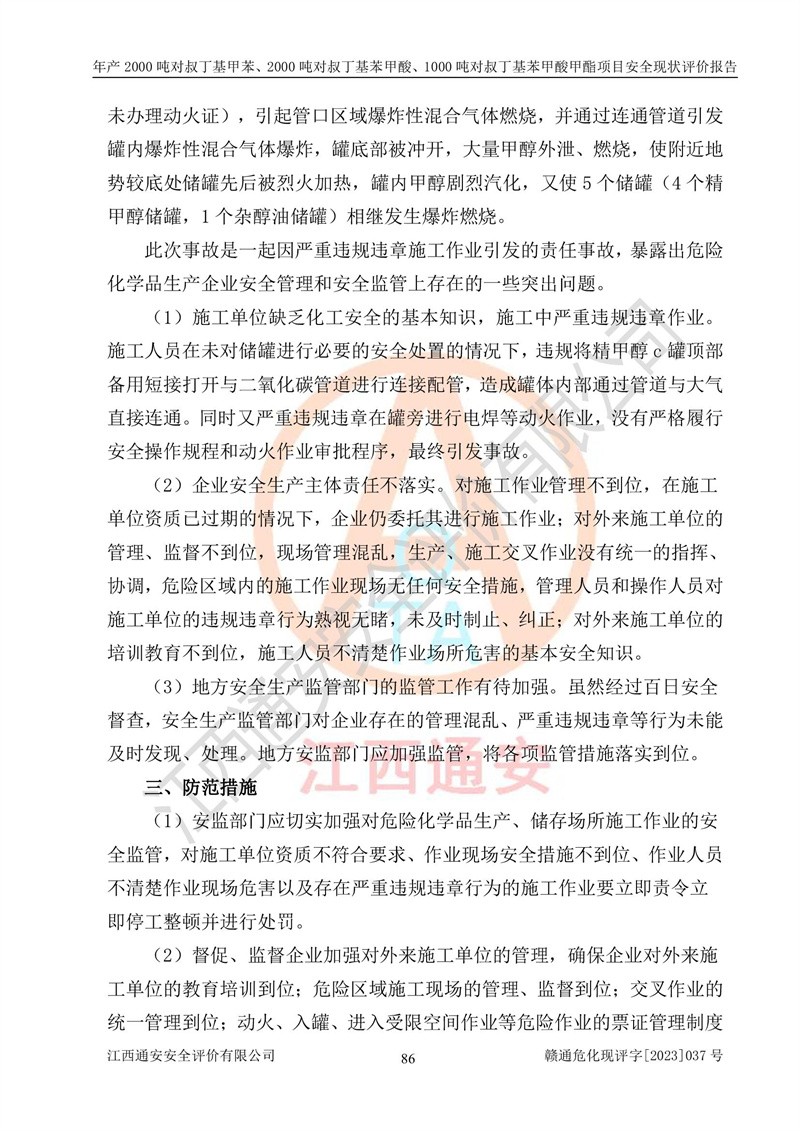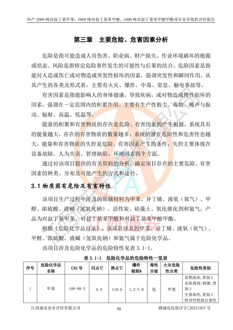 江西永通科技股份有限公司位于江西省贛州市寧都縣工業(yè)園,法定**人為劉忠春,成立于2009年09月25日,注冊(cè)資本玖仟陸佰肆拾陸萬(wàn)陸仟元整,營(yíng)業(yè)執(zhí)照經(jīng)營(yíng)范圍為化學(xué)原料藥、醫(yī)藥中間體等研發(fā)、生產(chǎn)、銷售等。 江西永通科技股份有限公司2020年10月26日取得了《安全生產(chǎn)許可證》,許可證編號(hào):(贛)WH安許證字[2011]0642號(hào),許可范圍為對(duì)叔丁基甲苯(2kt/a)、對(duì)叔丁基苯甲酸(2kt/a)、對(duì)叔丁基苯甲酸甲酯(1kt/a),**期:2020年10月26日至2023年10月25日。該公司2021年10月22日取得了安全生產(chǎn)標(biāo)準(zhǔn)化證書,證書編號(hào):贛市AQBWHⅢ[2021]168,**期至2024年10月21日。該公司現(xiàn)有員工133人,其中專職安全管理人員3人。 江西永通科技股份有限公司年產(chǎn)2000噸對(duì)叔丁基甲苯、2000噸對(duì)叔丁基苯甲酸、1000噸對(duì)叔丁基苯甲酸甲酯項(xiàng)目生產(chǎn)過(guò)程中涉及的原輔材料為甲苯、異丁烯、液氧(氧氣)、甲醇、濃硫酸、液堿(氫氧化鈉)、活性炭、硅藻土、氧化催化劑和氮?dú)?,產(chǎn)品為對(duì)叔丁基甲苯、對(duì)叔丁基苯甲酸和對(duì)叔丁基苯甲酸甲酯。根據(jù)《危險(xiǎn)化學(xué)品目錄》,該項(xiàng)目涉及的甲苯、異丁烯、液氧(氧氣)、甲醇、濃硫酸、液堿(氫氧化鈉)和氮?dú)鈱儆?/span>危險(xiǎn)化學(xué)品。經(jīng)辨識(shí),甲苯和甲醇屬于重點(diǎn)監(jiān)管的危險(xiǎn)化學(xué)品,甲苯和硫酸屬于第三類易制毒化學(xué)品、甲醇屬于特別管控的危險(xiǎn)化學(xué)品,不涉及監(jiān)控化學(xué)品、易制爆危險(xiǎn)化學(xué)品、劇毒化學(xué)品和高毒物品,儲(chǔ)罐區(qū)構(gòu)成三級(jí)重大危險(xiǎn)源,其他生產(chǎn)、儲(chǔ)存單元不構(gòu)成危險(xiǎn)化學(xué)品重大危險(xiǎn)源,涉及的烷基化反應(yīng)和氧化反應(yīng)屬于重點(diǎn)監(jiān)管的危險(xiǎn)化工工藝。根據(jù)《安全生產(chǎn)許可證條例》、《危險(xiǎn)化學(xué)品安全管理?xiàng)l例》和《危險(xiǎn)化學(xué)品生產(chǎn)企業(yè)安全生產(chǎn)許可實(shí)施辦法》的相關(guān)規(guī)定,該項(xiàng)目涉及甲苯回收,需要辦理危險(xiǎn)化學(xué)品安全生產(chǎn)許可證。根據(jù)生產(chǎn)工藝特點(diǎn)及物料的理化特性可知,該項(xiàng)目生產(chǎn)過(guò)程中存在火災(zāi)與爆炸、中毒與窒息、觸電、機(jī)械傷害等危險(xiǎn)有害因素。 該公司自2020年10月26日取得安全生產(chǎn)許可證以來(lái),生產(chǎn)運(yùn)行正常,未發(fā)生一般及以上生產(chǎn)安全事故。 |