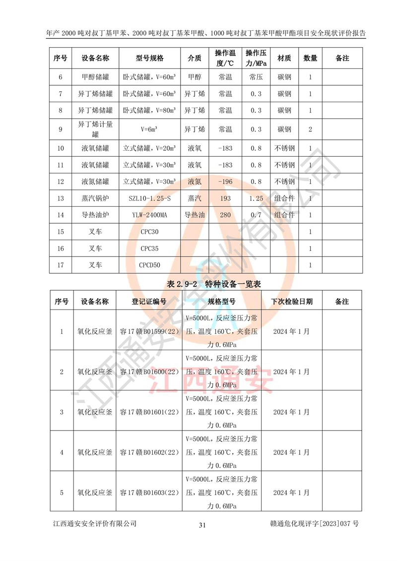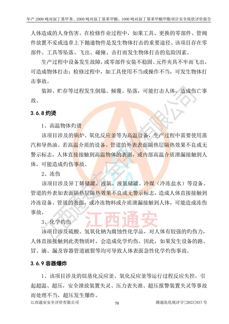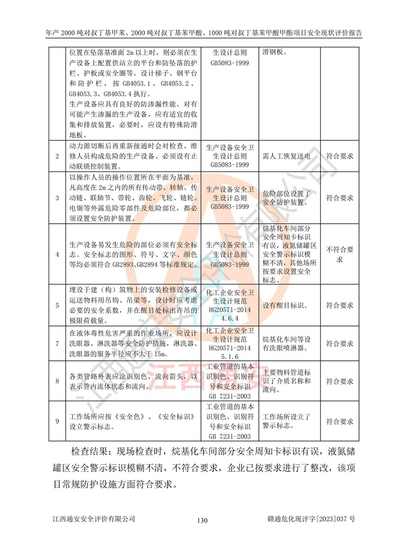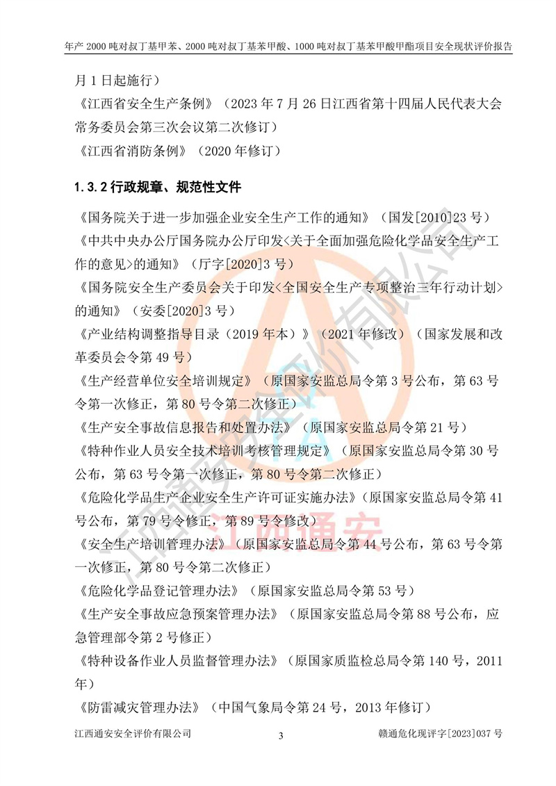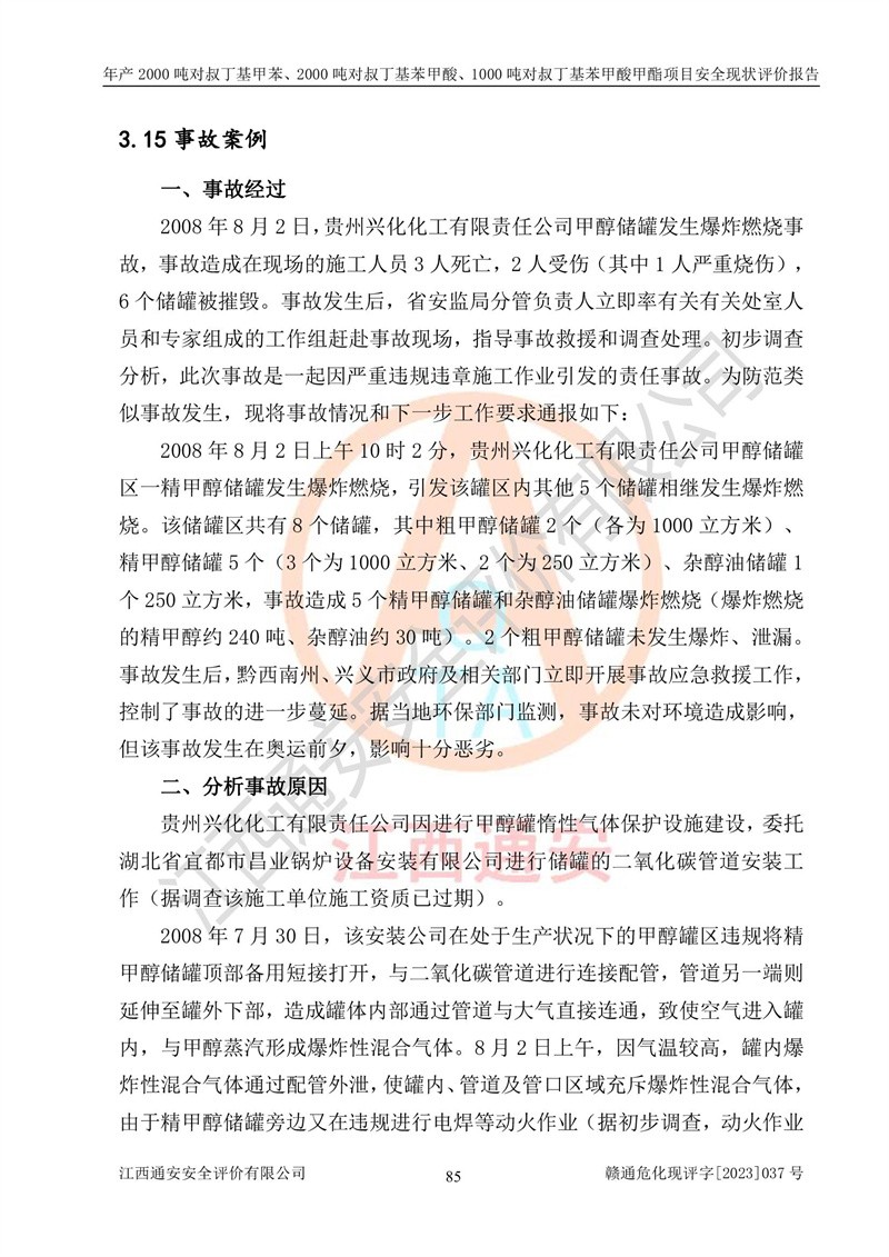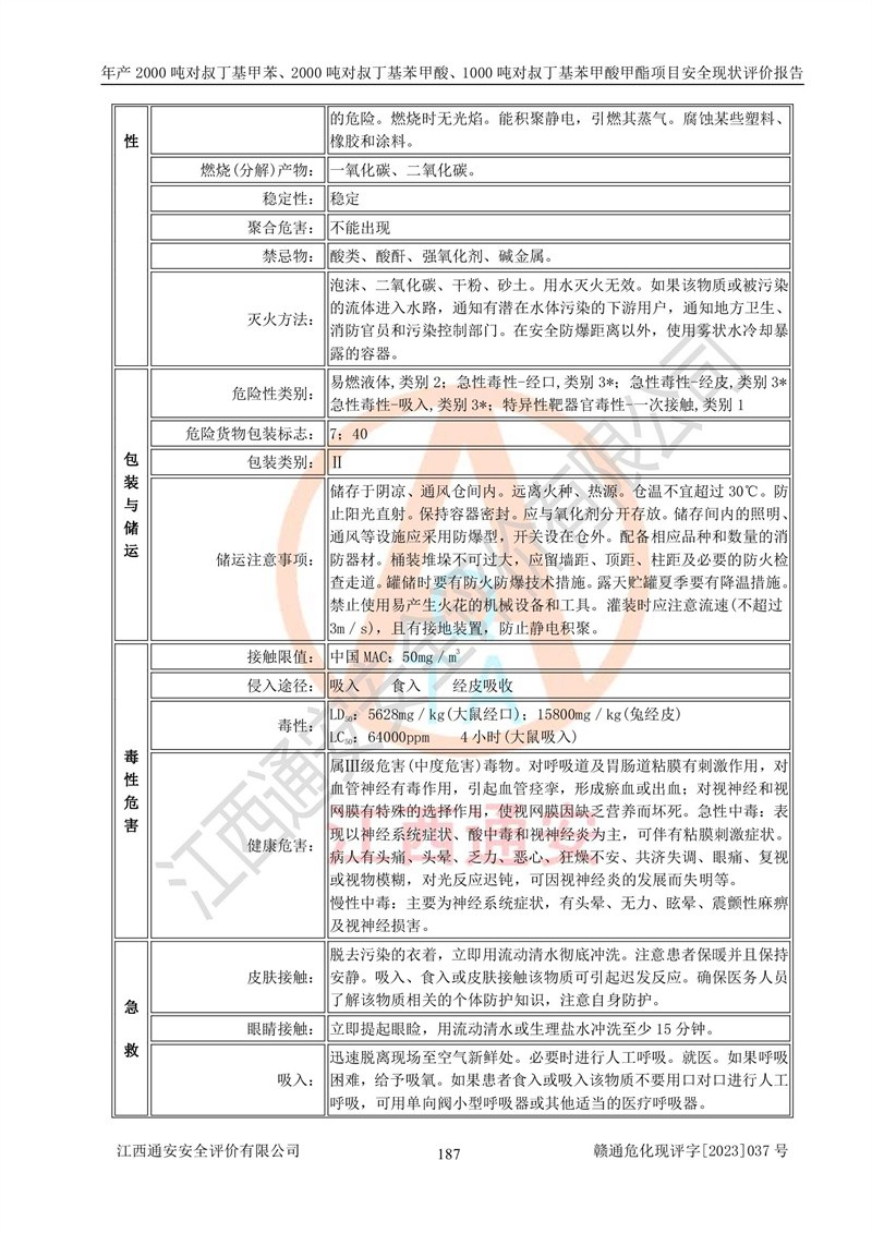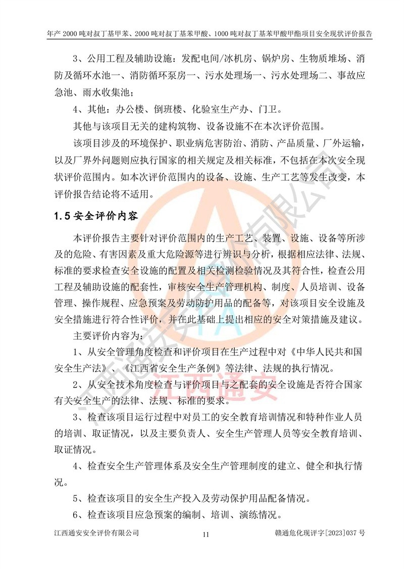 江西永通科技股份有限公司位于江西省贛州市寧都縣工業(yè)園,法定**人為劉忠春,成立于2009年09月25日,注冊(cè)資本玖仟陸佰肆拾陸萬(wàn)陸仟元整,營(yíng)業(yè)執(zhí)照經(jīng)營(yíng)范圍為化學(xué)原料藥、醫(yī)藥中間體等研發(fā)、生產(chǎn)、銷售等。 江西永通科技股份有限公司2020年10月26日取得了《安全生產(chǎn)許可證》,許可證編號(hào):(贛)WH安許證字[2011]0642號(hào),許可范圍為對(duì)叔丁基甲苯(2kt/a)、對(duì)叔丁基苯甲酸(2kt/a)、對(duì)叔丁基苯甲酸甲酯(1kt/a),**期:2020年10月26日至2023年10月25日。該公司2021年10月22日取得了安全生產(chǎn)標(biāo)準(zhǔn)化證書,證書編號(hào):贛市AQBWHⅢ[2021]168,**期至2024年10月21日。該公司現(xiàn)有員工133人,其中專職安全管理人員3人。 江西永通科技股份有限公司年產(chǎn)2000噸對(duì)叔丁基甲苯、2000噸對(duì)叔丁基苯甲酸、1000噸對(duì)叔丁基苯甲酸甲酯項(xiàng)目生產(chǎn)過(guò)程中涉及的原輔材料為甲苯、異丁烯、液氧(氧氣)、甲醇、濃硫酸、液堿(氫氧化鈉)、活性炭、硅藻土、氧化催化劑和氮?dú)?,產(chǎn)品為對(duì)叔丁基甲苯、對(duì)叔丁基苯甲酸和對(duì)叔丁基苯甲酸甲酯。根據(jù)《危險(xiǎn)化學(xué)品目錄》,該項(xiàng)目涉及的甲苯、異丁烯、液氧(氧氣)、甲醇、濃硫酸、液堿(氫氧化鈉)和氮?dú)鈱儆?/span>危險(xiǎn)化學(xué)品。經(jīng)辨識(shí),甲苯和甲醇屬于重點(diǎn)監(jiān)管的危險(xiǎn)化學(xué)品,甲苯和硫酸屬于第三類易制毒化學(xué)品、甲醇屬于特別管控的危險(xiǎn)化學(xué)品,不涉及監(jiān)控化學(xué)品、易制爆危險(xiǎn)化學(xué)品、劇毒化學(xué)品和高毒物品,儲(chǔ)罐區(qū)構(gòu)成三級(jí)重大危險(xiǎn)源,其他生產(chǎn)、儲(chǔ)存單元不構(gòu)成危險(xiǎn)化學(xué)品重大危險(xiǎn)源,涉及的烷基化反應(yīng)和氧化反應(yīng)屬于重點(diǎn)監(jiān)管的危險(xiǎn)化工工藝。根據(jù)《安全生產(chǎn)許可證條例》、《危險(xiǎn)化學(xué)品安全管理?xiàng)l例》和《危險(xiǎn)化學(xué)品生產(chǎn)企業(yè)安全生產(chǎn)許可實(shí)施辦法》的相關(guān)規(guī)定,該項(xiàng)目涉及甲苯回收,需要辦理危險(xiǎn)化學(xué)品安全生產(chǎn)許可證。根據(jù)生產(chǎn)工藝特點(diǎn)及物料的理化特性可知,該項(xiàng)目生產(chǎn)過(guò)程中存在火災(zāi)與爆炸、中毒與窒息、觸電、機(jī)械傷害等危險(xiǎn)有害因素。 該公司自2020年10月26日取得安全生產(chǎn)許可證以來(lái),生產(chǎn)運(yùn)行正常,未發(fā)生一般及以上生產(chǎn)安全事故。 |