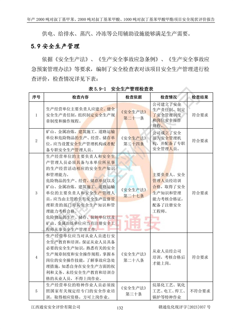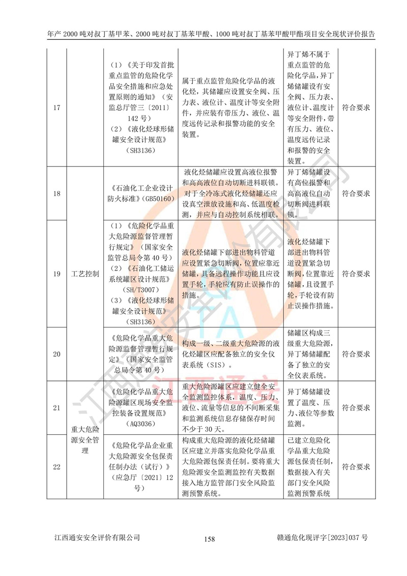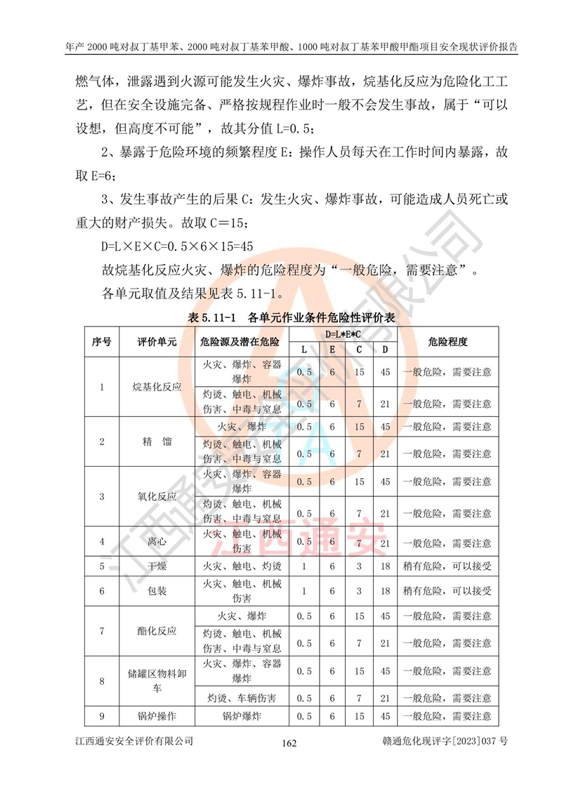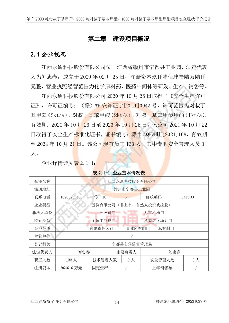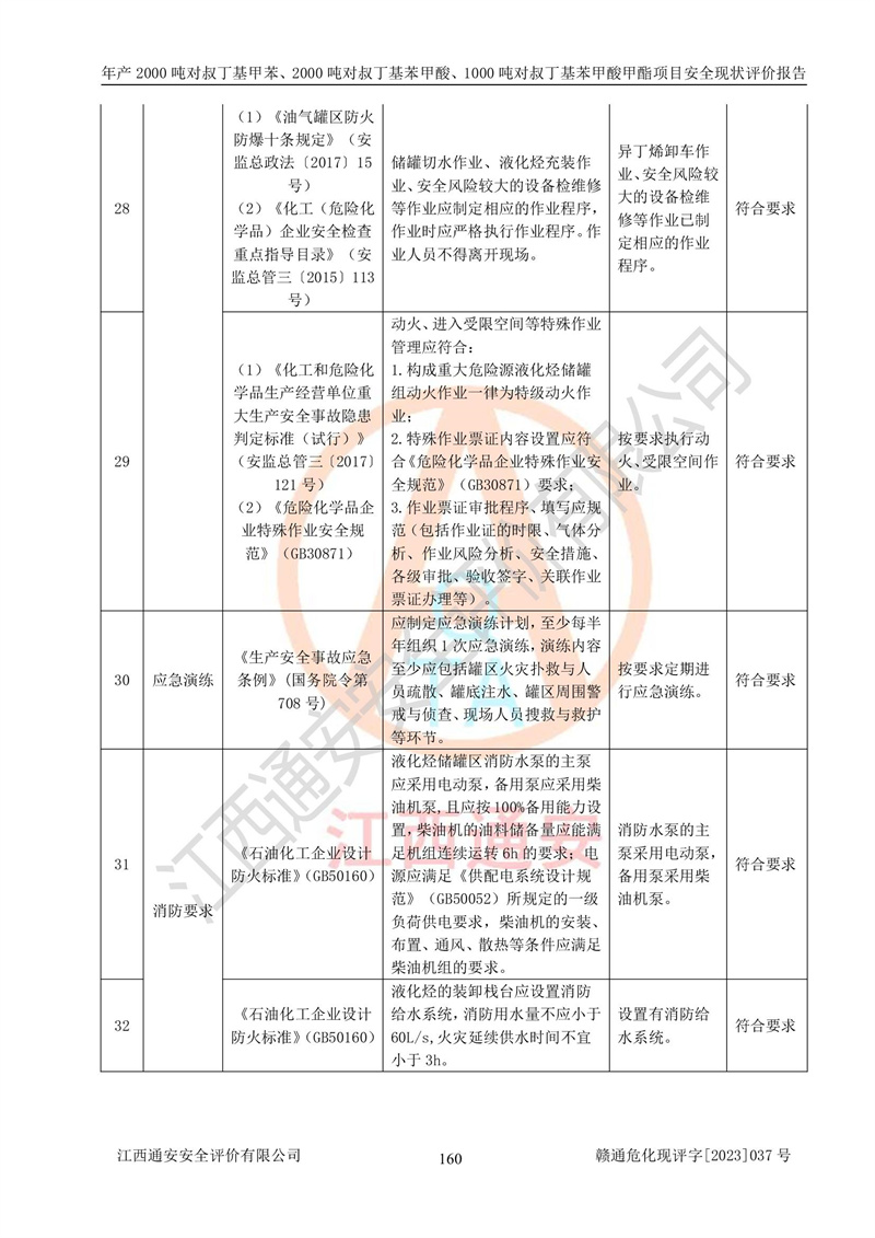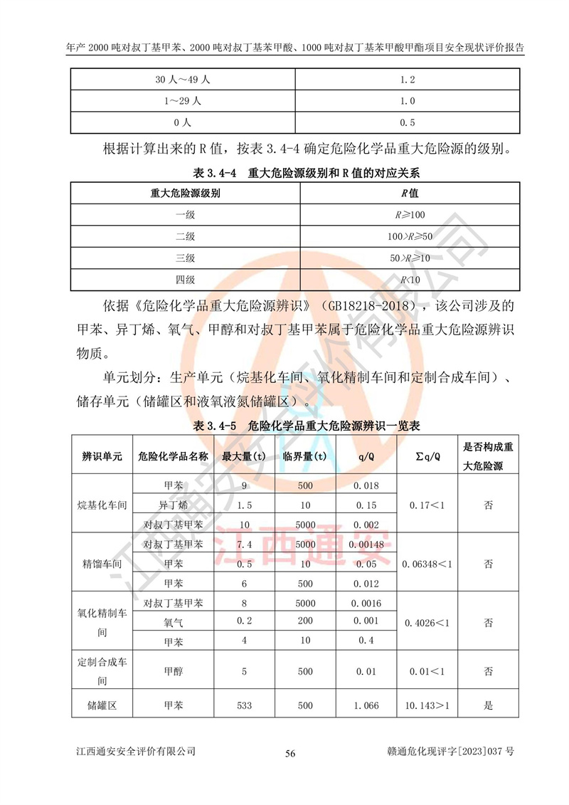 江西永通科技股份有限公司位于江西省贛州市寧都縣工業(yè)園,法定**人為劉忠春,成立于2009年09月25日,注冊(cè)資本玖仟陸佰肆拾陸萬(wàn)陸仟元整,營(yíng)業(yè)執(zhí)照經(jīng)營(yíng)范圍為化學(xué)原料藥、醫(yī)藥中間體等研發(fā)、生產(chǎn)、銷售等。 江西永通科技股份有限公司2020年10月26日取得了《安全生產(chǎn)許可證》,許可證編號(hào):(贛)WH安許證字[2011]0642號(hào),許可范圍為對(duì)叔丁基甲苯(2kt/a)、對(duì)叔丁基苯甲酸(2kt/a)、對(duì)叔丁基苯甲酸甲酯(1kt/a),**期:2020年10月26日至2023年10月25日。該公司2021年10月22日取得了安全生產(chǎn)標(biāo)準(zhǔn)化證書,證書編號(hào):贛市AQBWHⅢ[2021]168,**期至2024年10月21日。該公司現(xiàn)有員工133人,其中專職安全管理人員3人。 江西永通科技股份有限公司年產(chǎn)2000噸對(duì)叔丁基甲苯、2000噸對(duì)叔丁基苯甲酸、1000噸對(duì)叔丁基苯甲酸甲酯項(xiàng)目生產(chǎn)過(guò)程中涉及的原輔材料為甲苯、異丁烯、液氧(氧氣)、甲醇、濃硫酸、液堿(氫氧化鈉)、活性炭、硅藻土、氧化催化劑和氮?dú)?,產(chǎn)品為對(duì)叔丁基甲苯、對(duì)叔丁基苯甲酸和對(duì)叔丁基苯甲酸甲酯。根據(jù)《危險(xiǎn)化學(xué)品目錄》,該項(xiàng)目涉及的甲苯、異丁烯、液氧(氧氣)、甲醇、濃硫酸、液堿(氫氧化鈉)和氮?dú)鈱儆?/span>危險(xiǎn)化學(xué)品。經(jīng)辨識(shí),甲苯和甲醇屬于重點(diǎn)監(jiān)管的危險(xiǎn)化學(xué)品,甲苯和硫酸屬于第三類易制毒化學(xué)品、甲醇屬于特別管控的危險(xiǎn)化學(xué)品,不涉及監(jiān)控化學(xué)品、易制爆危險(xiǎn)化學(xué)品、劇毒化學(xué)品和高毒物品,儲(chǔ)罐區(qū)構(gòu)成三級(jí)重大危險(xiǎn)源,其他生產(chǎn)、儲(chǔ)存單元不構(gòu)成危險(xiǎn)化學(xué)品重大危險(xiǎn)源,涉及的烷基化反應(yīng)和氧化反應(yīng)屬于重點(diǎn)監(jiān)管的危險(xiǎn)化工工藝。根據(jù)《安全生產(chǎn)許可證條例》、《危險(xiǎn)化學(xué)品安全管理?xiàng)l例》和《危險(xiǎn)化學(xué)品生產(chǎn)企業(yè)安全生產(chǎn)許可實(shí)施辦法》的相關(guān)規(guī)定,該項(xiàng)目涉及甲苯回收,需要辦理危險(xiǎn)化學(xué)品安全生產(chǎn)許可證。根據(jù)生產(chǎn)工藝特點(diǎn)及物料的理化特性可知,該項(xiàng)目生產(chǎn)過(guò)程中存在火災(zāi)與爆炸、中毒與窒息、觸電、機(jī)械傷害等危險(xiǎn)有害因素。 該公司自2020年10月26日取得安全生產(chǎn)許可證以來(lái),生產(chǎn)運(yùn)行正常,未發(fā)生一般及以上生產(chǎn)安全事故。 |