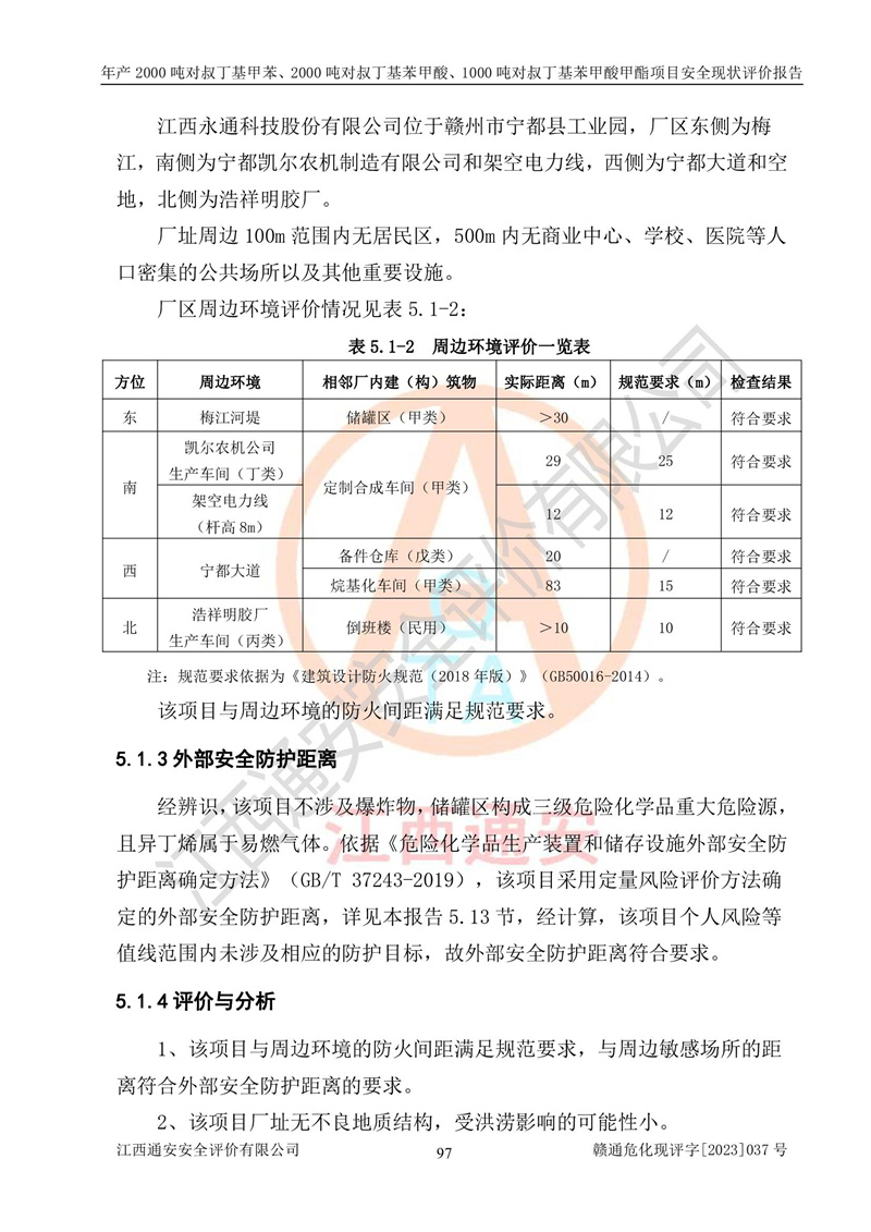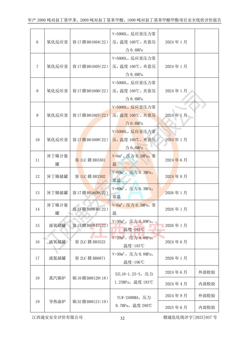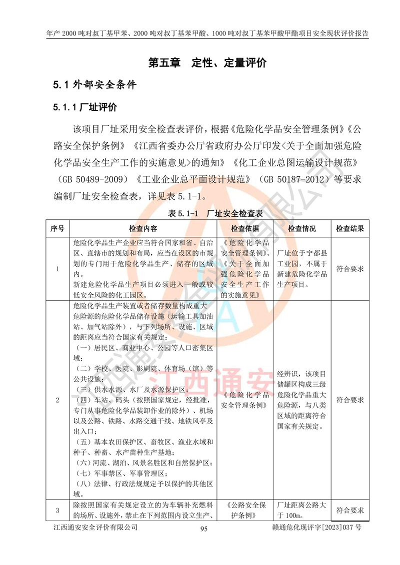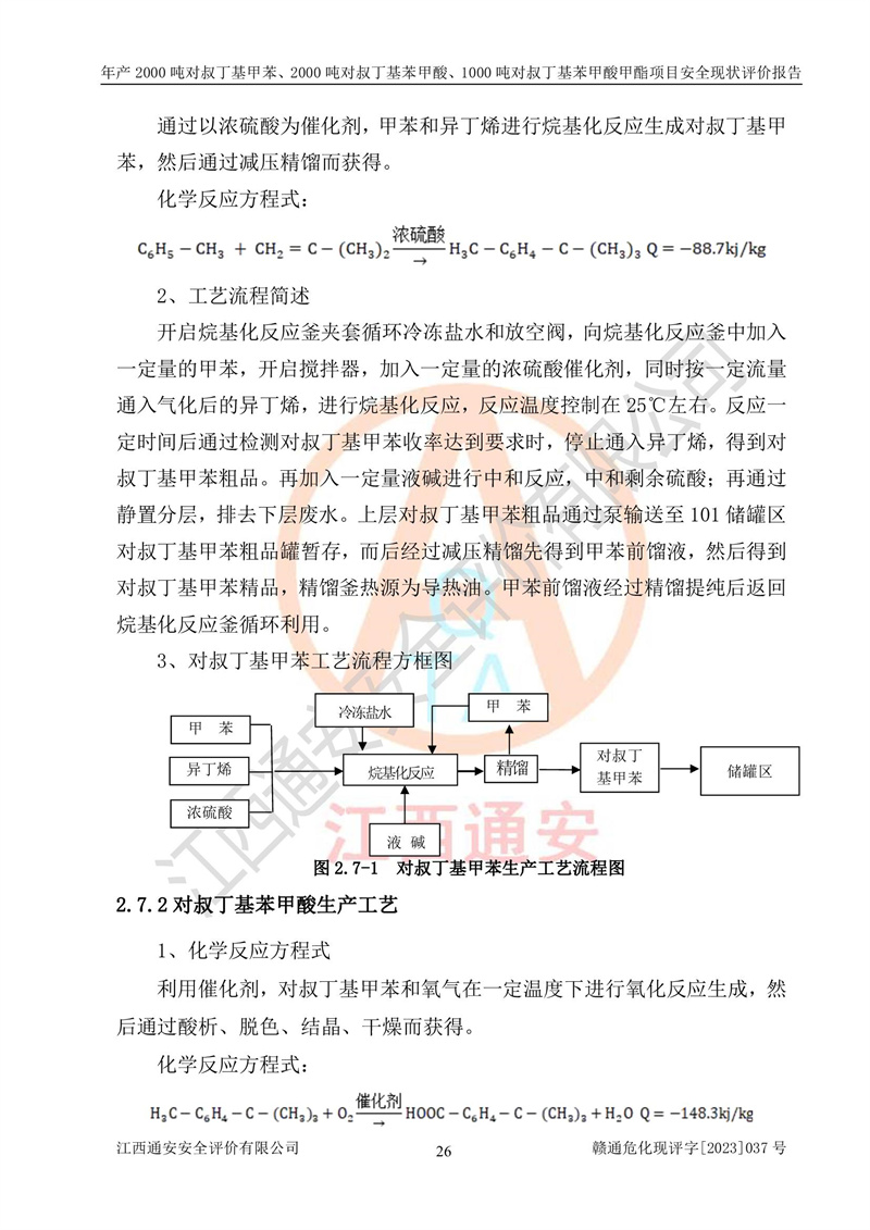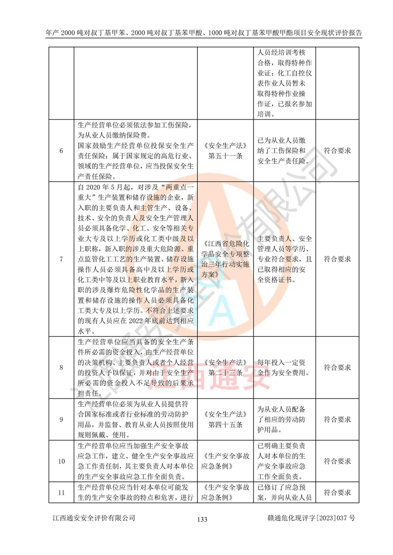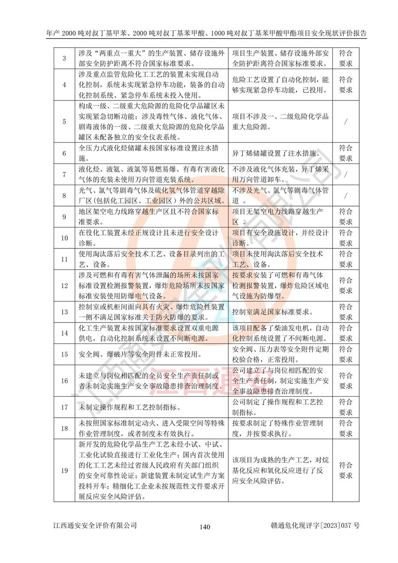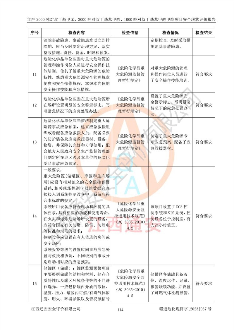 江西永通科技股份有限公司位于江西省贛州市寧都縣工業(yè)園,法定**人為劉忠春,成立于2009年09月25日,注冊(cè)資本玖仟陸佰肆拾陸萬(wàn)陸仟元整,營(yíng)業(yè)執(zhí)照經(jīng)營(yíng)范圍為化學(xué)原料藥、醫(yī)藥中間體等研發(fā)、生產(chǎn)、銷售等。 江西永通科技股份有限公司2020年10月26日取得了《安全生產(chǎn)許可證》,許可證編號(hào):(贛)WH安許證字[2011]0642號(hào),許可范圍為對(duì)叔丁基甲苯(2kt/a)、對(duì)叔丁基苯甲酸(2kt/a)、對(duì)叔丁基苯甲酸甲酯(1kt/a),**期:2020年10月26日至2023年10月25日。該公司2021年10月22日取得了安全生產(chǎn)標(biāo)準(zhǔn)化證書,證書編號(hào):贛市AQBWHⅢ[2021]168,**期至2024年10月21日。該公司現(xiàn)有員工133人,其中專職安全管理人員3人。 江西永通科技股份有限公司年產(chǎn)2000噸對(duì)叔丁基甲苯、2000噸對(duì)叔丁基苯甲酸、1000噸對(duì)叔丁基苯甲酸甲酯項(xiàng)目生產(chǎn)過(guò)程中涉及的原輔材料為甲苯、異丁烯、液氧(氧氣)、甲醇、濃硫酸、液堿(氫氧化鈉)、活性炭、硅藻土、氧化催化劑和氮?dú)?,產(chǎn)品為對(duì)叔丁基甲苯、對(duì)叔丁基苯甲酸和對(duì)叔丁基苯甲酸甲酯。根據(jù)《危險(xiǎn)化學(xué)品目錄》,該項(xiàng)目涉及的甲苯、異丁烯、液氧(氧氣)、甲醇、濃硫酸、液堿(氫氧化鈉)和氮?dú)鈱儆?/span>危險(xiǎn)化學(xué)品。經(jīng)辨識(shí),甲苯和甲醇屬于重點(diǎn)監(jiān)管的危險(xiǎn)化學(xué)品,甲苯和硫酸屬于第三類易制毒化學(xué)品、甲醇屬于特別管控的危險(xiǎn)化學(xué)品,不涉及監(jiān)控化學(xué)品、易制爆危險(xiǎn)化學(xué)品、劇毒化學(xué)品和高毒物品,儲(chǔ)罐區(qū)構(gòu)成三級(jí)重大危險(xiǎn)源,其他生產(chǎn)、儲(chǔ)存單元不構(gòu)成危險(xiǎn)化學(xué)品重大危險(xiǎn)源,涉及的烷基化反應(yīng)和氧化反應(yīng)屬于重點(diǎn)監(jiān)管的危險(xiǎn)化工工藝。根據(jù)《安全生產(chǎn)許可證條例》、《危險(xiǎn)化學(xué)品安全管理?xiàng)l例》和《危險(xiǎn)化學(xué)品生產(chǎn)企業(yè)安全生產(chǎn)許可實(shí)施辦法》的相關(guān)規(guī)定,該項(xiàng)目涉及甲苯回收,需要辦理危險(xiǎn)化學(xué)品安全生產(chǎn)許可證。根據(jù)生產(chǎn)工藝特點(diǎn)及物料的理化特性可知,該項(xiàng)目生產(chǎn)過(guò)程中存在火災(zāi)與爆炸、中毒與窒息、觸電、機(jī)械傷害等危險(xiǎn)有害因素。 該公司自2020年10月26日取得安全生產(chǎn)許可證以來(lái),生產(chǎn)運(yùn)行正常,未發(fā)生一般及以上生產(chǎn)安全事故。 |