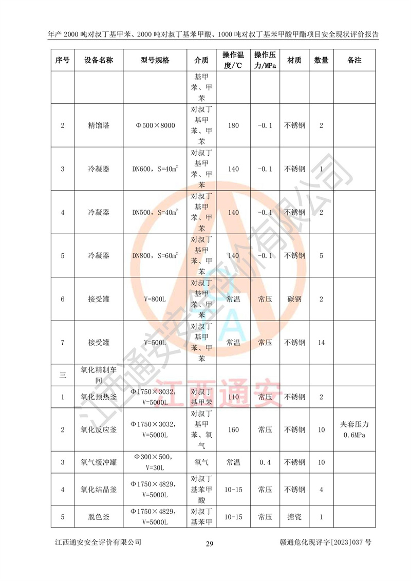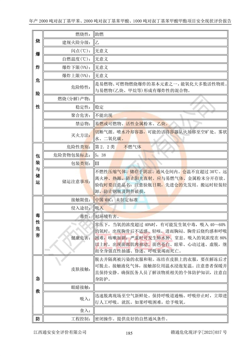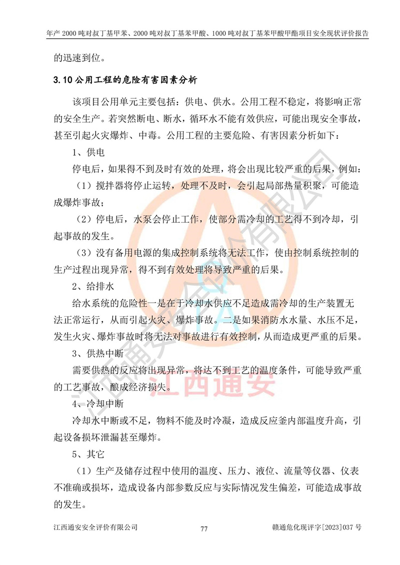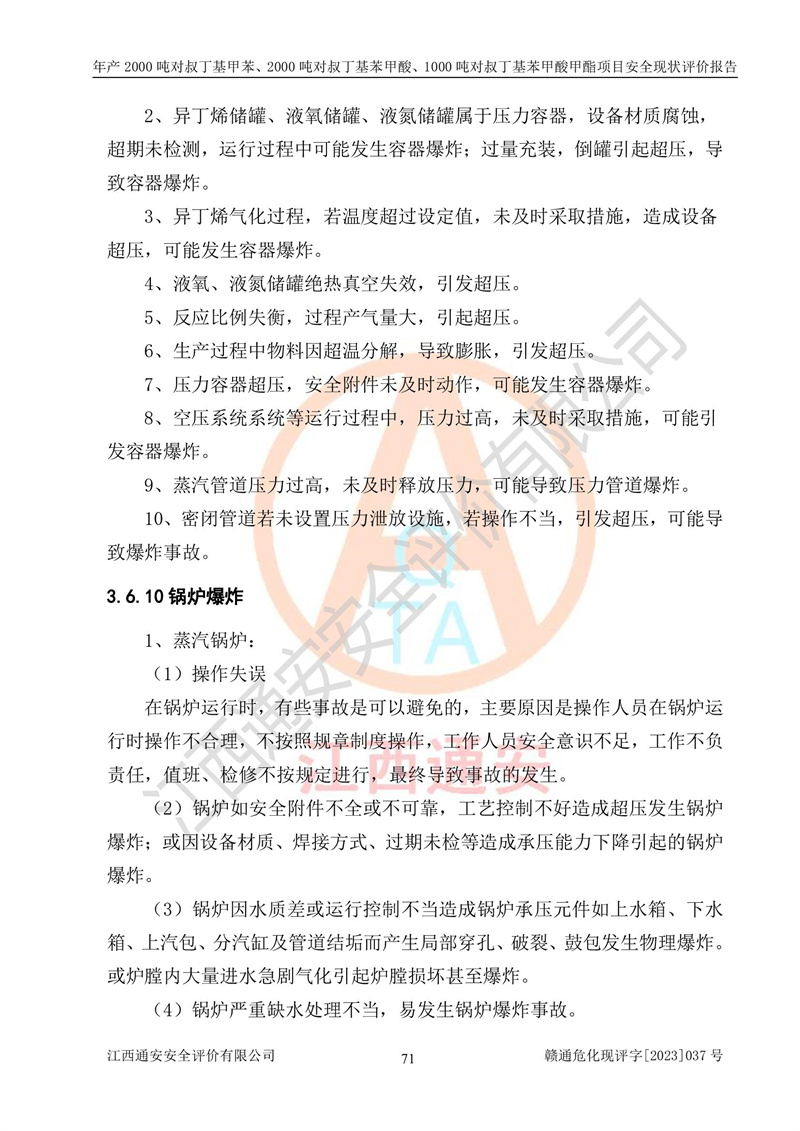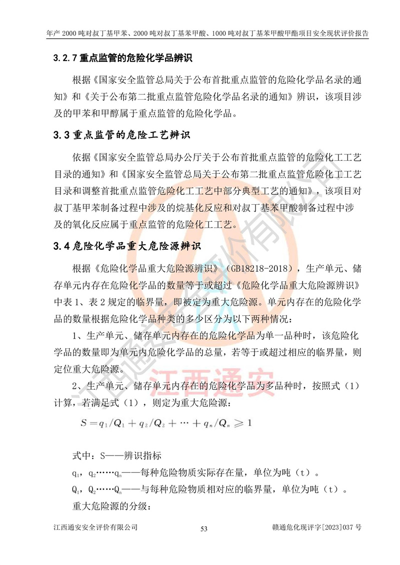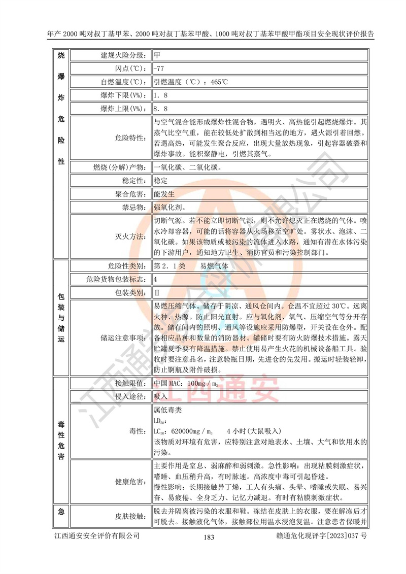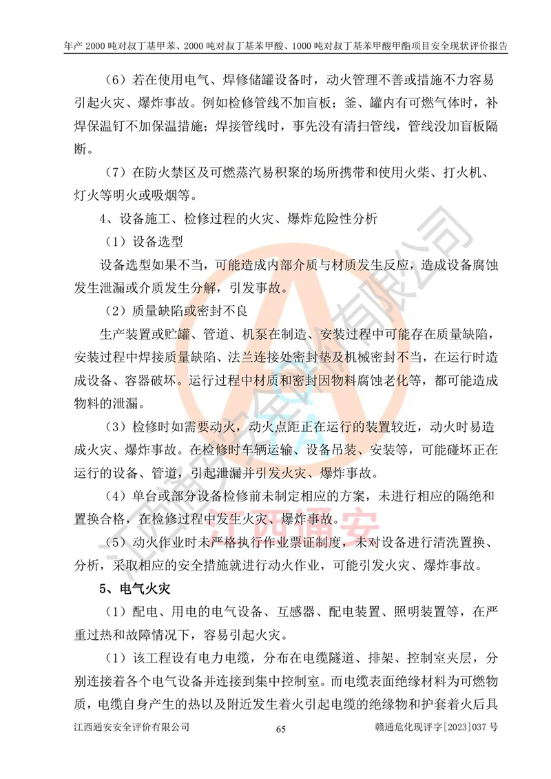 江西永通科技股份有限公司位于江西省贛州市寧都縣工業(yè)園,法定**人為劉忠春,成立于2009年09月25日,注冊(cè)資本玖仟陸佰肆拾陸萬(wàn)陸仟元整,營(yíng)業(yè)執(zhí)照經(jīng)營(yíng)范圍為化學(xué)原料藥、醫(yī)藥中間體等研發(fā)、生產(chǎn)、銷售等。 江西永通科技股份有限公司2020年10月26日取得了《安全生產(chǎn)許可證》,許可證編號(hào):(贛)WH安許證字[2011]0642號(hào),許可范圍為對(duì)叔丁基甲苯(2kt/a)、對(duì)叔丁基苯甲酸(2kt/a)、對(duì)叔丁基苯甲酸甲酯(1kt/a),**期:2020年10月26日至2023年10月25日。該公司2021年10月22日取得了安全生產(chǎn)標(biāo)準(zhǔn)化證書,證書編號(hào):贛市AQBWHⅢ[2021]168,**期至2024年10月21日。該公司現(xiàn)有員工133人,其中專職安全管理人員3人。 江西永通科技股份有限公司年產(chǎn)2000噸對(duì)叔丁基甲苯、2000噸對(duì)叔丁基苯甲酸、1000噸對(duì)叔丁基苯甲酸甲酯項(xiàng)目生產(chǎn)過(guò)程中涉及的原輔材料為甲苯、異丁烯、液氧(氧氣)、甲醇、濃硫酸、液堿(氫氧化鈉)、活性炭、硅藻土、氧化催化劑和氮?dú)?,產(chǎn)品為對(duì)叔丁基甲苯、對(duì)叔丁基苯甲酸和對(duì)叔丁基苯甲酸甲酯。根據(jù)《危險(xiǎn)化學(xué)品目錄》,該項(xiàng)目涉及的甲苯、異丁烯、液氧(氧氣)、甲醇、濃硫酸、液堿(氫氧化鈉)和氮?dú)鈱儆?/span>危險(xiǎn)化學(xué)品。經(jīng)辨識(shí),甲苯和甲醇屬于重點(diǎn)監(jiān)管的危險(xiǎn)化學(xué)品,甲苯和硫酸屬于第三類易制毒化學(xué)品、甲醇屬于特別管控的危險(xiǎn)化學(xué)品,不涉及監(jiān)控化學(xué)品、易制爆危險(xiǎn)化學(xué)品、劇毒化學(xué)品和高毒物品,儲(chǔ)罐區(qū)構(gòu)成三級(jí)重大危險(xiǎn)源,其他生產(chǎn)、儲(chǔ)存單元不構(gòu)成危險(xiǎn)化學(xué)品重大危險(xiǎn)源,涉及的烷基化反應(yīng)和氧化反應(yīng)屬于重點(diǎn)監(jiān)管的危險(xiǎn)化工工藝。根據(jù)《安全生產(chǎn)許可證條例》、《危險(xiǎn)化學(xué)品安全管理?xiàng)l例》和《危險(xiǎn)化學(xué)品生產(chǎn)企業(yè)安全生產(chǎn)許可實(shí)施辦法》的相關(guān)規(guī)定,該項(xiàng)目涉及甲苯回收,需要辦理危險(xiǎn)化學(xué)品安全生產(chǎn)許可證。根據(jù)生產(chǎn)工藝特點(diǎn)及物料的理化特性可知,該項(xiàng)目生產(chǎn)過(guò)程中存在火災(zāi)與爆炸、中毒與窒息、觸電、機(jī)械傷害等危險(xiǎn)有害因素。 該公司自2020年10月26日取得安全生產(chǎn)許可證以來(lái),生產(chǎn)運(yùn)行正常,未發(fā)生一般及以上生產(chǎn)安全事故。 |