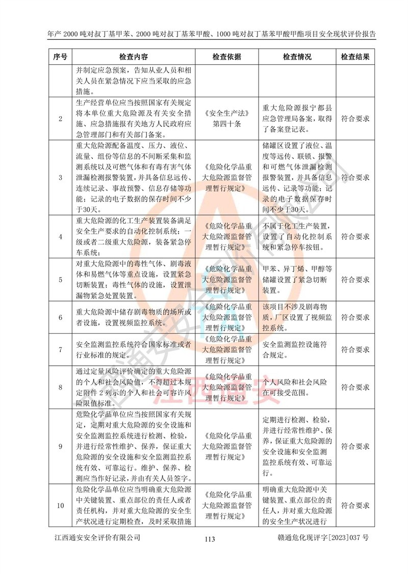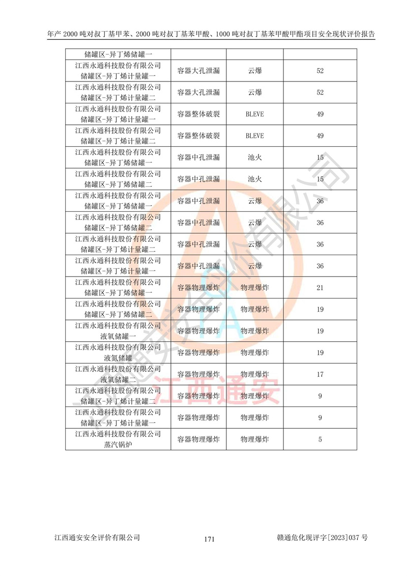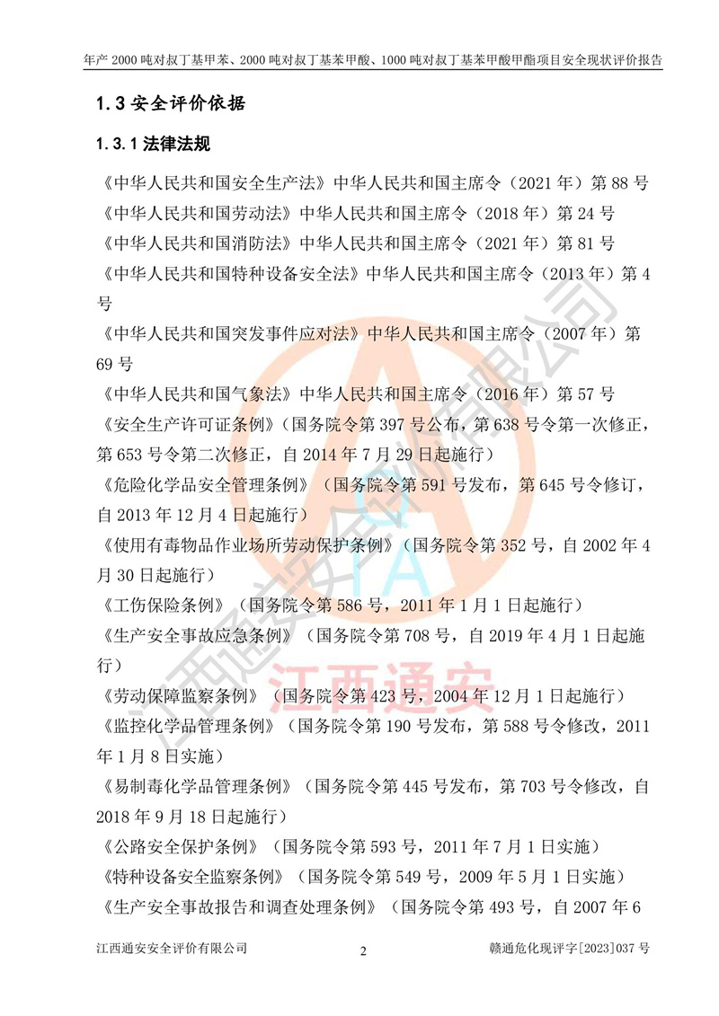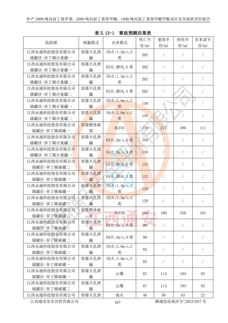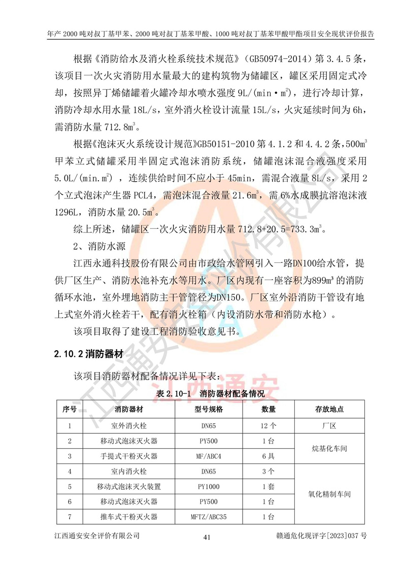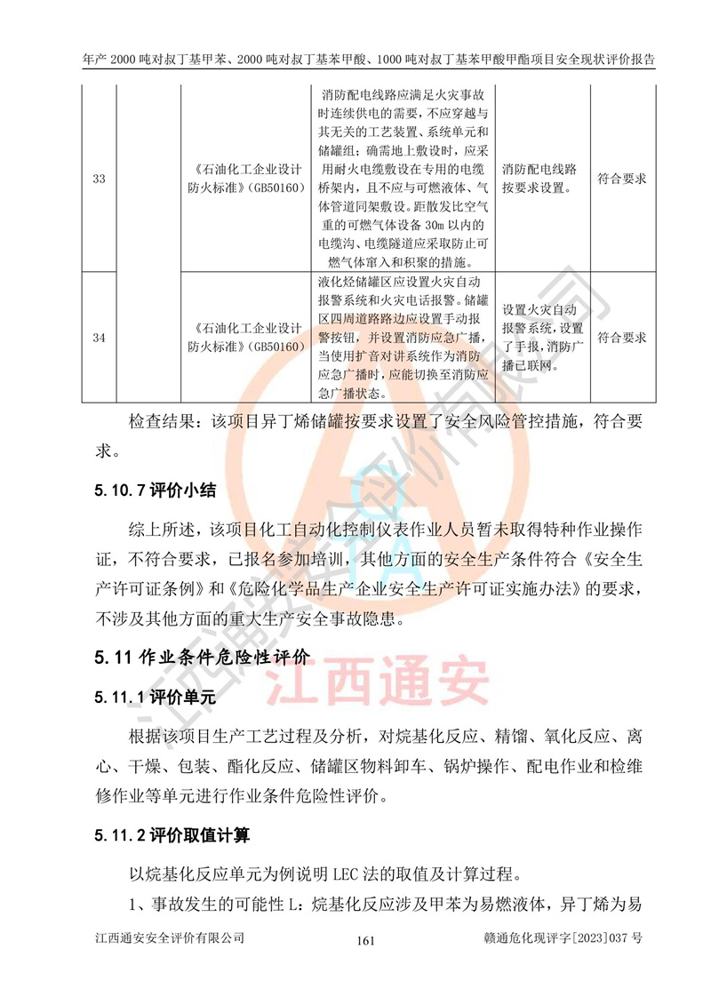 江西永通科技股份有限公司位于江西省贛州市寧都縣工業(yè)園,法定**人為劉忠春,成立于2009年09月25日,注冊(cè)資本玖仟陸佰肆拾陸萬(wàn)陸仟元整,營(yíng)業(yè)執(zhí)照經(jīng)營(yíng)范圍為化學(xué)原料藥、醫(yī)藥中間體等研發(fā)、生產(chǎn)、銷售等。 江西永通科技股份有限公司2020年10月26日取得了《安全生產(chǎn)許可證》,許可證編號(hào):(贛)WH安許證字[2011]0642號(hào),許可范圍為對(duì)叔丁基甲苯(2kt/a)、對(duì)叔丁基苯甲酸(2kt/a)、對(duì)叔丁基苯甲酸甲酯(1kt/a),**期:2020年10月26日至2023年10月25日。該公司2021年10月22日取得了安全生產(chǎn)標(biāo)準(zhǔn)化證書,證書編號(hào):贛市AQBWHⅢ[2021]168,**期至2024年10月21日。該公司現(xiàn)有員工133人,其中專職安全管理人員3人。 江西永通科技股份有限公司年產(chǎn)2000噸對(duì)叔丁基甲苯、2000噸對(duì)叔丁基苯甲酸、1000噸對(duì)叔丁基苯甲酸甲酯項(xiàng)目生產(chǎn)過(guò)程中涉及的原輔材料為甲苯、異丁烯、液氧(氧氣)、甲醇、濃硫酸、液堿(氫氧化鈉)、活性炭、硅藻土、氧化催化劑和氮?dú)?,產(chǎn)品為對(duì)叔丁基甲苯、對(duì)叔丁基苯甲酸和對(duì)叔丁基苯甲酸甲酯。根據(jù)《危險(xiǎn)化學(xué)品目錄》,該項(xiàng)目涉及的甲苯、異丁烯、液氧(氧氣)、甲醇、濃硫酸、液堿(氫氧化鈉)和氮?dú)鈱儆?/span>危險(xiǎn)化學(xué)品。經(jīng)辨識(shí),甲苯和甲醇屬于重點(diǎn)監(jiān)管的危險(xiǎn)化學(xué)品,甲苯和硫酸屬于第三類易制毒化學(xué)品、甲醇屬于特別管控的危險(xiǎn)化學(xué)品,不涉及監(jiān)控化學(xué)品、易制爆危險(xiǎn)化學(xué)品、劇毒化學(xué)品和高毒物品,儲(chǔ)罐區(qū)構(gòu)成三級(jí)重大危險(xiǎn)源,其他生產(chǎn)、儲(chǔ)存單元不構(gòu)成危險(xiǎn)化學(xué)品重大危險(xiǎn)源,涉及的烷基化反應(yīng)和氧化反應(yīng)屬于重點(diǎn)監(jiān)管的危險(xiǎn)化工工藝。根據(jù)《安全生產(chǎn)許可證條例》、《危險(xiǎn)化學(xué)品安全管理?xiàng)l例》和《危險(xiǎn)化學(xué)品生產(chǎn)企業(yè)安全生產(chǎn)許可實(shí)施辦法》的相關(guān)規(guī)定,該項(xiàng)目涉及甲苯回收,需要辦理危險(xiǎn)化學(xué)品安全生產(chǎn)許可證。根據(jù)生產(chǎn)工藝特點(diǎn)及物料的理化特性可知,該項(xiàng)目生產(chǎn)過(guò)程中存在火災(zāi)與爆炸、中毒與窒息、觸電、機(jī)械傷害等危險(xiǎn)有害因素。 該公司自2020年10月26日取得安全生產(chǎn)許可證以來(lái),生產(chǎn)運(yùn)行正常,未發(fā)生一般及以上生產(chǎn)安全事故。 |