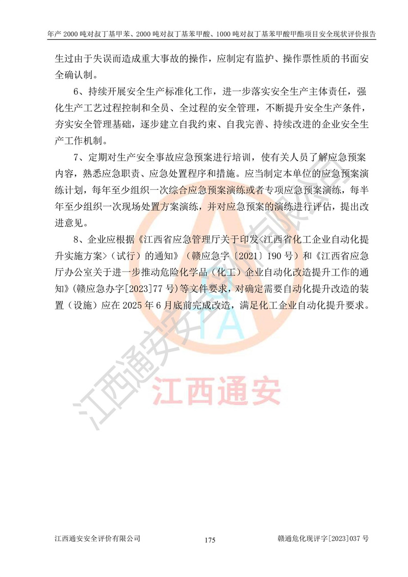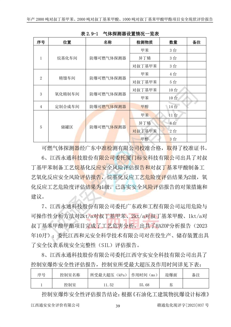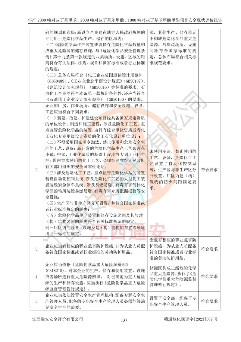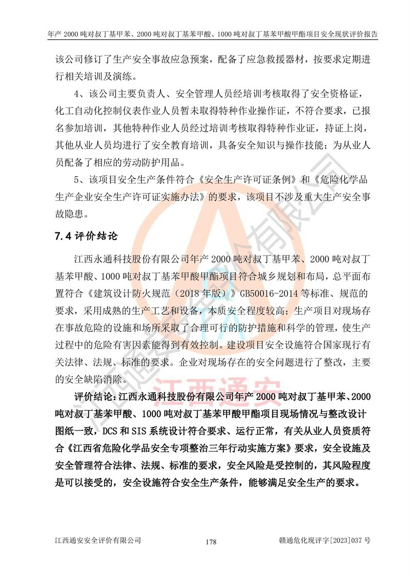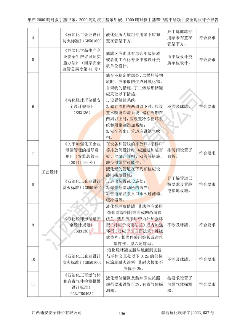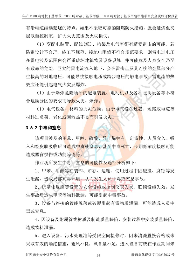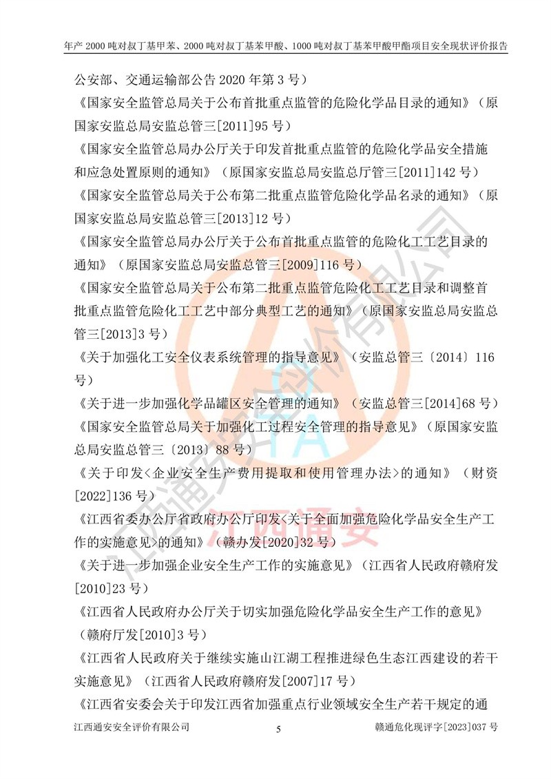 江西永通科技股份有限公司位于江西省贛州市寧都縣工業(yè)園,法定**人為劉忠春,成立于2009年09月25日,注冊(cè)資本玖仟陸佰肆拾陸萬(wàn)陸仟元整,營(yíng)業(yè)執(zhí)照經(jīng)營(yíng)范圍為化學(xué)原料藥、醫(yī)藥中間體等研發(fā)、生產(chǎn)、銷售等。 江西永通科技股份有限公司2020年10月26日取得了《安全生產(chǎn)許可證》,許可證編號(hào):(贛)WH安許證字[2011]0642號(hào),許可范圍為對(duì)叔丁基甲苯(2kt/a)、對(duì)叔丁基苯甲酸(2kt/a)、對(duì)叔丁基苯甲酸甲酯(1kt/a),**期:2020年10月26日至2023年10月25日。該公司2021年10月22日取得了安全生產(chǎn)標(biāo)準(zhǔn)化證書,證書編號(hào):贛市AQBWHⅢ[2021]168,**期至2024年10月21日。該公司現(xiàn)有員工133人,其中專職安全管理人員3人。 江西永通科技股份有限公司年產(chǎn)2000噸對(duì)叔丁基甲苯、2000噸對(duì)叔丁基苯甲酸、1000噸對(duì)叔丁基苯甲酸甲酯項(xiàng)目生產(chǎn)過(guò)程中涉及的原輔材料為甲苯、異丁烯、液氧(氧氣)、甲醇、濃硫酸、液堿(氫氧化鈉)、活性炭、硅藻土、氧化催化劑和氮?dú)?,產(chǎn)品為對(duì)叔丁基甲苯、對(duì)叔丁基苯甲酸和對(duì)叔丁基苯甲酸甲酯。根據(jù)《危險(xiǎn)化學(xué)品目錄》,該項(xiàng)目涉及的甲苯、異丁烯、液氧(氧氣)、甲醇、濃硫酸、液堿(氫氧化鈉)和氮?dú)鈱儆?/span>危險(xiǎn)化學(xué)品。經(jīng)辨識(shí),甲苯和甲醇屬于重點(diǎn)監(jiān)管的危險(xiǎn)化學(xué)品,甲苯和硫酸屬于第三類易制毒化學(xué)品、甲醇屬于特別管控的危險(xiǎn)化學(xué)品,不涉及監(jiān)控化學(xué)品、易制爆危險(xiǎn)化學(xué)品、劇毒化學(xué)品和高毒物品,儲(chǔ)罐區(qū)構(gòu)成三級(jí)重大危險(xiǎn)源,其他生產(chǎn)、儲(chǔ)存單元不構(gòu)成危險(xiǎn)化學(xué)品重大危險(xiǎn)源,涉及的烷基化反應(yīng)和氧化反應(yīng)屬于重點(diǎn)監(jiān)管的危險(xiǎn)化工工藝。根據(jù)《安全生產(chǎn)許可證條例》、《危險(xiǎn)化學(xué)品安全管理?xiàng)l例》和《危險(xiǎn)化學(xué)品生產(chǎn)企業(yè)安全生產(chǎn)許可實(shí)施辦法》的相關(guān)規(guī)定,該項(xiàng)目涉及甲苯回收,需要辦理危險(xiǎn)化學(xué)品安全生產(chǎn)許可證。根據(jù)生產(chǎn)工藝特點(diǎn)及物料的理化特性可知,該項(xiàng)目生產(chǎn)過(guò)程中存在火災(zāi)與爆炸、中毒與窒息、觸電、機(jī)械傷害等危險(xiǎn)有害因素。 該公司自2020年10月26日取得安全生產(chǎn)許可證以來(lái),生產(chǎn)運(yùn)行正常,未發(fā)生一般及以上生產(chǎn)安全事故。 |