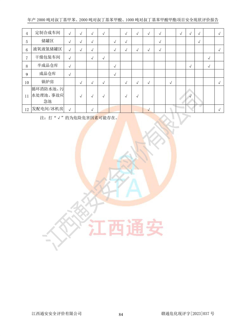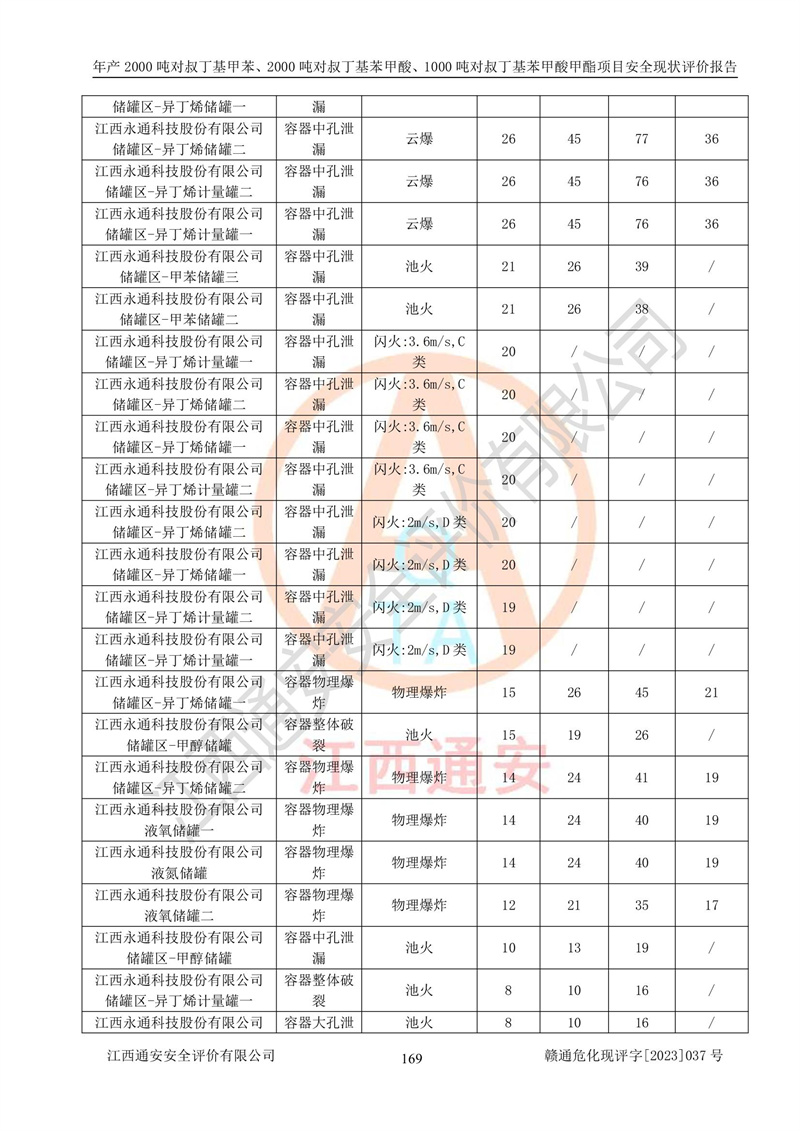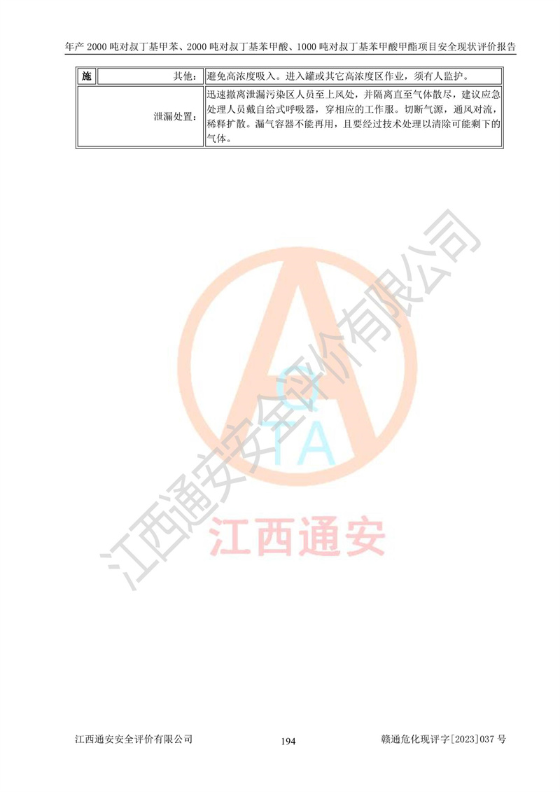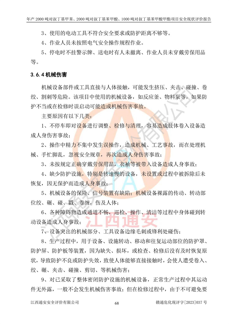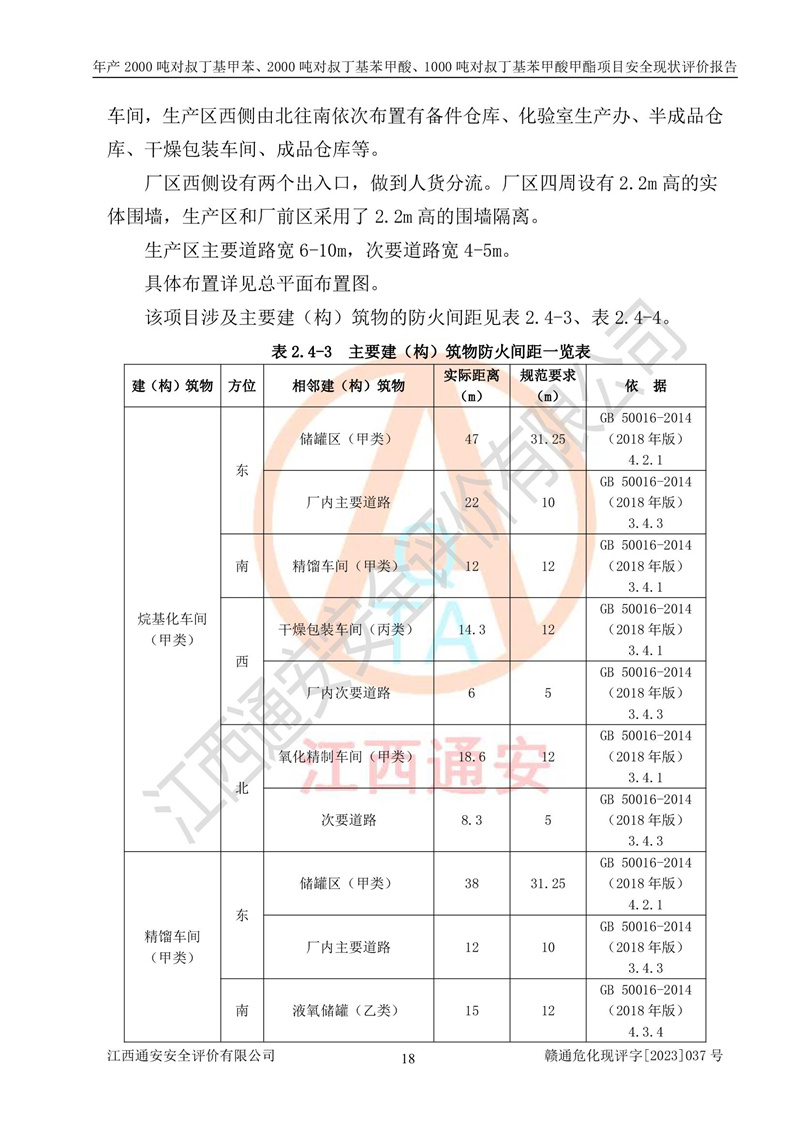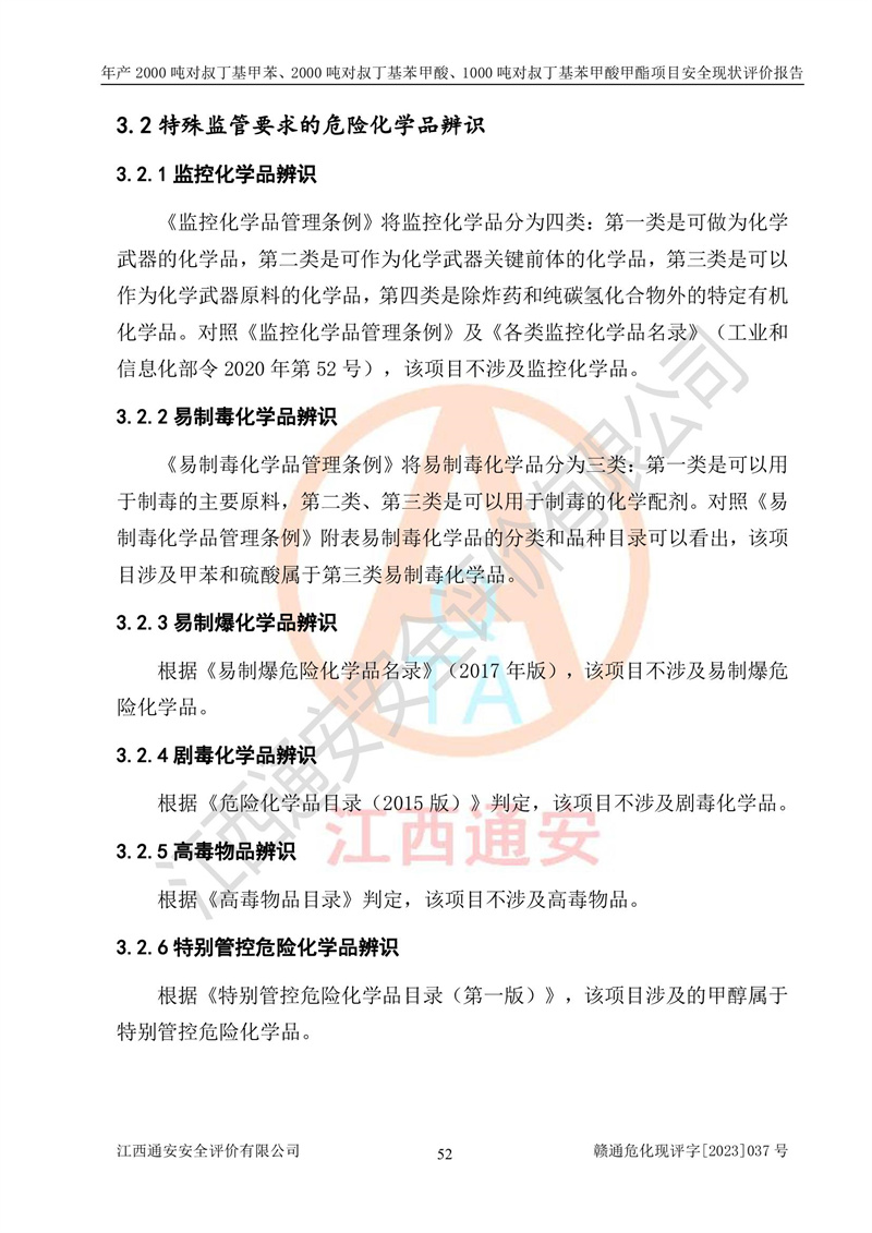 江西永通科技股份有限公司位于江西省贛州市寧都縣工業(yè)園,法定**人為劉忠春,成立于2009年09月25日,注冊(cè)資本玖仟陸佰肆拾陸萬(wàn)陸仟元整,營(yíng)業(yè)執(zhí)照經(jīng)營(yíng)范圍為化學(xué)原料藥、醫(yī)藥中間體等研發(fā)、生產(chǎn)、銷售等。 江西永通科技股份有限公司2020年10月26日取得了《安全生產(chǎn)許可證》,許可證編號(hào):(贛)WH安許證字[2011]0642號(hào),許可范圍為對(duì)叔丁基甲苯(2kt/a)、對(duì)叔丁基苯甲酸(2kt/a)、對(duì)叔丁基苯甲酸甲酯(1kt/a),**期:2020年10月26日至2023年10月25日。該公司2021年10月22日取得了安全生產(chǎn)標(biāo)準(zhǔn)化證書,證書編號(hào):贛市AQBWHⅢ[2021]168,**期至2024年10月21日。該公司現(xiàn)有員工133人,其中專職安全管理人員3人。 江西永通科技股份有限公司年產(chǎn)2000噸對(duì)叔丁基甲苯、2000噸對(duì)叔丁基苯甲酸、1000噸對(duì)叔丁基苯甲酸甲酯項(xiàng)目生產(chǎn)過(guò)程中涉及的原輔材料為甲苯、異丁烯、液氧(氧氣)、甲醇、濃硫酸、液堿(氫氧化鈉)、活性炭、硅藻土、氧化催化劑和氮?dú)?,產(chǎn)品為對(duì)叔丁基甲苯、對(duì)叔丁基苯甲酸和對(duì)叔丁基苯甲酸甲酯。根據(jù)《危險(xiǎn)化學(xué)品目錄》,該項(xiàng)目涉及的甲苯、異丁烯、液氧(氧氣)、甲醇、濃硫酸、液堿(氫氧化鈉)和氮?dú)鈱儆?/span>危險(xiǎn)化學(xué)品。經(jīng)辨識(shí),甲苯和甲醇屬于重點(diǎn)監(jiān)管的危險(xiǎn)化學(xué)品,甲苯和硫酸屬于第三類易制毒化學(xué)品、甲醇屬于特別管控的危險(xiǎn)化學(xué)品,不涉及監(jiān)控化學(xué)品、易制爆危險(xiǎn)化學(xué)品、劇毒化學(xué)品和高毒物品,儲(chǔ)罐區(qū)構(gòu)成三級(jí)重大危險(xiǎn)源,其他生產(chǎn)、儲(chǔ)存單元不構(gòu)成危險(xiǎn)化學(xué)品重大危險(xiǎn)源,涉及的烷基化反應(yīng)和氧化反應(yīng)屬于重點(diǎn)監(jiān)管的危險(xiǎn)化工工藝。根據(jù)《安全生產(chǎn)許可證條例》、《危險(xiǎn)化學(xué)品安全管理?xiàng)l例》和《危險(xiǎn)化學(xué)品生產(chǎn)企業(yè)安全生產(chǎn)許可實(shí)施辦法》的相關(guān)規(guī)定,該項(xiàng)目涉及甲苯回收,需要辦理危險(xiǎn)化學(xué)品安全生產(chǎn)許可證。根據(jù)生產(chǎn)工藝特點(diǎn)及物料的理化特性可知,該項(xiàng)目生產(chǎn)過(guò)程中存在火災(zāi)與爆炸、中毒與窒息、觸電、機(jī)械傷害等危險(xiǎn)有害因素。 該公司自2020年10月26日取得安全生產(chǎn)許可證以來(lái),生產(chǎn)運(yùn)行正常,未發(fā)生一般及以上生產(chǎn)安全事故。 |