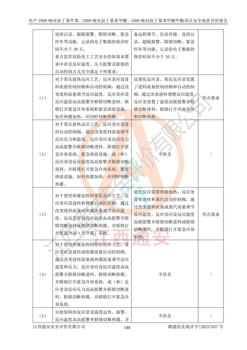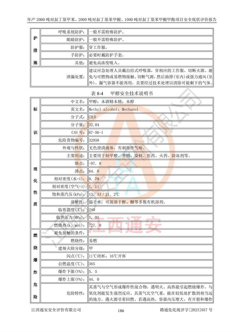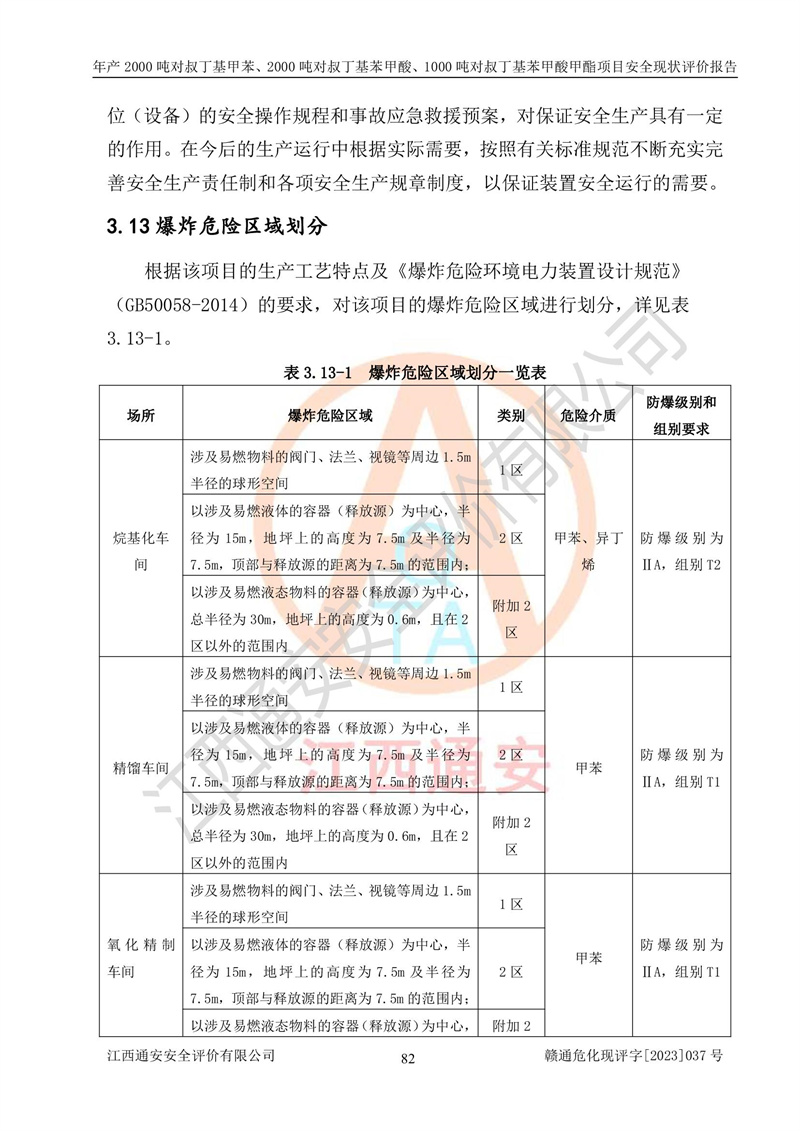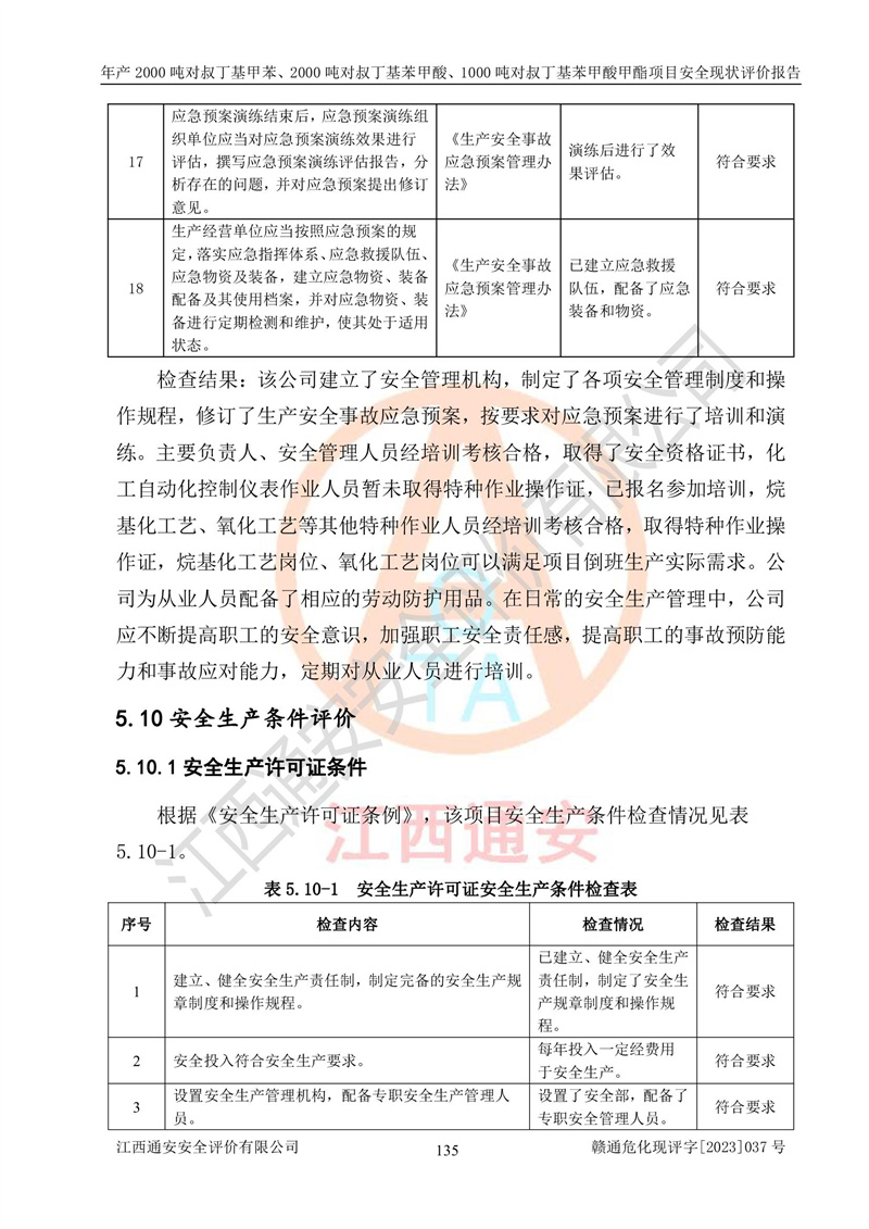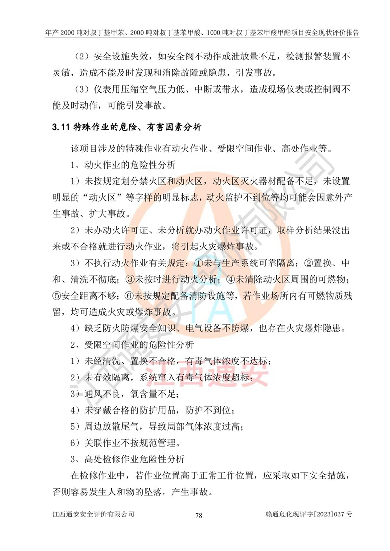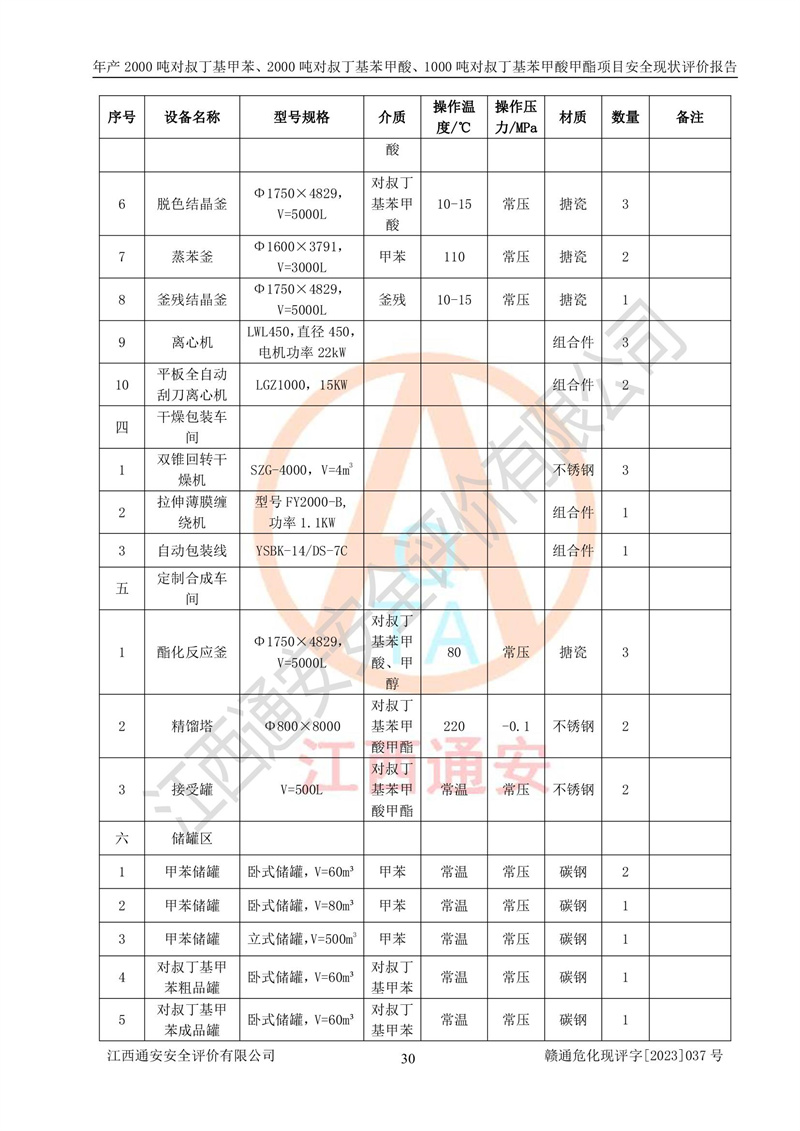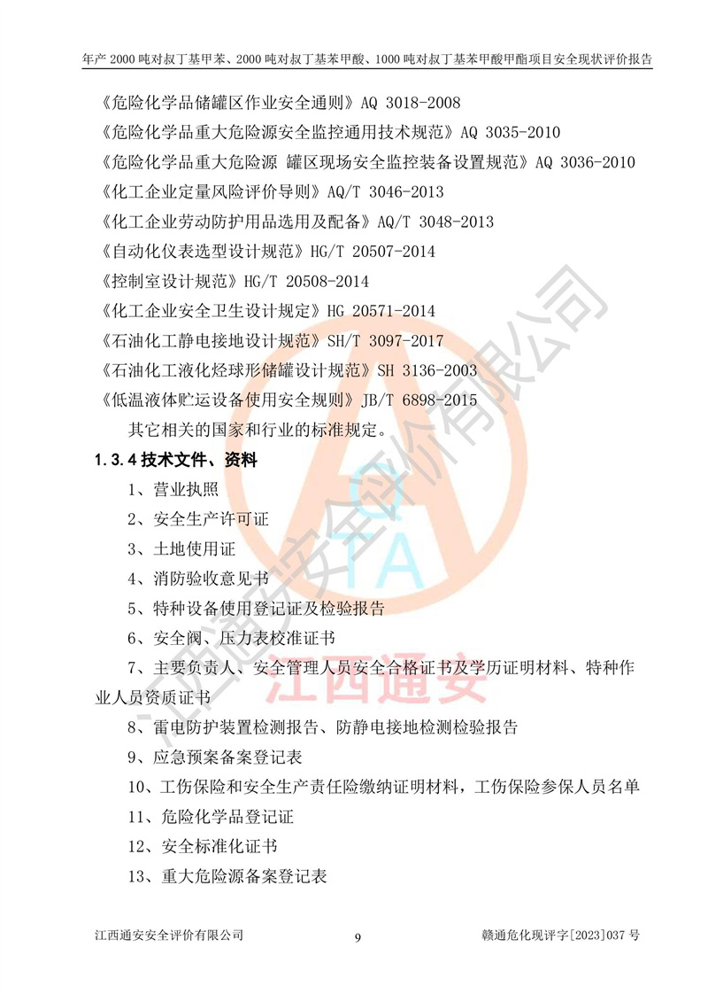 江西永通科技股份有限公司位于江西省贛州市寧都縣工業(yè)園,法定**人為劉忠春,成立于2009年09月25日,注冊(cè)資本玖仟陸佰肆拾陸萬(wàn)陸仟元整,營(yíng)業(yè)執(zhí)照經(jīng)營(yíng)范圍為化學(xué)原料藥、醫(yī)藥中間體等研發(fā)、生產(chǎn)、銷售等。 江西永通科技股份有限公司2020年10月26日取得了《安全生產(chǎn)許可證》,許可證編號(hào):(贛)WH安許證字[2011]0642號(hào),許可范圍為對(duì)叔丁基甲苯(2kt/a)、對(duì)叔丁基苯甲酸(2kt/a)、對(duì)叔丁基苯甲酸甲酯(1kt/a),**期:2020年10月26日至2023年10月25日。該公司2021年10月22日取得了安全生產(chǎn)標(biāo)準(zhǔn)化證書,證書編號(hào):贛市AQBWHⅢ[2021]168,**期至2024年10月21日。該公司現(xiàn)有員工133人,其中專職安全管理人員3人。 江西永通科技股份有限公司年產(chǎn)2000噸對(duì)叔丁基甲苯、2000噸對(duì)叔丁基苯甲酸、1000噸對(duì)叔丁基苯甲酸甲酯項(xiàng)目生產(chǎn)過(guò)程中涉及的原輔材料為甲苯、異丁烯、液氧(氧氣)、甲醇、濃硫酸、液堿(氫氧化鈉)、活性炭、硅藻土、氧化催化劑和氮?dú)?,產(chǎn)品為對(duì)叔丁基甲苯、對(duì)叔丁基苯甲酸和對(duì)叔丁基苯甲酸甲酯。根據(jù)《危險(xiǎn)化學(xué)品目錄》,該項(xiàng)目涉及的甲苯、異丁烯、液氧(氧氣)、甲醇、濃硫酸、液堿(氫氧化鈉)和氮?dú)鈱儆?/span>危險(xiǎn)化學(xué)品。經(jīng)辨識(shí),甲苯和甲醇屬于重點(diǎn)監(jiān)管的危險(xiǎn)化學(xué)品,甲苯和硫酸屬于第三類易制毒化學(xué)品、甲醇屬于特別管控的危險(xiǎn)化學(xué)品,不涉及監(jiān)控化學(xué)品、易制爆危險(xiǎn)化學(xué)品、劇毒化學(xué)品和高毒物品,儲(chǔ)罐區(qū)構(gòu)成三級(jí)重大危險(xiǎn)源,其他生產(chǎn)、儲(chǔ)存單元不構(gòu)成危險(xiǎn)化學(xué)品重大危險(xiǎn)源,涉及的烷基化反應(yīng)和氧化反應(yīng)屬于重點(diǎn)監(jiān)管的危險(xiǎn)化工工藝。根據(jù)《安全生產(chǎn)許可證條例》、《危險(xiǎn)化學(xué)品安全管理?xiàng)l例》和《危險(xiǎn)化學(xué)品生產(chǎn)企業(yè)安全生產(chǎn)許可實(shí)施辦法》的相關(guān)規(guī)定,該項(xiàng)目涉及甲苯回收,需要辦理危險(xiǎn)化學(xué)品安全生產(chǎn)許可證。根據(jù)生產(chǎn)工藝特點(diǎn)及物料的理化特性可知,該項(xiàng)目生產(chǎn)過(guò)程中存在火災(zāi)與爆炸、中毒與窒息、觸電、機(jī)械傷害等危險(xiǎn)有害因素。 該公司自2020年10月26日取得安全生產(chǎn)許可證以來(lái),生產(chǎn)運(yùn)行正常,未發(fā)生一般及以上生產(chǎn)安全事故。 |