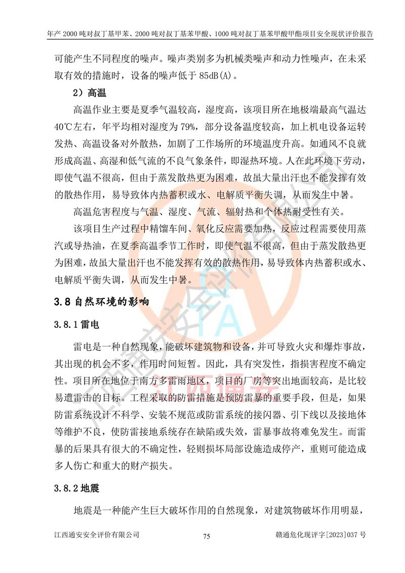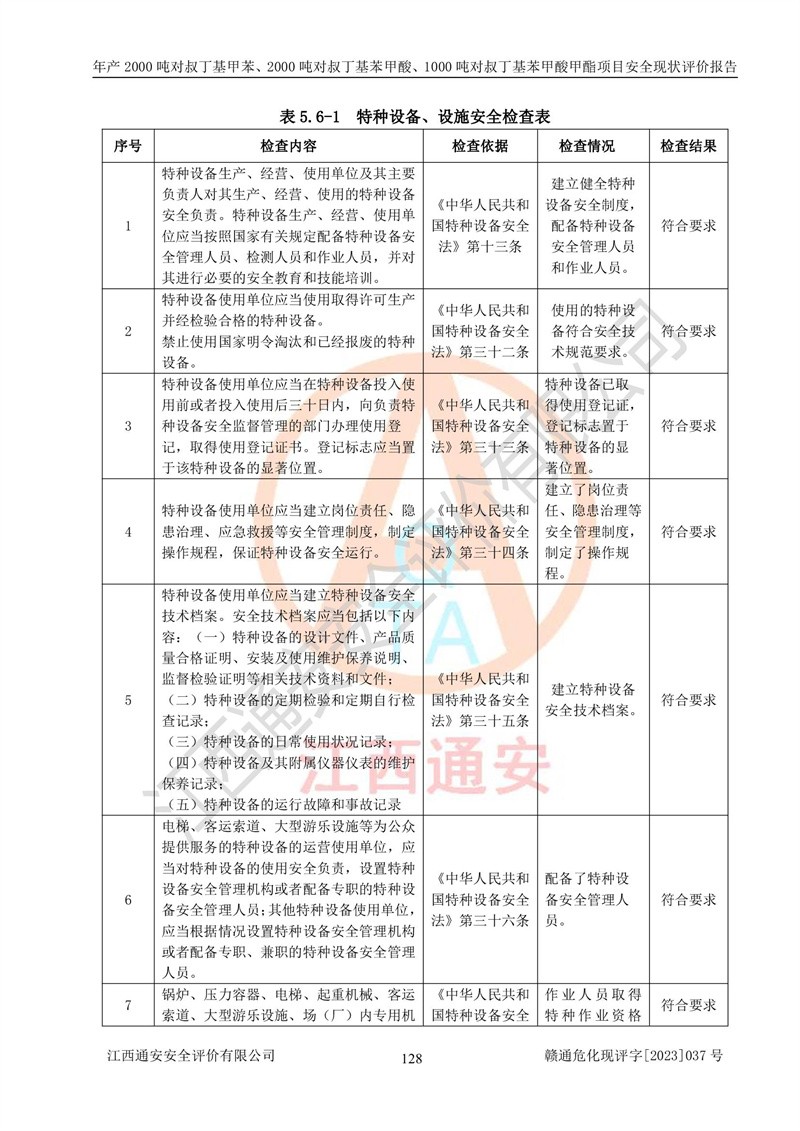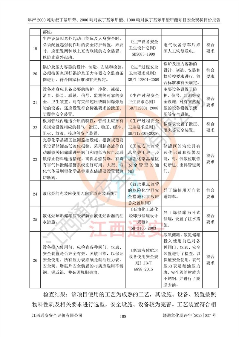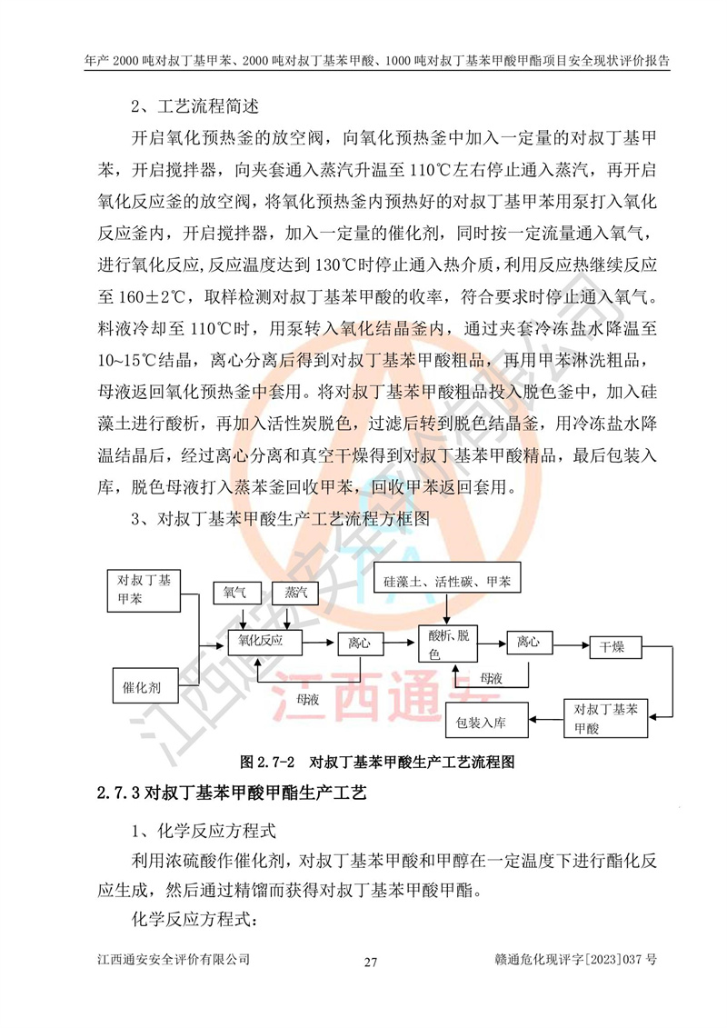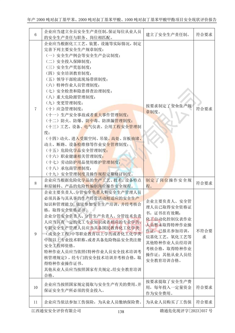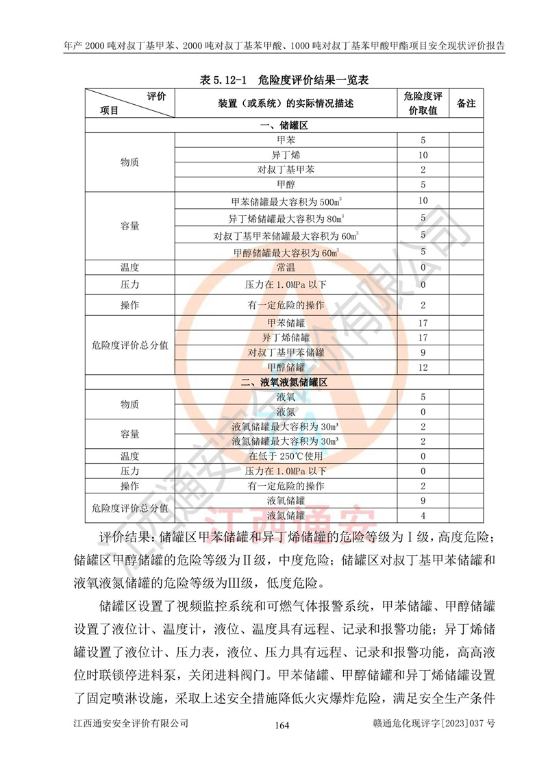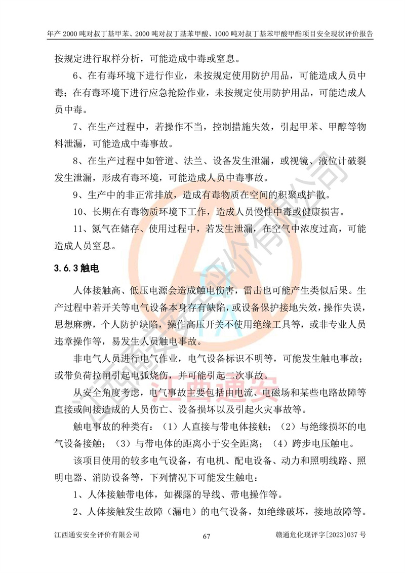 江西永通科技股份有限公司位于江西省贛州市寧都縣工業(yè)園,法定**人為劉忠春,成立于2009年09月25日,注冊(cè)資本玖仟陸佰肆拾陸萬(wàn)陸仟元整,營(yíng)業(yè)執(zhí)照經(jīng)營(yíng)范圍為化學(xué)原料藥、醫(yī)藥中間體等研發(fā)、生產(chǎn)、銷售等。 江西永通科技股份有限公司2020年10月26日取得了《安全生產(chǎn)許可證》,許可證編號(hào):(贛)WH安許證字[2011]0642號(hào),許可范圍為對(duì)叔丁基甲苯(2kt/a)、對(duì)叔丁基苯甲酸(2kt/a)、對(duì)叔丁基苯甲酸甲酯(1kt/a),**期:2020年10月26日至2023年10月25日。該公司2021年10月22日取得了安全生產(chǎn)標(biāo)準(zhǔn)化證書,證書編號(hào):贛市AQBWHⅢ[2021]168,**期至2024年10月21日。該公司現(xiàn)有員工133人,其中專職安全管理人員3人。 江西永通科技股份有限公司年產(chǎn)2000噸對(duì)叔丁基甲苯、2000噸對(duì)叔丁基苯甲酸、1000噸對(duì)叔丁基苯甲酸甲酯項(xiàng)目生產(chǎn)過(guò)程中涉及的原輔材料為甲苯、異丁烯、液氧(氧氣)、甲醇、濃硫酸、液堿(氫氧化鈉)、活性炭、硅藻土、氧化催化劑和氮?dú)?,產(chǎn)品為對(duì)叔丁基甲苯、對(duì)叔丁基苯甲酸和對(duì)叔丁基苯甲酸甲酯。根據(jù)《危險(xiǎn)化學(xué)品目錄》,該項(xiàng)目涉及的甲苯、異丁烯、液氧(氧氣)、甲醇、濃硫酸、液堿(氫氧化鈉)和氮?dú)鈱儆?/span>危險(xiǎn)化學(xué)品。經(jīng)辨識(shí),甲苯和甲醇屬于重點(diǎn)監(jiān)管的危險(xiǎn)化學(xué)品,甲苯和硫酸屬于第三類易制毒化學(xué)品、甲醇屬于特別管控的危險(xiǎn)化學(xué)品,不涉及監(jiān)控化學(xué)品、易制爆危險(xiǎn)化學(xué)品、劇毒化學(xué)品和高毒物品,儲(chǔ)罐區(qū)構(gòu)成三級(jí)重大危險(xiǎn)源,其他生產(chǎn)、儲(chǔ)存單元不構(gòu)成危險(xiǎn)化學(xué)品重大危險(xiǎn)源,涉及的烷基化反應(yīng)和氧化反應(yīng)屬于重點(diǎn)監(jiān)管的危險(xiǎn)化工工藝。根據(jù)《安全生產(chǎn)許可證條例》、《危險(xiǎn)化學(xué)品安全管理?xiàng)l例》和《危險(xiǎn)化學(xué)品生產(chǎn)企業(yè)安全生產(chǎn)許可實(shí)施辦法》的相關(guān)規(guī)定,該項(xiàng)目涉及甲苯回收,需要辦理危險(xiǎn)化學(xué)品安全生產(chǎn)許可證。根據(jù)生產(chǎn)工藝特點(diǎn)及物料的理化特性可知,該項(xiàng)目生產(chǎn)過(guò)程中存在火災(zāi)與爆炸、中毒與窒息、觸電、機(jī)械傷害等危險(xiǎn)有害因素。 該公司自2020年10月26日取得安全生產(chǎn)許可證以來(lái),生產(chǎn)運(yùn)行正常,未發(fā)生一般及以上生產(chǎn)安全事故。 |