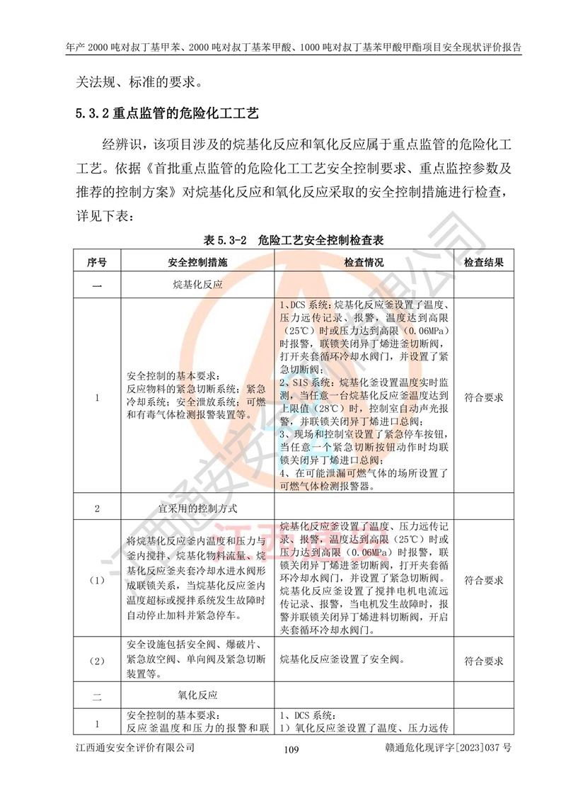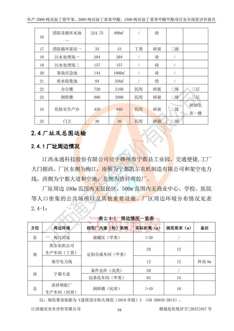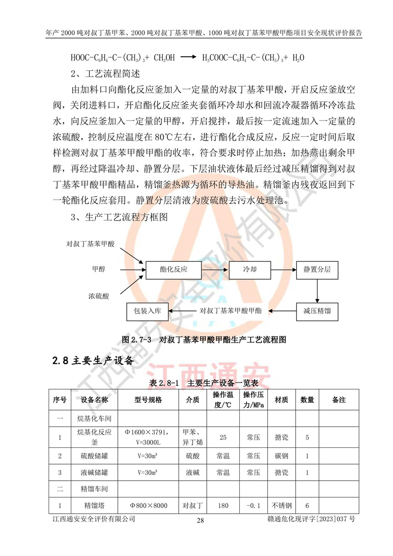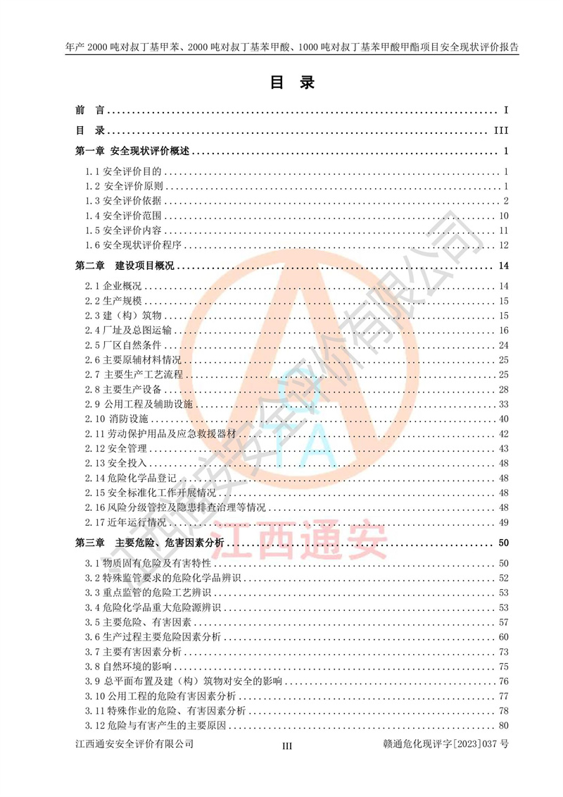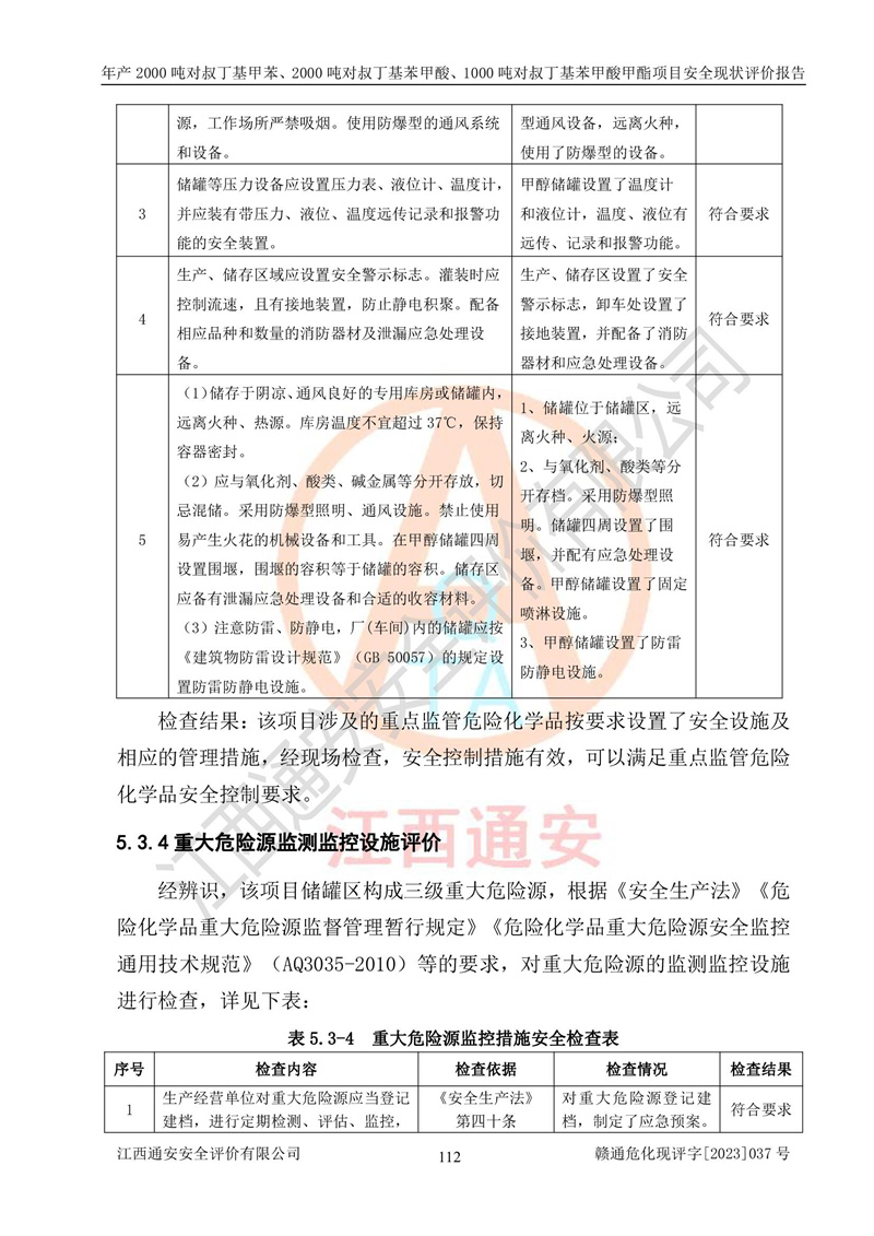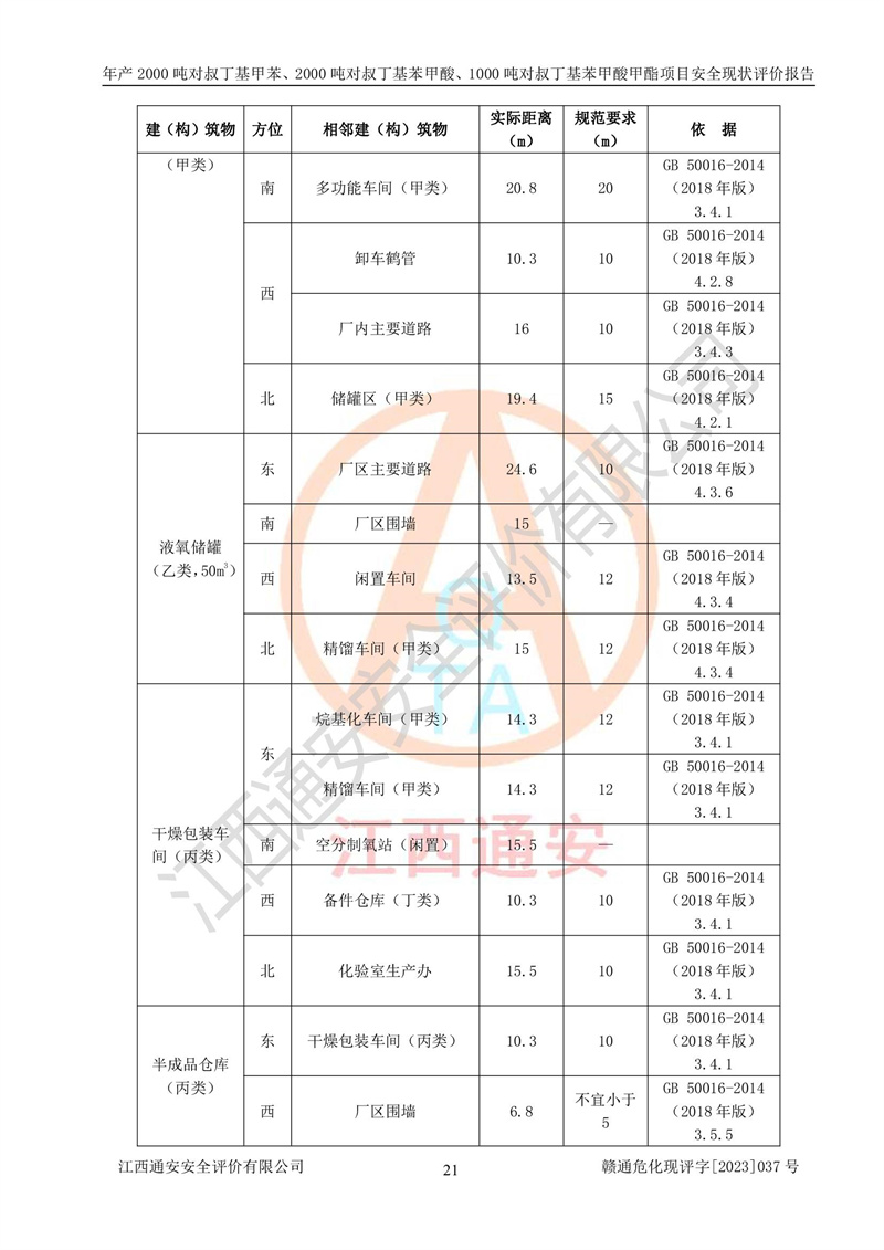 江西永通科技股份有限公司位于江西省贛州市寧都縣工業(yè)園,法定**人為劉忠春,成立于2009年09月25日,注冊(cè)資本玖仟陸佰肆拾陸萬(wàn)陸仟元整,營(yíng)業(yè)執(zhí)照經(jīng)營(yíng)范圍為化學(xué)原料藥、醫(yī)藥中間體等研發(fā)、生產(chǎn)、銷售等。 江西永通科技股份有限公司2020年10月26日取得了《安全生產(chǎn)許可證》,許可證編號(hào):(贛)WH安許證字[2011]0642號(hào),許可范圍為對(duì)叔丁基甲苯(2kt/a)、對(duì)叔丁基苯甲酸(2kt/a)、對(duì)叔丁基苯甲酸甲酯(1kt/a),**期:2020年10月26日至2023年10月25日。該公司2021年10月22日取得了安全生產(chǎn)標(biāo)準(zhǔn)化證書,證書編號(hào):贛市AQBWHⅢ[2021]168,**期至2024年10月21日。該公司現(xiàn)有員工133人,其中專職安全管理人員3人。 江西永通科技股份有限公司年產(chǎn)2000噸對(duì)叔丁基甲苯、2000噸對(duì)叔丁基苯甲酸、1000噸對(duì)叔丁基苯甲酸甲酯項(xiàng)目生產(chǎn)過(guò)程中涉及的原輔材料為甲苯、異丁烯、液氧(氧氣)、甲醇、濃硫酸、液堿(氫氧化鈉)、活性炭、硅藻土、氧化催化劑和氮?dú)?,產(chǎn)品為對(duì)叔丁基甲苯、對(duì)叔丁基苯甲酸和對(duì)叔丁基苯甲酸甲酯。根據(jù)《危險(xiǎn)化學(xué)品目錄》,該項(xiàng)目涉及的甲苯、異丁烯、液氧(氧氣)、甲醇、濃硫酸、液堿(氫氧化鈉)和氮?dú)鈱儆?/span>危險(xiǎn)化學(xué)品。經(jīng)辨識(shí),甲苯和甲醇屬于重點(diǎn)監(jiān)管的危險(xiǎn)化學(xué)品,甲苯和硫酸屬于第三類易制毒化學(xué)品、甲醇屬于特別管控的危險(xiǎn)化學(xué)品,不涉及監(jiān)控化學(xué)品、易制爆危險(xiǎn)化學(xué)品、劇毒化學(xué)品和高毒物品,儲(chǔ)罐區(qū)構(gòu)成三級(jí)重大危險(xiǎn)源,其他生產(chǎn)、儲(chǔ)存單元不構(gòu)成危險(xiǎn)化學(xué)品重大危險(xiǎn)源,涉及的烷基化反應(yīng)和氧化反應(yīng)屬于重點(diǎn)監(jiān)管的危險(xiǎn)化工工藝。根據(jù)《安全生產(chǎn)許可證條例》、《危險(xiǎn)化學(xué)品安全管理?xiàng)l例》和《危險(xiǎn)化學(xué)品生產(chǎn)企業(yè)安全生產(chǎn)許可實(shí)施辦法》的相關(guān)規(guī)定,該項(xiàng)目涉及甲苯回收,需要辦理危險(xiǎn)化學(xué)品安全生產(chǎn)許可證。根據(jù)生產(chǎn)工藝特點(diǎn)及物料的理化特性可知,該項(xiàng)目生產(chǎn)過(guò)程中存在火災(zāi)與爆炸、中毒與窒息、觸電、機(jī)械傷害等危險(xiǎn)有害因素。 該公司自2020年10月26日取得安全生產(chǎn)許可證以來(lái),生產(chǎn)運(yùn)行正常,未發(fā)生一般及以上生產(chǎn)安全事故。 |