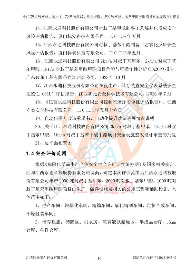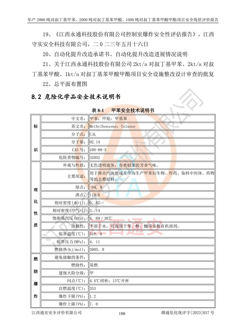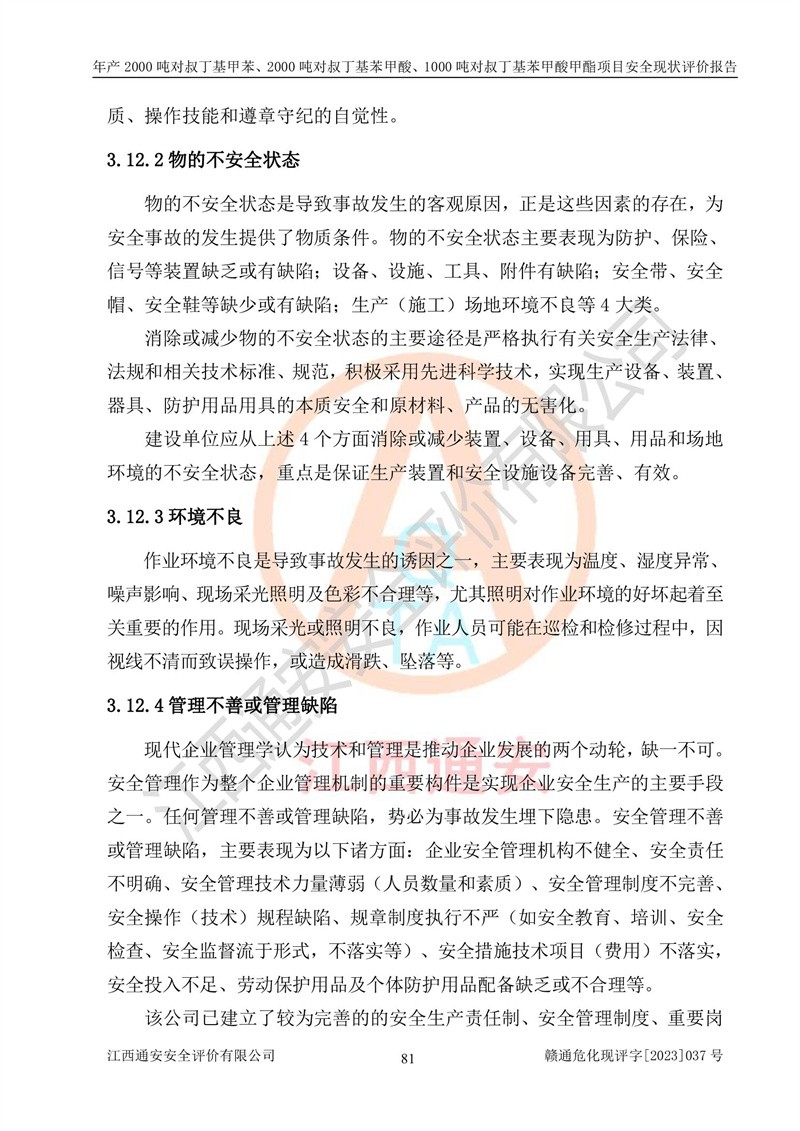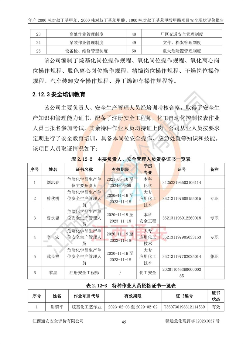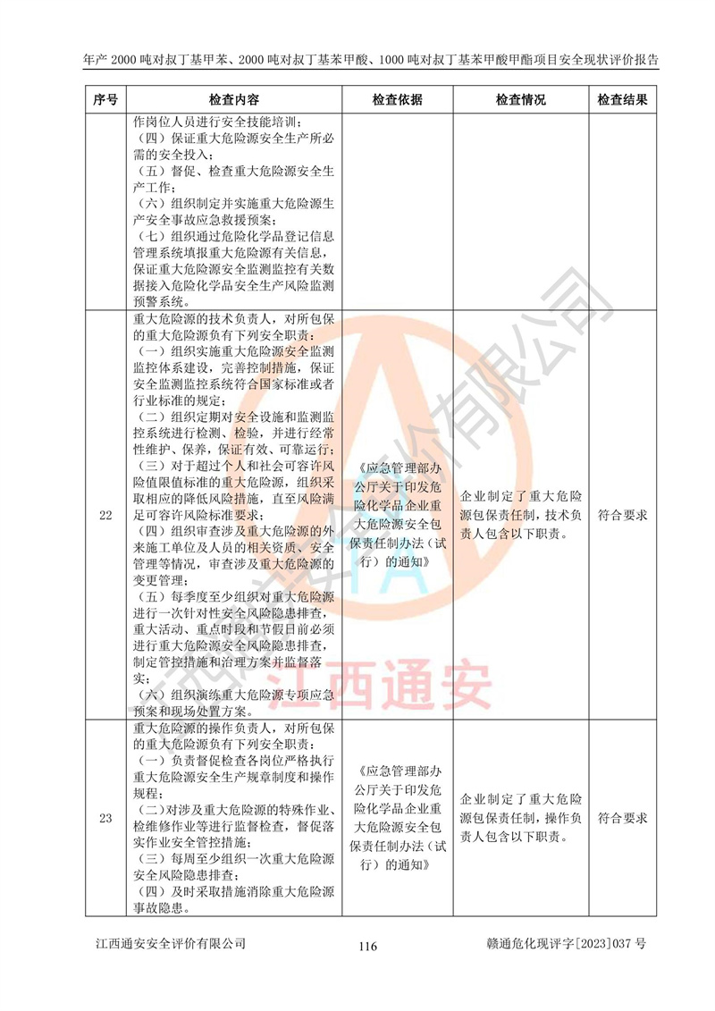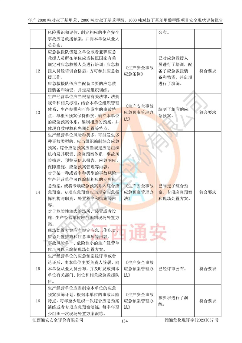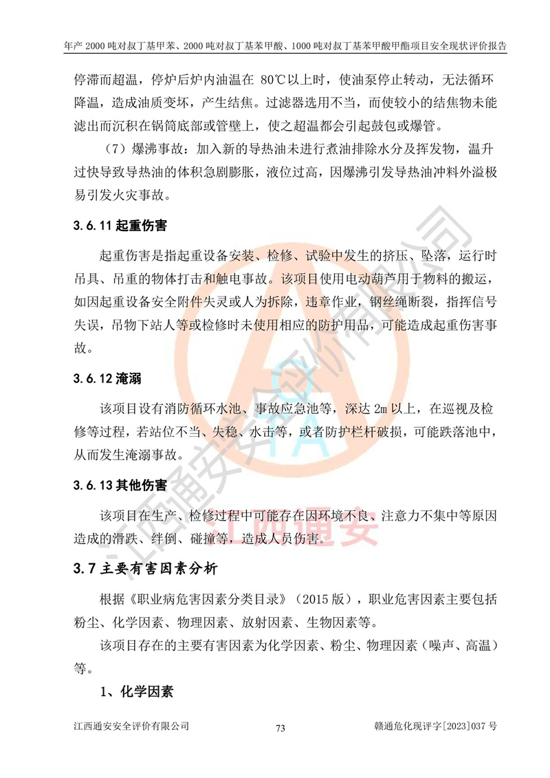 江西永通科技股份有限公司位于江西省贛州市寧都縣工業(yè)園,法定**人為劉忠春,成立于2009年09月25日,注冊(cè)資本玖仟陸佰肆拾陸萬(wàn)陸仟元整,營(yíng)業(yè)執(zhí)照經(jīng)營(yíng)范圍為化學(xué)原料藥、醫(yī)藥中間體等研發(fā)、生產(chǎn)、銷售等。 江西永通科技股份有限公司2020年10月26日取得了《安全生產(chǎn)許可證》,許可證編號(hào):(贛)WH安許證字[2011]0642號(hào),許可范圍為對(duì)叔丁基甲苯(2kt/a)、對(duì)叔丁基苯甲酸(2kt/a)、對(duì)叔丁基苯甲酸甲酯(1kt/a),**期:2020年10月26日至2023年10月25日。該公司2021年10月22日取得了安全生產(chǎn)標(biāo)準(zhǔn)化證書,證書編號(hào):贛市AQBWHⅢ[2021]168,**期至2024年10月21日。該公司現(xiàn)有員工133人,其中專職安全管理人員3人。 江西永通科技股份有限公司年產(chǎn)2000噸對(duì)叔丁基甲苯、2000噸對(duì)叔丁基苯甲酸、1000噸對(duì)叔丁基苯甲酸甲酯項(xiàng)目生產(chǎn)過(guò)程中涉及的原輔材料為甲苯、異丁烯、液氧(氧氣)、甲醇、濃硫酸、液堿(氫氧化鈉)、活性炭、硅藻土、氧化催化劑和氮?dú)?,產(chǎn)品為對(duì)叔丁基甲苯、對(duì)叔丁基苯甲酸和對(duì)叔丁基苯甲酸甲酯。根據(jù)《危險(xiǎn)化學(xué)品目錄》,該項(xiàng)目涉及的甲苯、異丁烯、液氧(氧氣)、甲醇、濃硫酸、液堿(氫氧化鈉)和氮?dú)鈱儆?/span>危險(xiǎn)化學(xué)品。經(jīng)辨識(shí),甲苯和甲醇屬于重點(diǎn)監(jiān)管的危險(xiǎn)化學(xué)品,甲苯和硫酸屬于第三類易制毒化學(xué)品、甲醇屬于特別管控的危險(xiǎn)化學(xué)品,不涉及監(jiān)控化學(xué)品、易制爆危險(xiǎn)化學(xué)品、劇毒化學(xué)品和高毒物品,儲(chǔ)罐區(qū)構(gòu)成三級(jí)重大危險(xiǎn)源,其他生產(chǎn)、儲(chǔ)存單元不構(gòu)成危險(xiǎn)化學(xué)品重大危險(xiǎn)源,涉及的烷基化反應(yīng)和氧化反應(yīng)屬于重點(diǎn)監(jiān)管的危險(xiǎn)化工工藝。根據(jù)《安全生產(chǎn)許可證條例》、《危險(xiǎn)化學(xué)品安全管理?xiàng)l例》和《危險(xiǎn)化學(xué)品生產(chǎn)企業(yè)安全生產(chǎn)許可實(shí)施辦法》的相關(guān)規(guī)定,該項(xiàng)目涉及甲苯回收,需要辦理危險(xiǎn)化學(xué)品安全生產(chǎn)許可證。根據(jù)生產(chǎn)工藝特點(diǎn)及物料的理化特性可知,該項(xiàng)目生產(chǎn)過(guò)程中存在火災(zāi)與爆炸、中毒與窒息、觸電、機(jī)械傷害等危險(xiǎn)有害因素。 該公司自2020年10月26日取得安全生產(chǎn)許可證以來(lái),生產(chǎn)運(yùn)行正常,未發(fā)生一般及以上生產(chǎn)安全事故。 |