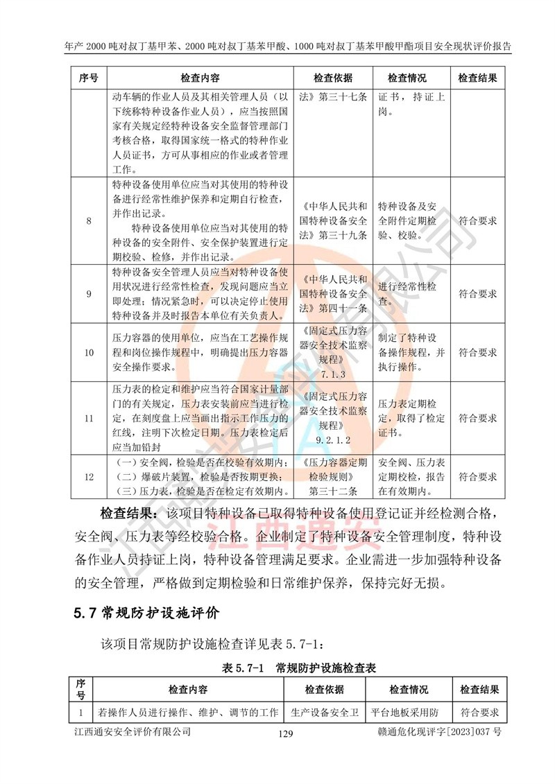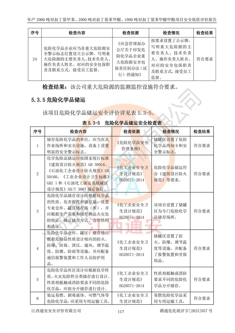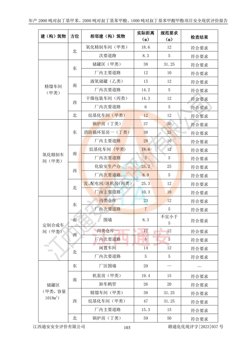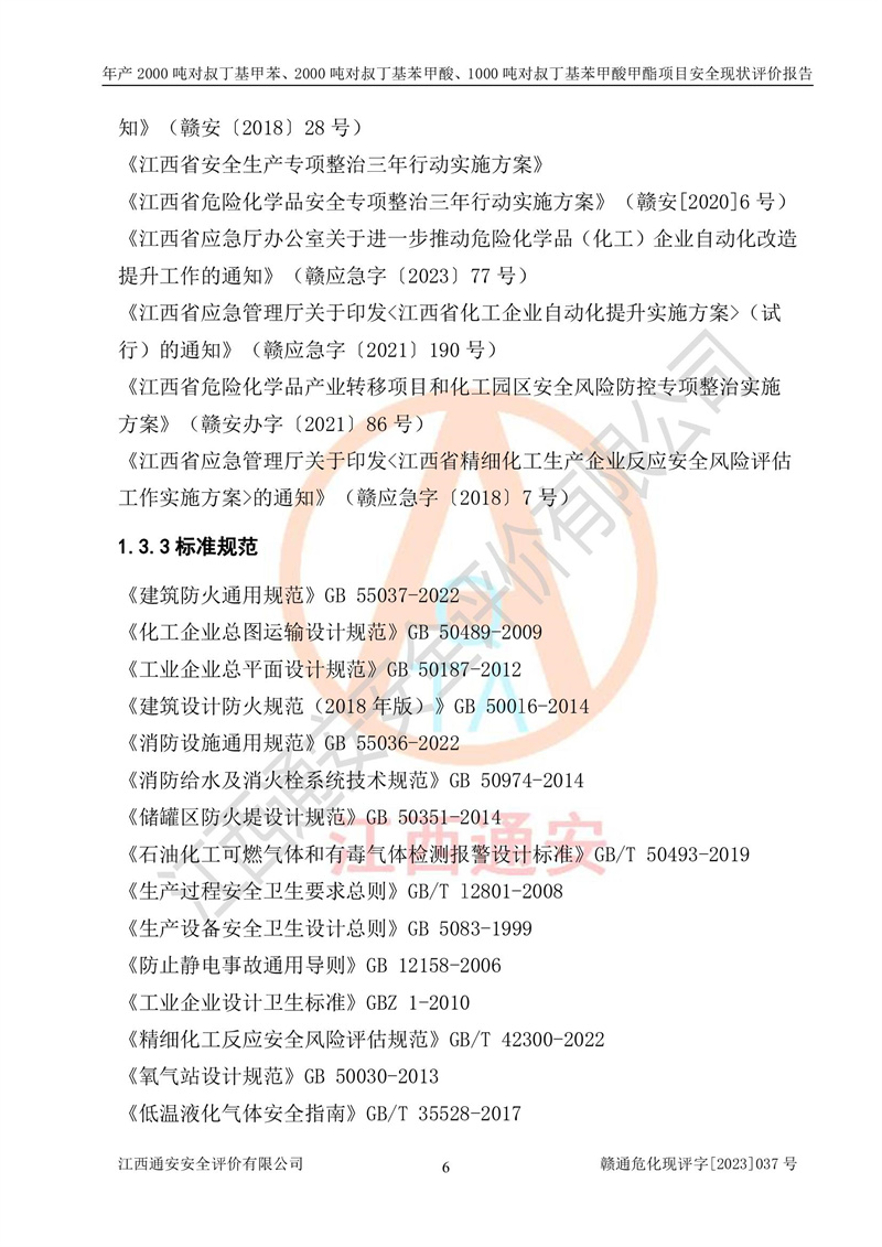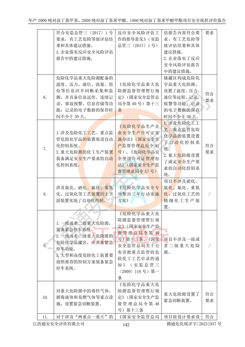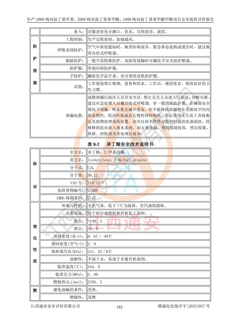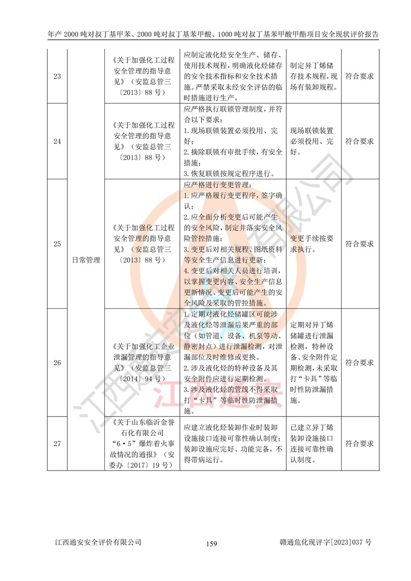 江西永通科技股份有限公司位于江西省贛州市寧都縣工業(yè)園,法定**人為劉忠春,成立于2009年09月25日,注冊(cè)資本玖仟陸佰肆拾陸萬(wàn)陸仟元整,營(yíng)業(yè)執(zhí)照經(jīng)營(yíng)范圍為化學(xué)原料藥、醫(yī)藥中間體等研發(fā)、生產(chǎn)、銷售等。 江西永通科技股份有限公司2020年10月26日取得了《安全生產(chǎn)許可證》,許可證編號(hào):(贛)WH安許證字[2011]0642號(hào),許可范圍為對(duì)叔丁基甲苯(2kt/a)、對(duì)叔丁基苯甲酸(2kt/a)、對(duì)叔丁基苯甲酸甲酯(1kt/a),**期:2020年10月26日至2023年10月25日。該公司2021年10月22日取得了安全生產(chǎn)標(biāo)準(zhǔn)化證書,證書編號(hào):贛市AQBWHⅢ[2021]168,**期至2024年10月21日。該公司現(xiàn)有員工133人,其中專職安全管理人員3人。 江西永通科技股份有限公司年產(chǎn)2000噸對(duì)叔丁基甲苯、2000噸對(duì)叔丁基苯甲酸、1000噸對(duì)叔丁基苯甲酸甲酯項(xiàng)目生產(chǎn)過(guò)程中涉及的原輔材料為甲苯、異丁烯、液氧(氧氣)、甲醇、濃硫酸、液堿(氫氧化鈉)、活性炭、硅藻土、氧化催化劑和氮?dú)?,產(chǎn)品為對(duì)叔丁基甲苯、對(duì)叔丁基苯甲酸和對(duì)叔丁基苯甲酸甲酯。根據(jù)《危險(xiǎn)化學(xué)品目錄》,該項(xiàng)目涉及的甲苯、異丁烯、液氧(氧氣)、甲醇、濃硫酸、液堿(氫氧化鈉)和氮?dú)鈱儆?/span>危險(xiǎn)化學(xué)品。經(jīng)辨識(shí),甲苯和甲醇屬于重點(diǎn)監(jiān)管的危險(xiǎn)化學(xué)品,甲苯和硫酸屬于第三類易制毒化學(xué)品、甲醇屬于特別管控的危險(xiǎn)化學(xué)品,不涉及監(jiān)控化學(xué)品、易制爆危險(xiǎn)化學(xué)品、劇毒化學(xué)品和高毒物品,儲(chǔ)罐區(qū)構(gòu)成三級(jí)重大危險(xiǎn)源,其他生產(chǎn)、儲(chǔ)存單元不構(gòu)成危險(xiǎn)化學(xué)品重大危險(xiǎn)源,涉及的烷基化反應(yīng)和氧化反應(yīng)屬于重點(diǎn)監(jiān)管的危險(xiǎn)化工工藝。根據(jù)《安全生產(chǎn)許可證條例》、《危險(xiǎn)化學(xué)品安全管理?xiàng)l例》和《危險(xiǎn)化學(xué)品生產(chǎn)企業(yè)安全生產(chǎn)許可實(shí)施辦法》的相關(guān)規(guī)定,該項(xiàng)目涉及甲苯回收,需要辦理危險(xiǎn)化學(xué)品安全生產(chǎn)許可證。根據(jù)生產(chǎn)工藝特點(diǎn)及物料的理化特性可知,該項(xiàng)目生產(chǎn)過(guò)程中存在火災(zāi)與爆炸、中毒與窒息、觸電、機(jī)械傷害等危險(xiǎn)有害因素。 該公司自2020年10月26日取得安全生產(chǎn)許可證以來(lái),生產(chǎn)運(yùn)行正常,未發(fā)生一般及以上生產(chǎn)安全事故。 |