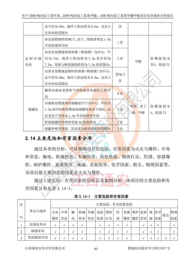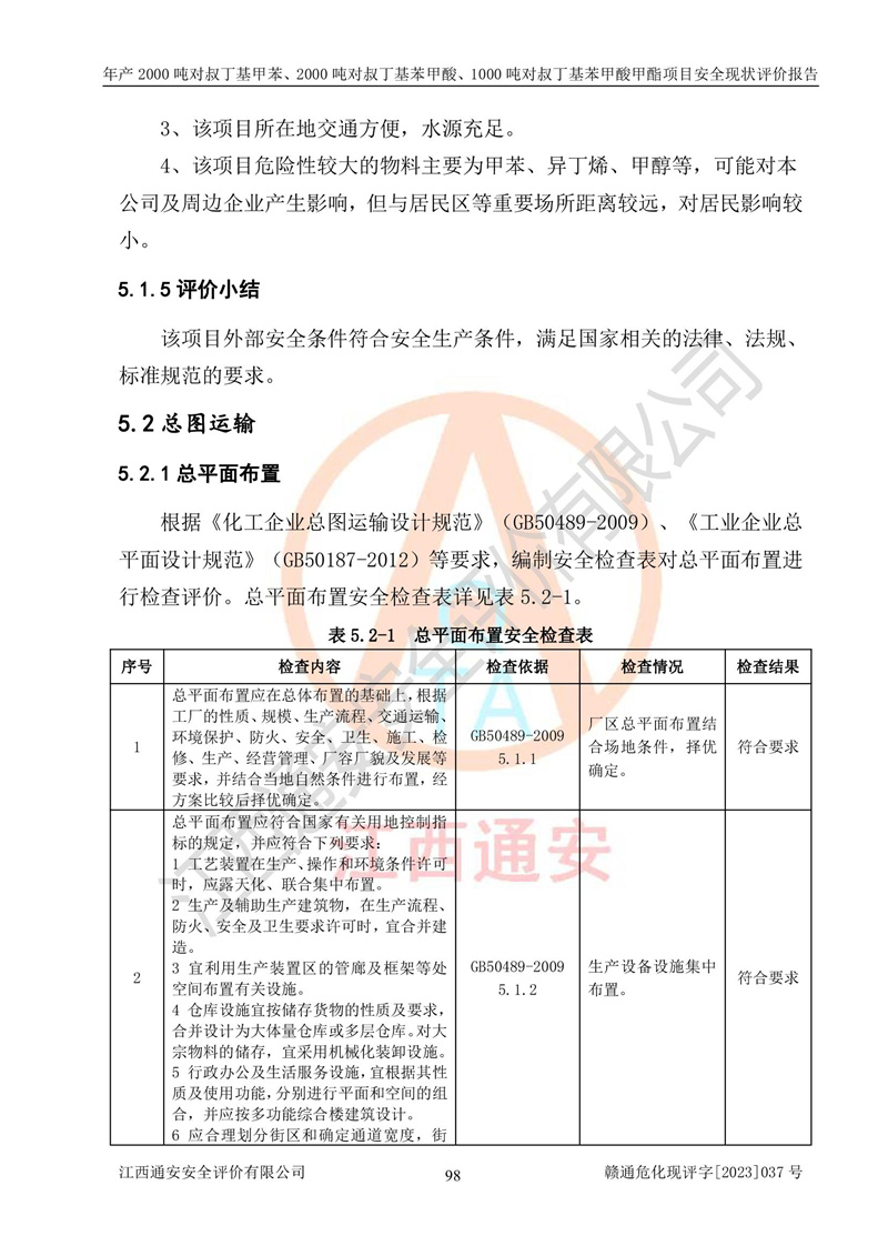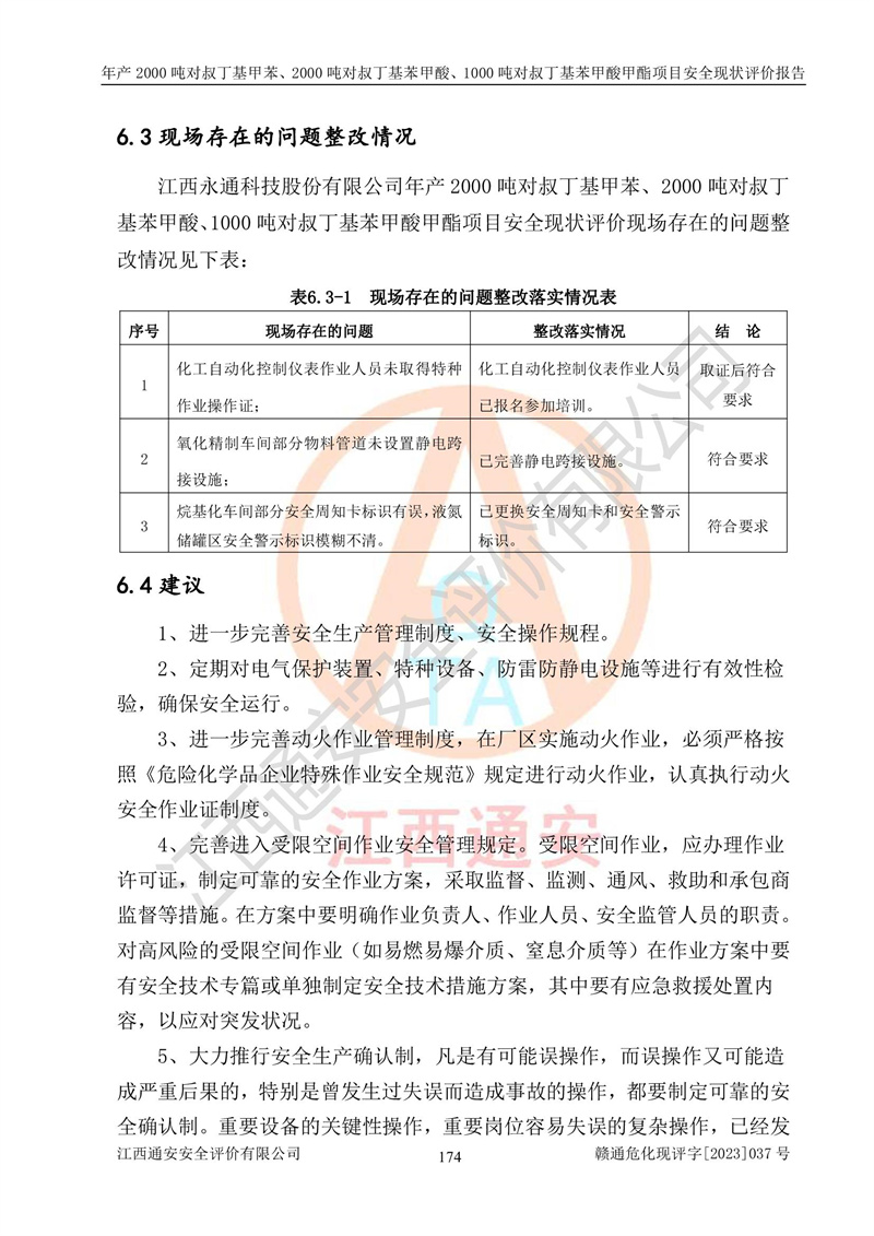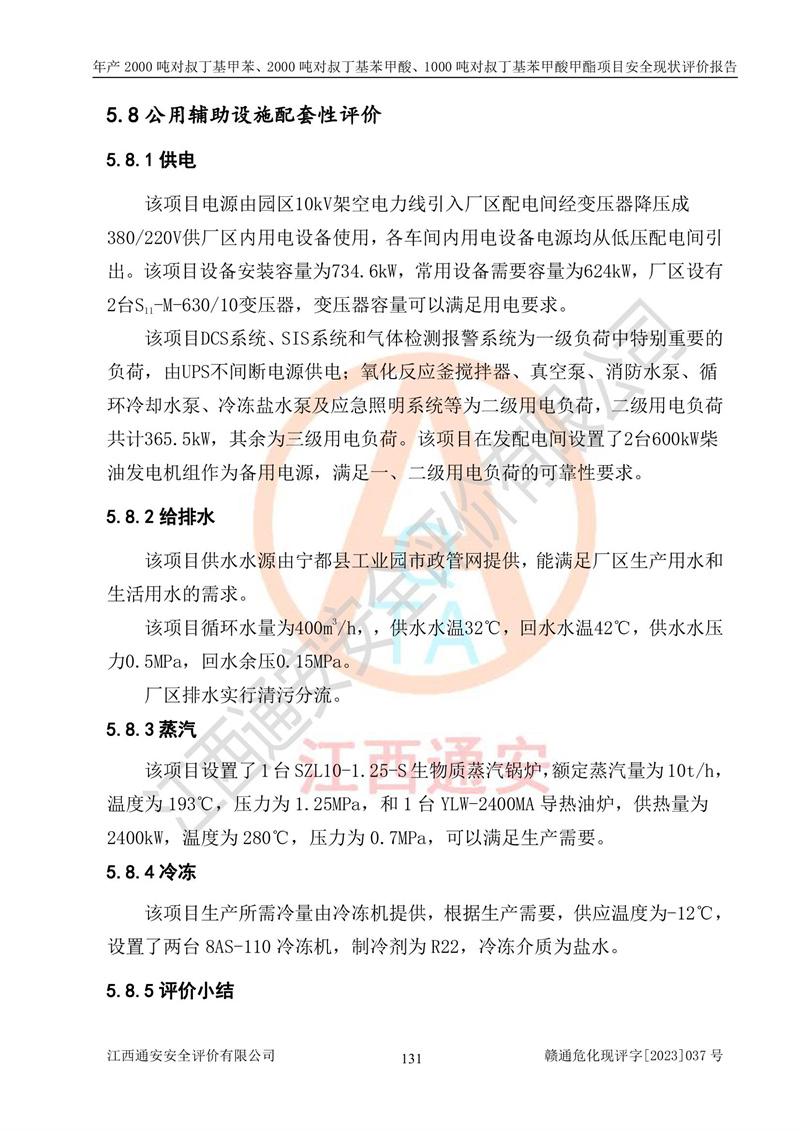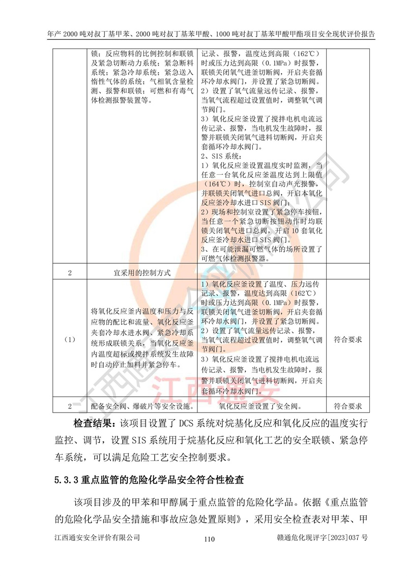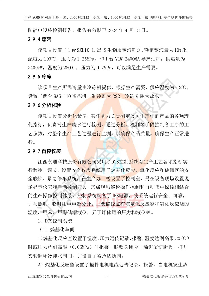 江西永通科技股份有限公司位于江西省贛州市寧都縣工業(yè)園,法定**人為劉忠春,成立于2009年09月25日,注冊(cè)資本玖仟陸佰肆拾陸萬(wàn)陸仟元整,營(yíng)業(yè)執(zhí)照經(jīng)營(yíng)范圍為化學(xué)原料藥、醫(yī)藥中間體等研發(fā)、生產(chǎn)、銷售等。 江西永通科技股份有限公司2020年10月26日取得了《安全生產(chǎn)許可證》,許可證編號(hào):(贛)WH安許證字[2011]0642號(hào),許可范圍為對(duì)叔丁基甲苯(2kt/a)、對(duì)叔丁基苯甲酸(2kt/a)、對(duì)叔丁基苯甲酸甲酯(1kt/a),**期:2020年10月26日至2023年10月25日。該公司2021年10月22日取得了安全生產(chǎn)標(biāo)準(zhǔn)化證書,證書編號(hào):贛市AQBWHⅢ[2021]168,**期至2024年10月21日。該公司現(xiàn)有員工133人,其中專職安全管理人員3人。 江西永通科技股份有限公司年產(chǎn)2000噸對(duì)叔丁基甲苯、2000噸對(duì)叔丁基苯甲酸、1000噸對(duì)叔丁基苯甲酸甲酯項(xiàng)目生產(chǎn)過(guò)程中涉及的原輔材料為甲苯、異丁烯、液氧(氧氣)、甲醇、濃硫酸、液堿(氫氧化鈉)、活性炭、硅藻土、氧化催化劑和氮?dú)?,產(chǎn)品為對(duì)叔丁基甲苯、對(duì)叔丁基苯甲酸和對(duì)叔丁基苯甲酸甲酯。根據(jù)《危險(xiǎn)化學(xué)品目錄》,該項(xiàng)目涉及的甲苯、異丁烯、液氧(氧氣)、甲醇、濃硫酸、液堿(氫氧化鈉)和氮?dú)鈱儆?/span>危險(xiǎn)化學(xué)品。經(jīng)辨識(shí),甲苯和甲醇屬于重點(diǎn)監(jiān)管的危險(xiǎn)化學(xué)品,甲苯和硫酸屬于第三類易制毒化學(xué)品、甲醇屬于特別管控的危險(xiǎn)化學(xué)品,不涉及監(jiān)控化學(xué)品、易制爆危險(xiǎn)化學(xué)品、劇毒化學(xué)品和高毒物品,儲(chǔ)罐區(qū)構(gòu)成三級(jí)重大危險(xiǎn)源,其他生產(chǎn)、儲(chǔ)存單元不構(gòu)成危險(xiǎn)化學(xué)品重大危險(xiǎn)源,涉及的烷基化反應(yīng)和氧化反應(yīng)屬于重點(diǎn)監(jiān)管的危險(xiǎn)化工工藝。根據(jù)《安全生產(chǎn)許可證條例》、《危險(xiǎn)化學(xué)品安全管理?xiàng)l例》和《危險(xiǎn)化學(xué)品生產(chǎn)企業(yè)安全生產(chǎn)許可實(shí)施辦法》的相關(guān)規(guī)定,該項(xiàng)目涉及甲苯回收,需要辦理危險(xiǎn)化學(xué)品安全生產(chǎn)許可證。根據(jù)生產(chǎn)工藝特點(diǎn)及物料的理化特性可知,該項(xiàng)目生產(chǎn)過(guò)程中存在火災(zāi)與爆炸、中毒與窒息、觸電、機(jī)械傷害等危險(xiǎn)有害因素。 該公司自2020年10月26日取得安全生產(chǎn)許可證以來(lái),生產(chǎn)運(yùn)行正常,未發(fā)生一般及以上生產(chǎn)安全事故。 |