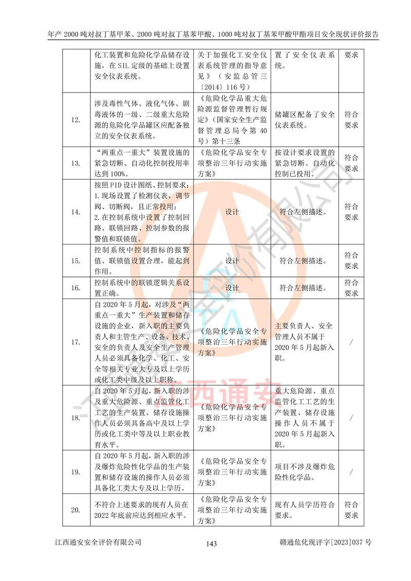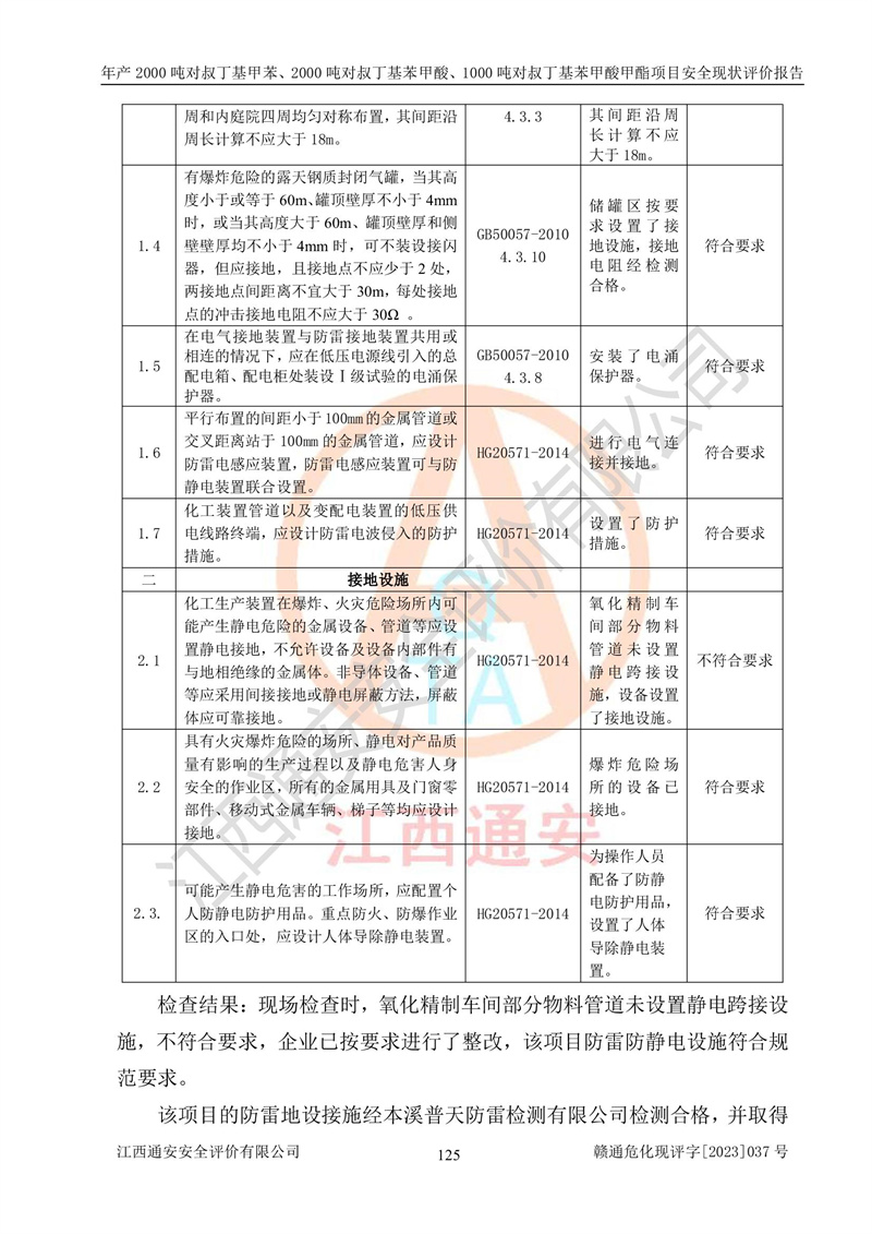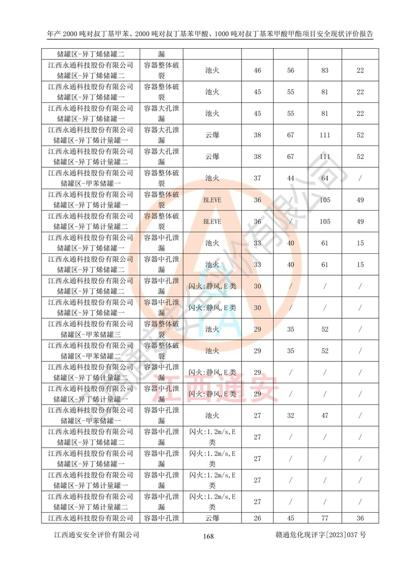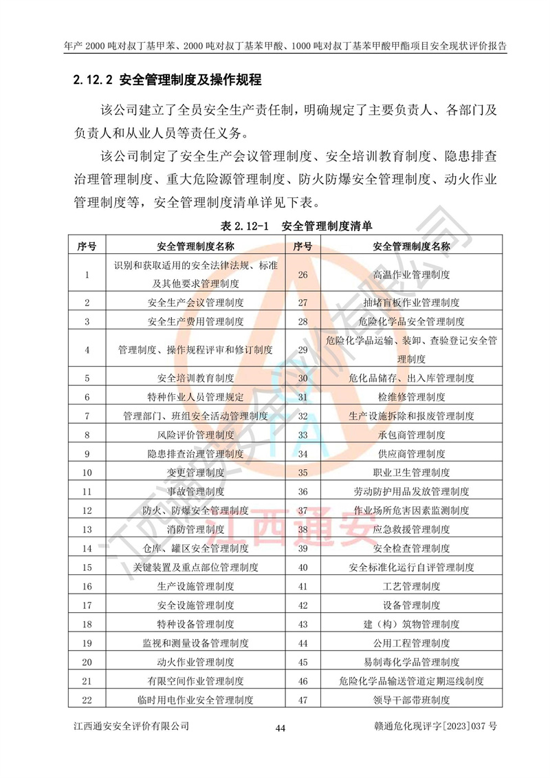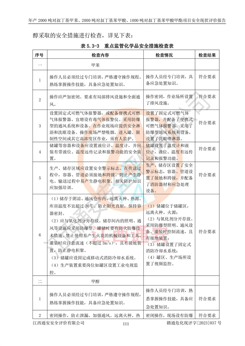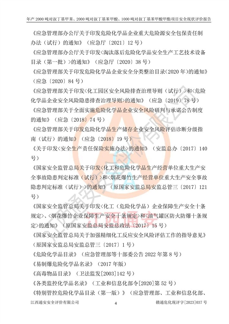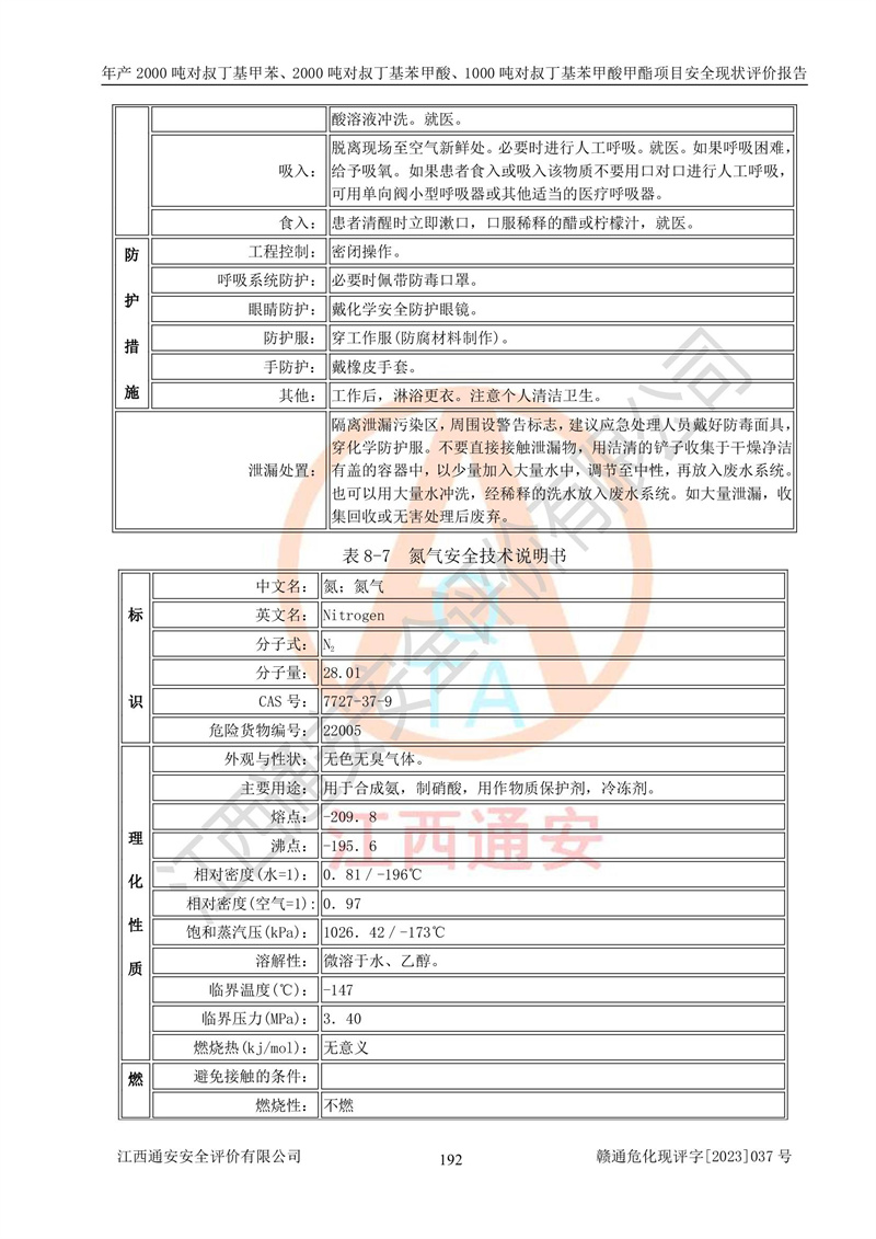 江西永通科技股份有限公司位于江西省贛州市寧都縣工業(yè)園,法定**人為劉忠春,成立于2009年09月25日,注冊(cè)資本玖仟陸佰肆拾陸萬(wàn)陸仟元整,營(yíng)業(yè)執(zhí)照經(jīng)營(yíng)范圍為化學(xué)原料藥、醫(yī)藥中間體等研發(fā)、生產(chǎn)、銷售等。 江西永通科技股份有限公司2020年10月26日取得了《安全生產(chǎn)許可證》,許可證編號(hào):(贛)WH安許證字[2011]0642號(hào),許可范圍為對(duì)叔丁基甲苯(2kt/a)、對(duì)叔丁基苯甲酸(2kt/a)、對(duì)叔丁基苯甲酸甲酯(1kt/a),**期:2020年10月26日至2023年10月25日。該公司2021年10月22日取得了安全生產(chǎn)標(biāo)準(zhǔn)化證書,證書編號(hào):贛市AQBWHⅢ[2021]168,**期至2024年10月21日。該公司現(xiàn)有員工133人,其中專職安全管理人員3人。 江西永通科技股份有限公司年產(chǎn)2000噸對(duì)叔丁基甲苯、2000噸對(duì)叔丁基苯甲酸、1000噸對(duì)叔丁基苯甲酸甲酯項(xiàng)目生產(chǎn)過(guò)程中涉及的原輔材料為甲苯、異丁烯、液氧(氧氣)、甲醇、濃硫酸、液堿(氫氧化鈉)、活性炭、硅藻土、氧化催化劑和氮?dú)?,產(chǎn)品為對(duì)叔丁基甲苯、對(duì)叔丁基苯甲酸和對(duì)叔丁基苯甲酸甲酯。根據(jù)《危險(xiǎn)化學(xué)品目錄》,該項(xiàng)目涉及的甲苯、異丁烯、液氧(氧氣)、甲醇、濃硫酸、液堿(氫氧化鈉)和氮?dú)鈱儆?/span>危險(xiǎn)化學(xué)品。經(jīng)辨識(shí),甲苯和甲醇屬于重點(diǎn)監(jiān)管的危險(xiǎn)化學(xué)品,甲苯和硫酸屬于第三類易制毒化學(xué)品、甲醇屬于特別管控的危險(xiǎn)化學(xué)品,不涉及監(jiān)控化學(xué)品、易制爆危險(xiǎn)化學(xué)品、劇毒化學(xué)品和高毒物品,儲(chǔ)罐區(qū)構(gòu)成三級(jí)重大危險(xiǎn)源,其他生產(chǎn)、儲(chǔ)存單元不構(gòu)成危險(xiǎn)化學(xué)品重大危險(xiǎn)源,涉及的烷基化反應(yīng)和氧化反應(yīng)屬于重點(diǎn)監(jiān)管的危險(xiǎn)化工工藝。根據(jù)《安全生產(chǎn)許可證條例》、《危險(xiǎn)化學(xué)品安全管理?xiàng)l例》和《危險(xiǎn)化學(xué)品生產(chǎn)企業(yè)安全生產(chǎn)許可實(shí)施辦法》的相關(guān)規(guī)定,該項(xiàng)目涉及甲苯回收,需要辦理危險(xiǎn)化學(xué)品安全生產(chǎn)許可證。根據(jù)生產(chǎn)工藝特點(diǎn)及物料的理化特性可知,該項(xiàng)目生產(chǎn)過(guò)程中存在火災(zāi)與爆炸、中毒與窒息、觸電、機(jī)械傷害等危險(xiǎn)有害因素。 該公司自2020年10月26日取得安全生產(chǎn)許可證以來(lái),生產(chǎn)運(yùn)行正常,未發(fā)生一般及以上生產(chǎn)安全事故。 |