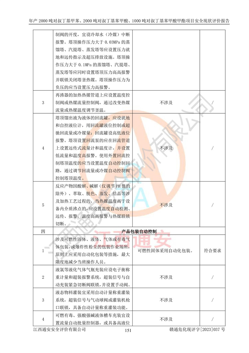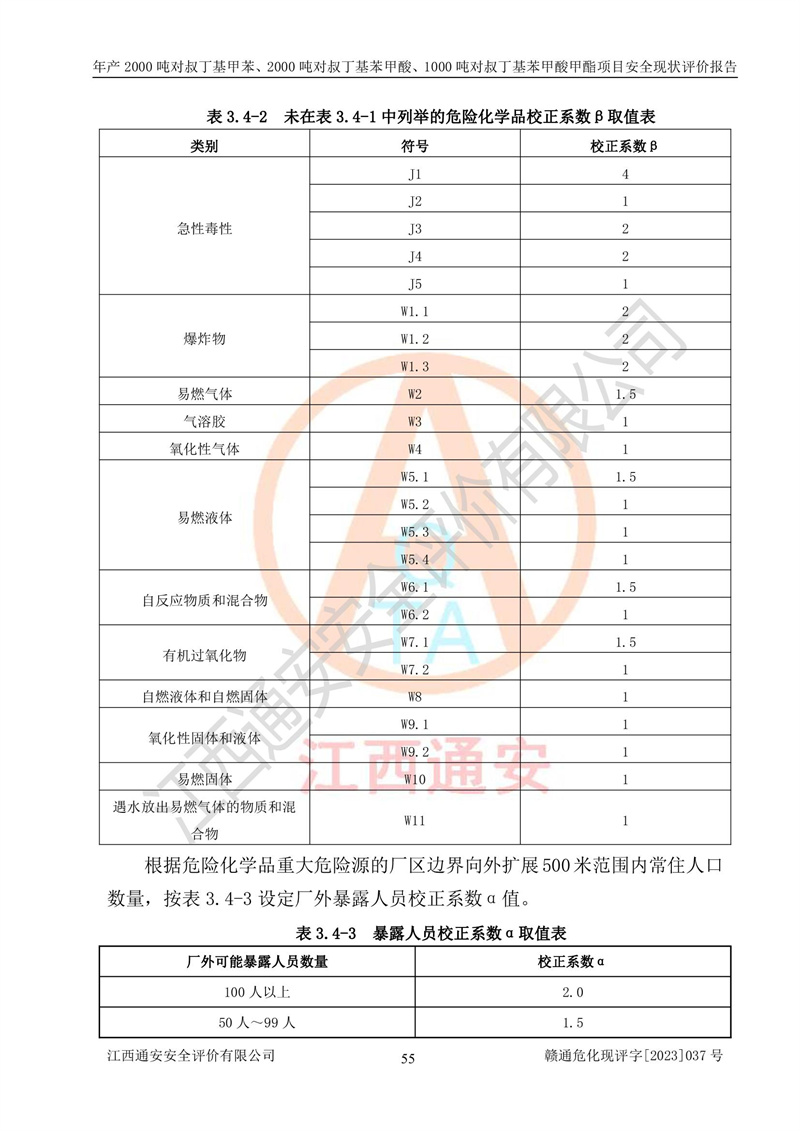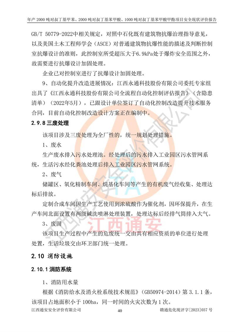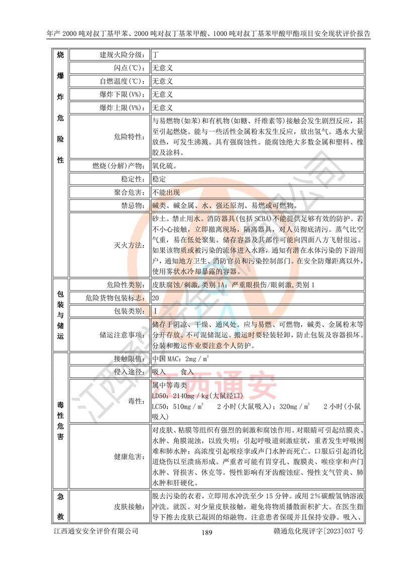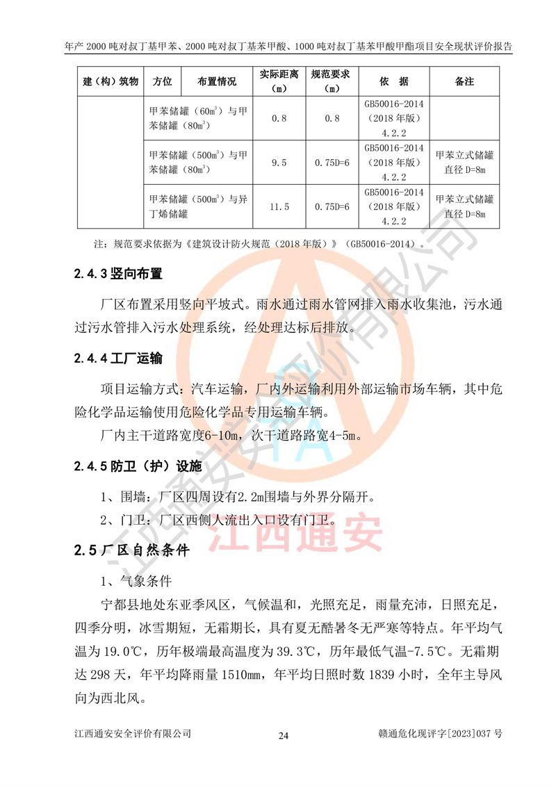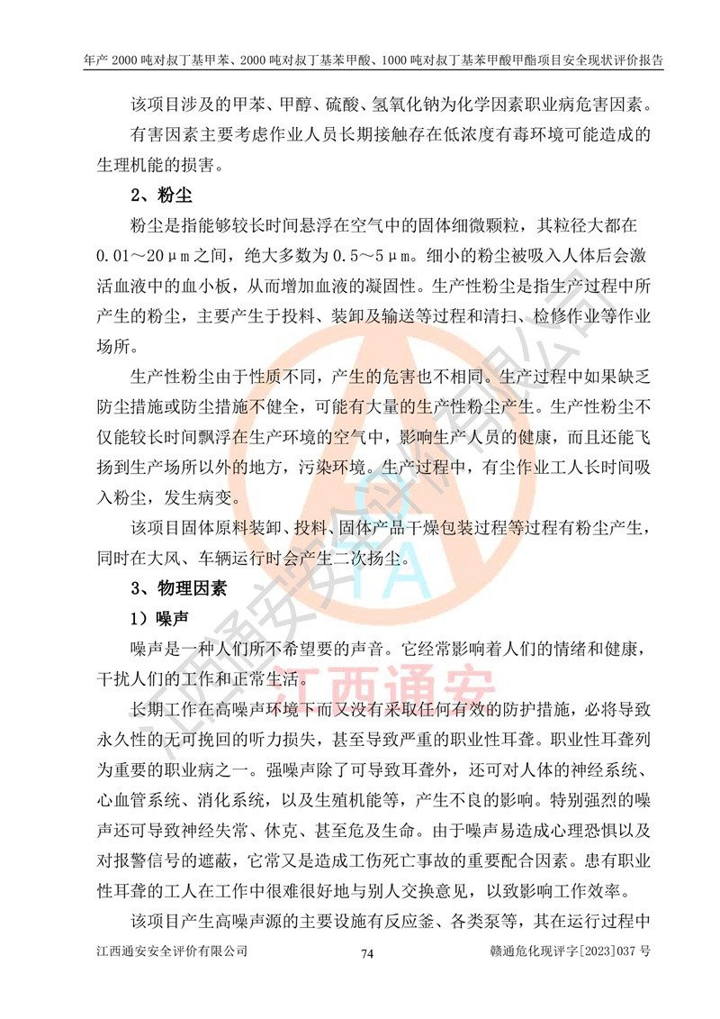 江西永通科技股份有限公司位于江西省贛州市寧都縣工業(yè)園,法定**人為劉忠春,成立于2009年09月25日,注冊(cè)資本玖仟陸佰肆拾陸萬(wàn)陸仟元整,營(yíng)業(yè)執(zhí)照經(jīng)營(yíng)范圍為化學(xué)原料藥、醫(yī)藥中間體等研發(fā)、生產(chǎn)、銷售等。 江西永通科技股份有限公司2020年10月26日取得了《安全生產(chǎn)許可證》,許可證編號(hào):(贛)WH安許證字[2011]0642號(hào),許可范圍為對(duì)叔丁基甲苯(2kt/a)、對(duì)叔丁基苯甲酸(2kt/a)、對(duì)叔丁基苯甲酸甲酯(1kt/a),**期:2020年10月26日至2023年10月25日。該公司2021年10月22日取得了安全生產(chǎn)標(biāo)準(zhǔn)化證書,證書編號(hào):贛市AQBWHⅢ[2021]168,**期至2024年10月21日。該公司現(xiàn)有員工133人,其中專職安全管理人員3人。 江西永通科技股份有限公司年產(chǎn)2000噸對(duì)叔丁基甲苯、2000噸對(duì)叔丁基苯甲酸、1000噸對(duì)叔丁基苯甲酸甲酯項(xiàng)目生產(chǎn)過(guò)程中涉及的原輔材料為甲苯、異丁烯、液氧(氧氣)、甲醇、濃硫酸、液堿(氫氧化鈉)、活性炭、硅藻土、氧化催化劑和氮?dú)?,產(chǎn)品為對(duì)叔丁基甲苯、對(duì)叔丁基苯甲酸和對(duì)叔丁基苯甲酸甲酯。根據(jù)《危險(xiǎn)化學(xué)品目錄》,該項(xiàng)目涉及的甲苯、異丁烯、液氧(氧氣)、甲醇、濃硫酸、液堿(氫氧化鈉)和氮?dú)鈱儆?/span>危險(xiǎn)化學(xué)品。經(jīng)辨識(shí),甲苯和甲醇屬于重點(diǎn)監(jiān)管的危險(xiǎn)化學(xué)品,甲苯和硫酸屬于第三類易制毒化學(xué)品、甲醇屬于特別管控的危險(xiǎn)化學(xué)品,不涉及監(jiān)控化學(xué)品、易制爆危險(xiǎn)化學(xué)品、劇毒化學(xué)品和高毒物品,儲(chǔ)罐區(qū)構(gòu)成三級(jí)重大危險(xiǎn)源,其他生產(chǎn)、儲(chǔ)存單元不構(gòu)成危險(xiǎn)化學(xué)品重大危險(xiǎn)源,涉及的烷基化反應(yīng)和氧化反應(yīng)屬于重點(diǎn)監(jiān)管的危險(xiǎn)化工工藝。根據(jù)《安全生產(chǎn)許可證條例》、《危險(xiǎn)化學(xué)品安全管理?xiàng)l例》和《危險(xiǎn)化學(xué)品生產(chǎn)企業(yè)安全生產(chǎn)許可實(shí)施辦法》的相關(guān)規(guī)定,該項(xiàng)目涉及甲苯回收,需要辦理危險(xiǎn)化學(xué)品安全生產(chǎn)許可證。根據(jù)生產(chǎn)工藝特點(diǎn)及物料的理化特性可知,該項(xiàng)目生產(chǎn)過(guò)程中存在火災(zāi)與爆炸、中毒與窒息、觸電、機(jī)械傷害等危險(xiǎn)有害因素。 該公司自2020年10月26日取得安全生產(chǎn)許可證以來(lái),生產(chǎn)運(yùn)行正常,未發(fā)生一般及以上生產(chǎn)安全事故。 |