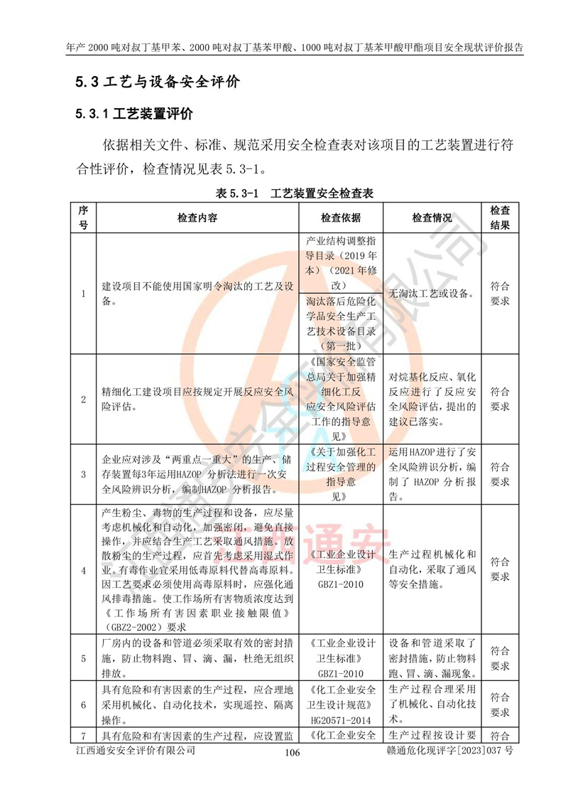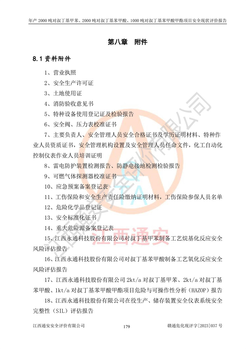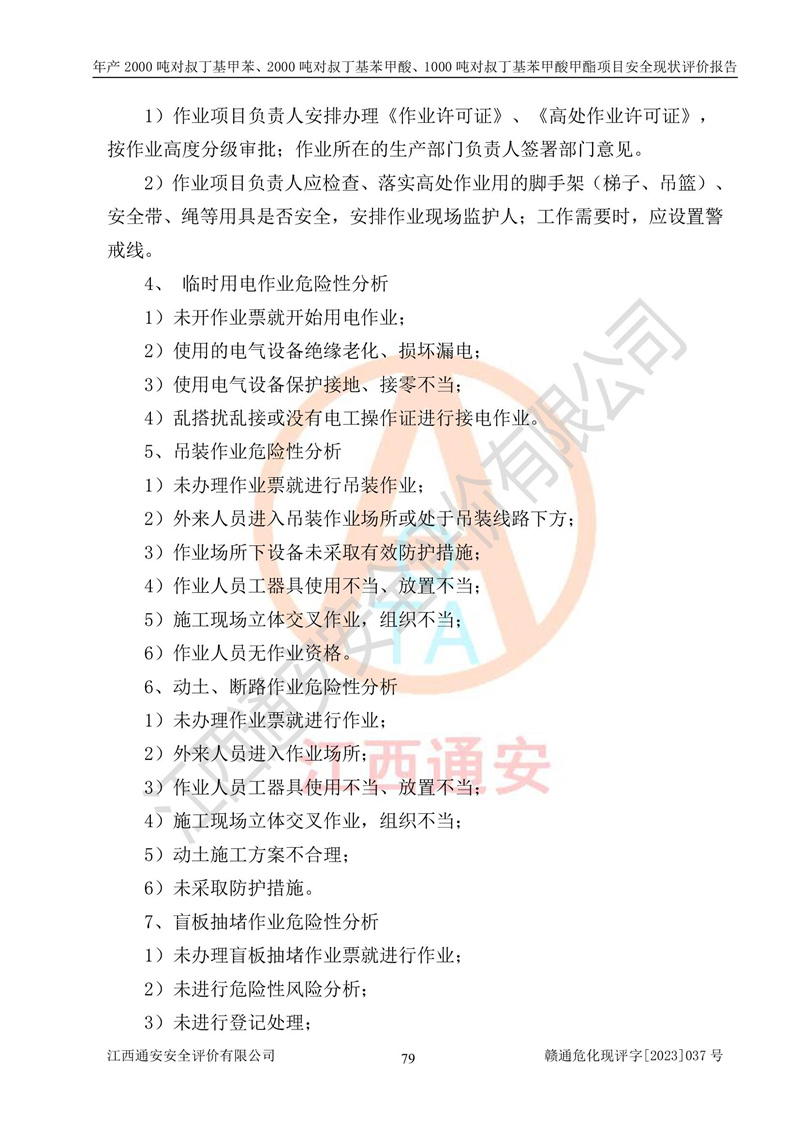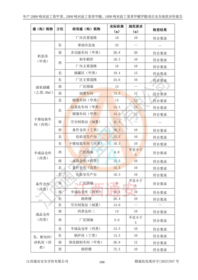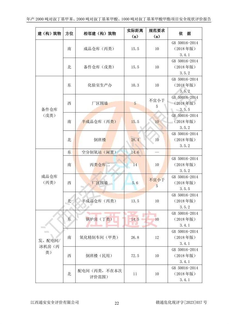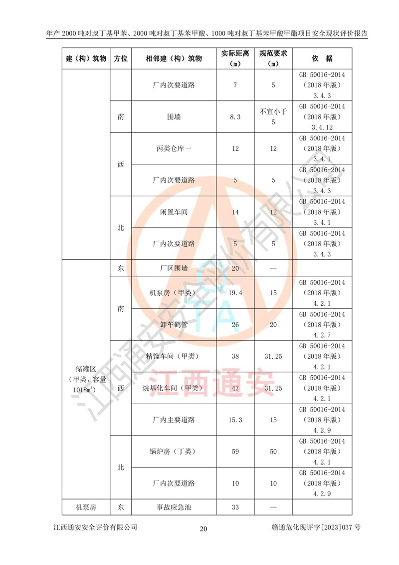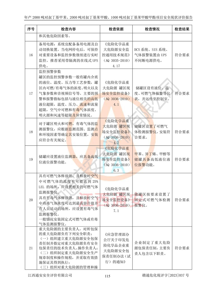 江西永通科技股份有限公司位于江西省贛州市寧都縣工業(yè)園,法定**人為劉忠春,成立于2009年09月25日,注冊(cè)資本玖仟陸佰肆拾陸萬(wàn)陸仟元整,營(yíng)業(yè)執(zhí)照經(jīng)營(yíng)范圍為化學(xué)原料藥、醫(yī)藥中間體等研發(fā)、生產(chǎn)、銷售等。 江西永通科技股份有限公司2020年10月26日取得了《安全生產(chǎn)許可證》,許可證編號(hào):(贛)WH安許證字[2011]0642號(hào),許可范圍為對(duì)叔丁基甲苯(2kt/a)、對(duì)叔丁基苯甲酸(2kt/a)、對(duì)叔丁基苯甲酸甲酯(1kt/a),**期:2020年10月26日至2023年10月25日。該公司2021年10月22日取得了安全生產(chǎn)標(biāo)準(zhǔn)化證書,證書編號(hào):贛市AQBWHⅢ[2021]168,**期至2024年10月21日。該公司現(xiàn)有員工133人,其中專職安全管理人員3人。 江西永通科技股份有限公司年產(chǎn)2000噸對(duì)叔丁基甲苯、2000噸對(duì)叔丁基苯甲酸、1000噸對(duì)叔丁基苯甲酸甲酯項(xiàng)目生產(chǎn)過(guò)程中涉及的原輔材料為甲苯、異丁烯、液氧(氧氣)、甲醇、濃硫酸、液堿(氫氧化鈉)、活性炭、硅藻土、氧化催化劑和氮?dú)?,產(chǎn)品為對(duì)叔丁基甲苯、對(duì)叔丁基苯甲酸和對(duì)叔丁基苯甲酸甲酯。根據(jù)《危險(xiǎn)化學(xué)品目錄》,該項(xiàng)目涉及的甲苯、異丁烯、液氧(氧氣)、甲醇、濃硫酸、液堿(氫氧化鈉)和氮?dú)鈱儆?/span>危險(xiǎn)化學(xué)品。經(jīng)辨識(shí),甲苯和甲醇屬于重點(diǎn)監(jiān)管的危險(xiǎn)化學(xué)品,甲苯和硫酸屬于第三類易制毒化學(xué)品、甲醇屬于特別管控的危險(xiǎn)化學(xué)品,不涉及監(jiān)控化學(xué)品、易制爆危險(xiǎn)化學(xué)品、劇毒化學(xué)品和高毒物品,儲(chǔ)罐區(qū)構(gòu)成三級(jí)重大危險(xiǎn)源,其他生產(chǎn)、儲(chǔ)存單元不構(gòu)成危險(xiǎn)化學(xué)品重大危險(xiǎn)源,涉及的烷基化反應(yīng)和氧化反應(yīng)屬于重點(diǎn)監(jiān)管的危險(xiǎn)化工工藝。根據(jù)《安全生產(chǎn)許可證條例》、《危險(xiǎn)化學(xué)品安全管理?xiàng)l例》和《危險(xiǎn)化學(xué)品生產(chǎn)企業(yè)安全生產(chǎn)許可實(shí)施辦法》的相關(guān)規(guī)定,該項(xiàng)目涉及甲苯回收,需要辦理危險(xiǎn)化學(xué)品安全生產(chǎn)許可證。根據(jù)生產(chǎn)工藝特點(diǎn)及物料的理化特性可知,該項(xiàng)目生產(chǎn)過(guò)程中存在火災(zāi)與爆炸、中毒與窒息、觸電、機(jī)械傷害等危險(xiǎn)有害因素。 該公司自2020年10月26日取得安全生產(chǎn)許可證以來(lái),生產(chǎn)運(yùn)行正常,未發(fā)生一般及以上生產(chǎn)安全事故。 |