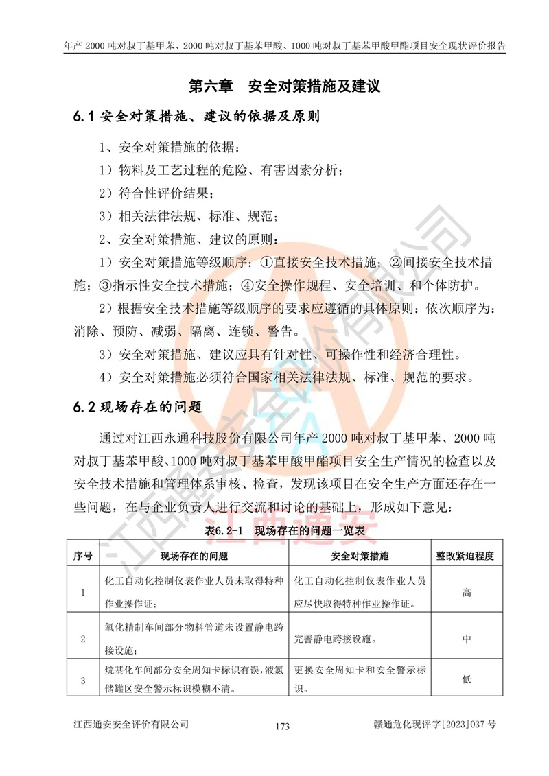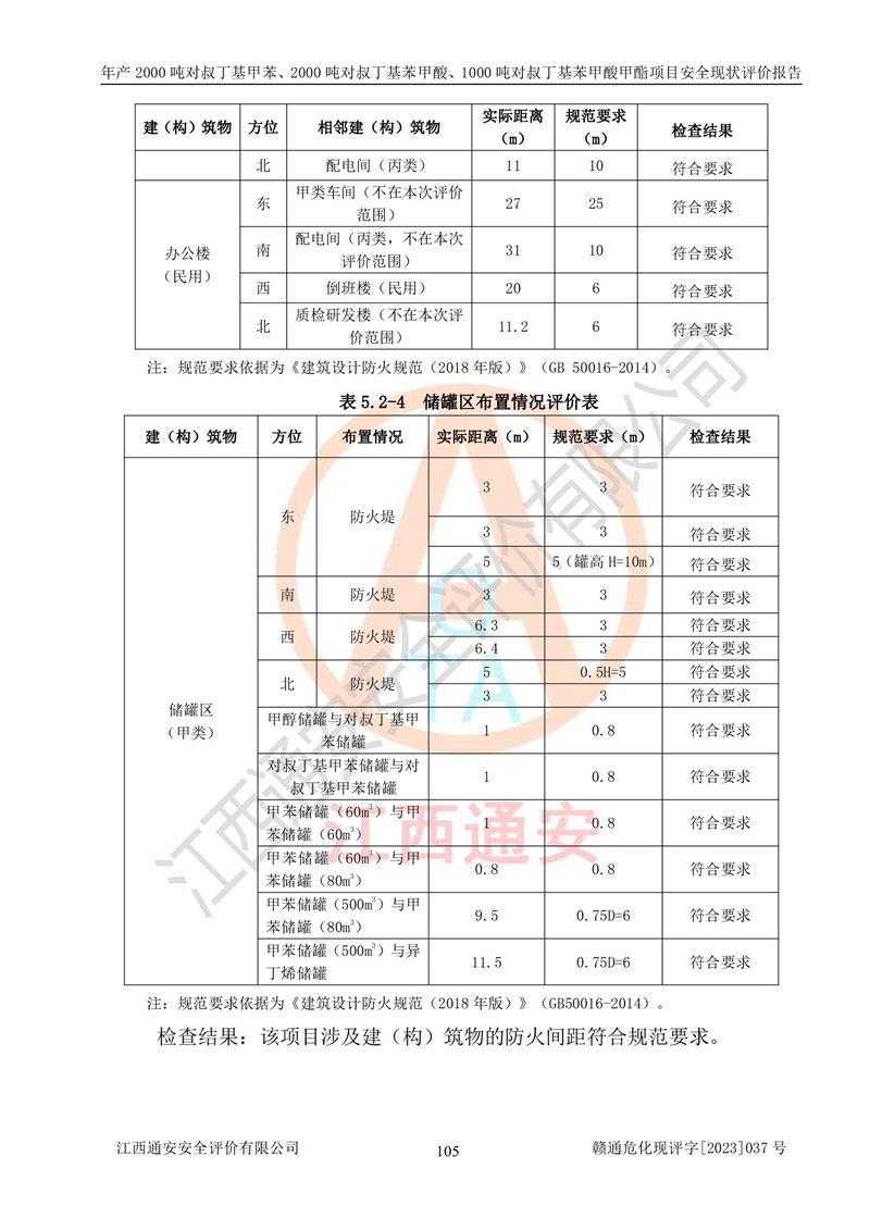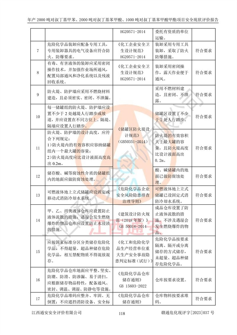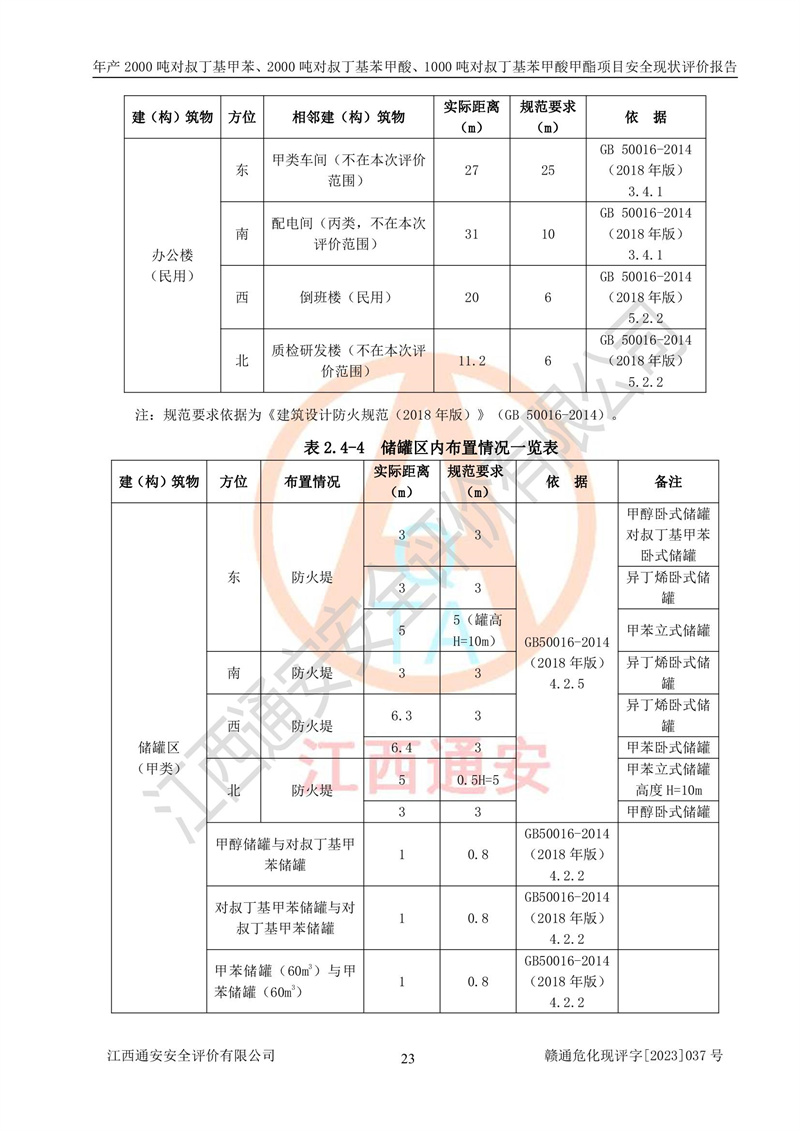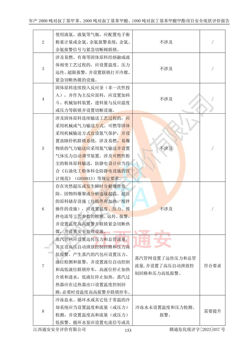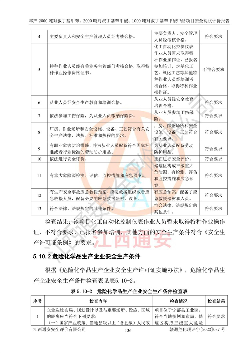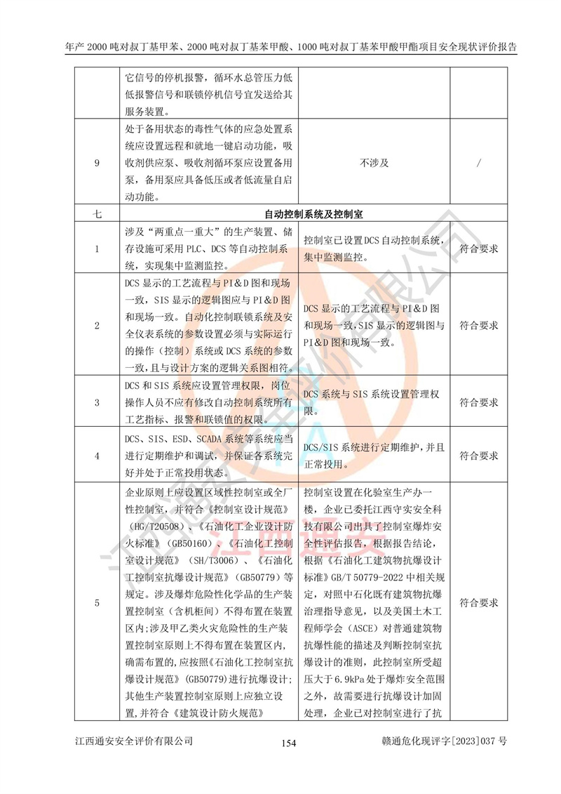 江西永通科技股份有限公司位于江西省贛州市寧都縣工業(yè)園,法定**人為劉忠春,成立于2009年09月25日,注冊(cè)資本玖仟陸佰肆拾陸萬(wàn)陸仟元整,營(yíng)業(yè)執(zhí)照經(jīng)營(yíng)范圍為化學(xué)原料藥、醫(yī)藥中間體等研發(fā)、生產(chǎn)、銷售等。 江西永通科技股份有限公司2020年10月26日取得了《安全生產(chǎn)許可證》,許可證編號(hào):(贛)WH安許證字[2011]0642號(hào),許可范圍為對(duì)叔丁基甲苯(2kt/a)、對(duì)叔丁基苯甲酸(2kt/a)、對(duì)叔丁基苯甲酸甲酯(1kt/a),**期:2020年10月26日至2023年10月25日。該公司2021年10月22日取得了安全生產(chǎn)標(biāo)準(zhǔn)化證書,證書編號(hào):贛市AQBWHⅢ[2021]168,**期至2024年10月21日。該公司現(xiàn)有員工133人,其中專職安全管理人員3人。 江西永通科技股份有限公司年產(chǎn)2000噸對(duì)叔丁基甲苯、2000噸對(duì)叔丁基苯甲酸、1000噸對(duì)叔丁基苯甲酸甲酯項(xiàng)目生產(chǎn)過(guò)程中涉及的原輔材料為甲苯、異丁烯、液氧(氧氣)、甲醇、濃硫酸、液堿(氫氧化鈉)、活性炭、硅藻土、氧化催化劑和氮?dú)?,產(chǎn)品為對(duì)叔丁基甲苯、對(duì)叔丁基苯甲酸和對(duì)叔丁基苯甲酸甲酯。根據(jù)《危險(xiǎn)化學(xué)品目錄》,該項(xiàng)目涉及的甲苯、異丁烯、液氧(氧氣)、甲醇、濃硫酸、液堿(氫氧化鈉)和氮?dú)鈱儆?/span>危險(xiǎn)化學(xué)品。經(jīng)辨識(shí),甲苯和甲醇屬于重點(diǎn)監(jiān)管的危險(xiǎn)化學(xué)品,甲苯和硫酸屬于第三類易制毒化學(xué)品、甲醇屬于特別管控的危險(xiǎn)化學(xué)品,不涉及監(jiān)控化學(xué)品、易制爆危險(xiǎn)化學(xué)品、劇毒化學(xué)品和高毒物品,儲(chǔ)罐區(qū)構(gòu)成三級(jí)重大危險(xiǎn)源,其他生產(chǎn)、儲(chǔ)存單元不構(gòu)成危險(xiǎn)化學(xué)品重大危險(xiǎn)源,涉及的烷基化反應(yīng)和氧化反應(yīng)屬于重點(diǎn)監(jiān)管的危險(xiǎn)化工工藝。根據(jù)《安全生產(chǎn)許可證條例》、《危險(xiǎn)化學(xué)品安全管理?xiàng)l例》和《危險(xiǎn)化學(xué)品生產(chǎn)企業(yè)安全生產(chǎn)許可實(shí)施辦法》的相關(guān)規(guī)定,該項(xiàng)目涉及甲苯回收,需要辦理危險(xiǎn)化學(xué)品安全生產(chǎn)許可證。根據(jù)生產(chǎn)工藝特點(diǎn)及物料的理化特性可知,該項(xiàng)目生產(chǎn)過(guò)程中存在火災(zāi)與爆炸、中毒與窒息、觸電、機(jī)械傷害等危險(xiǎn)有害因素。 該公司自2020年10月26日取得安全生產(chǎn)許可證以來(lái),生產(chǎn)運(yùn)行正常,未發(fā)生一般及以上生產(chǎn)安全事故。 |